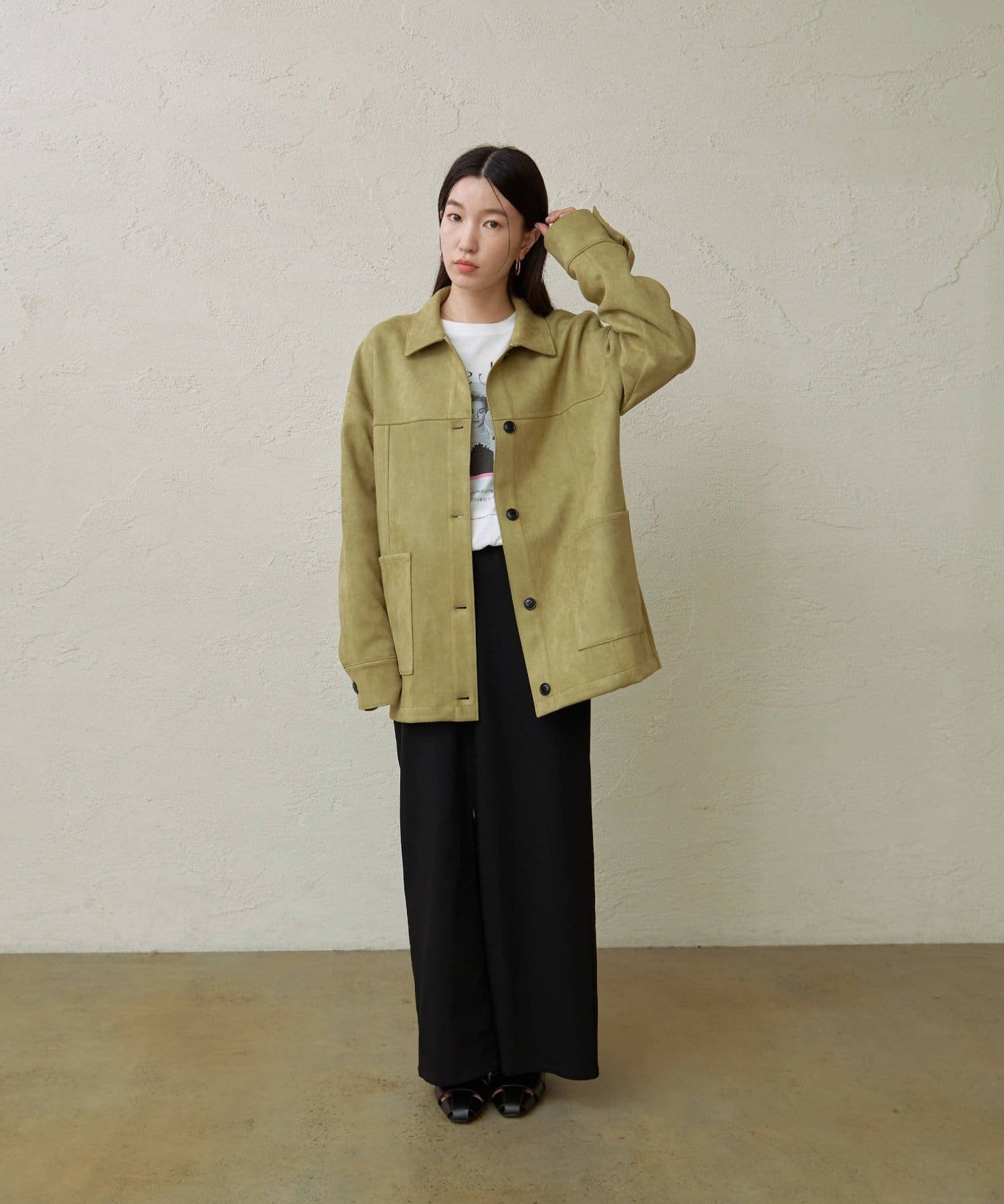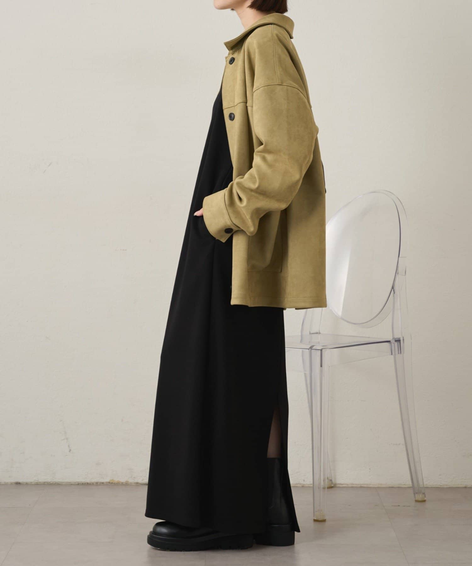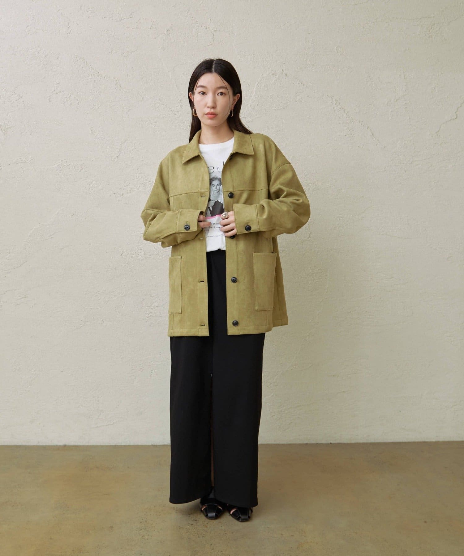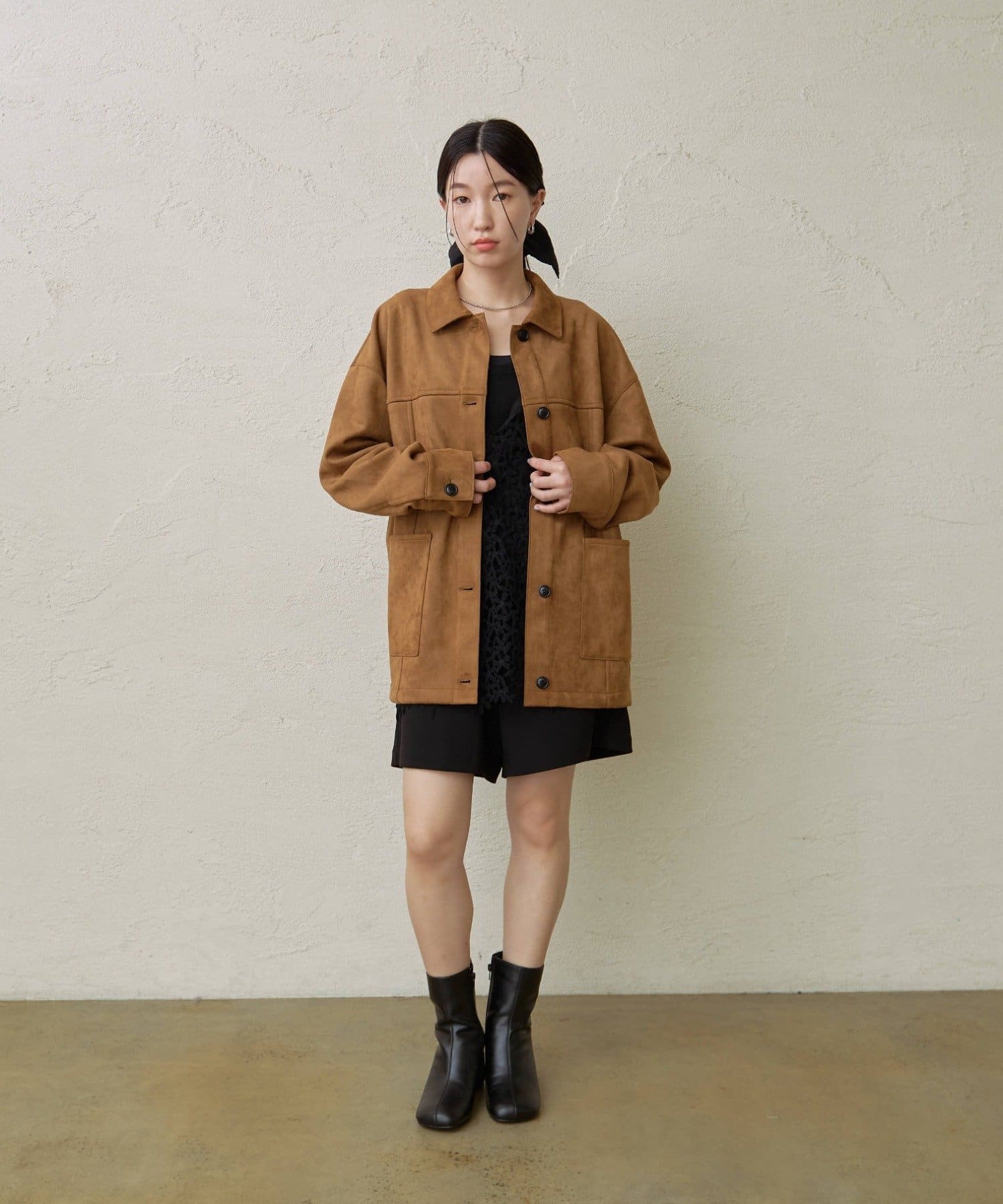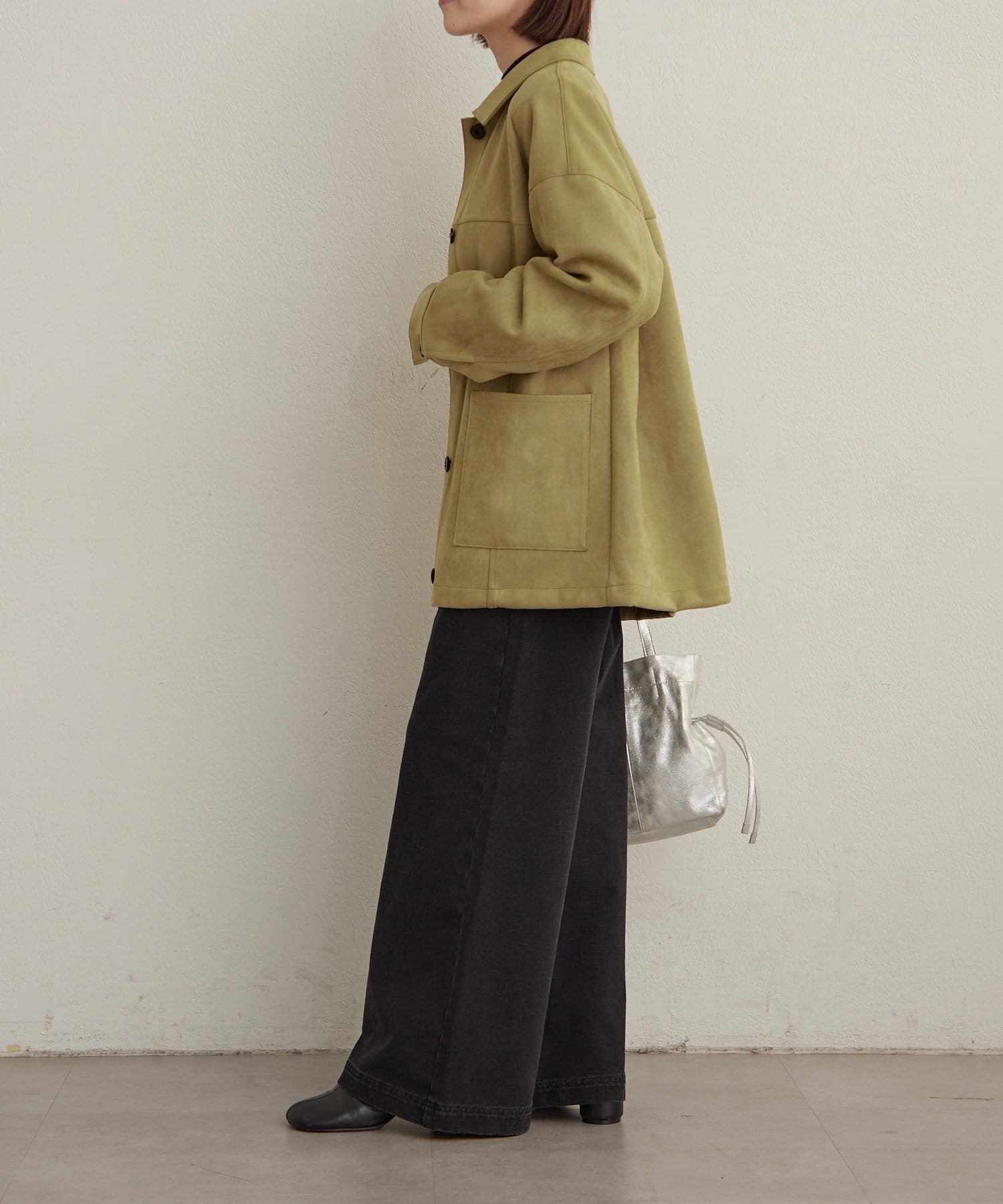 ・トレンドのスエード素材で、羽織るだけで秋らしい雰囲気のジャケット。