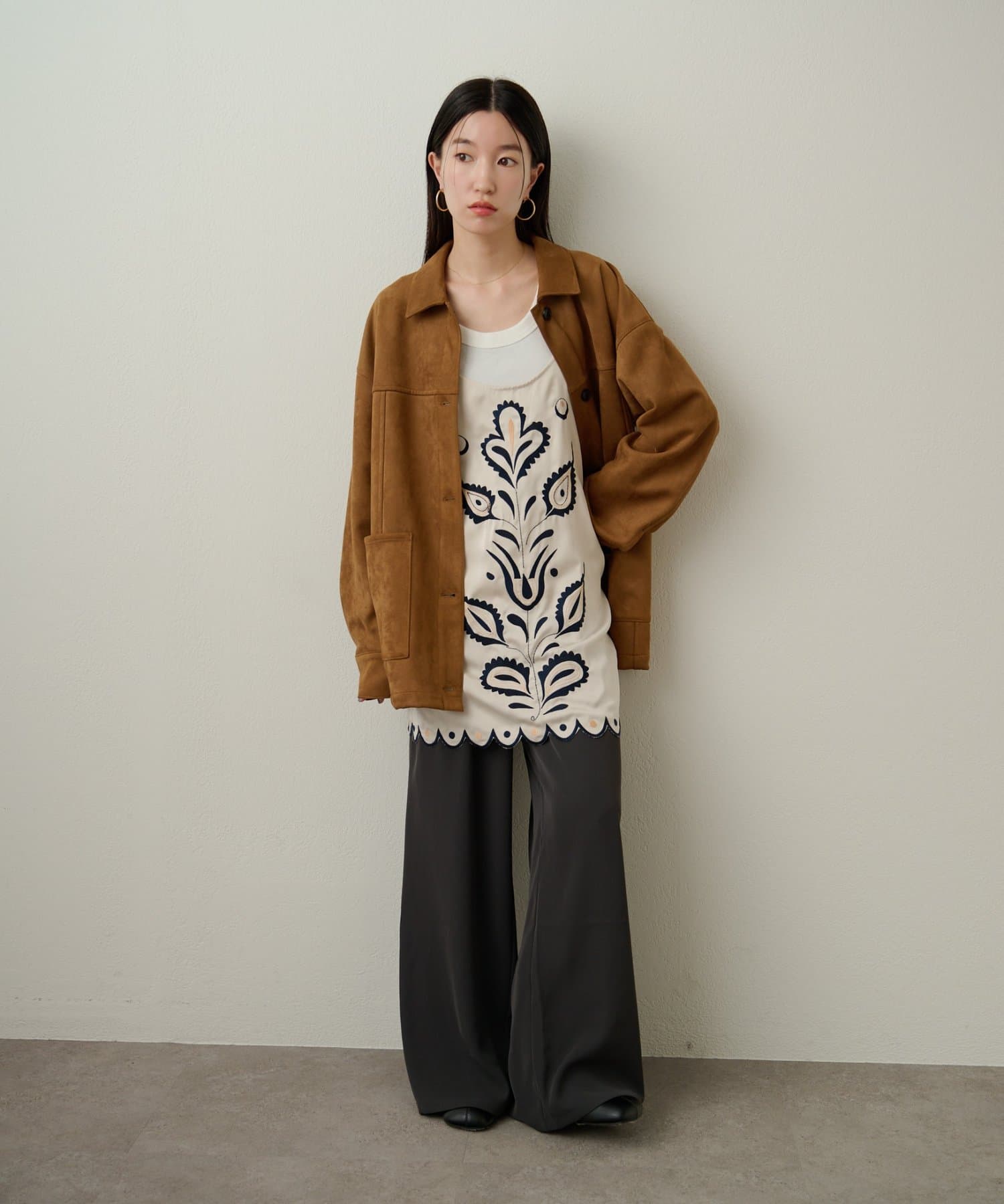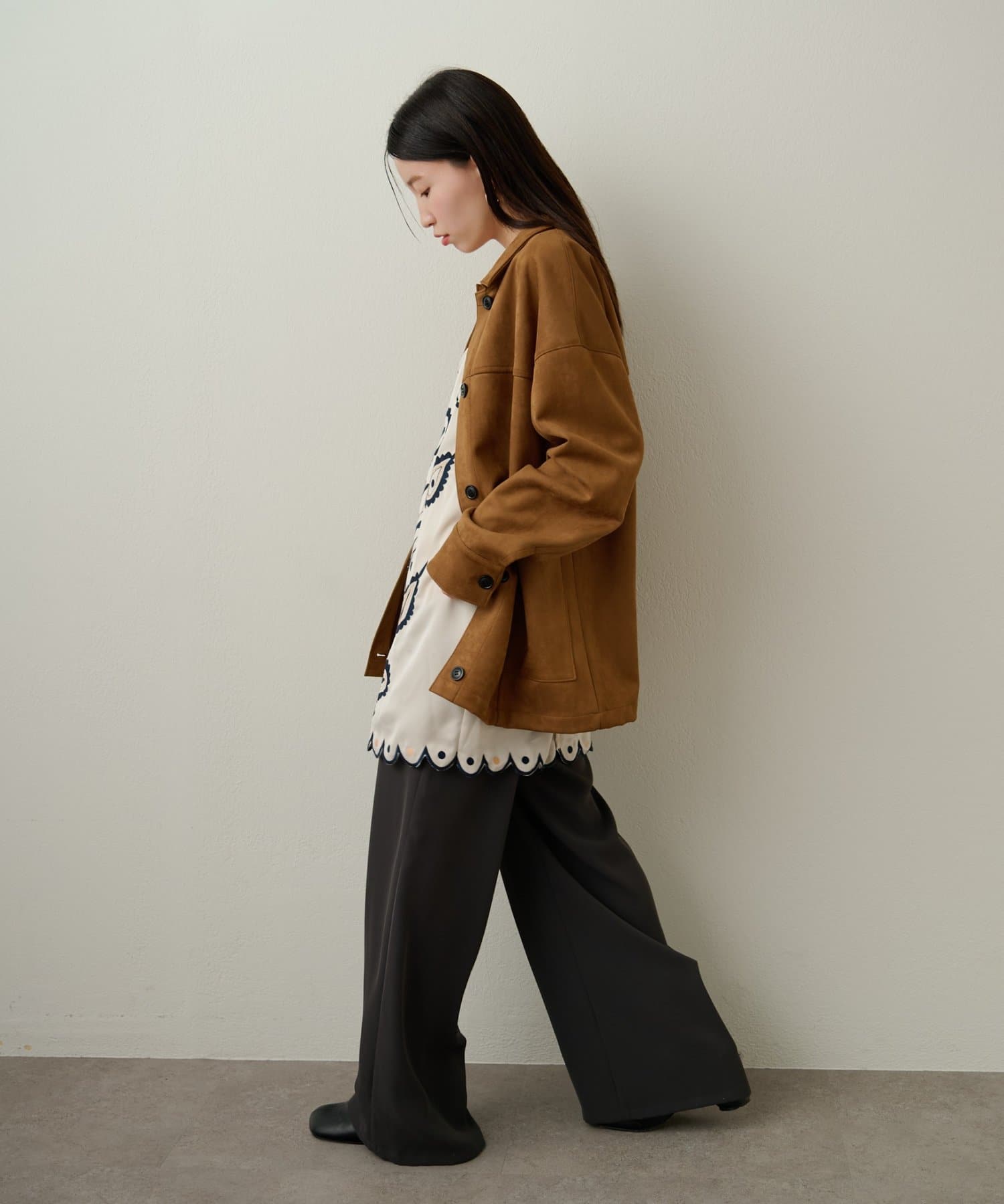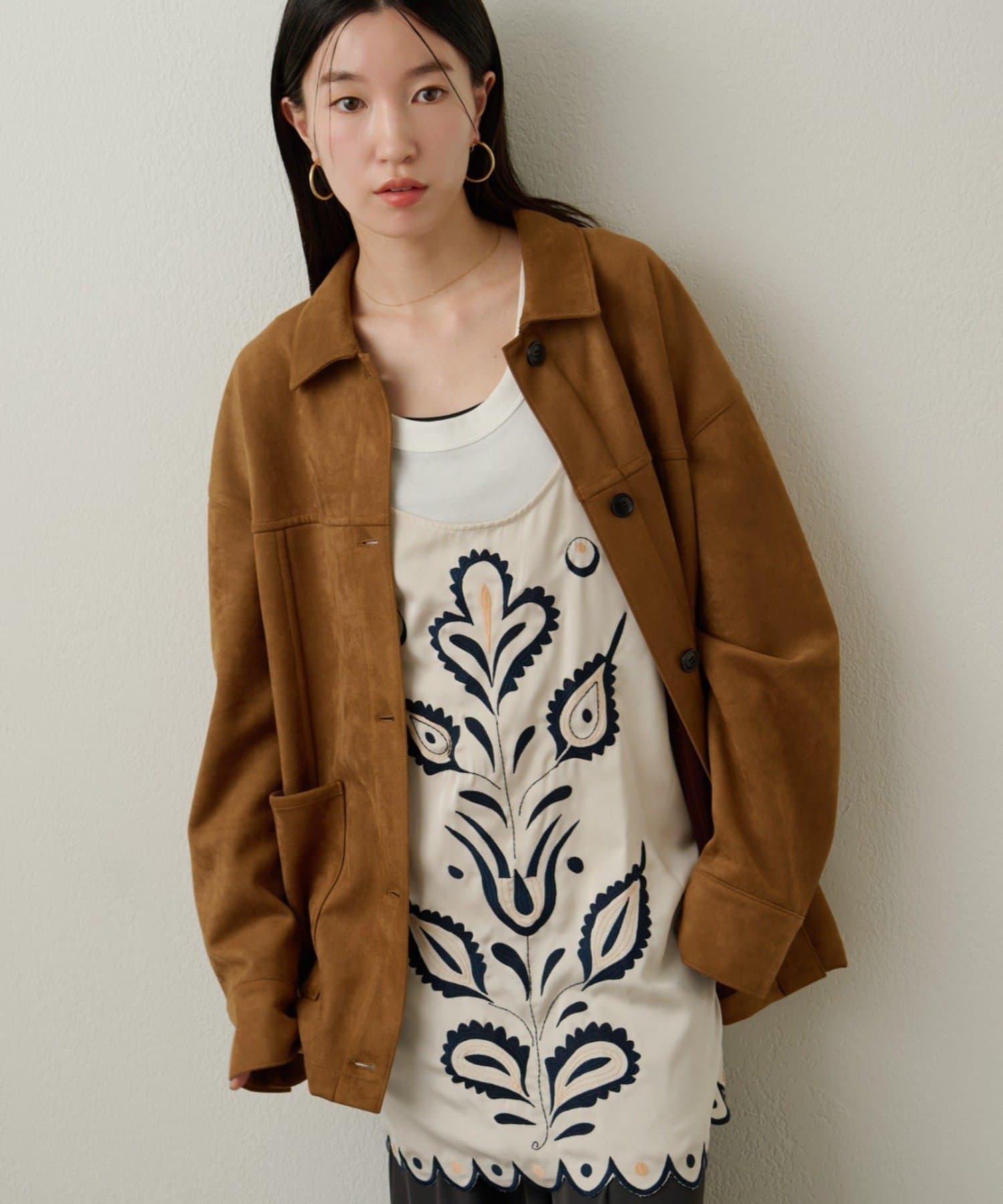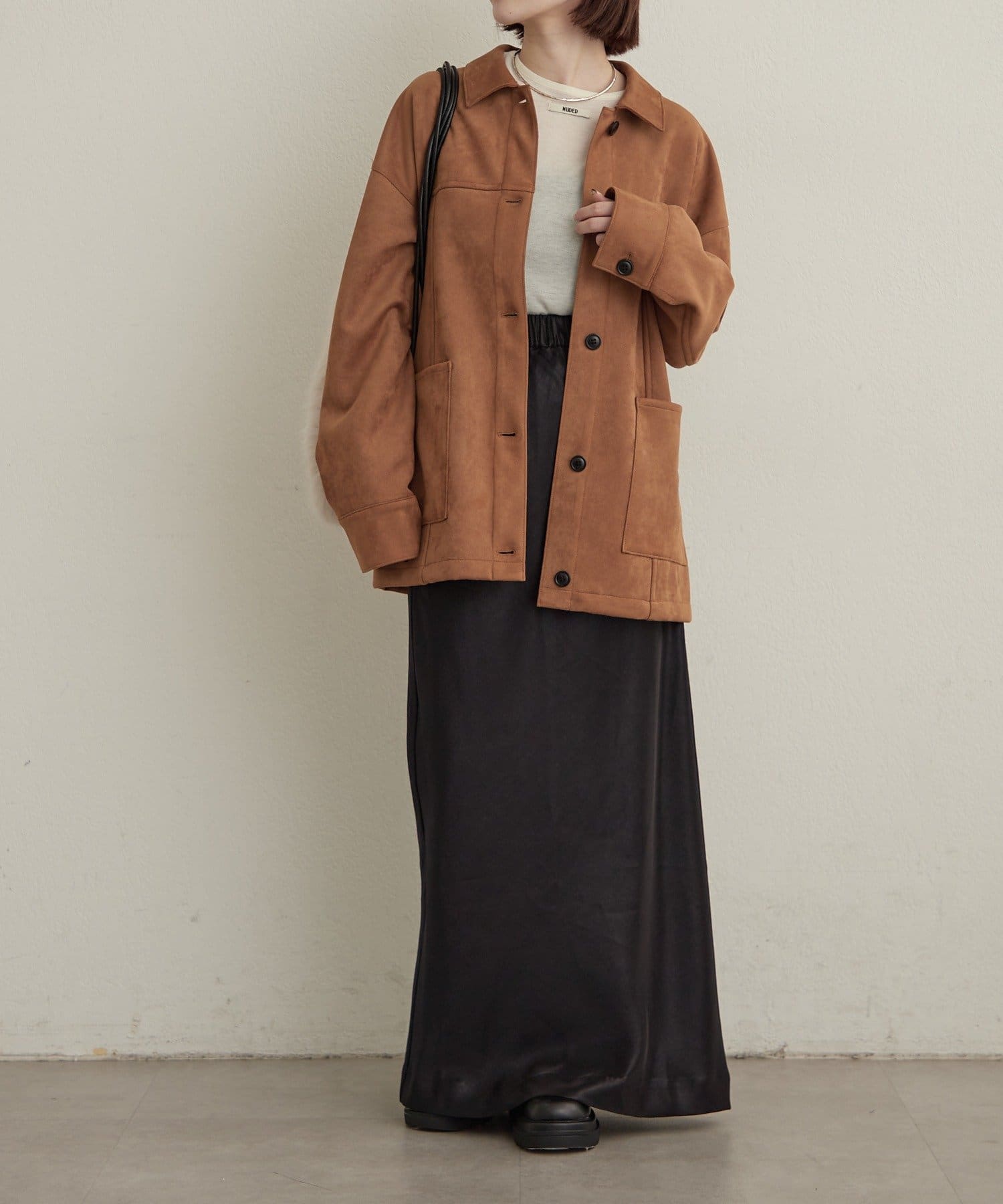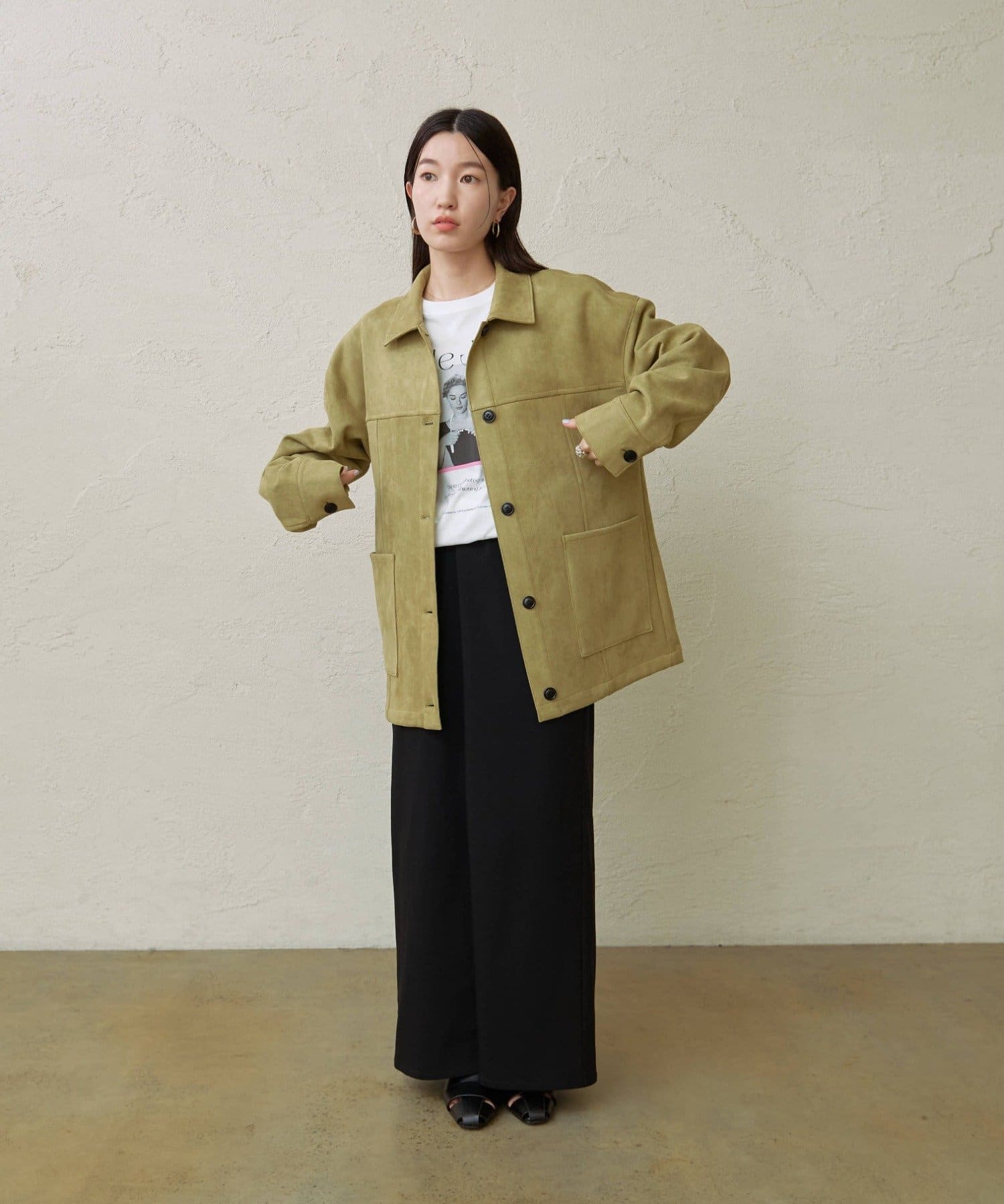 ・トレンドのスエード素材で、羽織るだけで秋らしい雰囲気のジャケット。