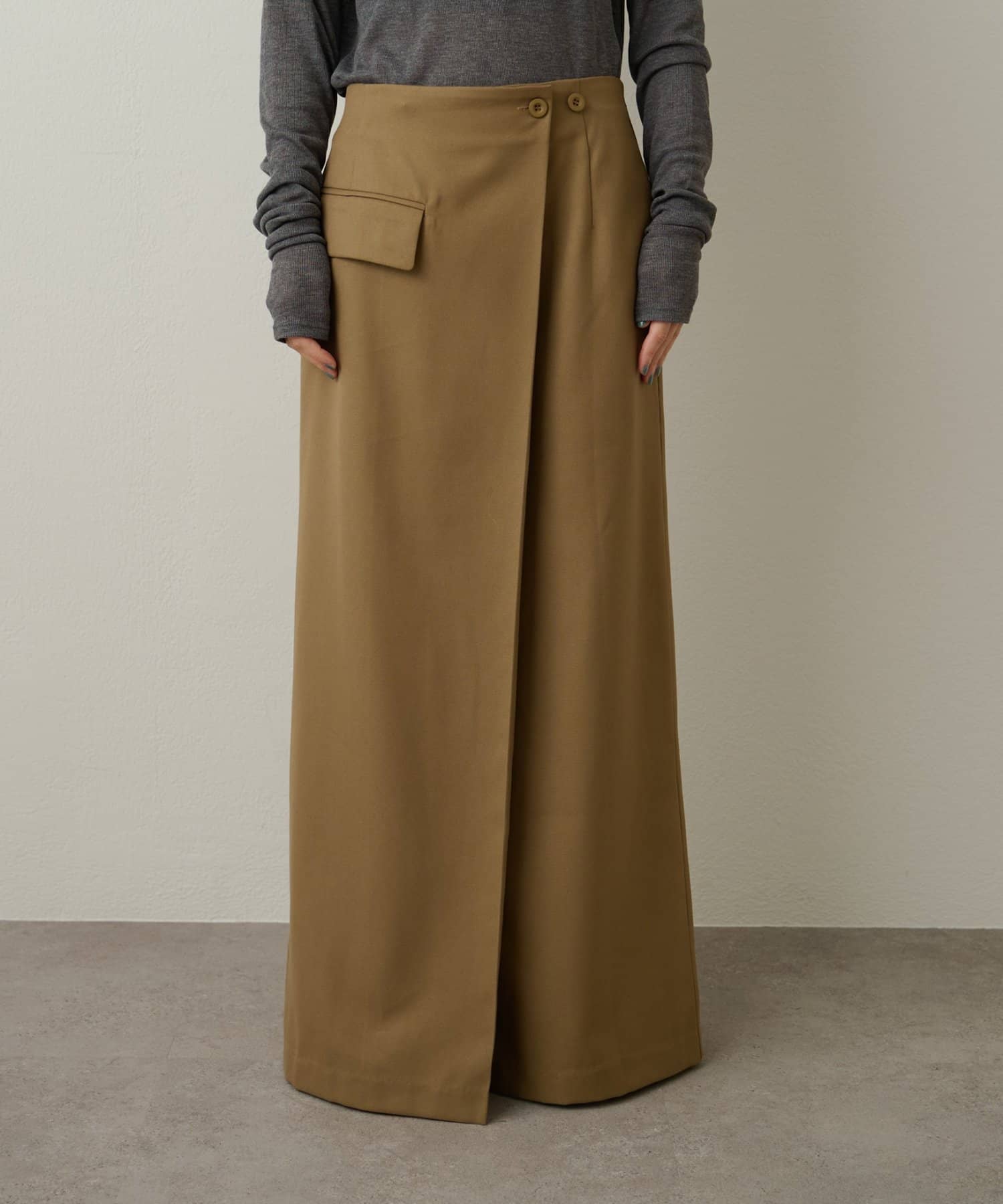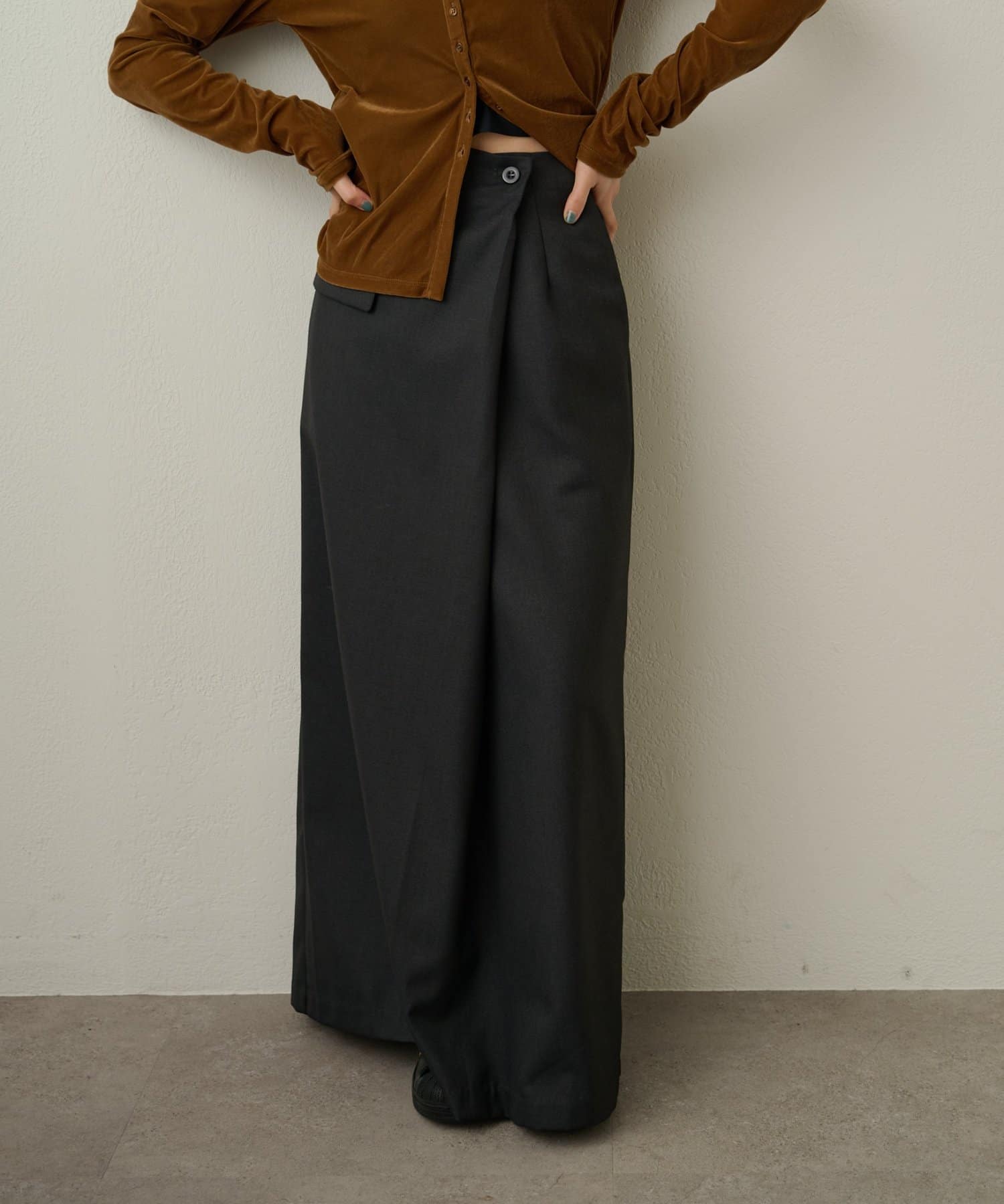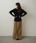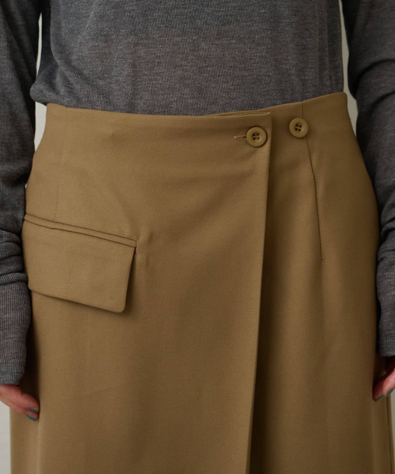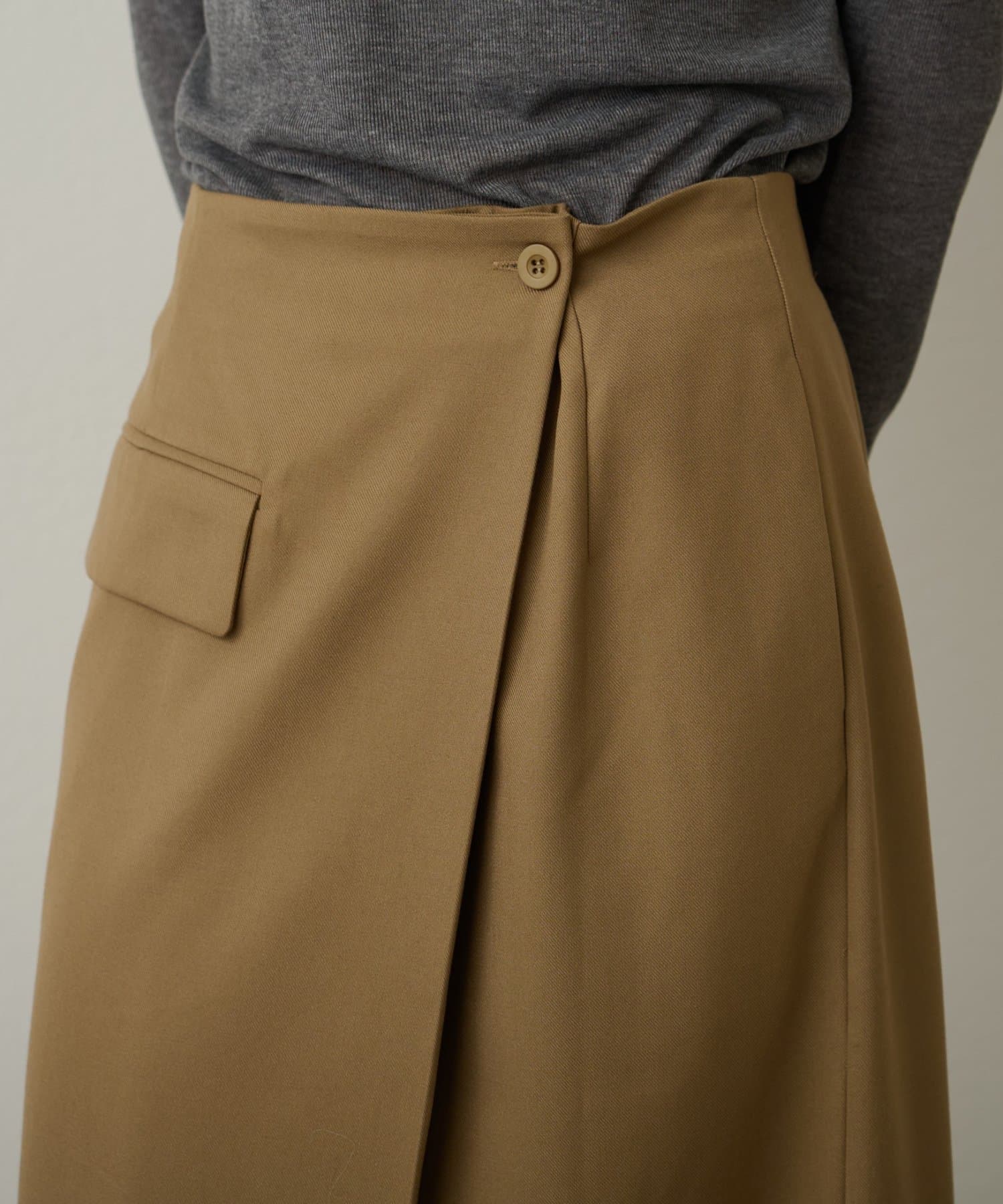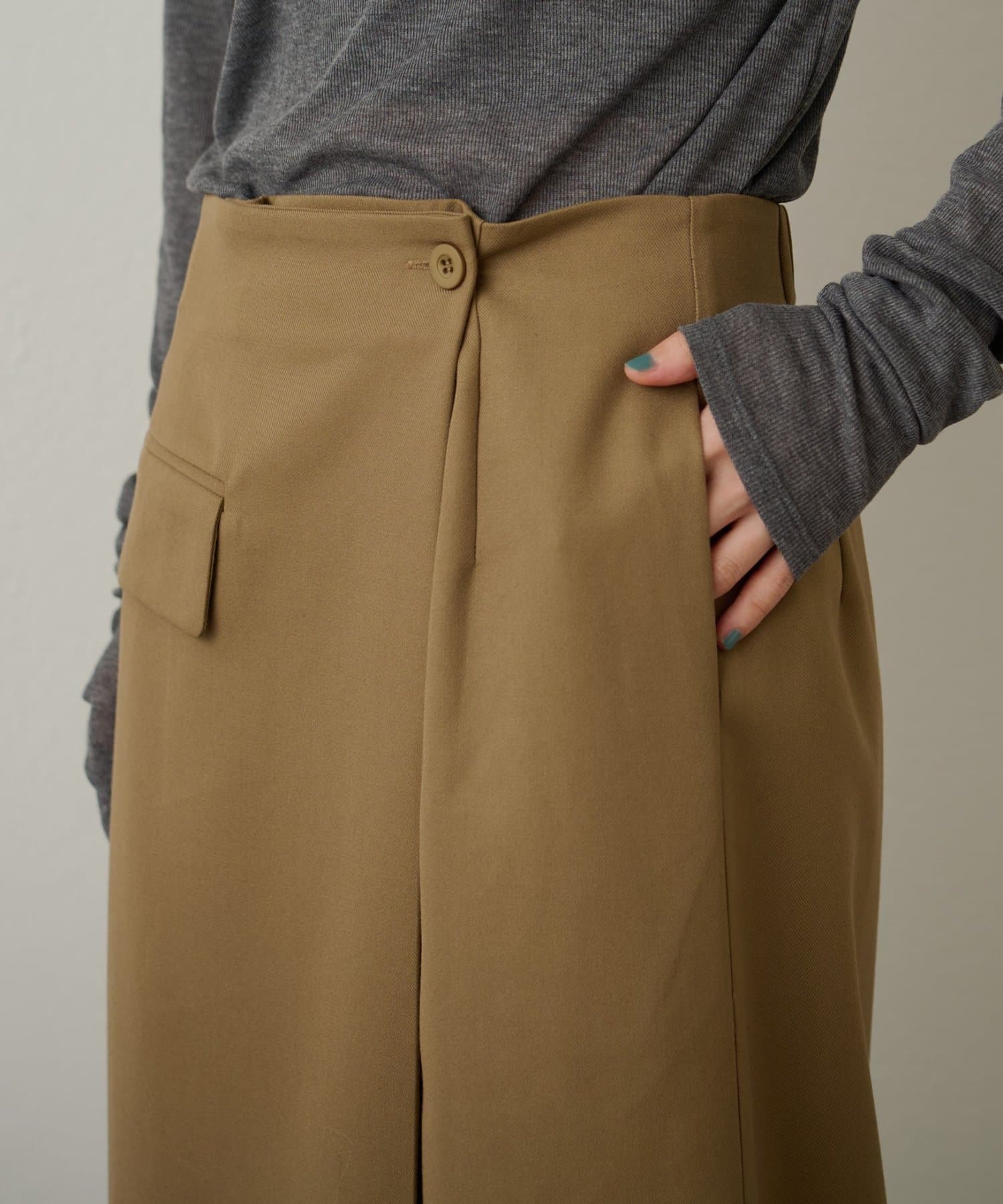 ・フロント部分のボタンとサイドのポケットがポイントになり、トップスをインしてもサマになります。