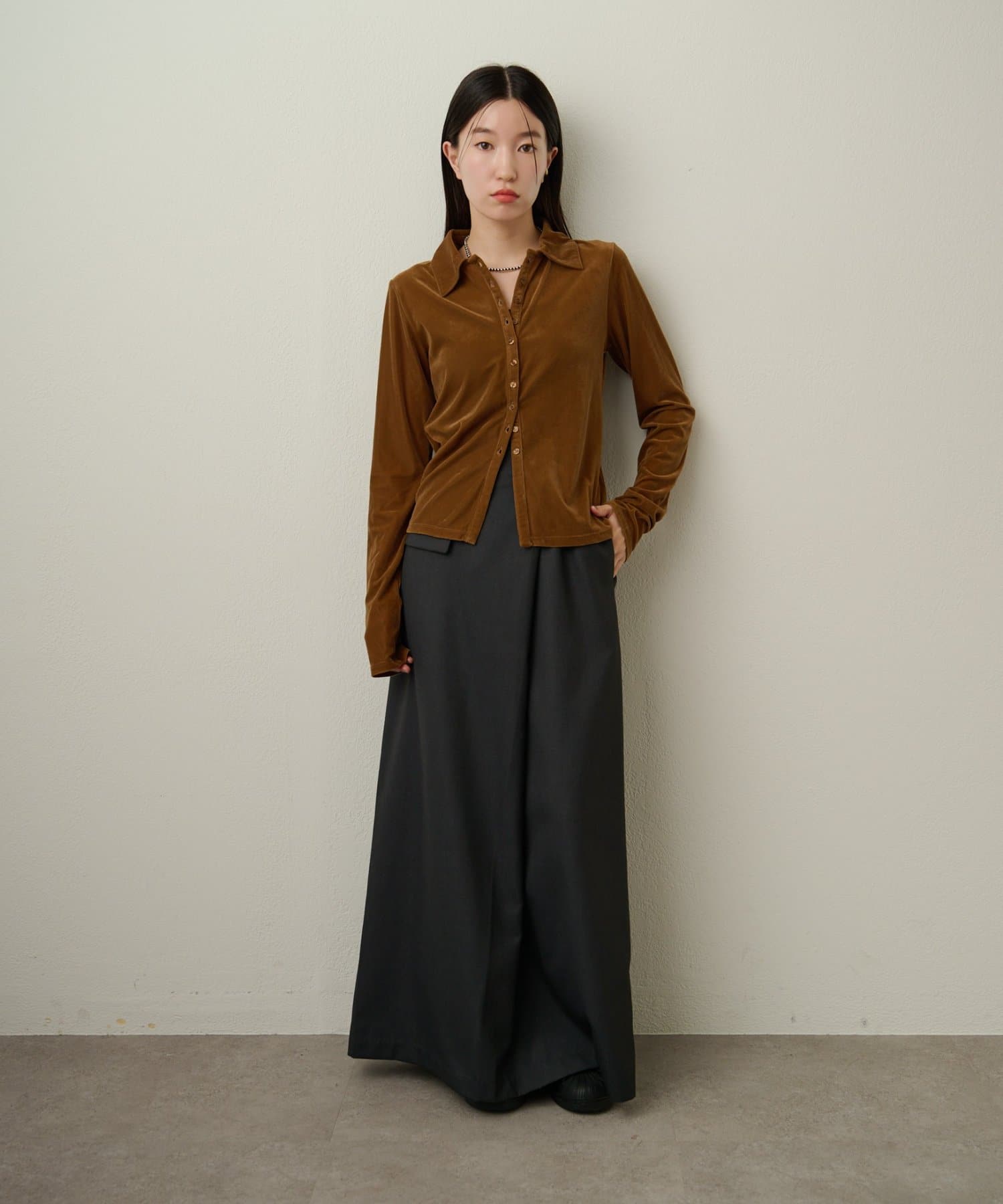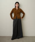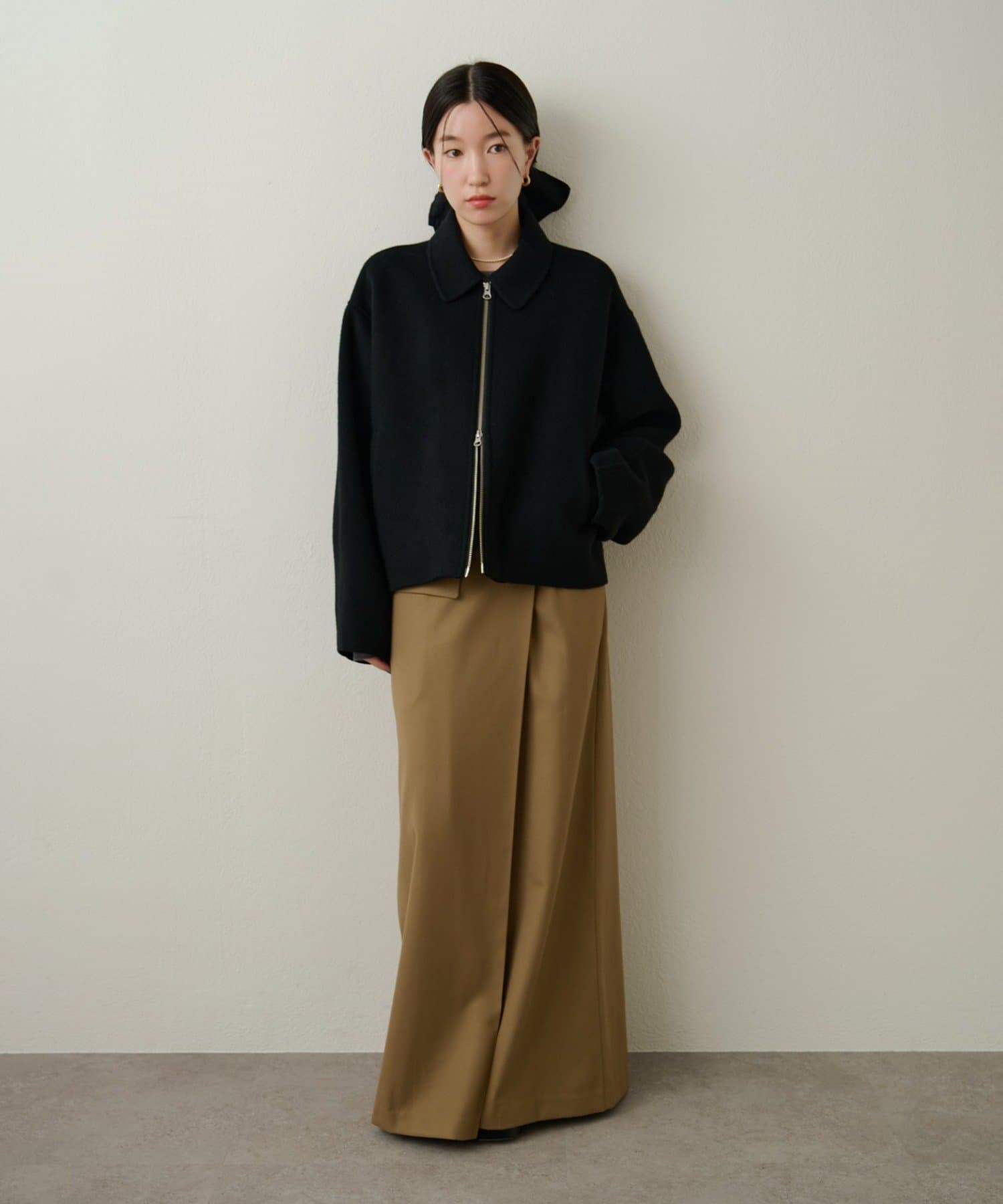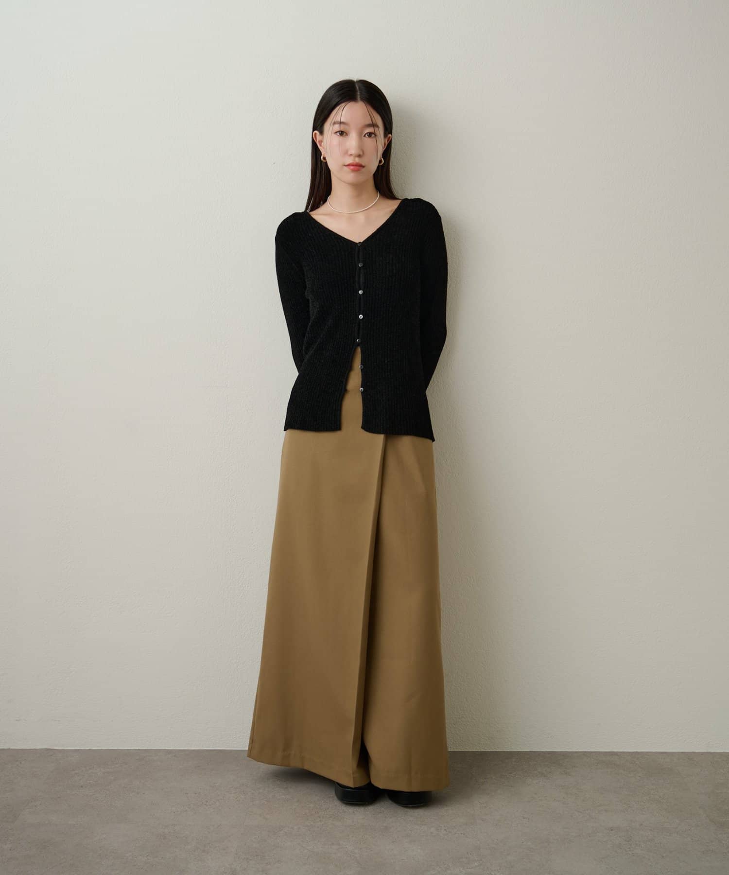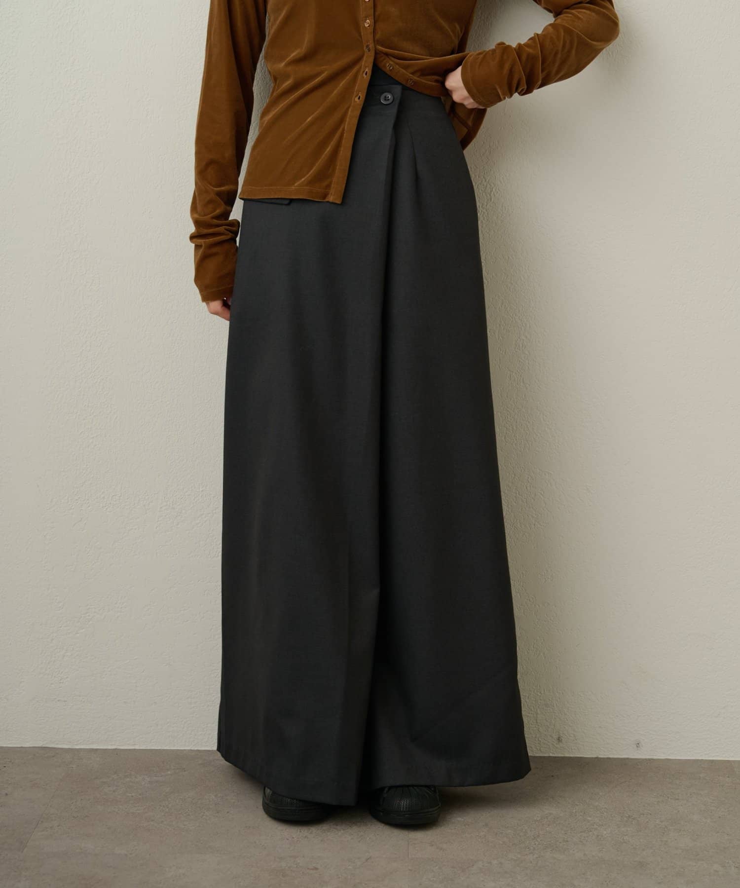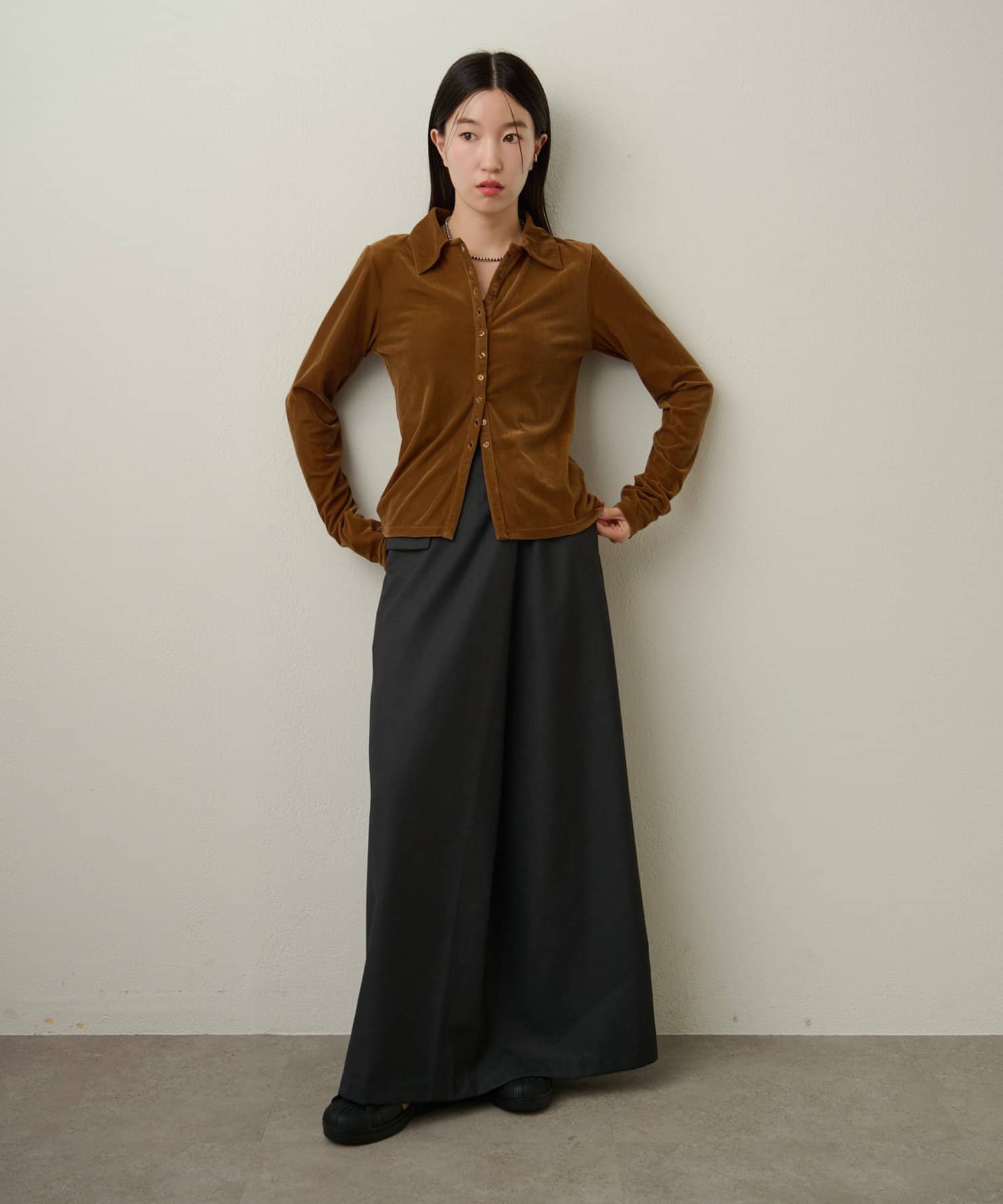 ・フロント部分のボタンとサイドのポケットがポイントになり、トップスをインしてもサマになります。