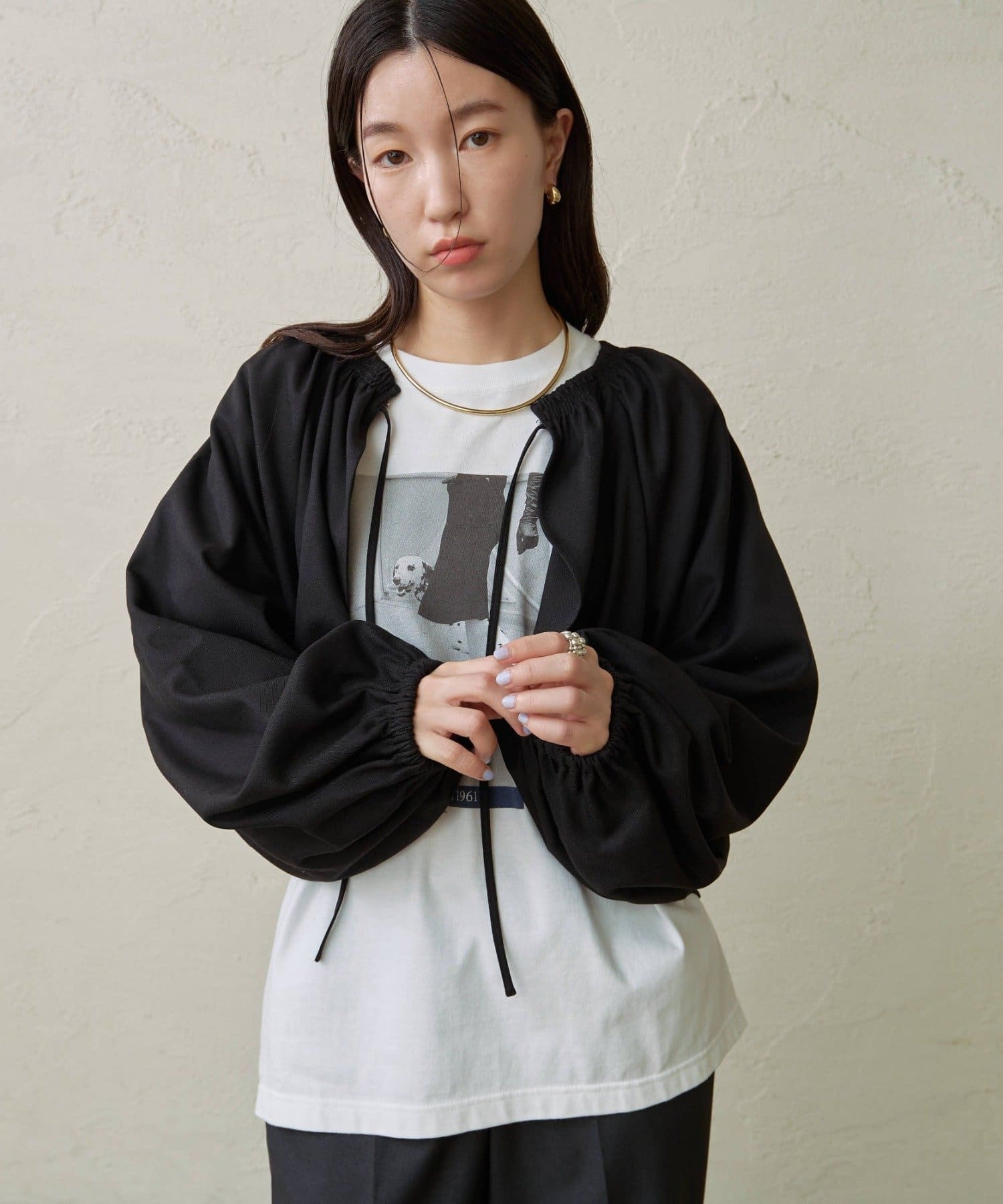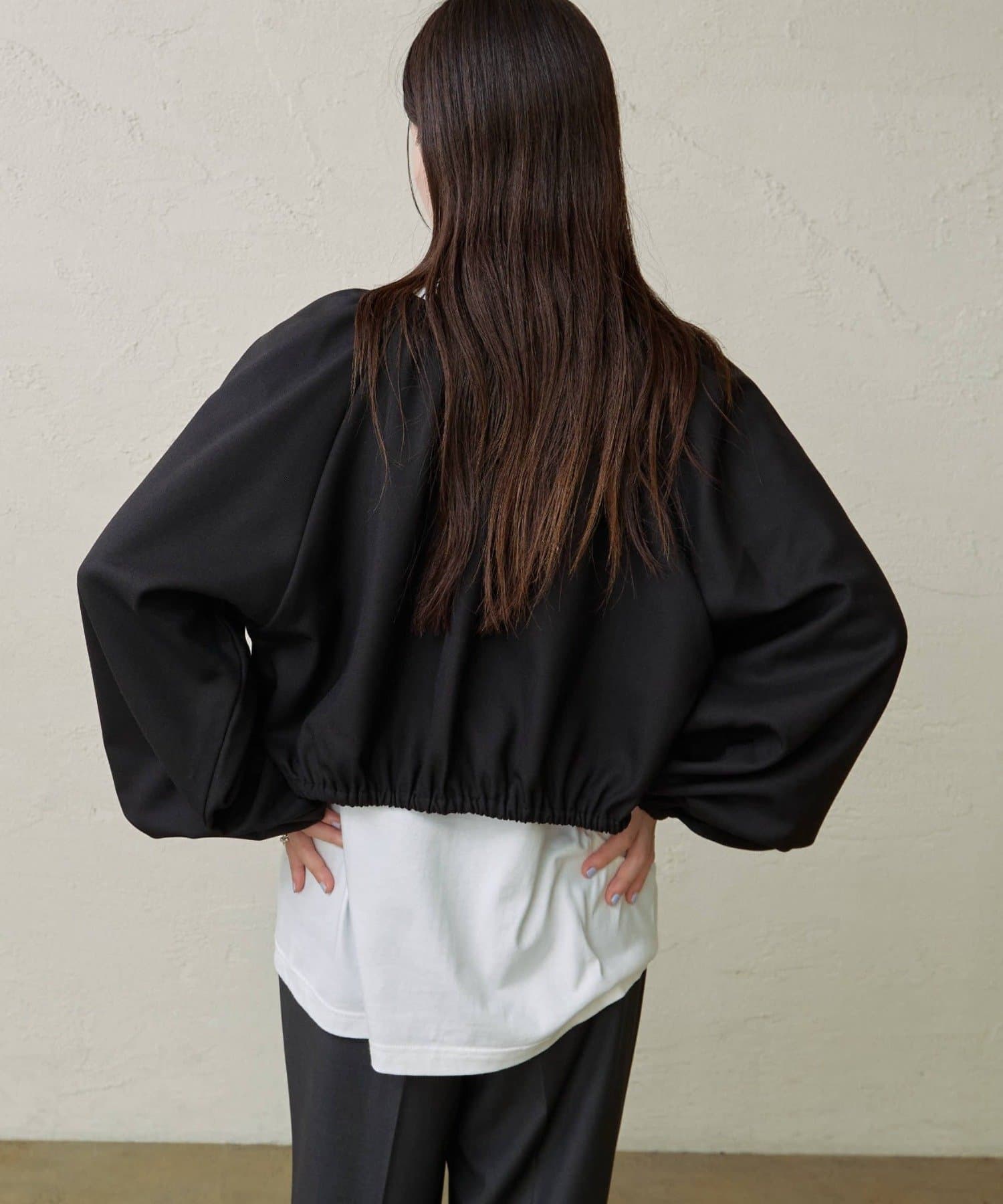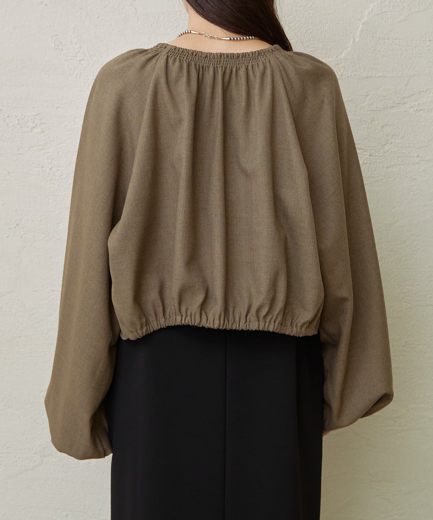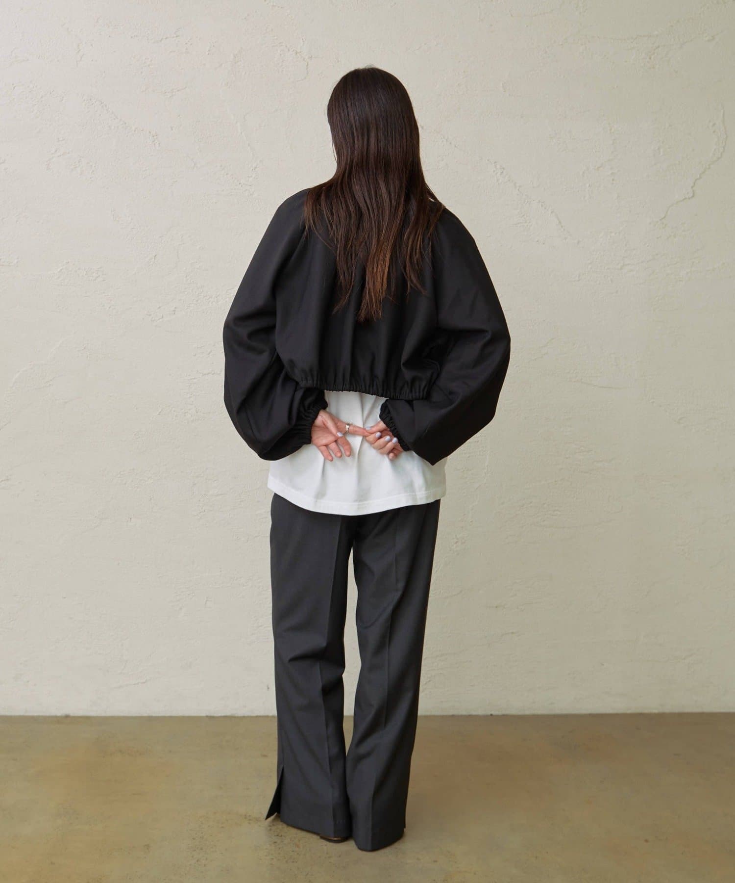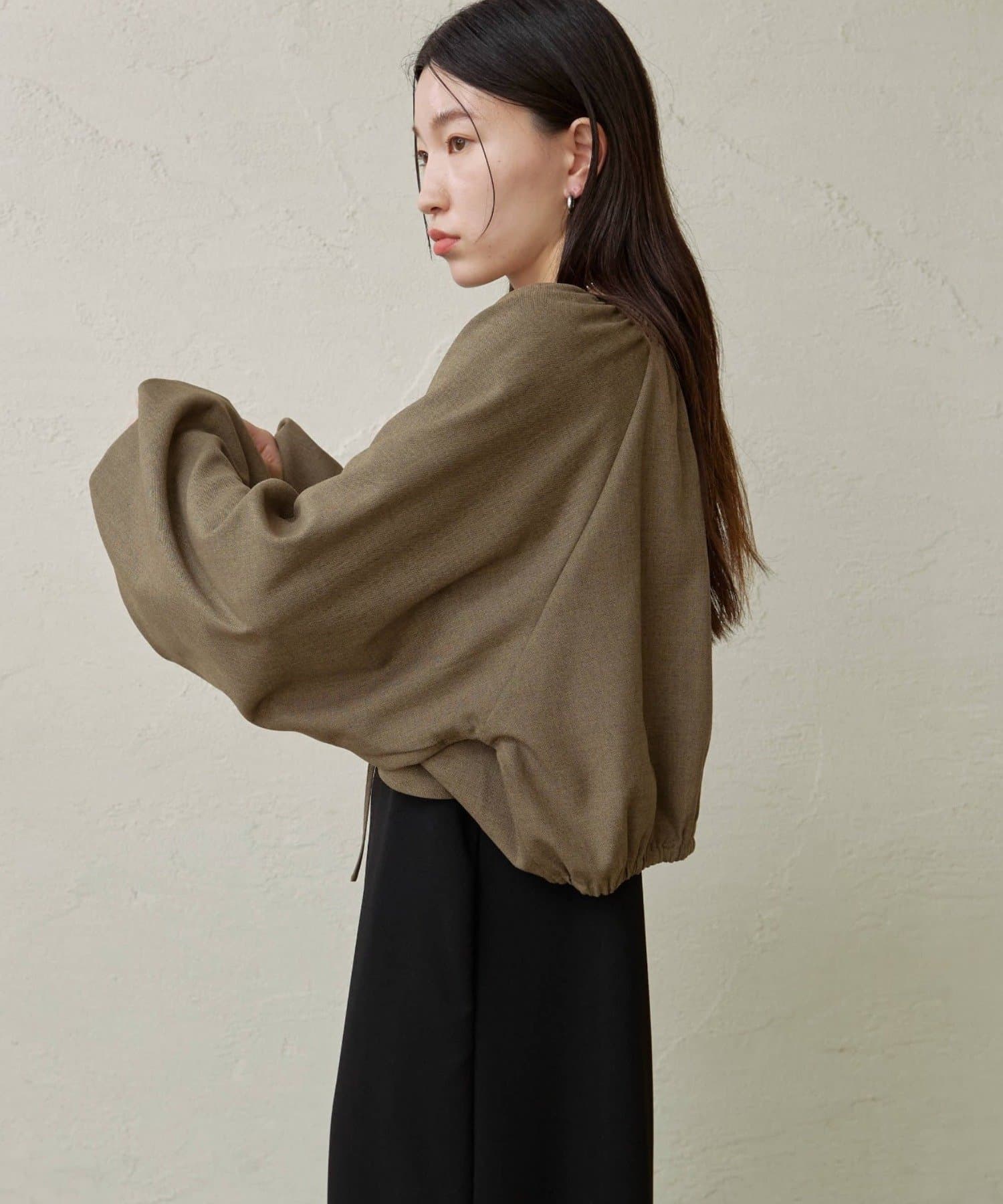・袖のボリューム感がポイントになりながらも、旬なショート丈でバランスが取りやすい一枚。