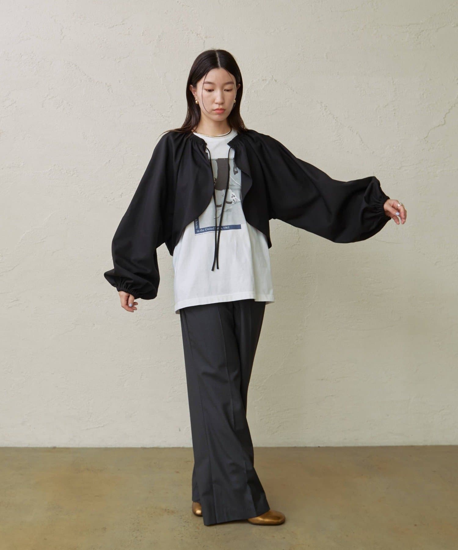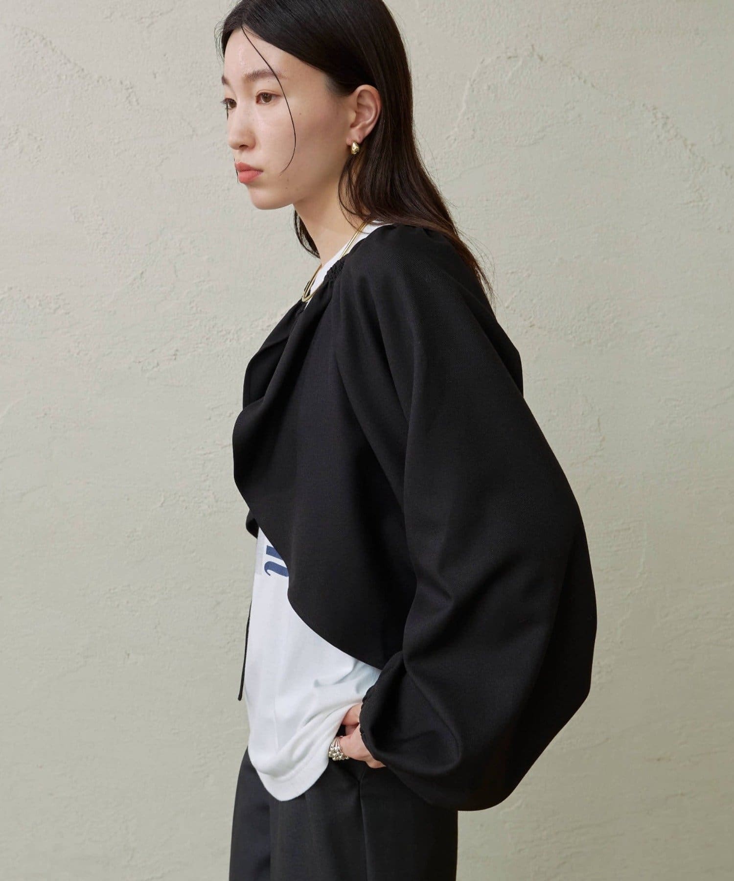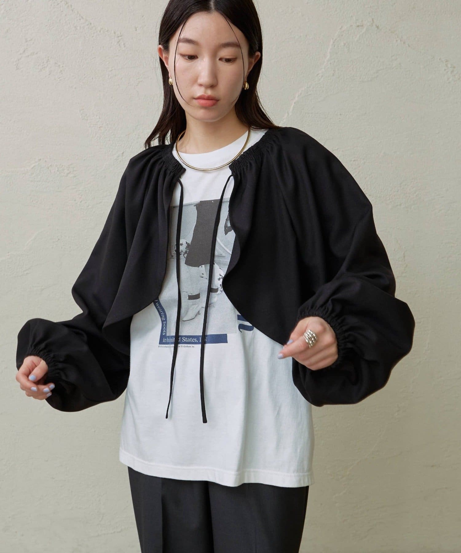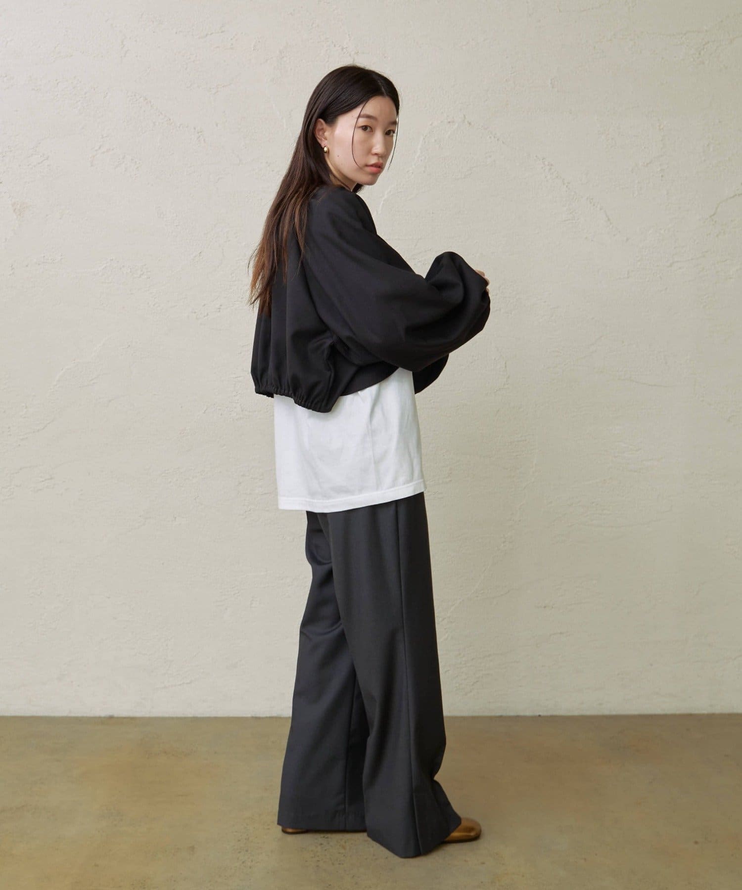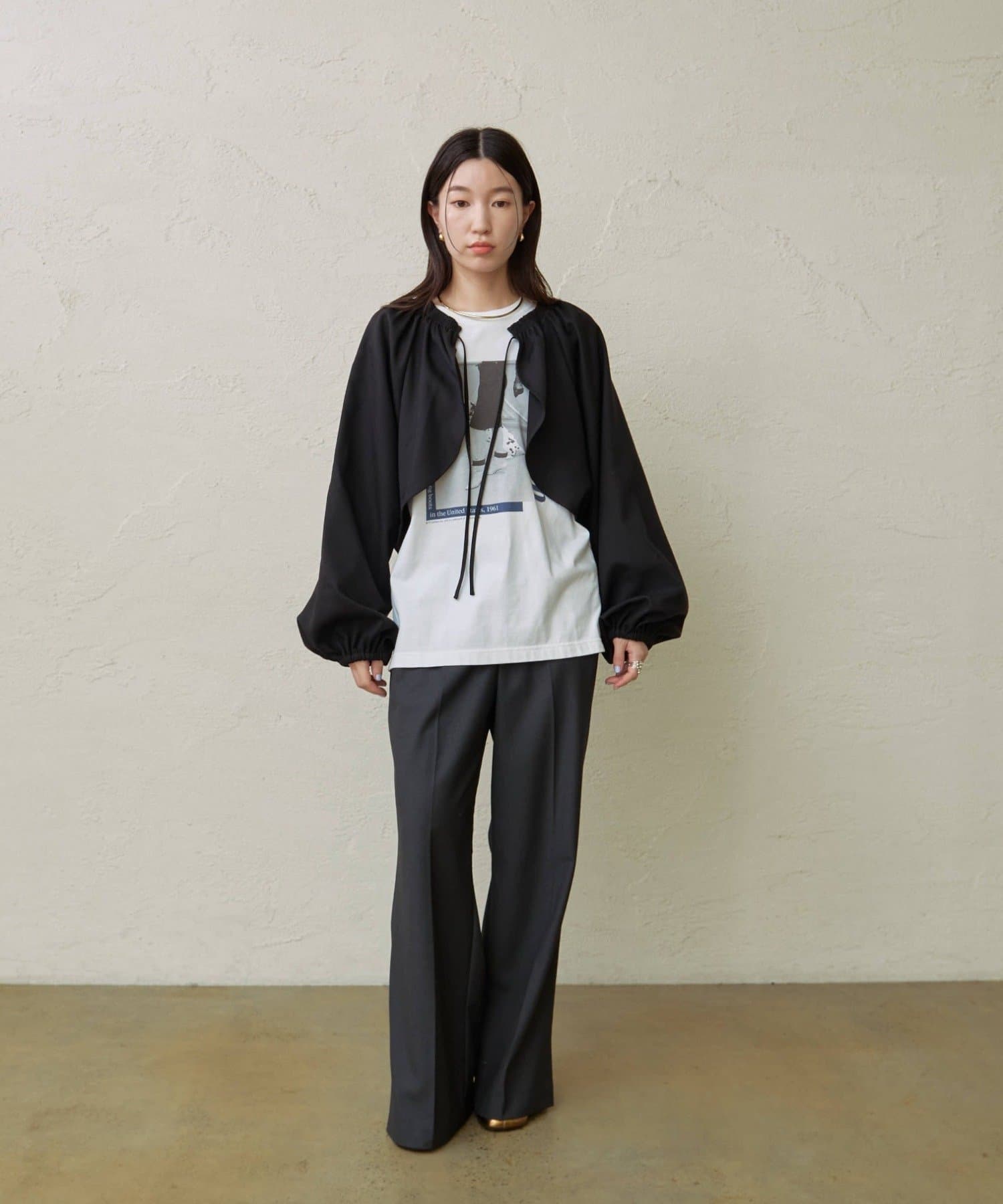 ・袖のボリューム感がポイントになりながらも、旬なショート丈でバランスが取りやすい一枚。