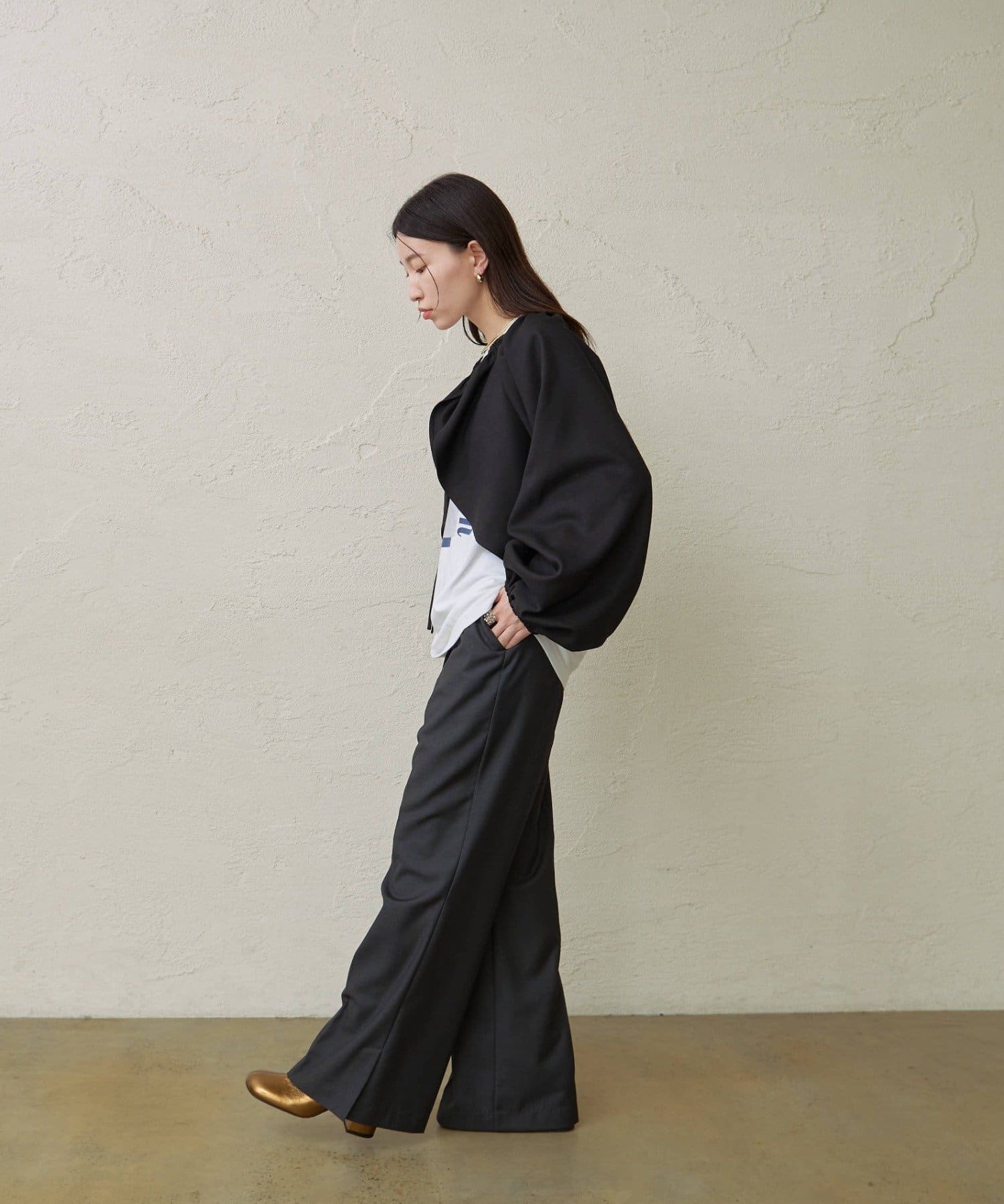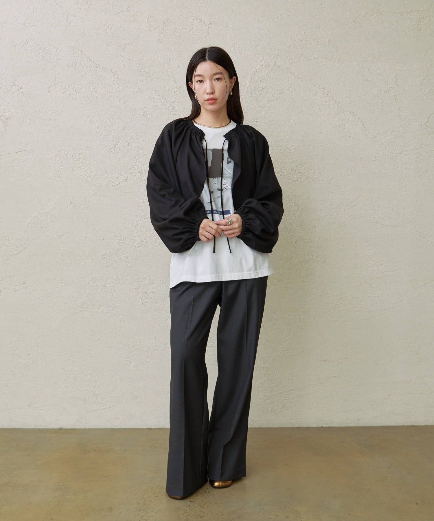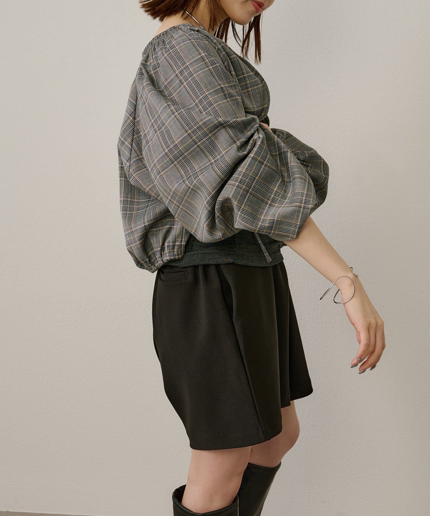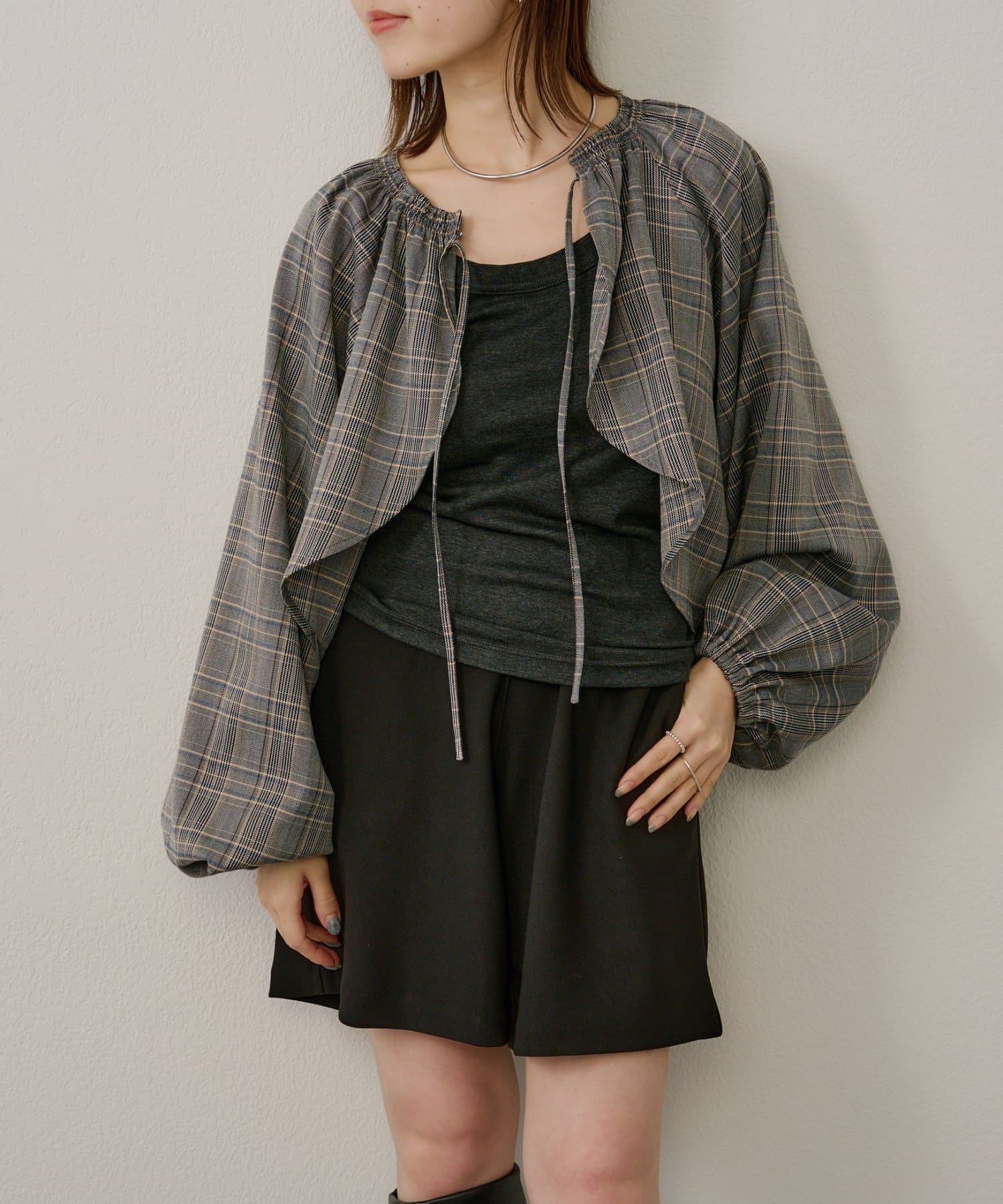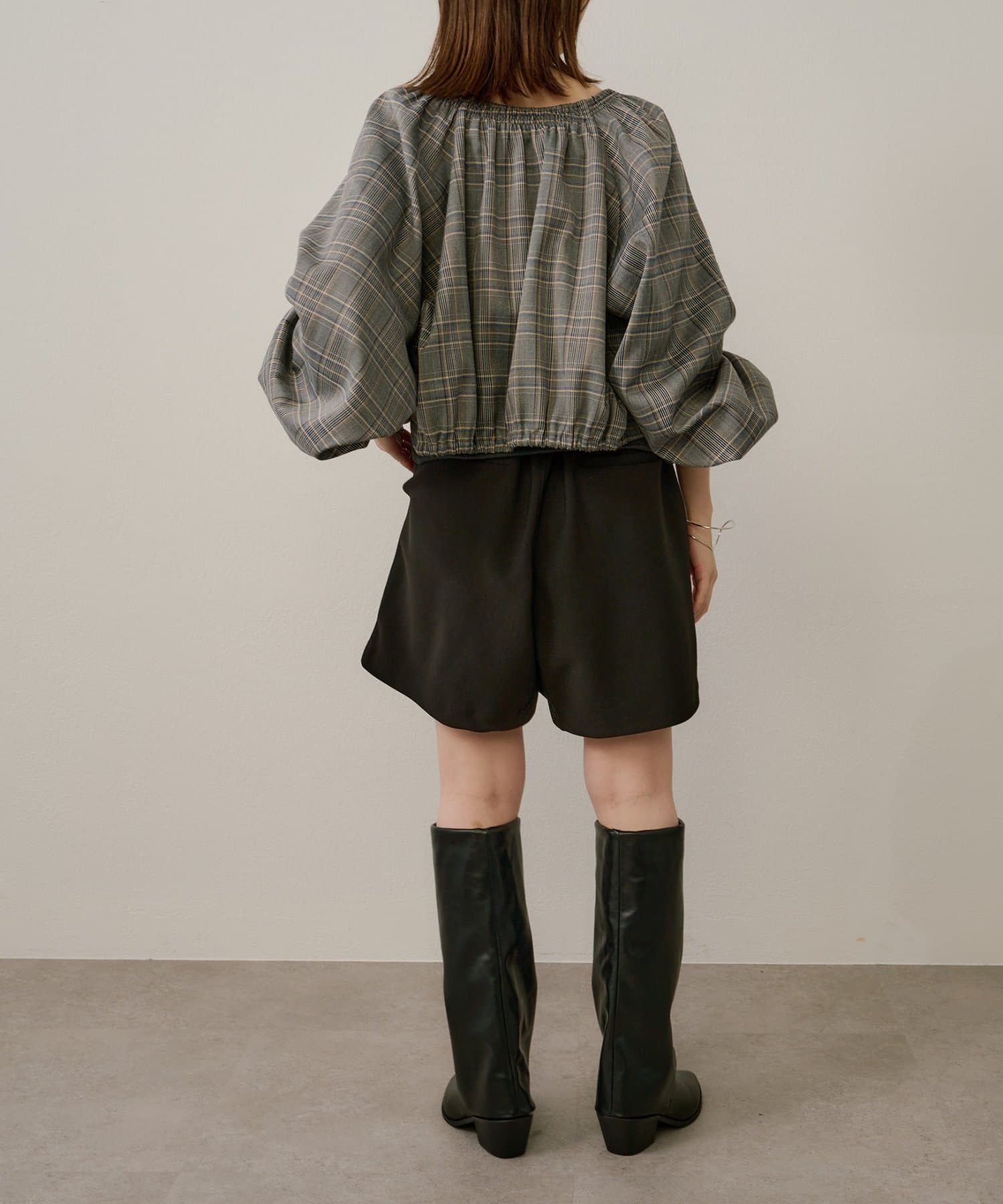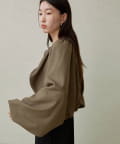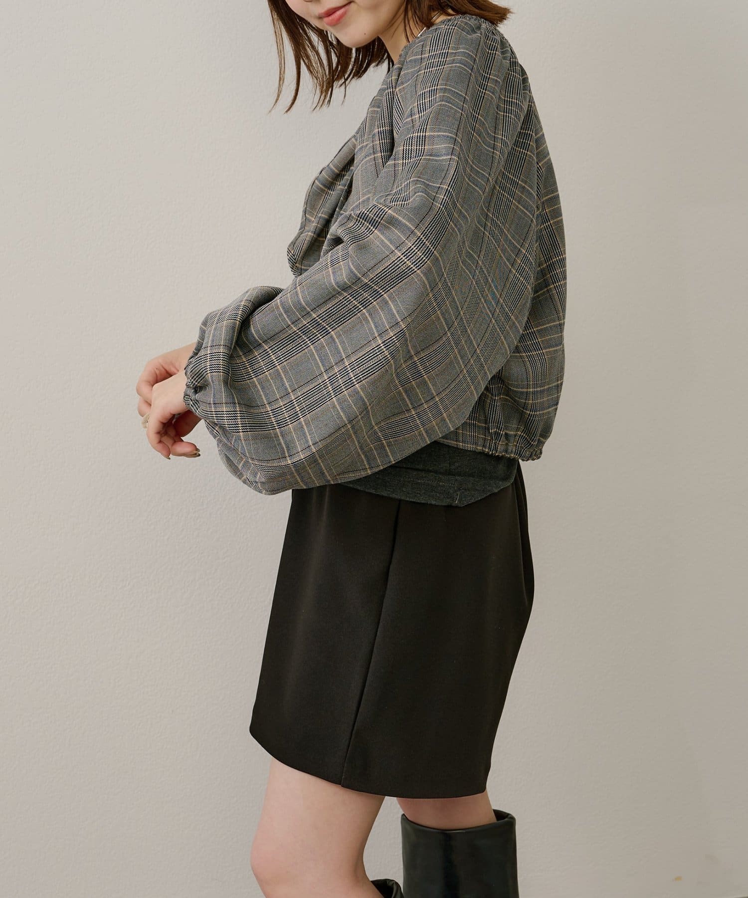 ・袖のボリューム感がポイントになりながらも、旬なショート丈でバランスが取りやすい一枚。