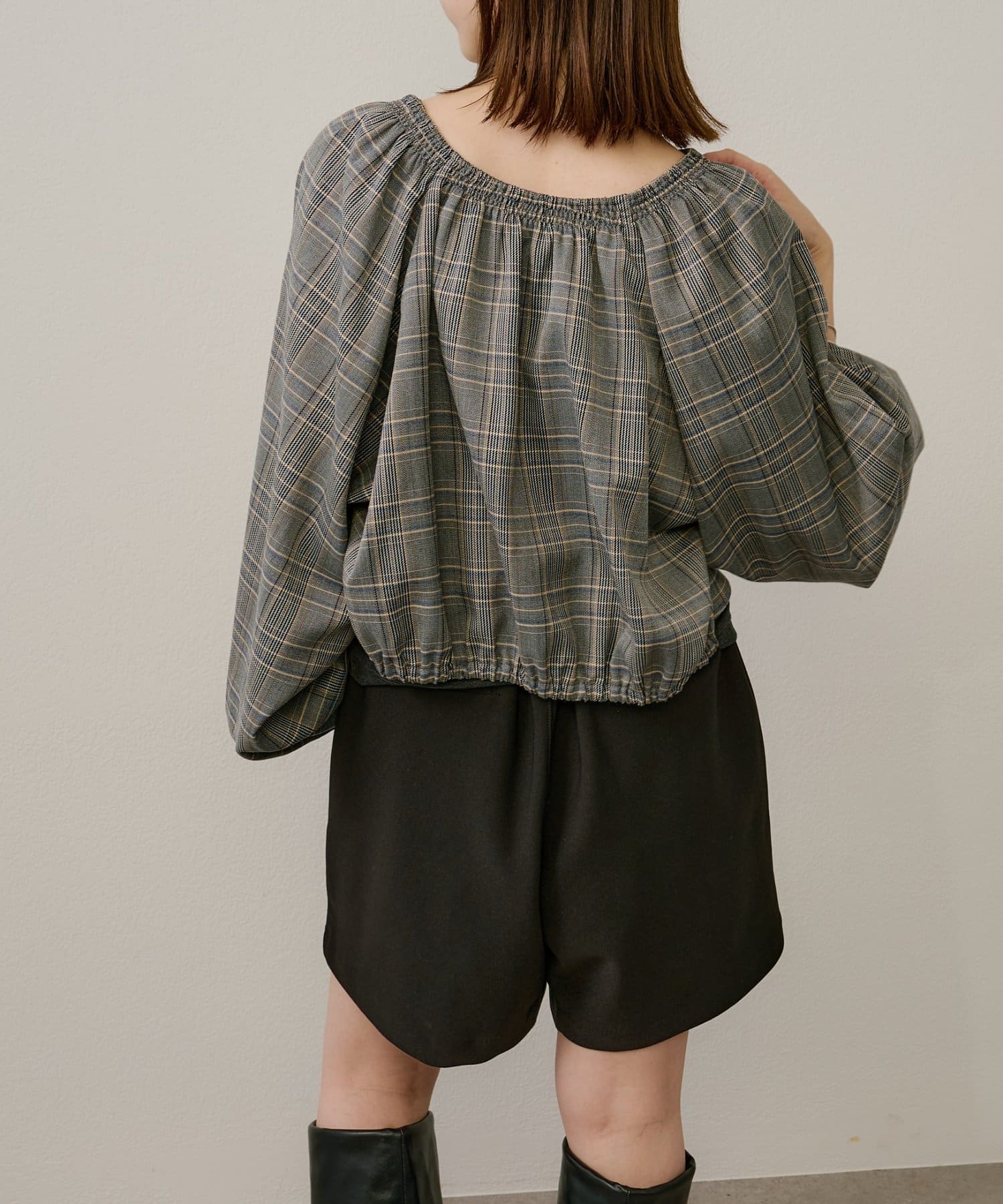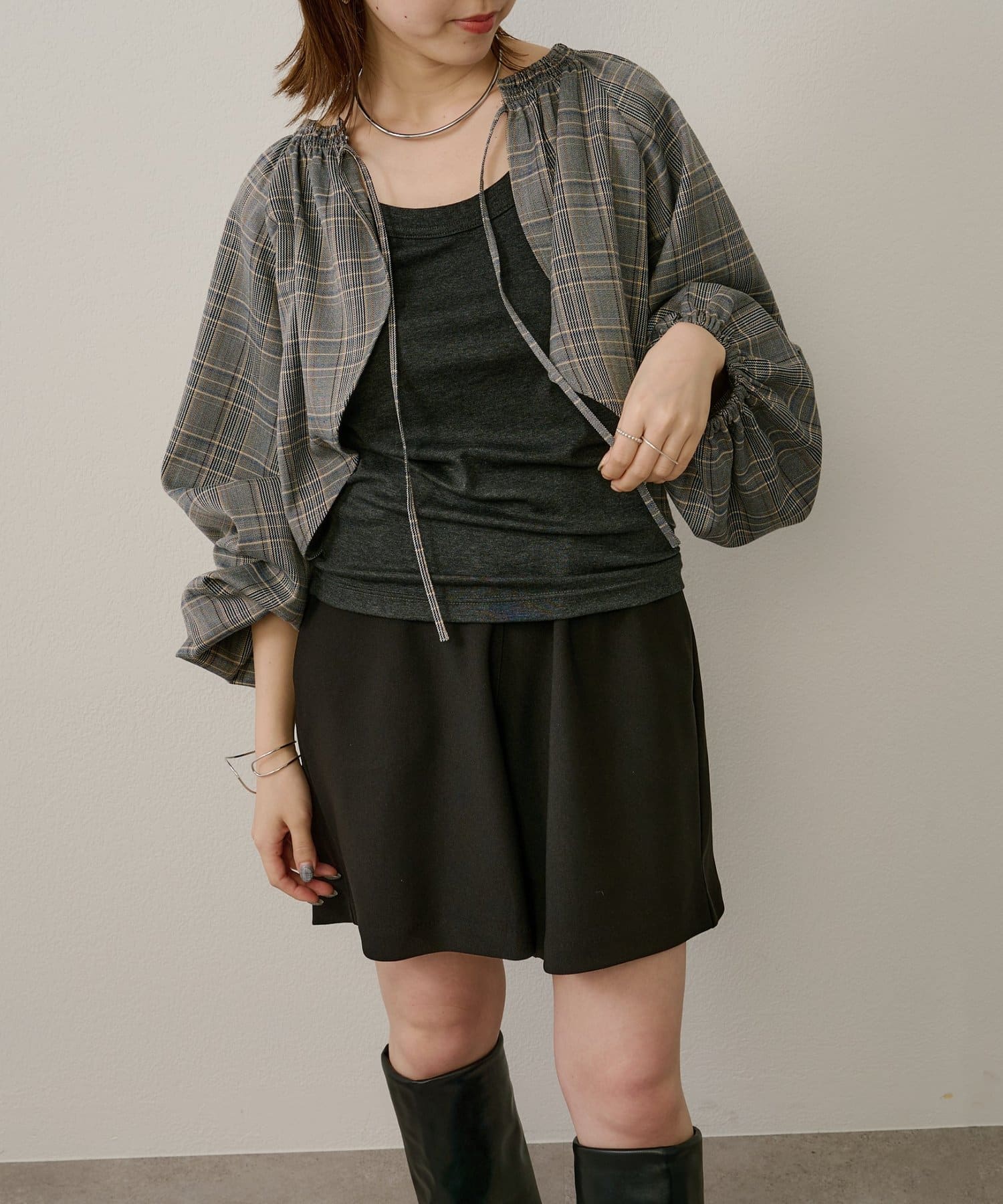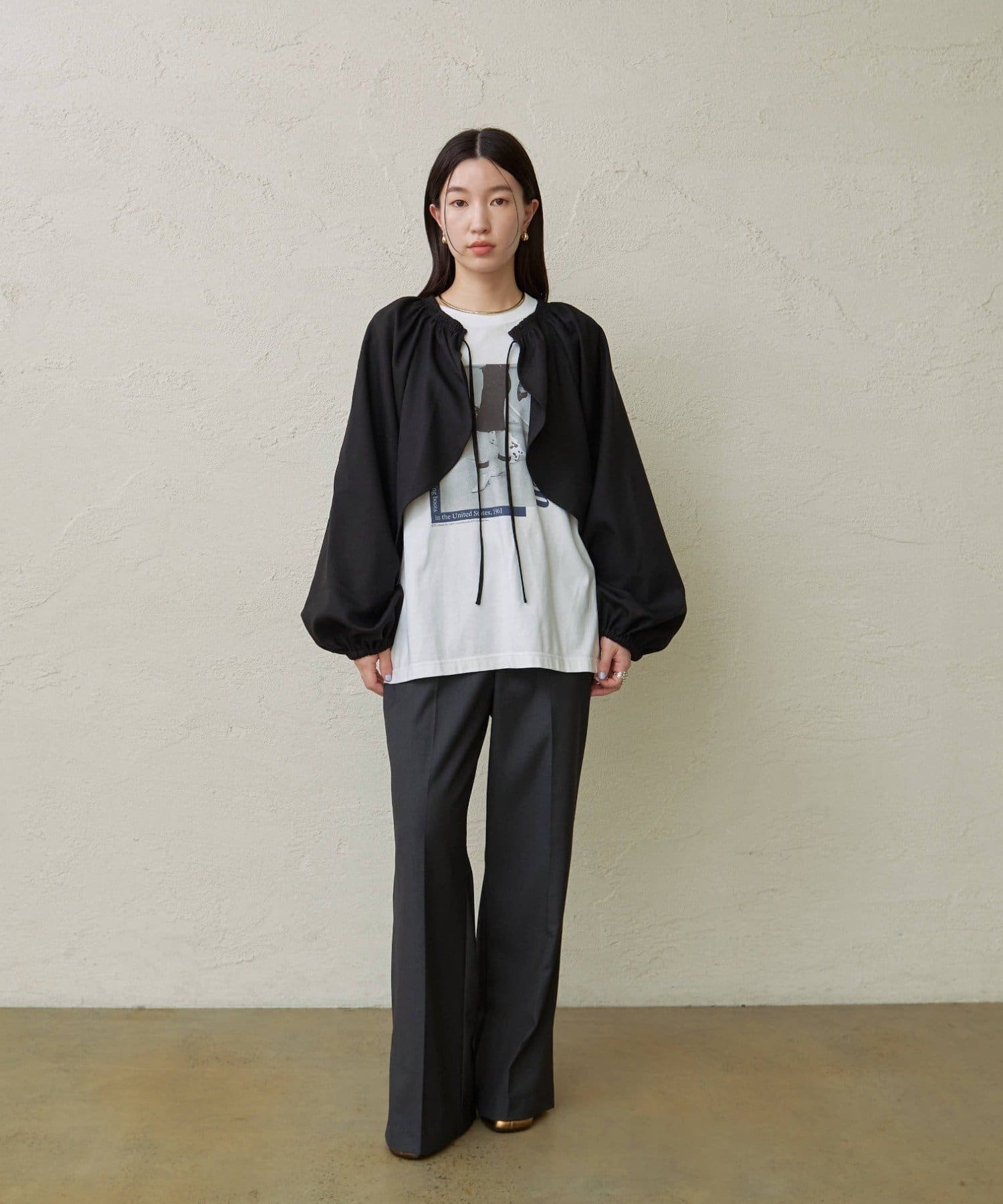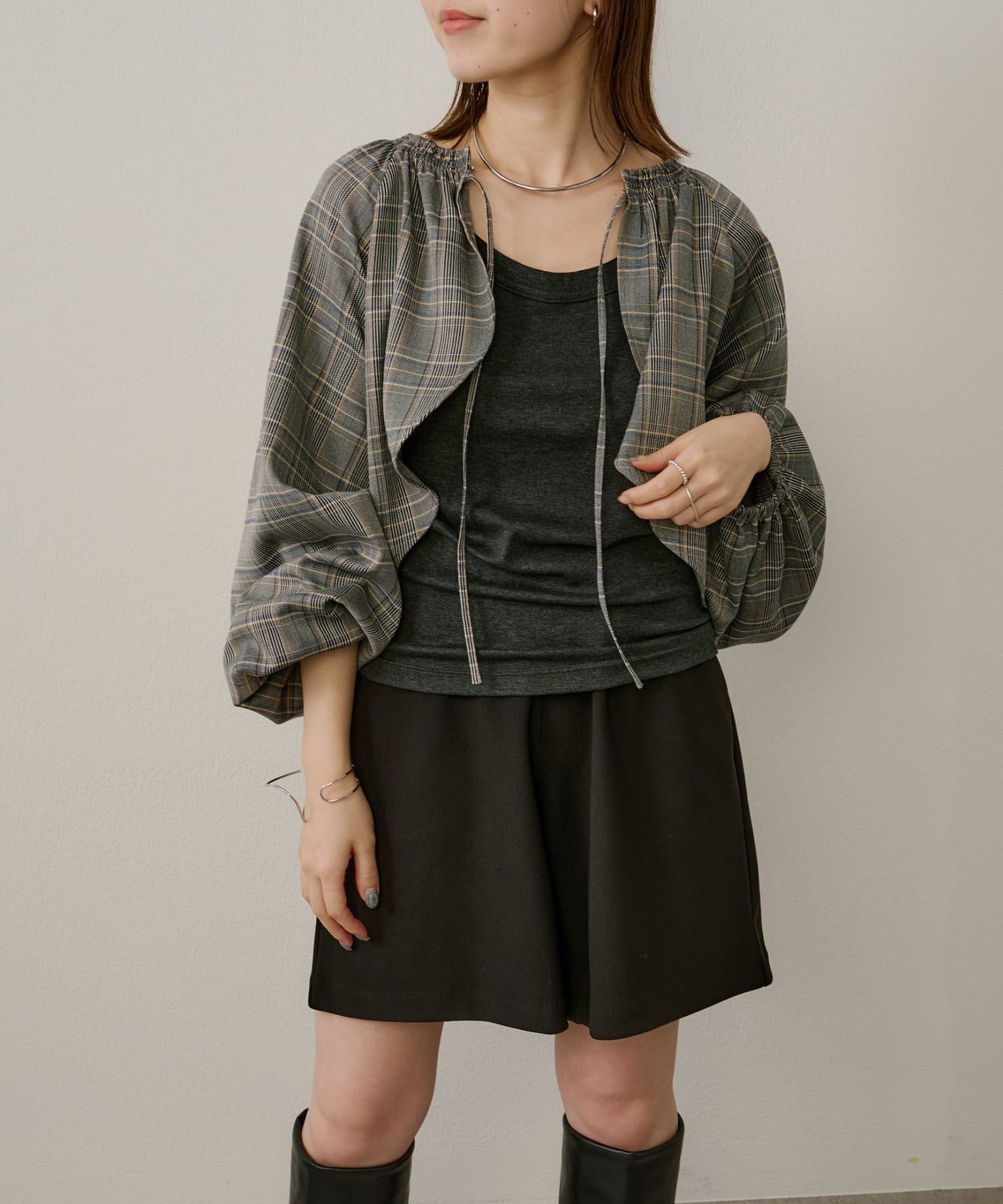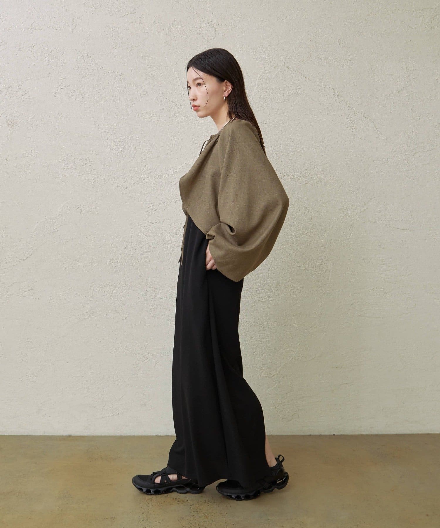 ・袖のボリューム感がポイントになりながらも、旬なショート丈でバランスが取りやすい一枚。
