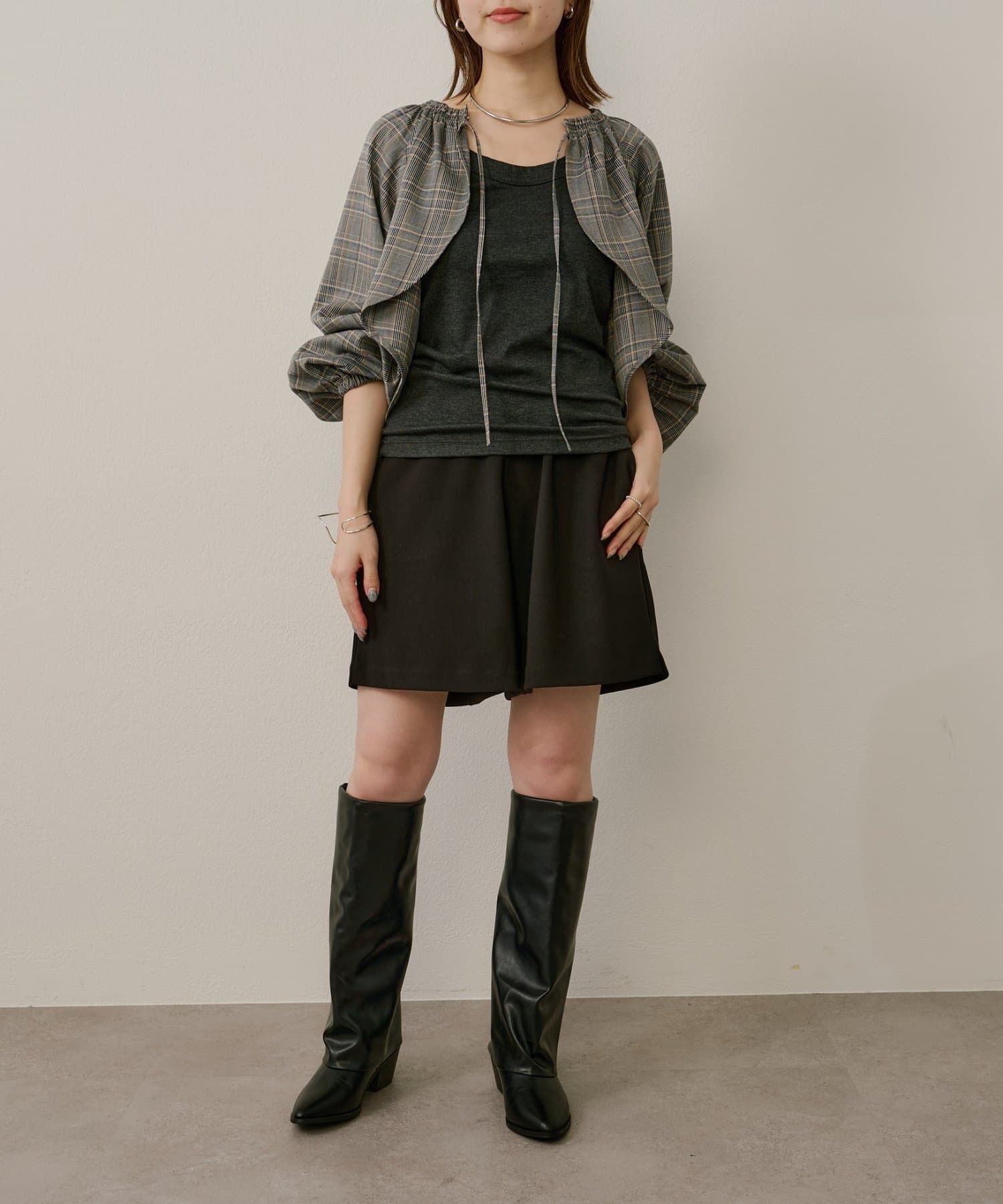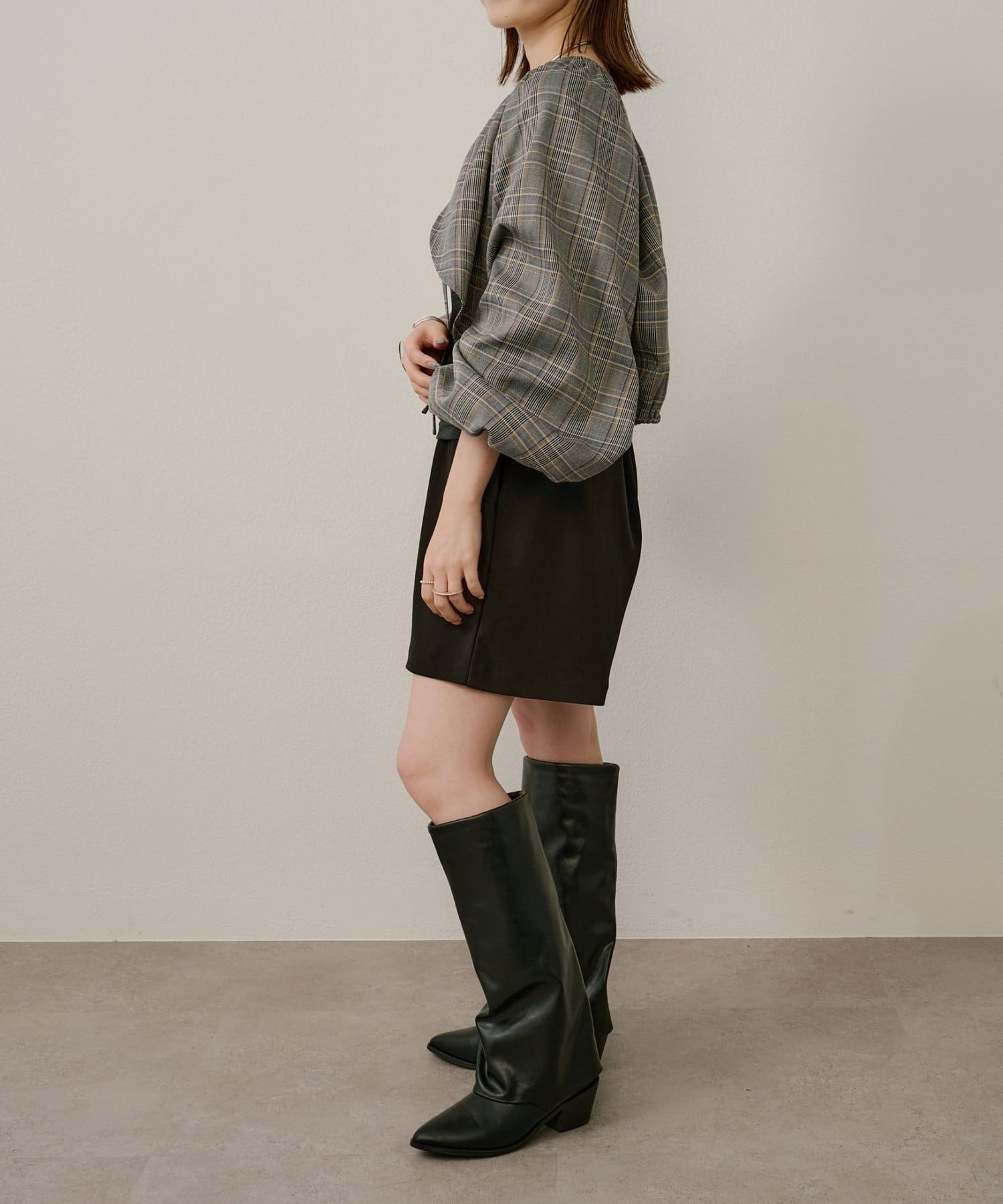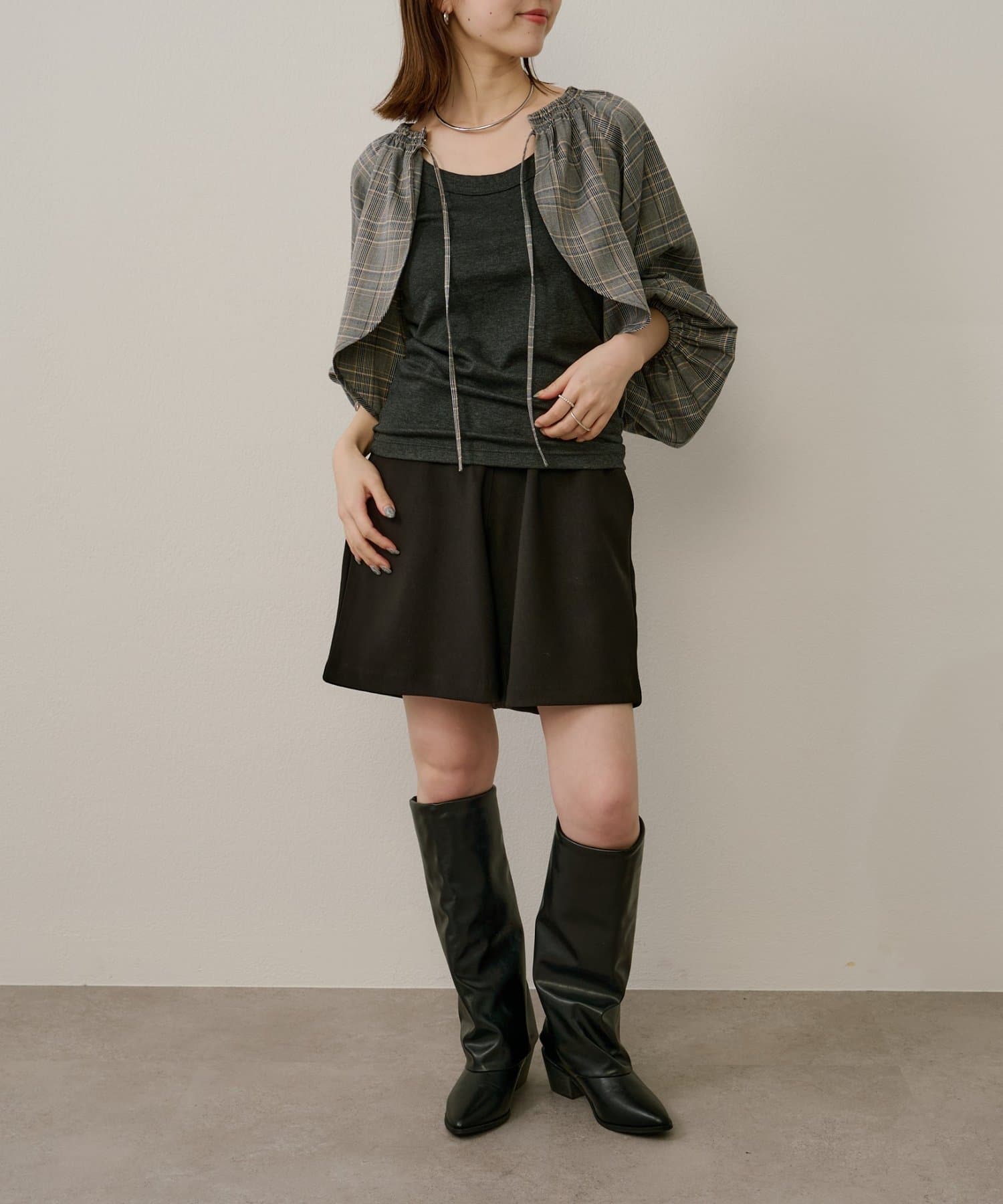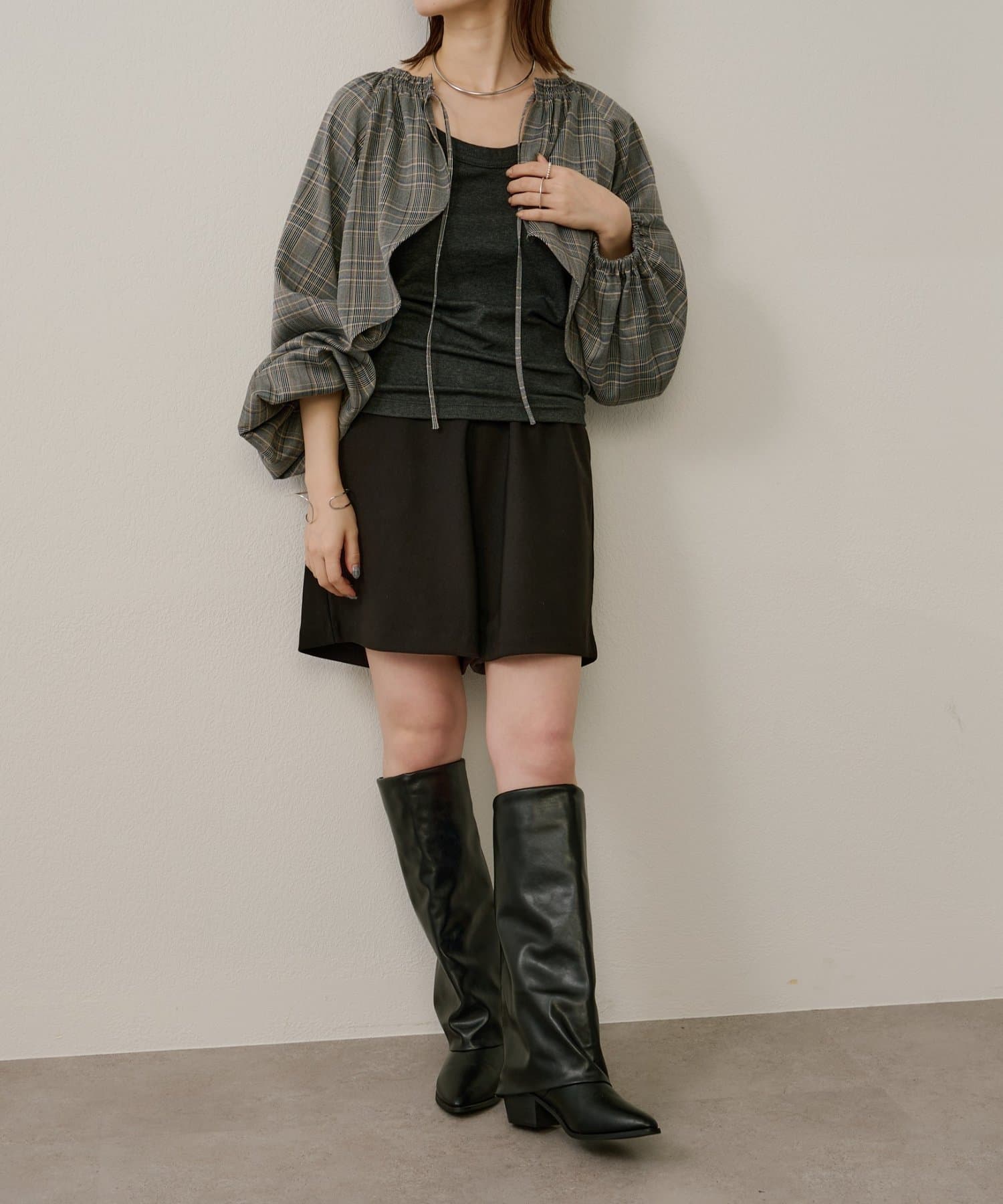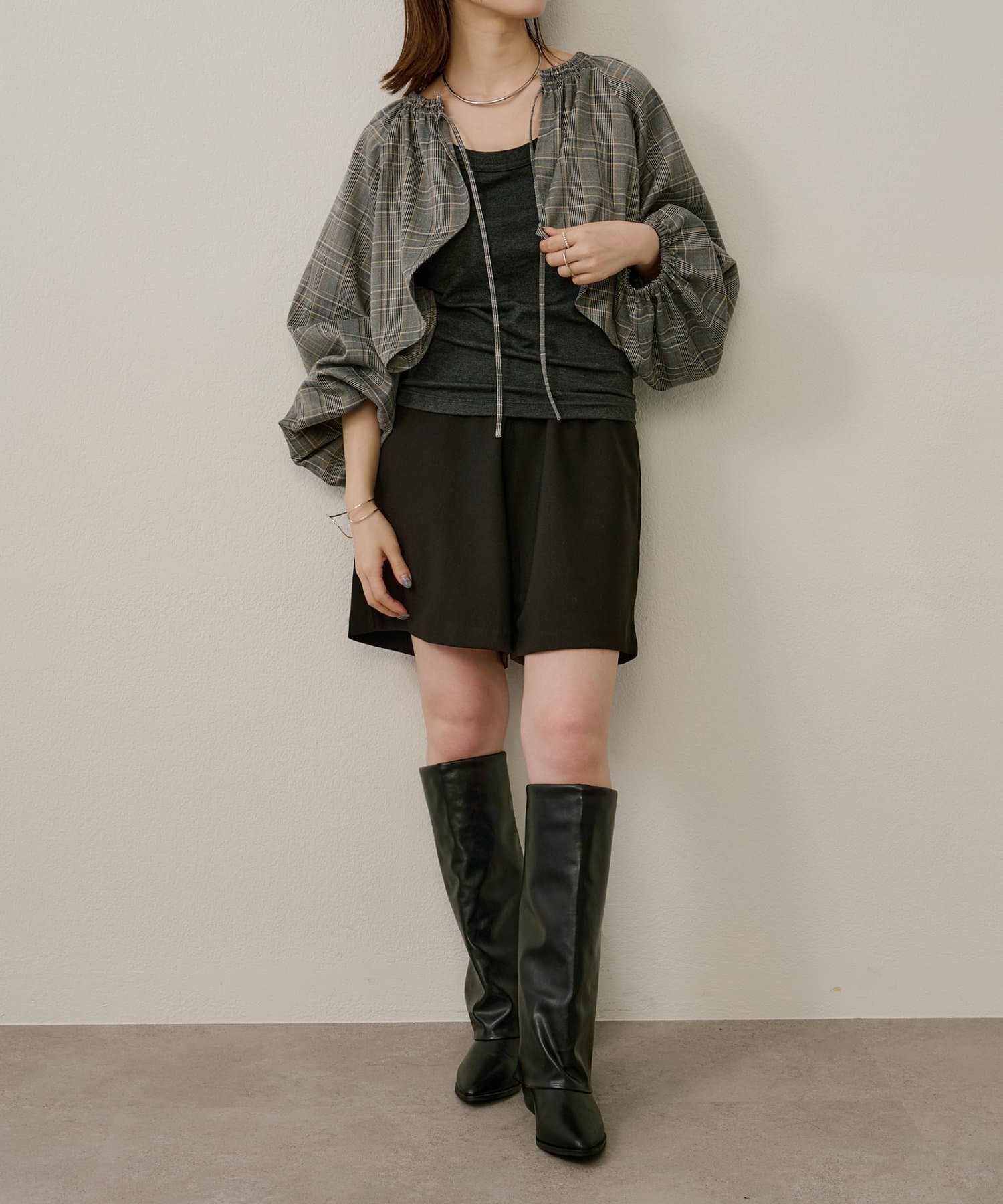 ・袖のボリューム感がポイントになりながらも、旬なショート丈でバランスが取りやすい一枚。