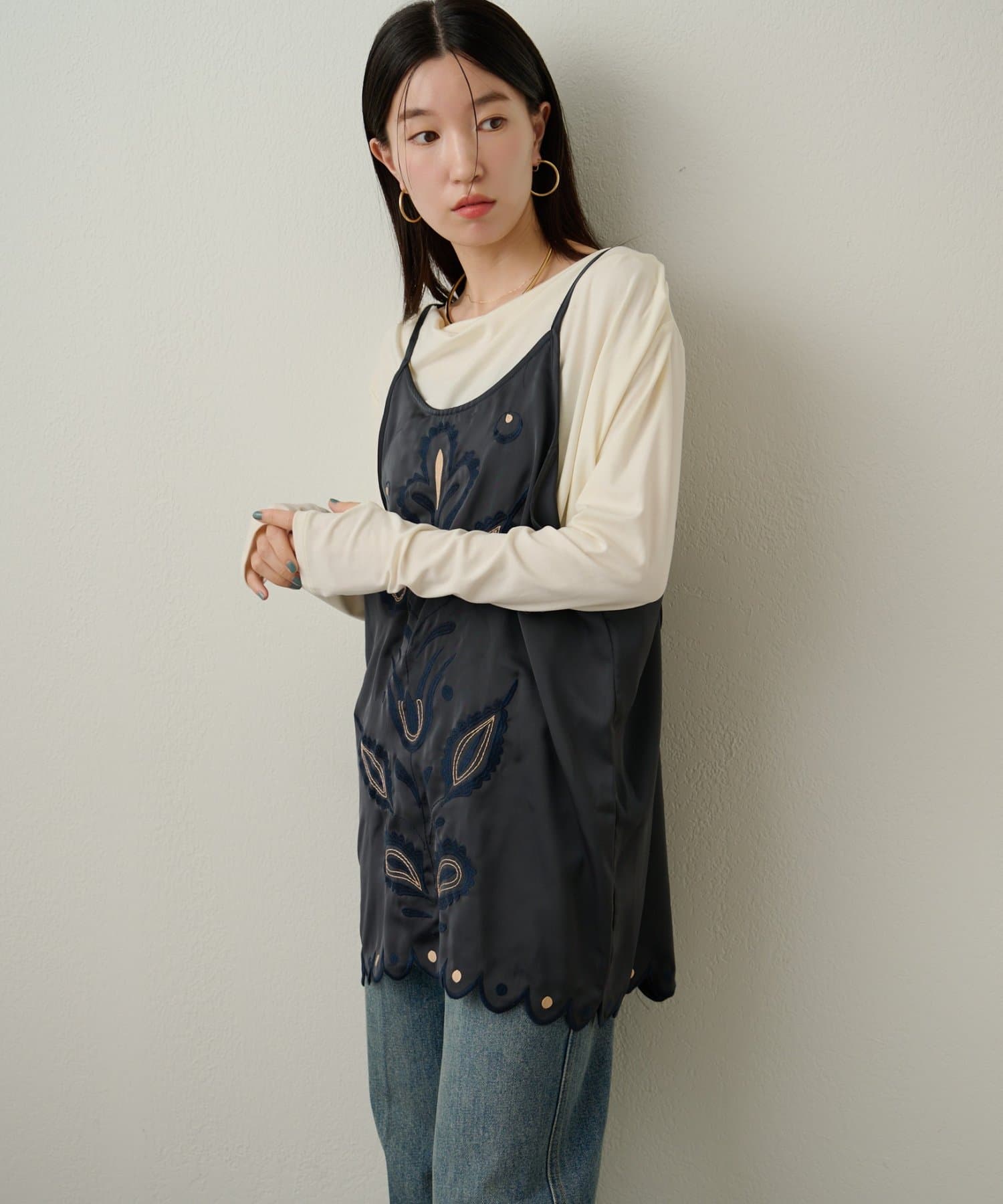ペイズリー柄の刺繍が目を惹くサテンキャミチュニック