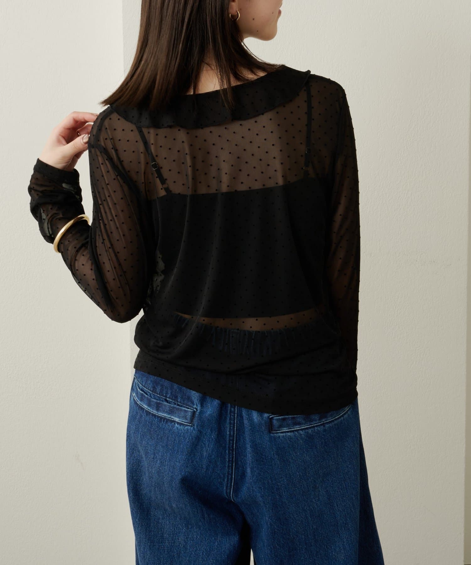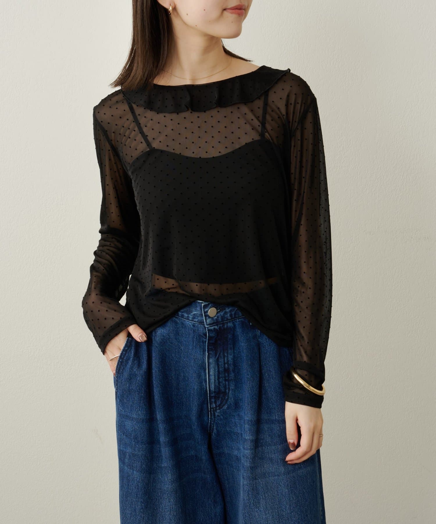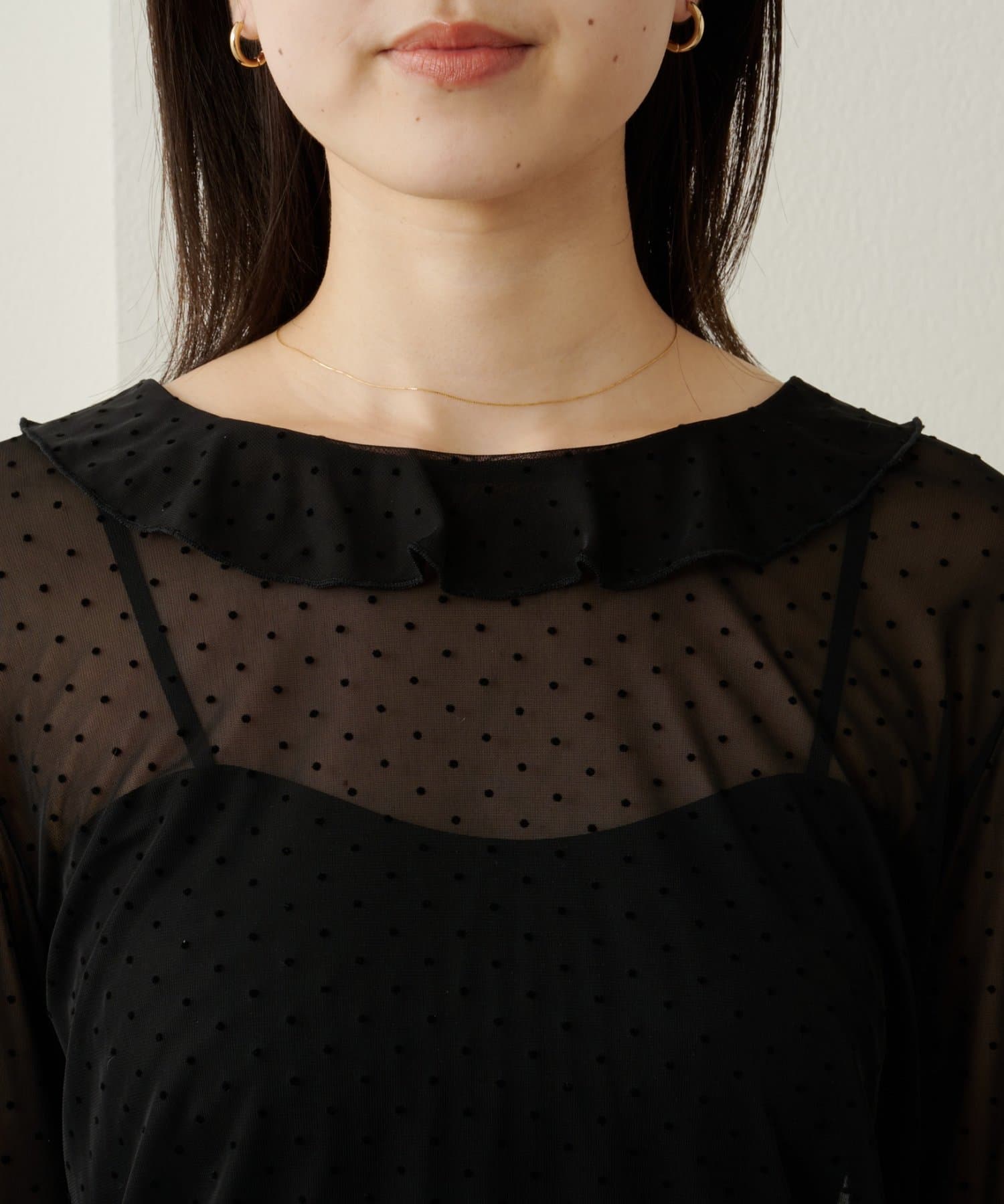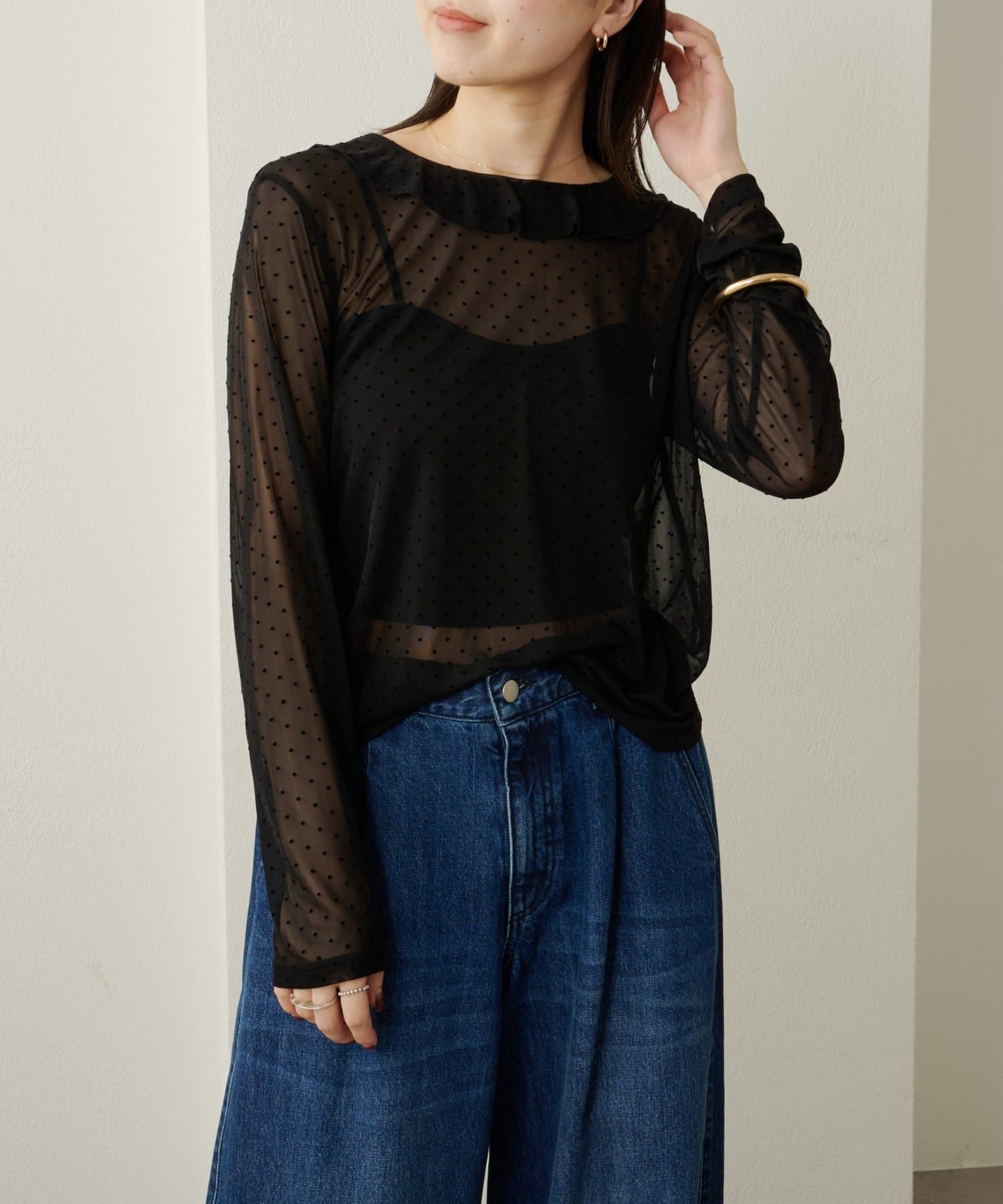 ・首元のフリルとさりげないドット柄がコーディネートのポイントになる一枚。