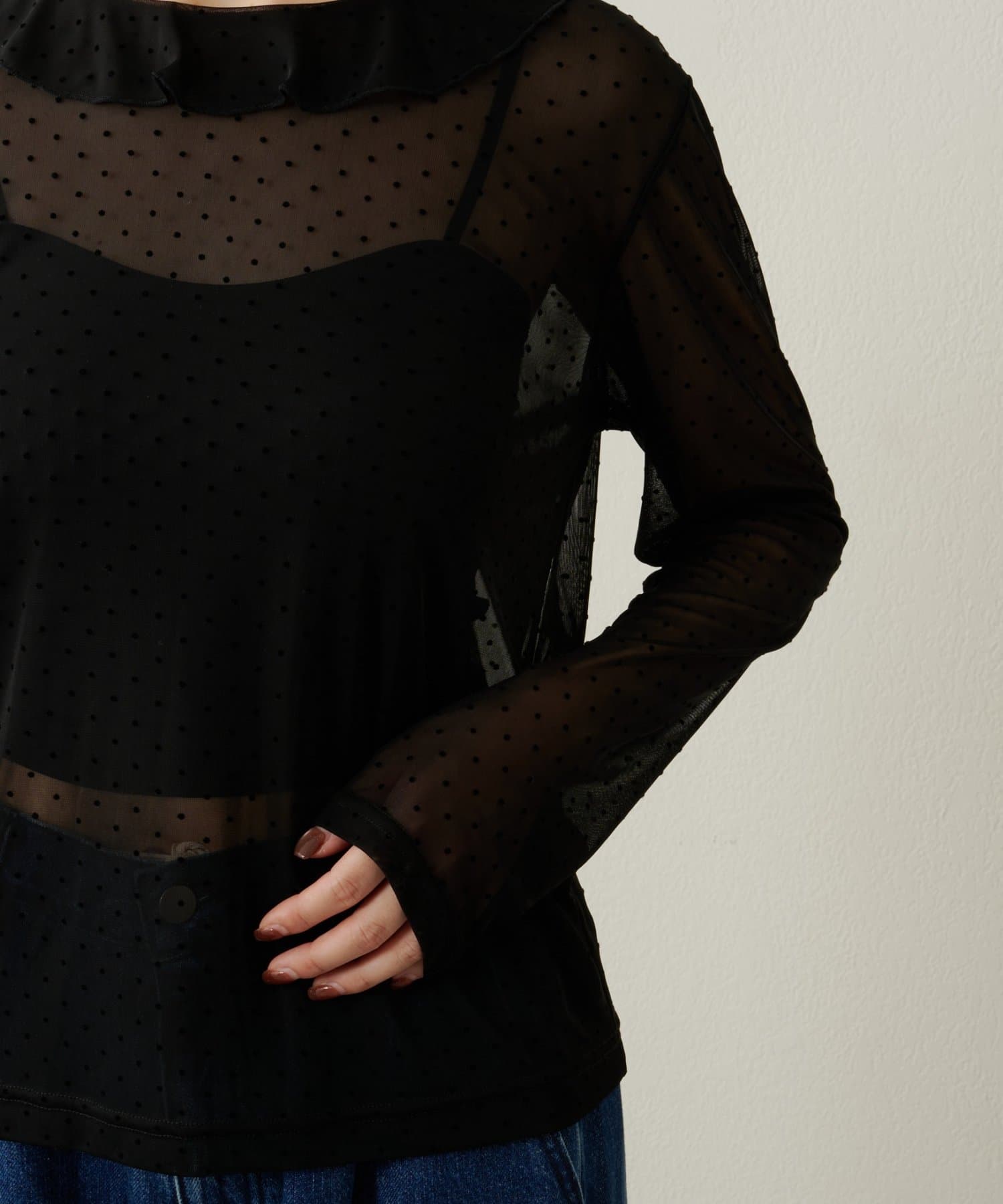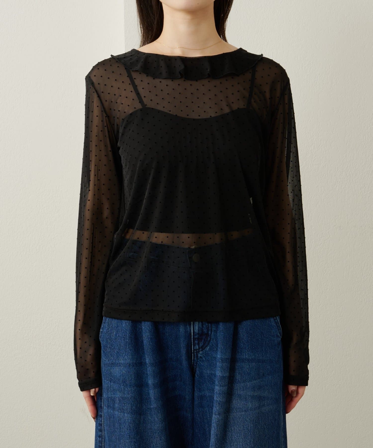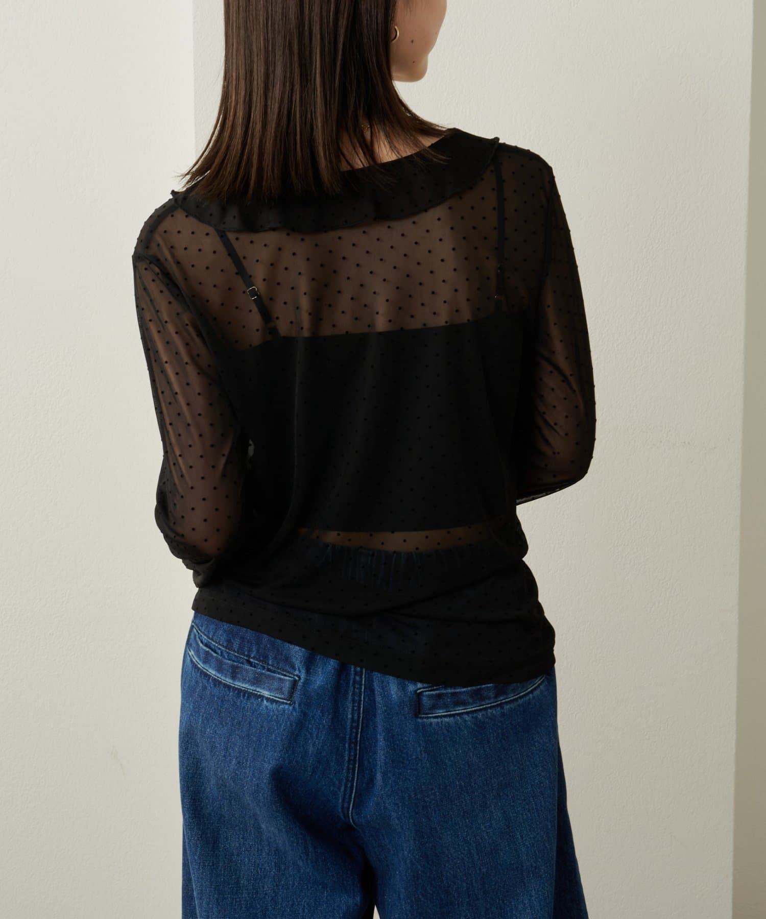 ・首元のフリルとさりげないドット柄がコーディネートのポイントになる一枚。