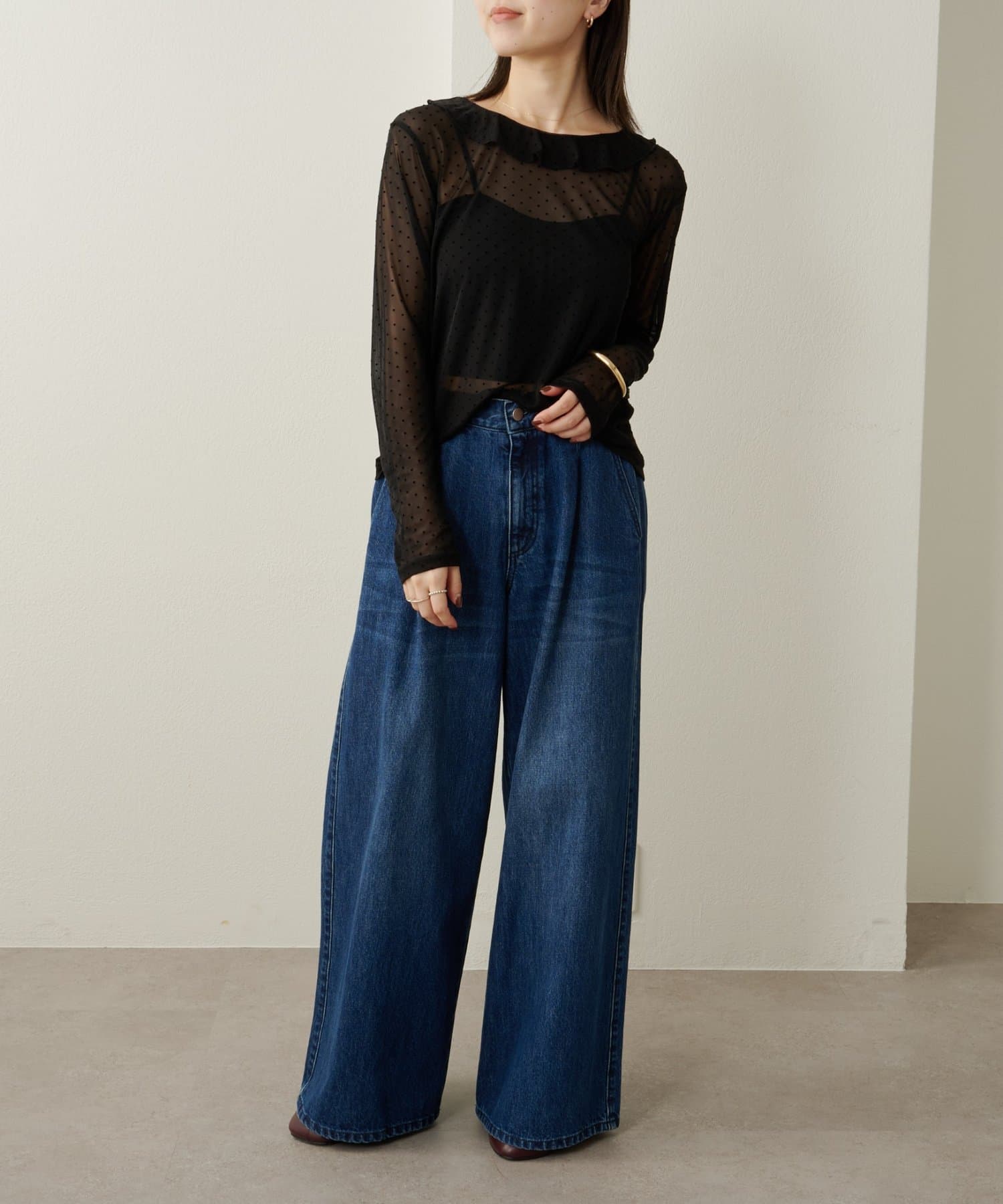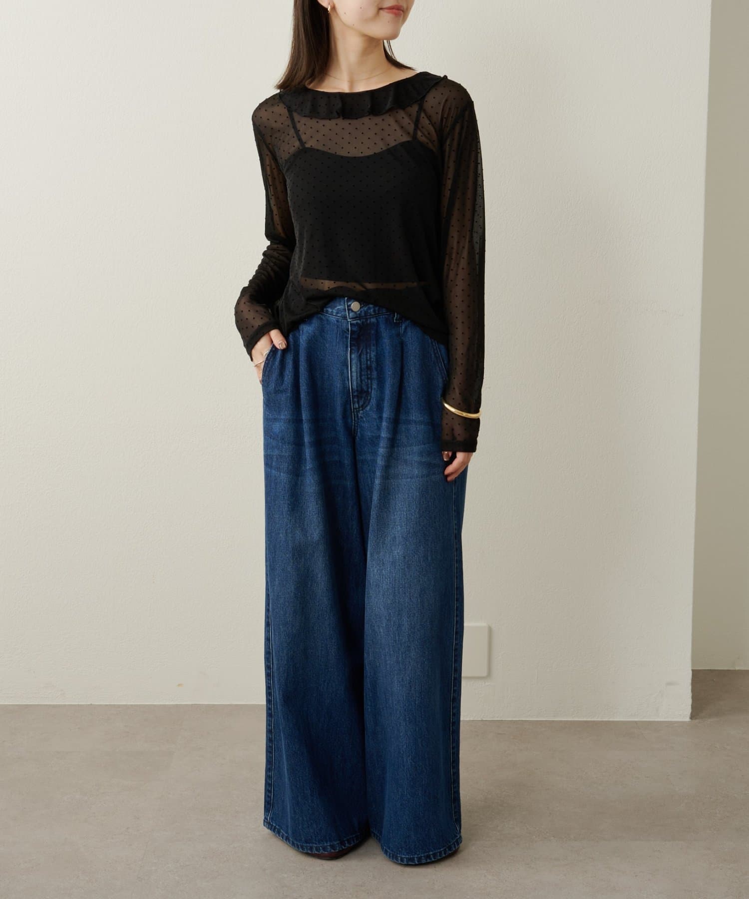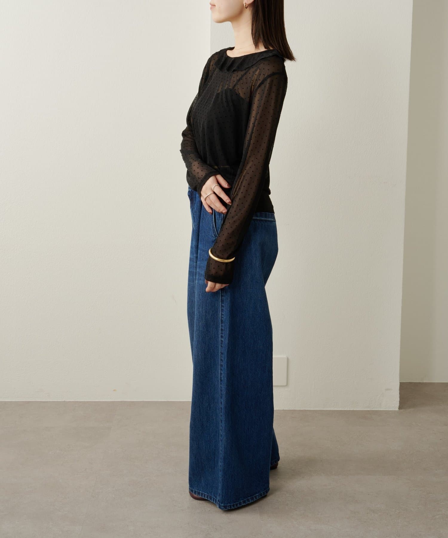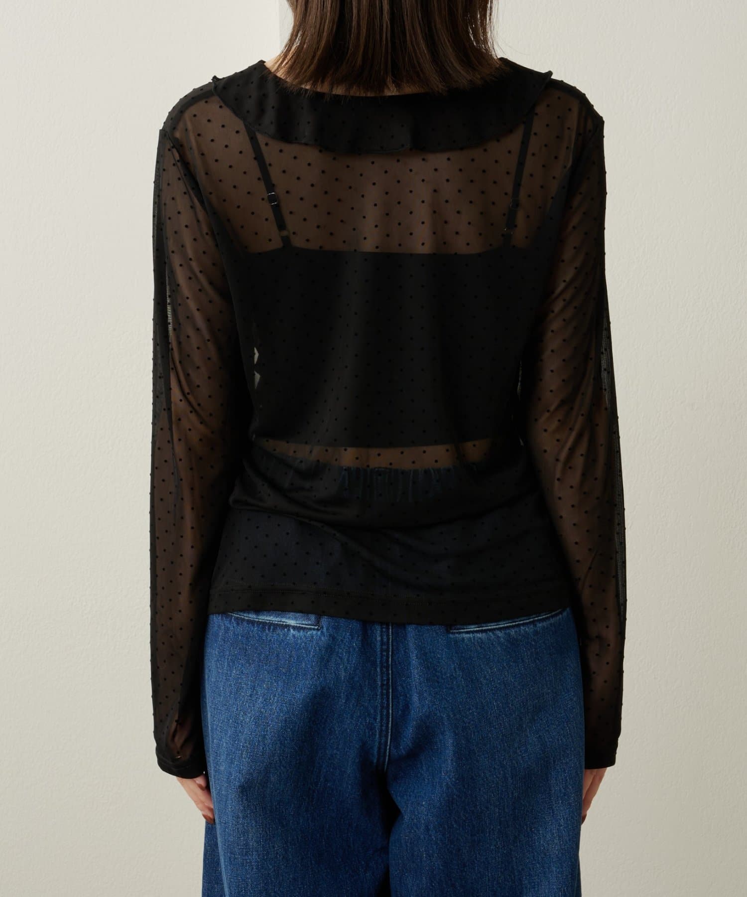 ・首元のフリルとさりげないドット柄がコーディネートのポイントになる一枚。