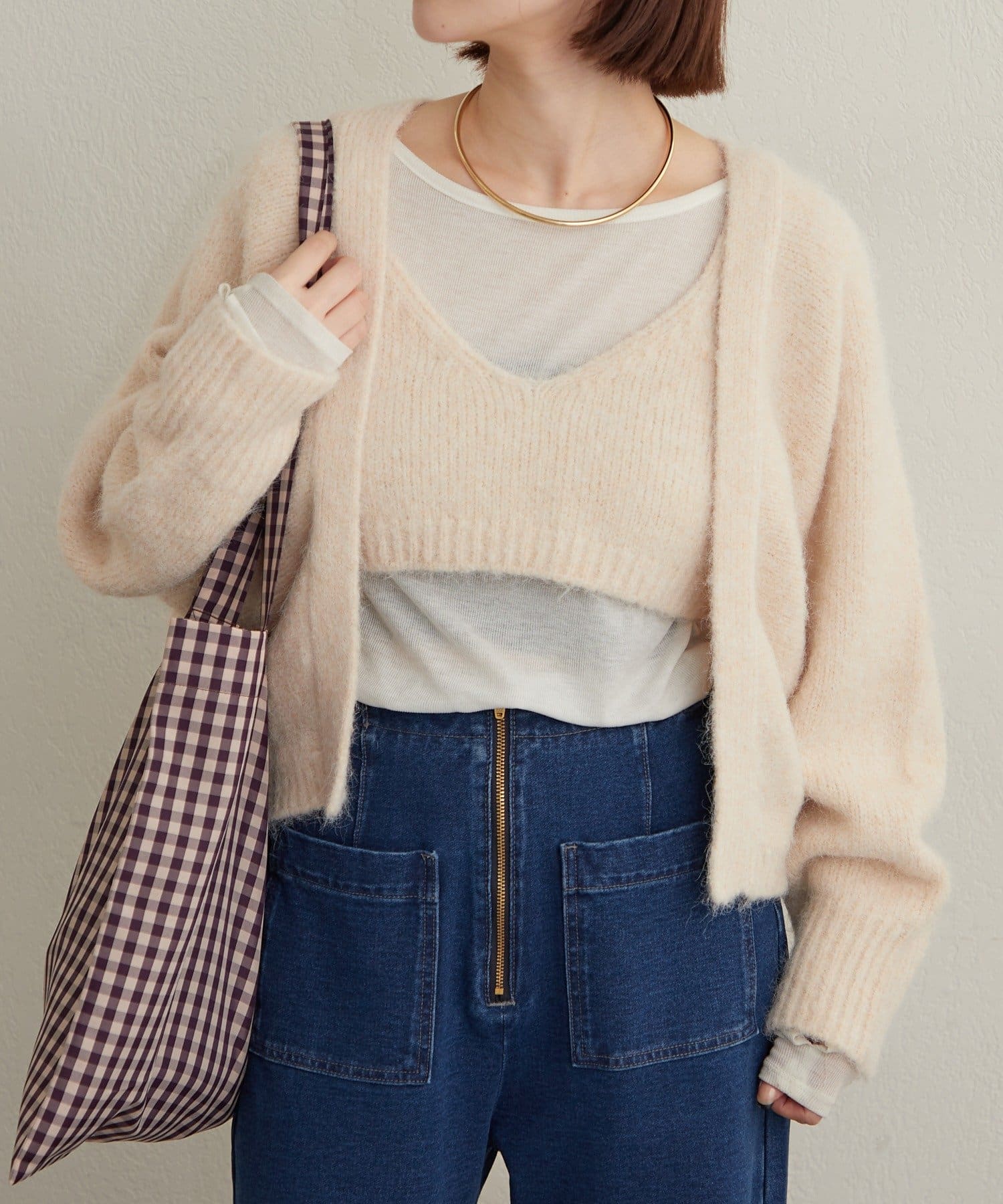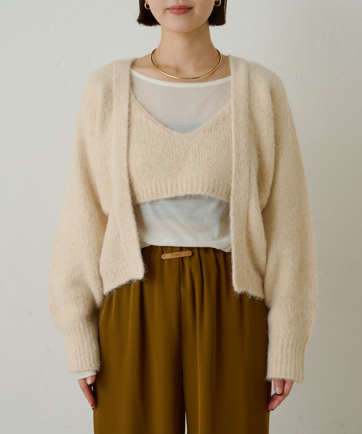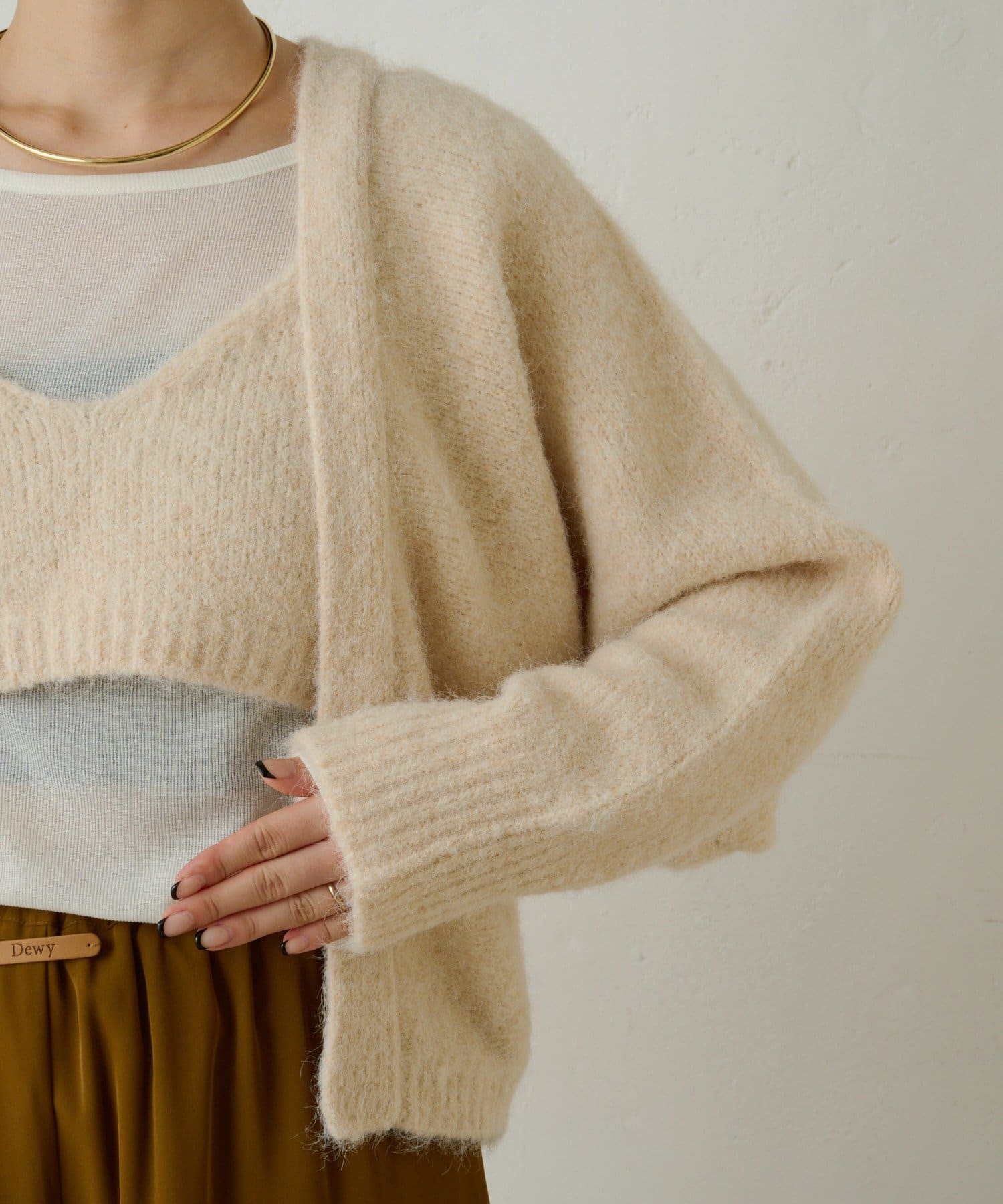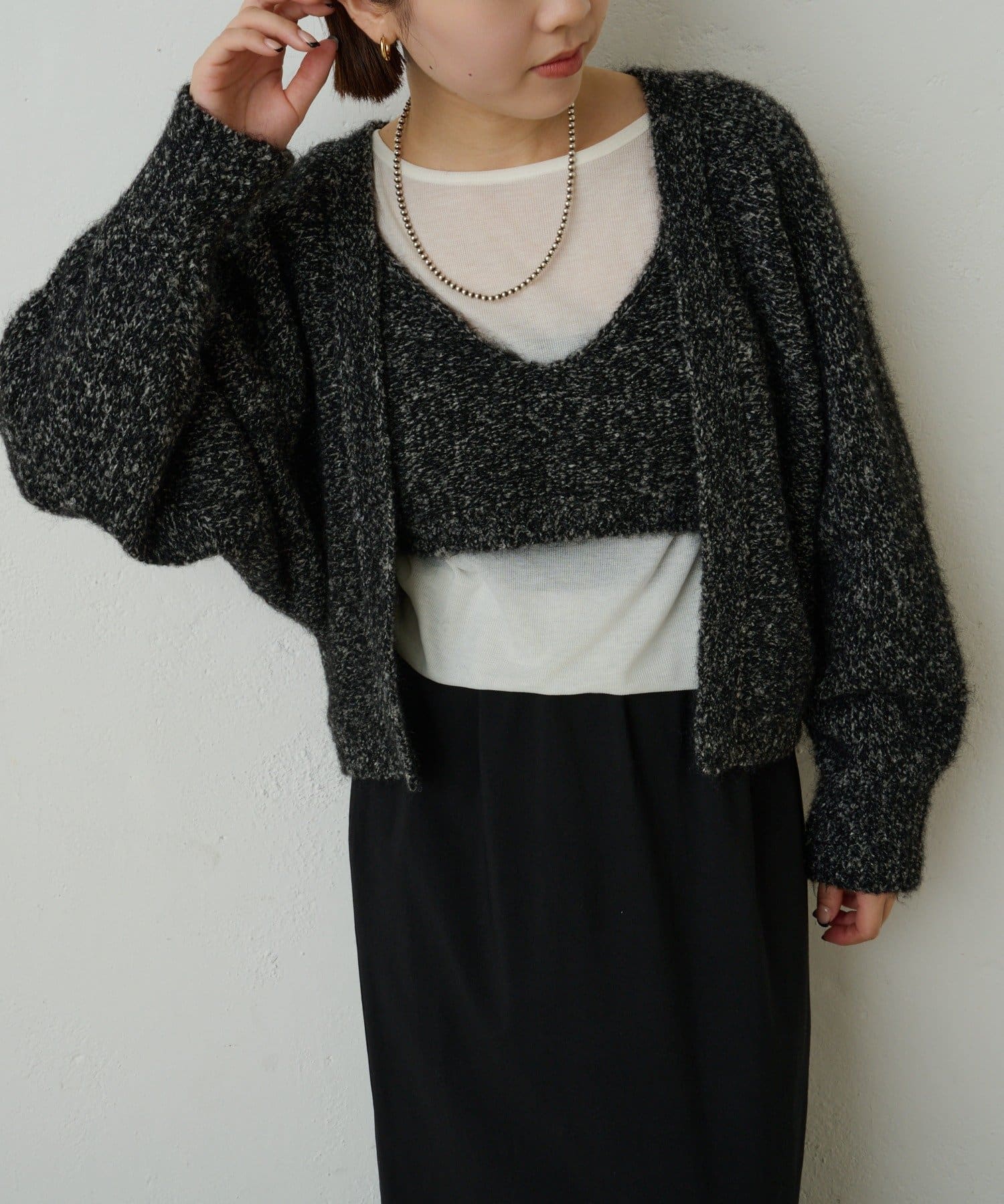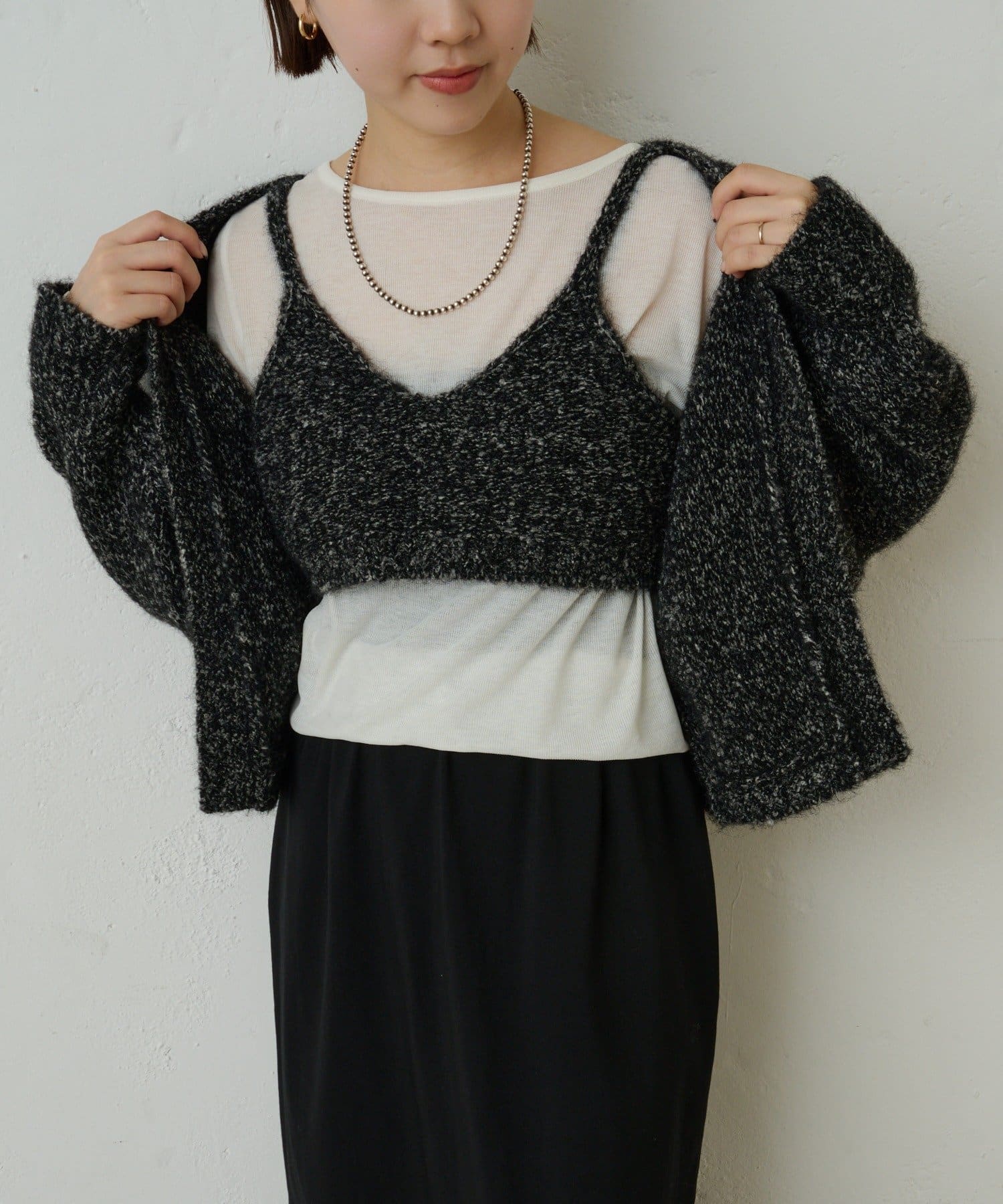 ・同素材のキャミソールとボレロがセットになっており、様々な着こなしが叶う一枚。