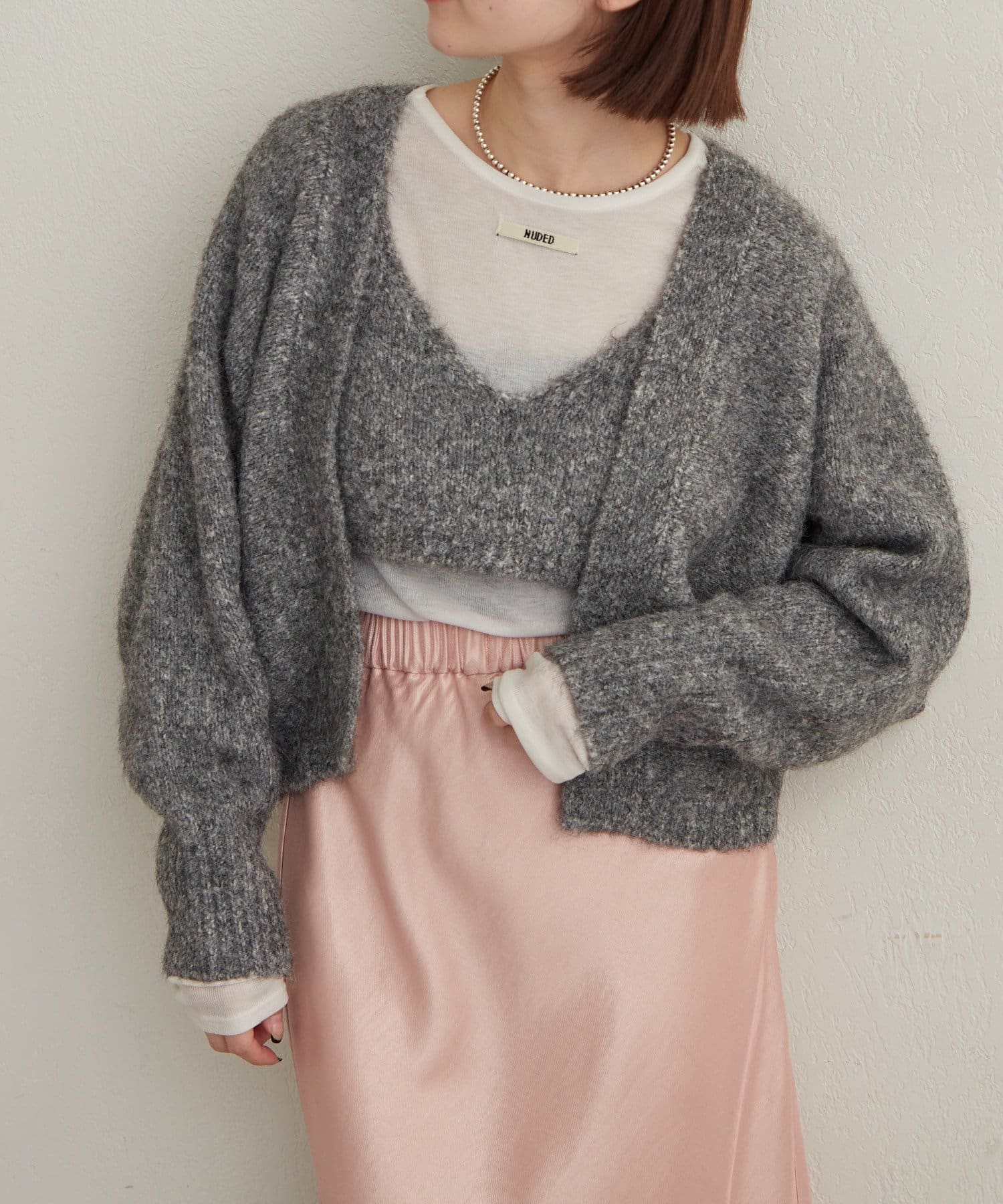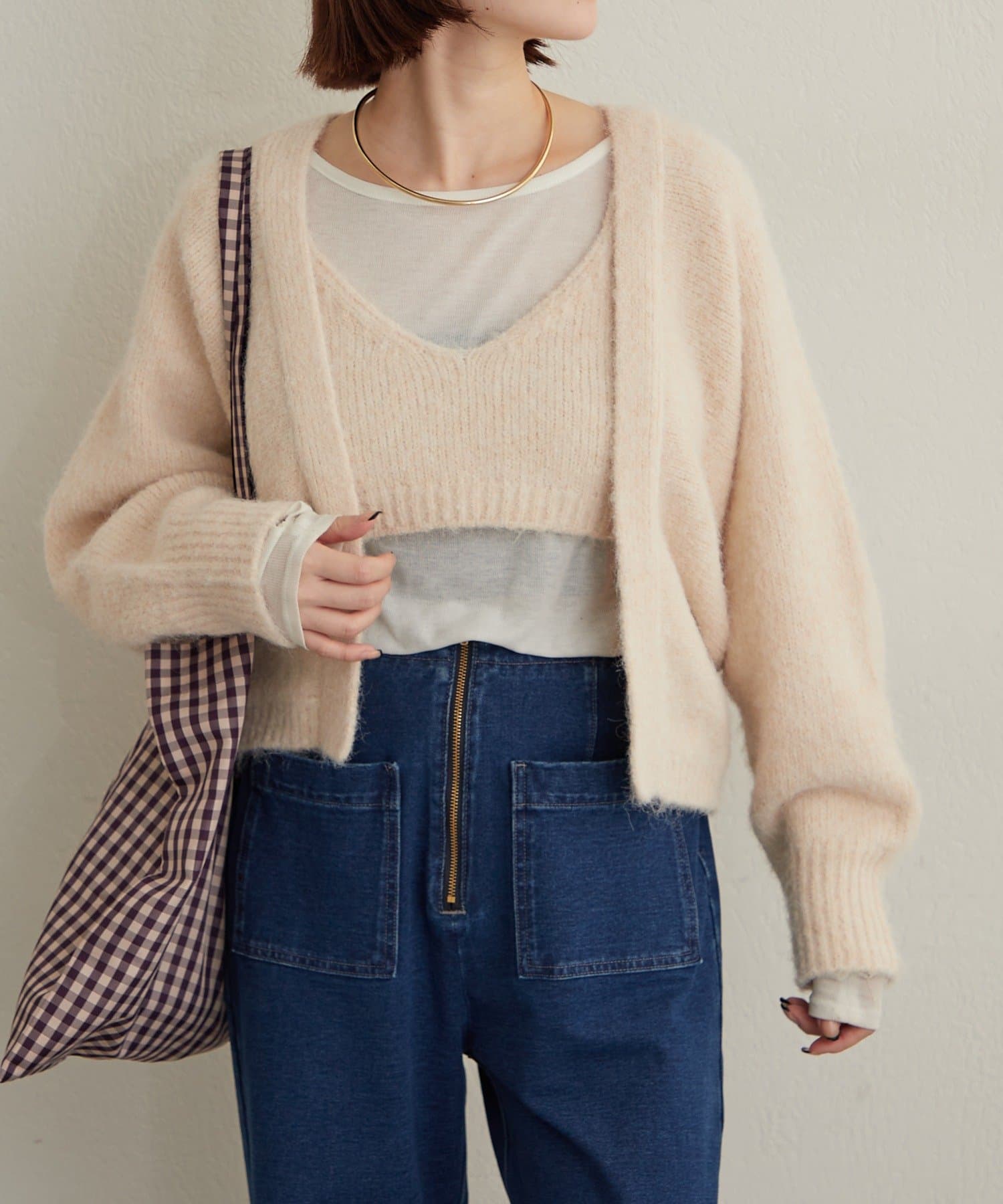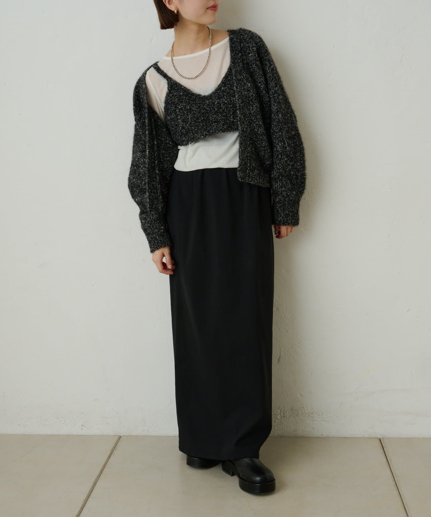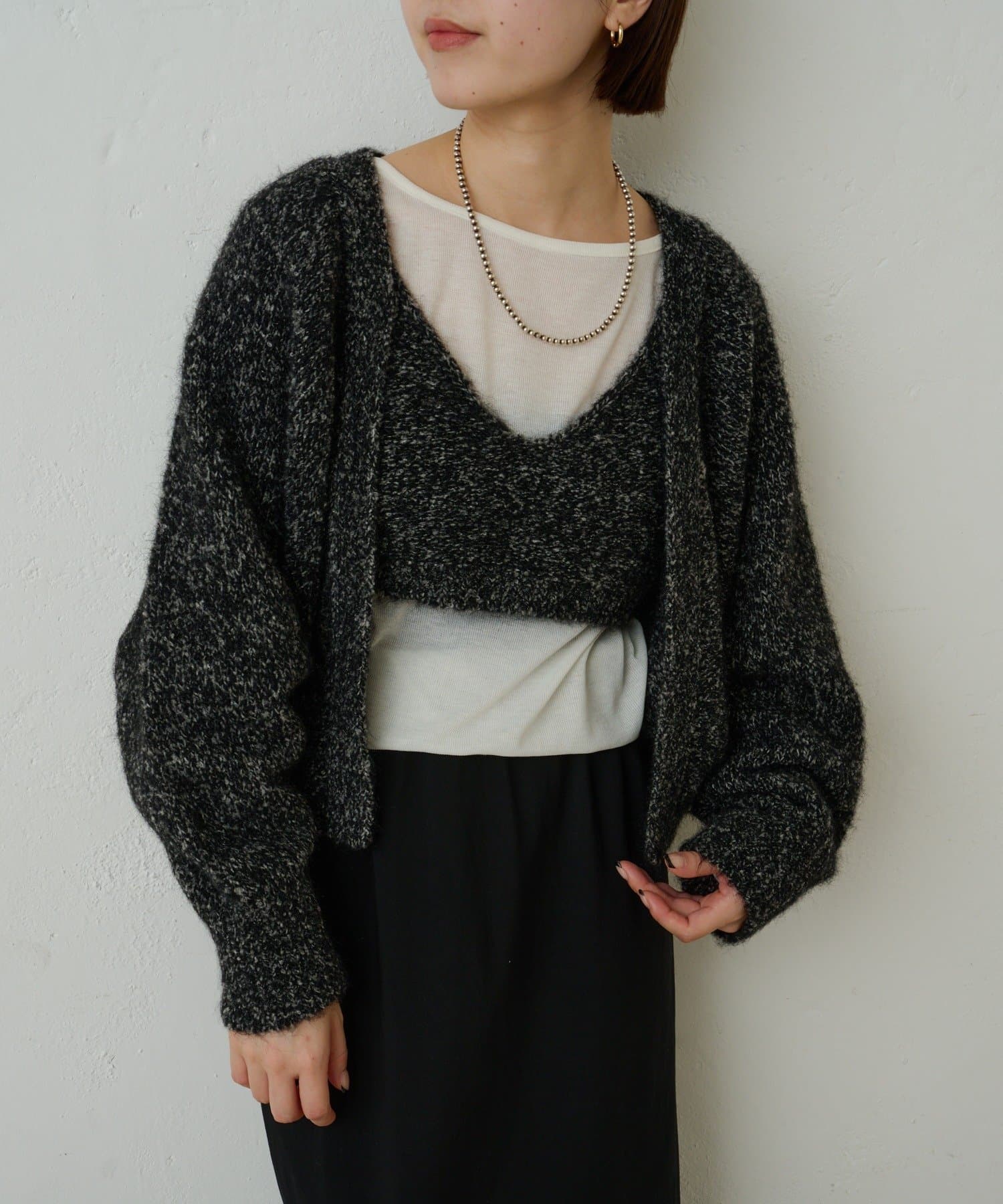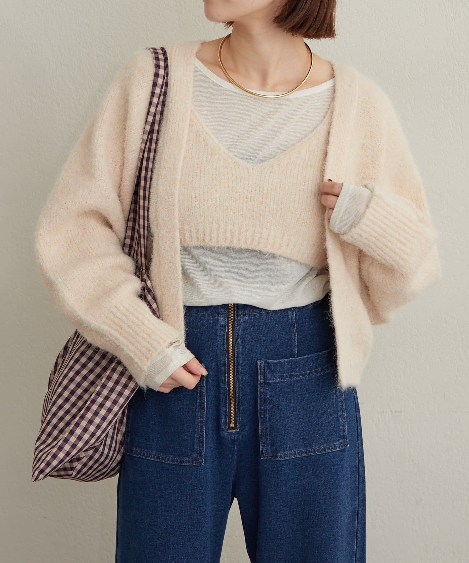 ・同素材のキャミソールとボレロがセットになっており、様々な着こなしが叶う一枚。