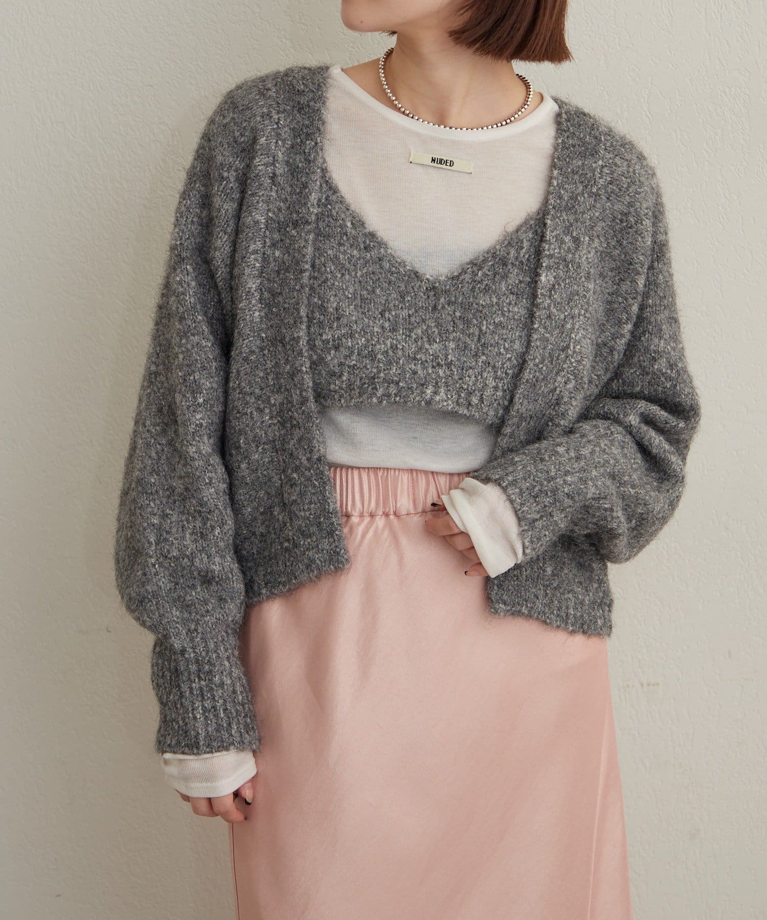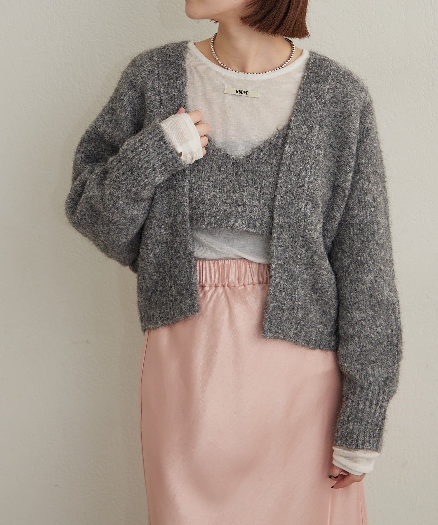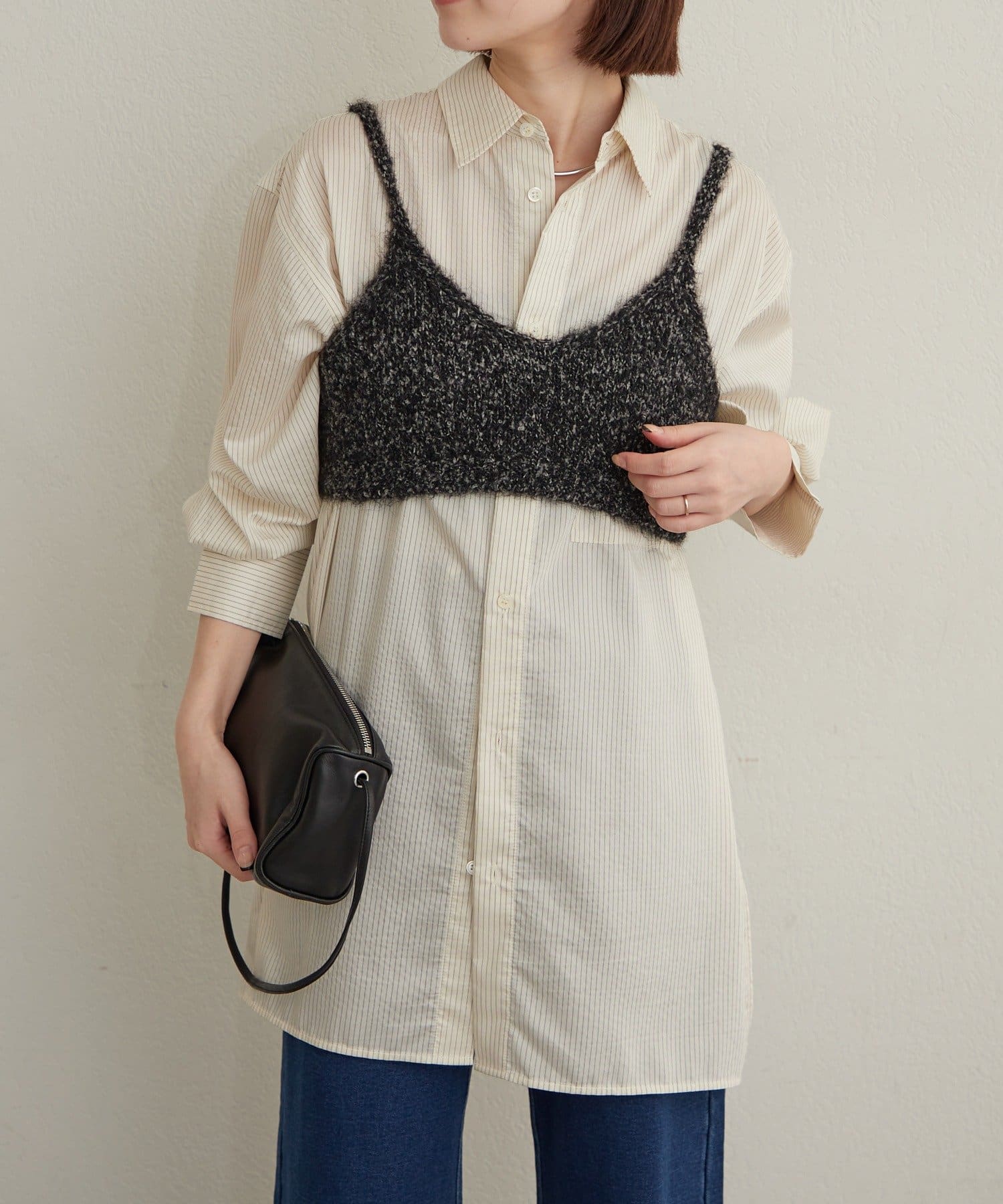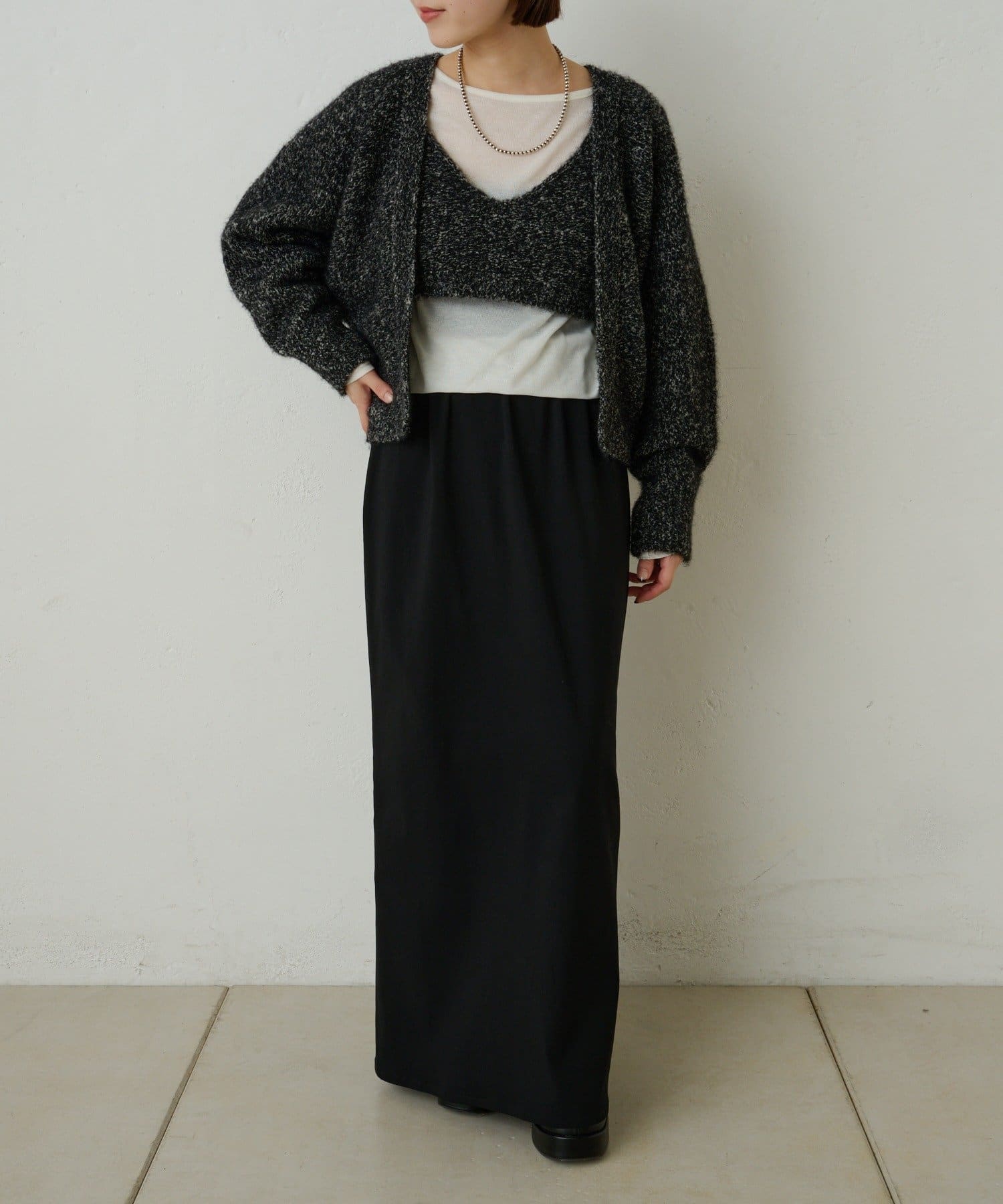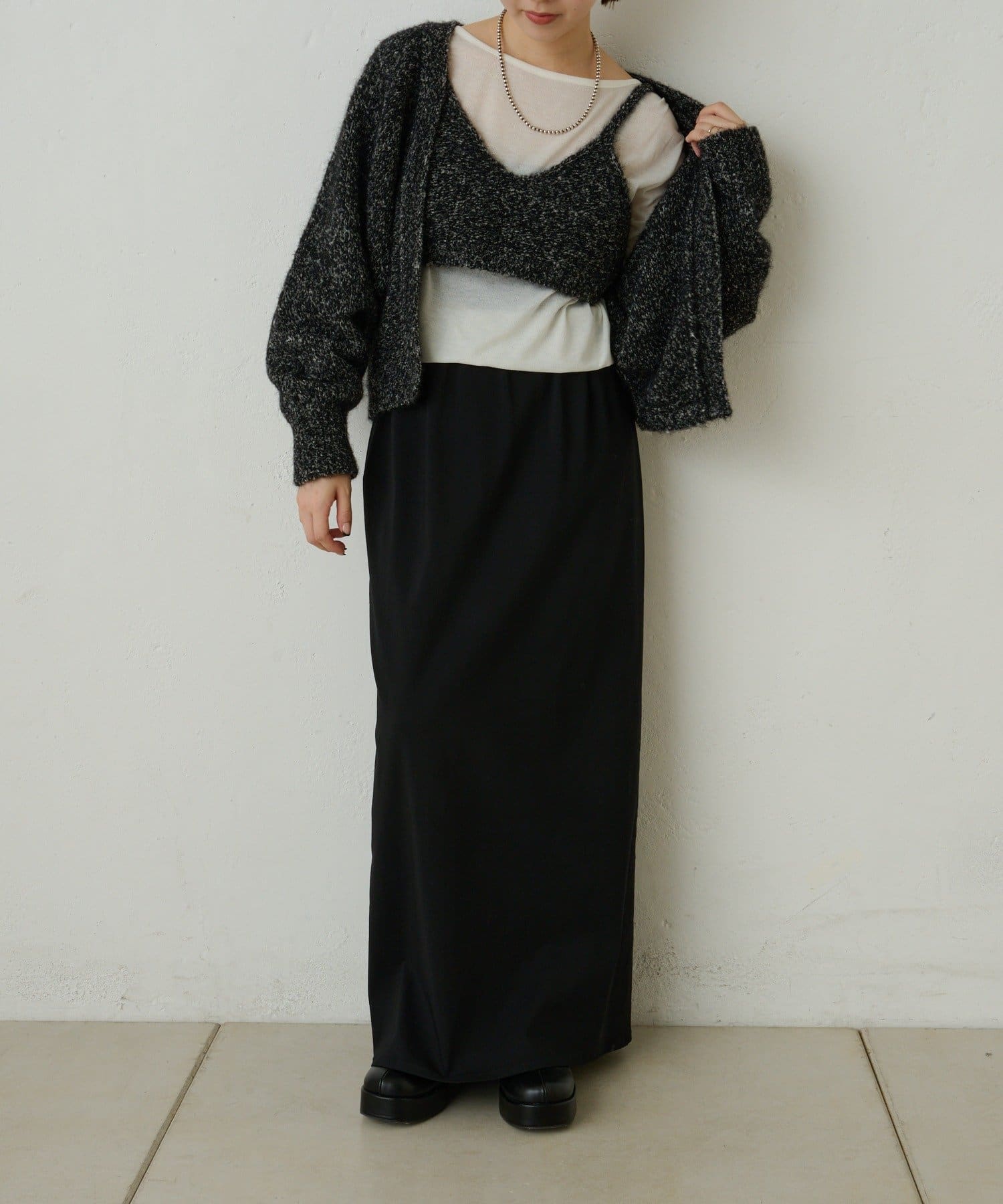 ・同素材のキャミソールとボレロがセットになっており、様々な着こなしが叶う一枚。