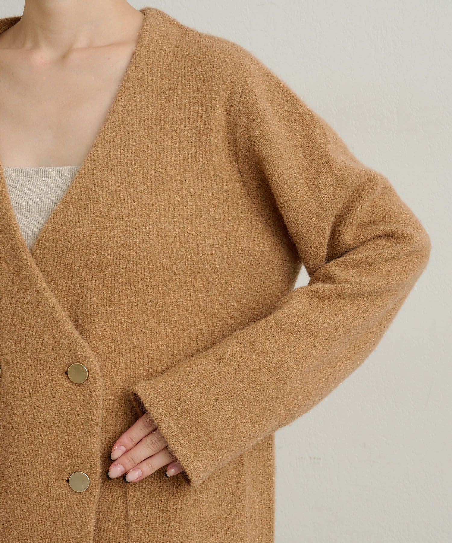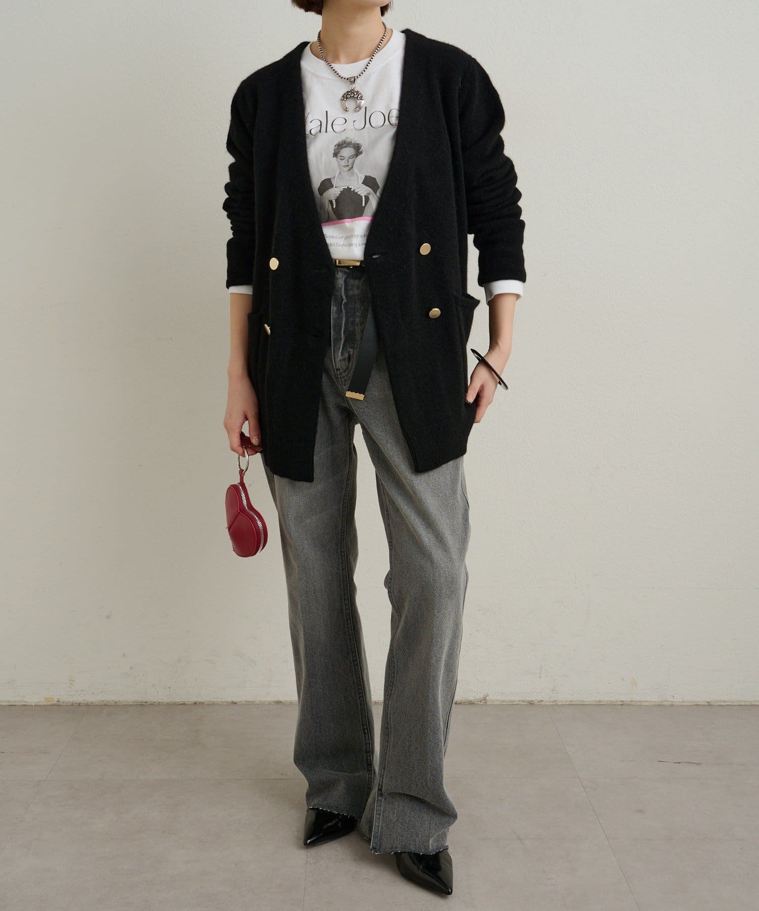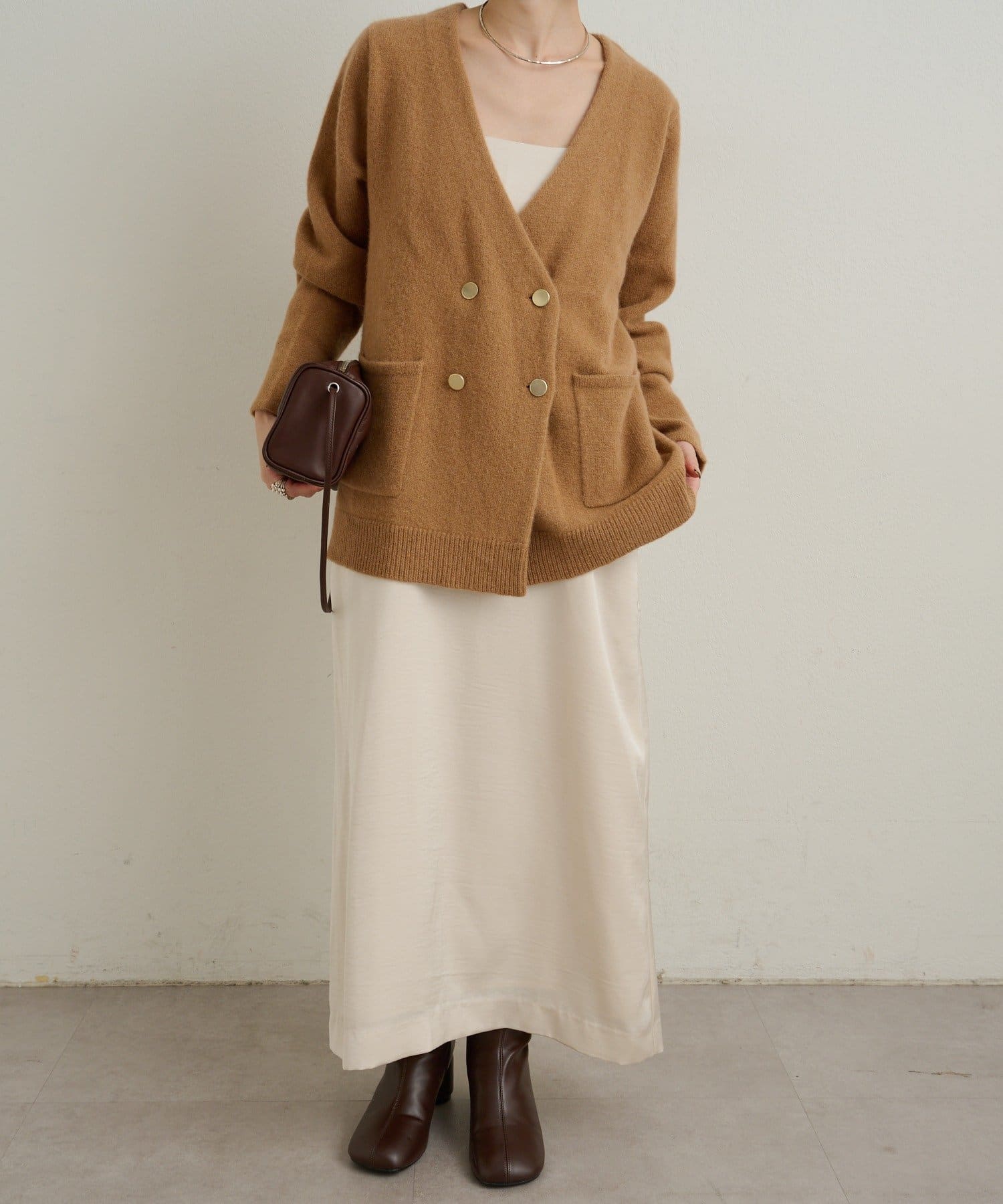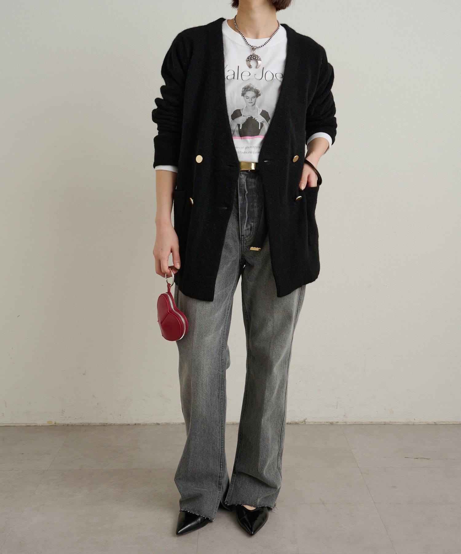・ダブルジャケットのようなフロントデザインがポイントのカーディガン。