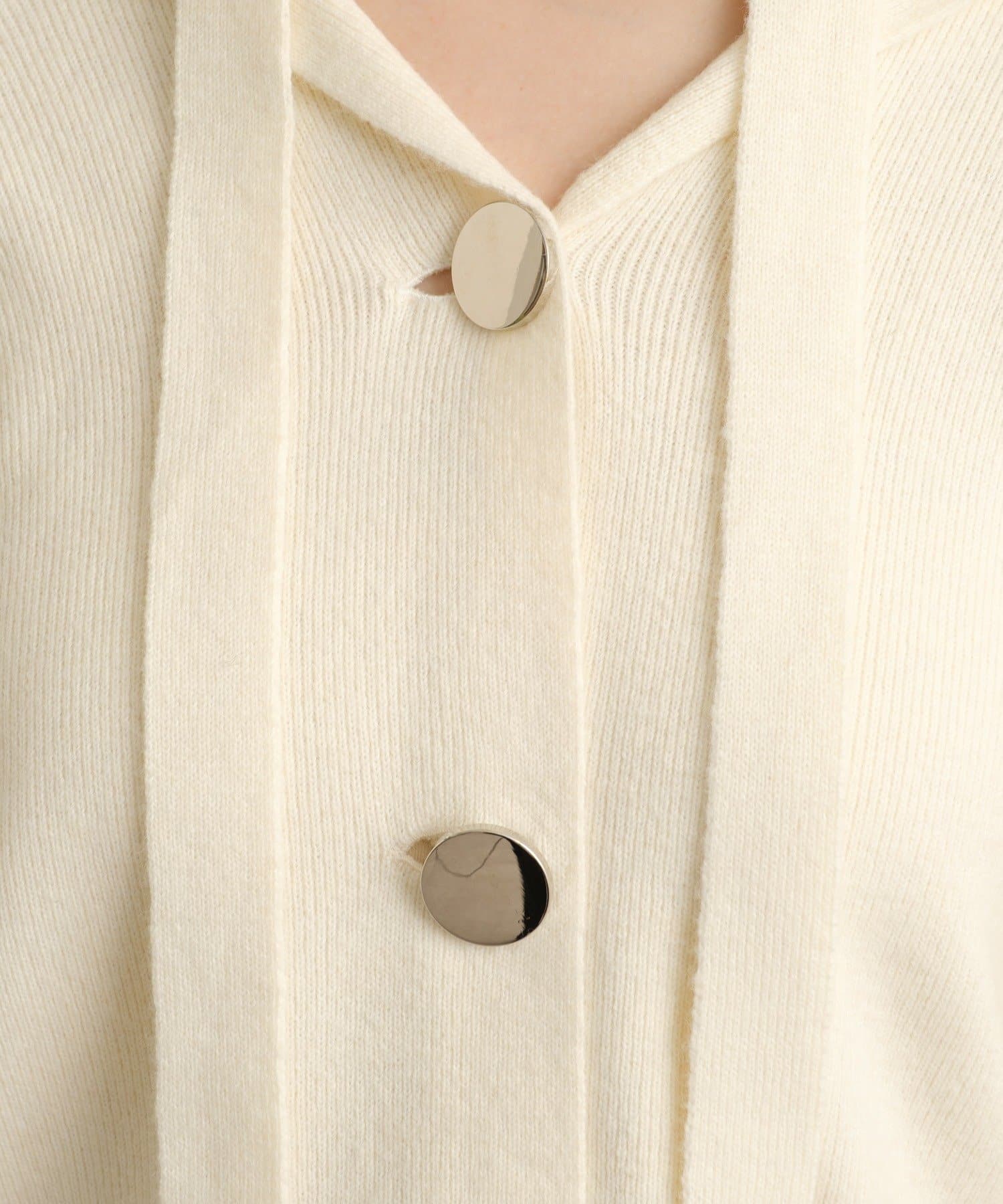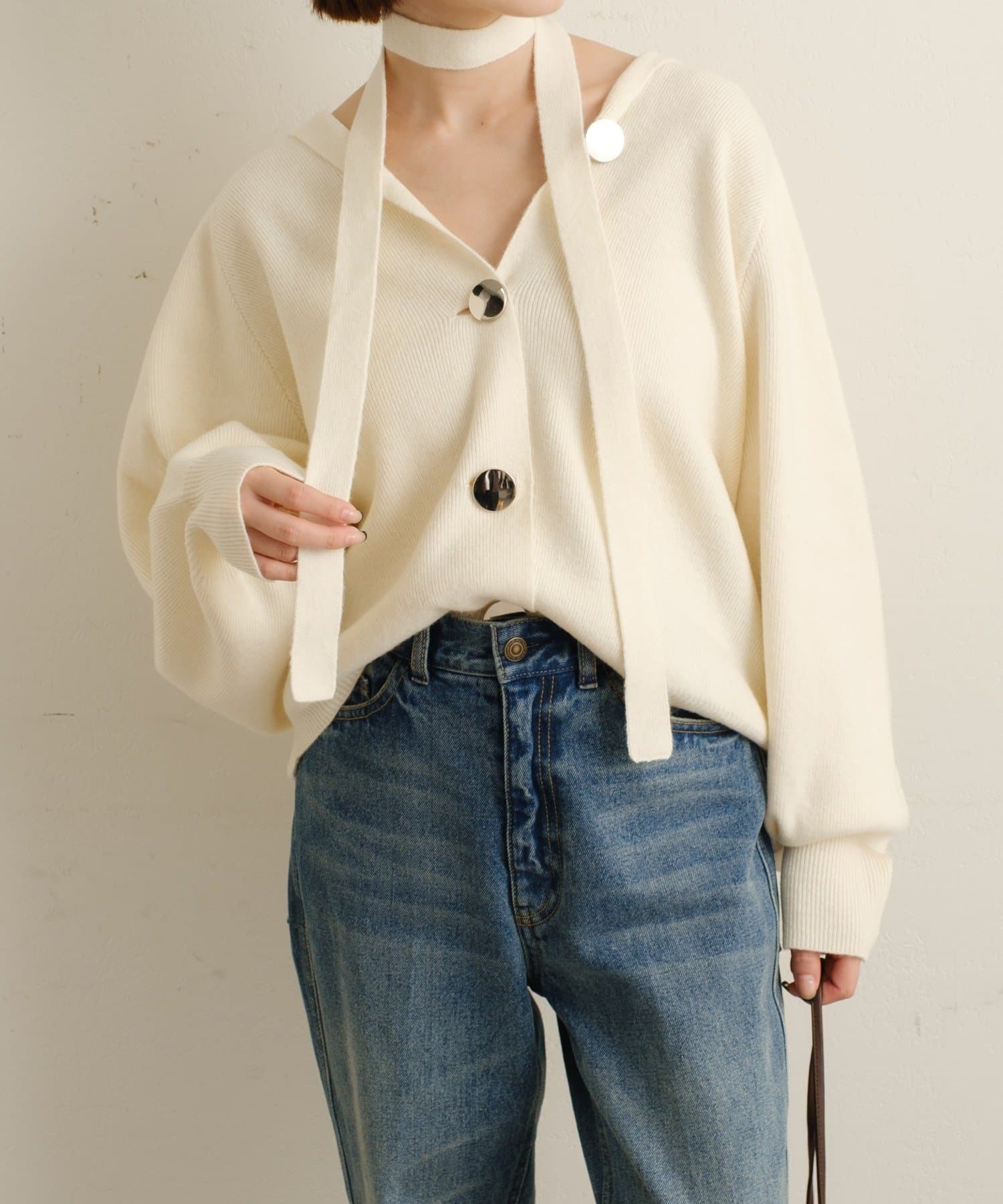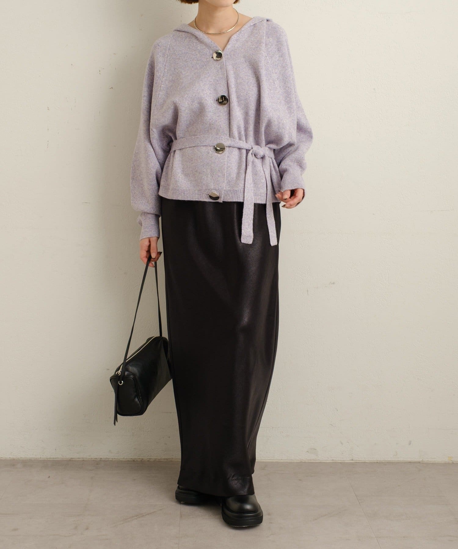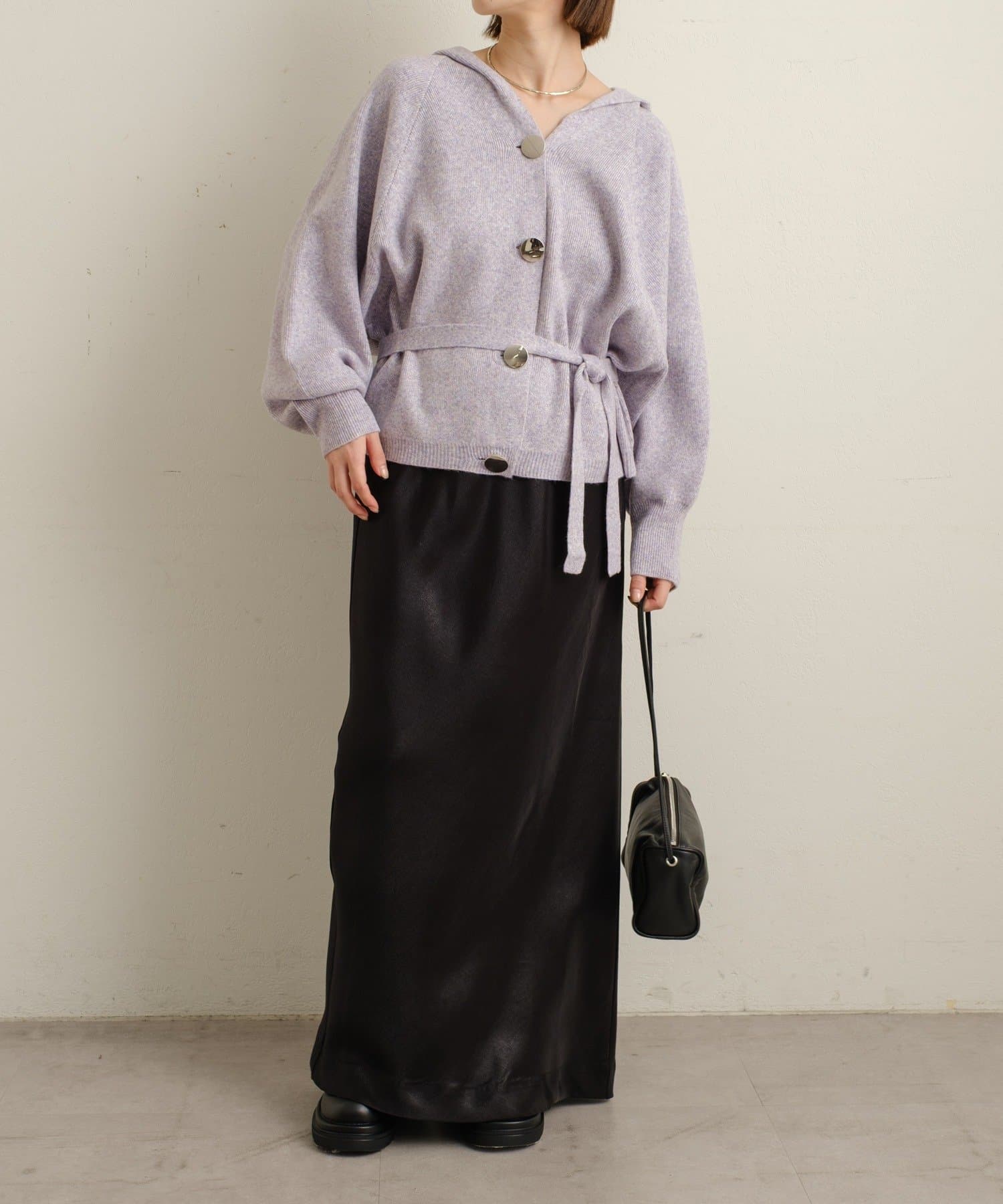 ・シルバーボタンとベルトがアクセントになったフーディニットカーディガン。
