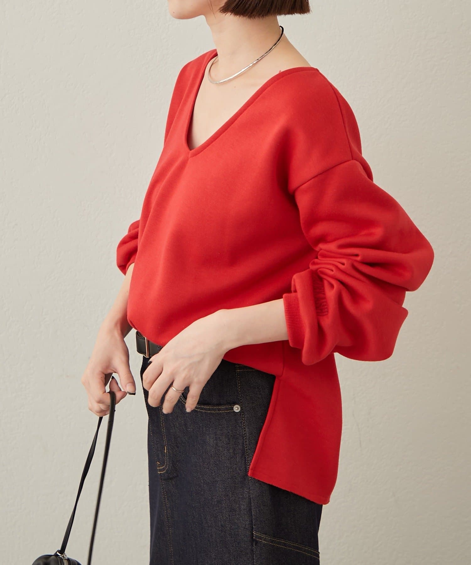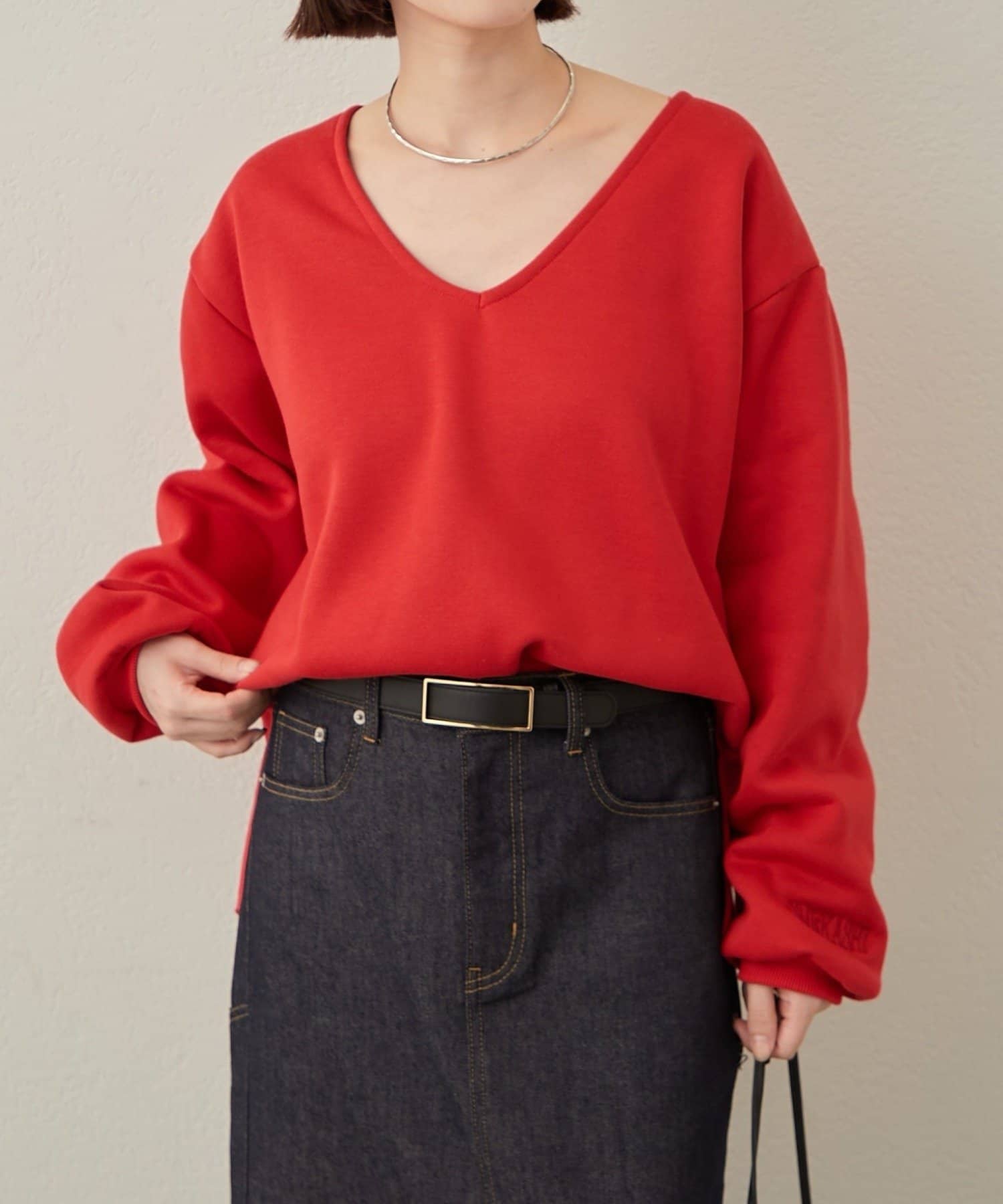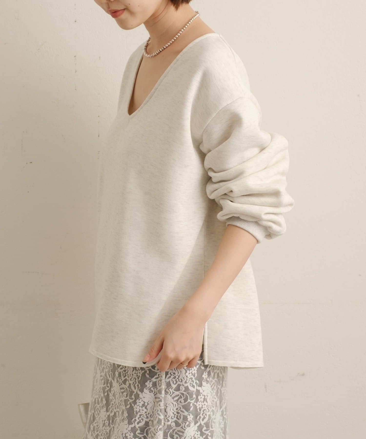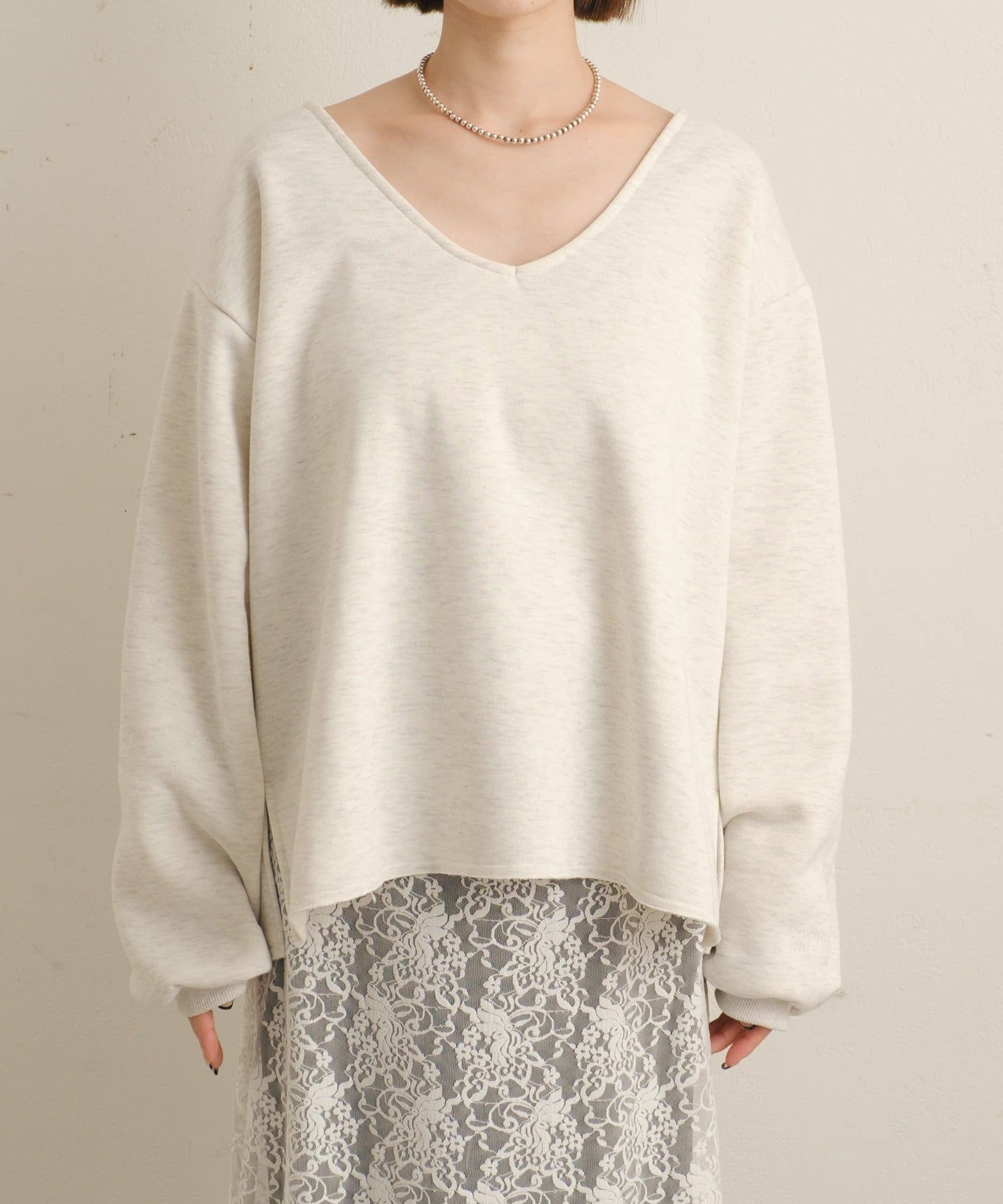 ・深めのVネックが顔周りをスッキリ見せてくれるルーズVネックスウェット。