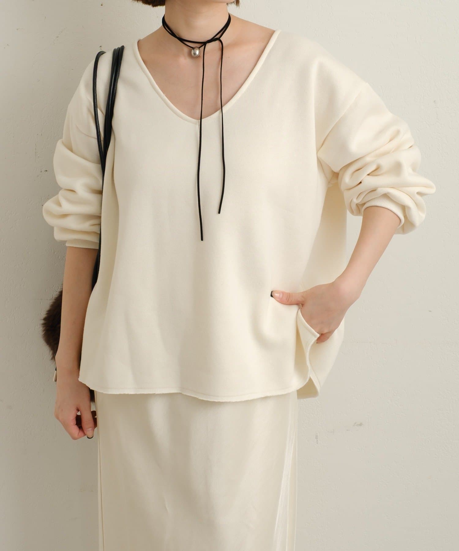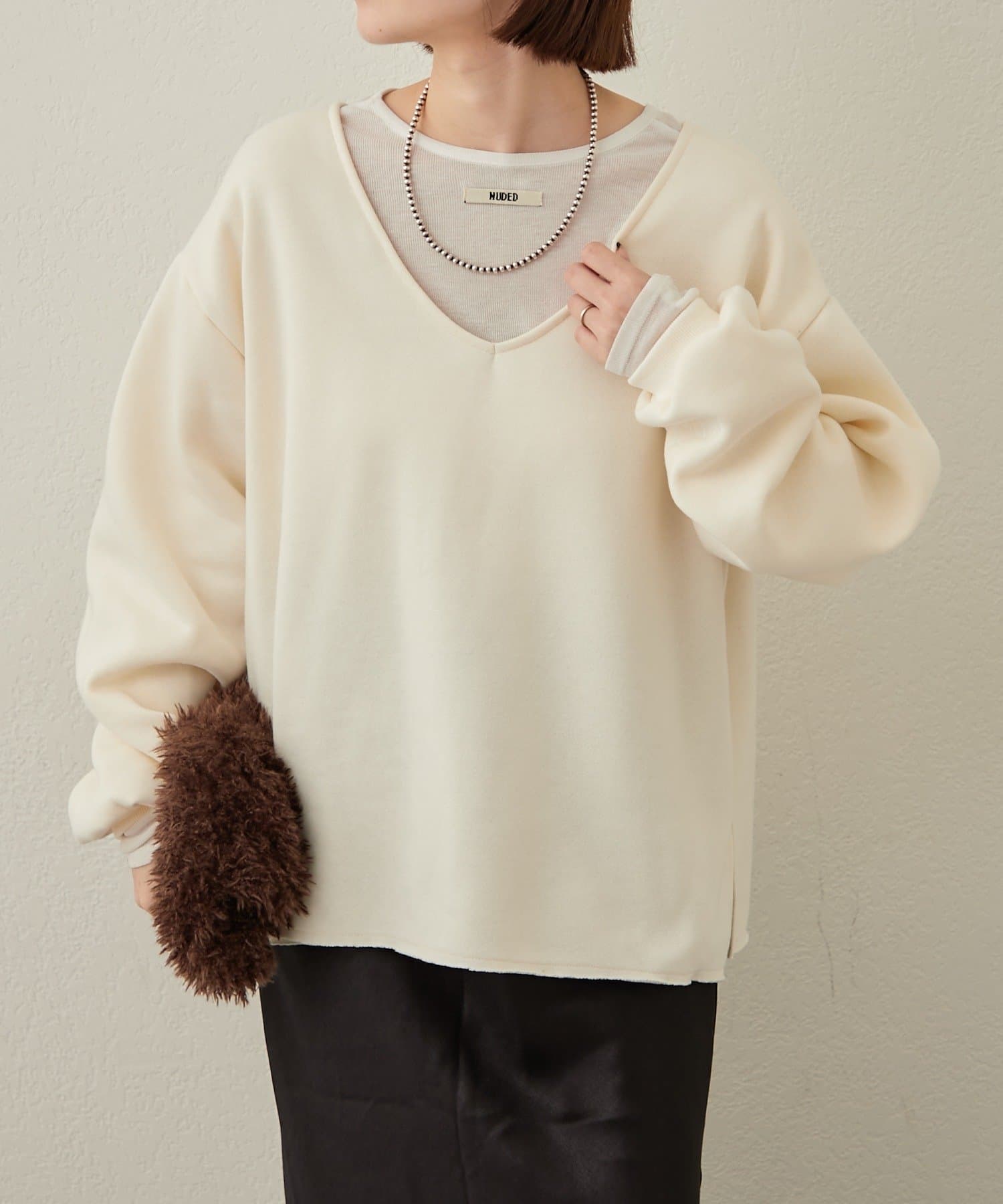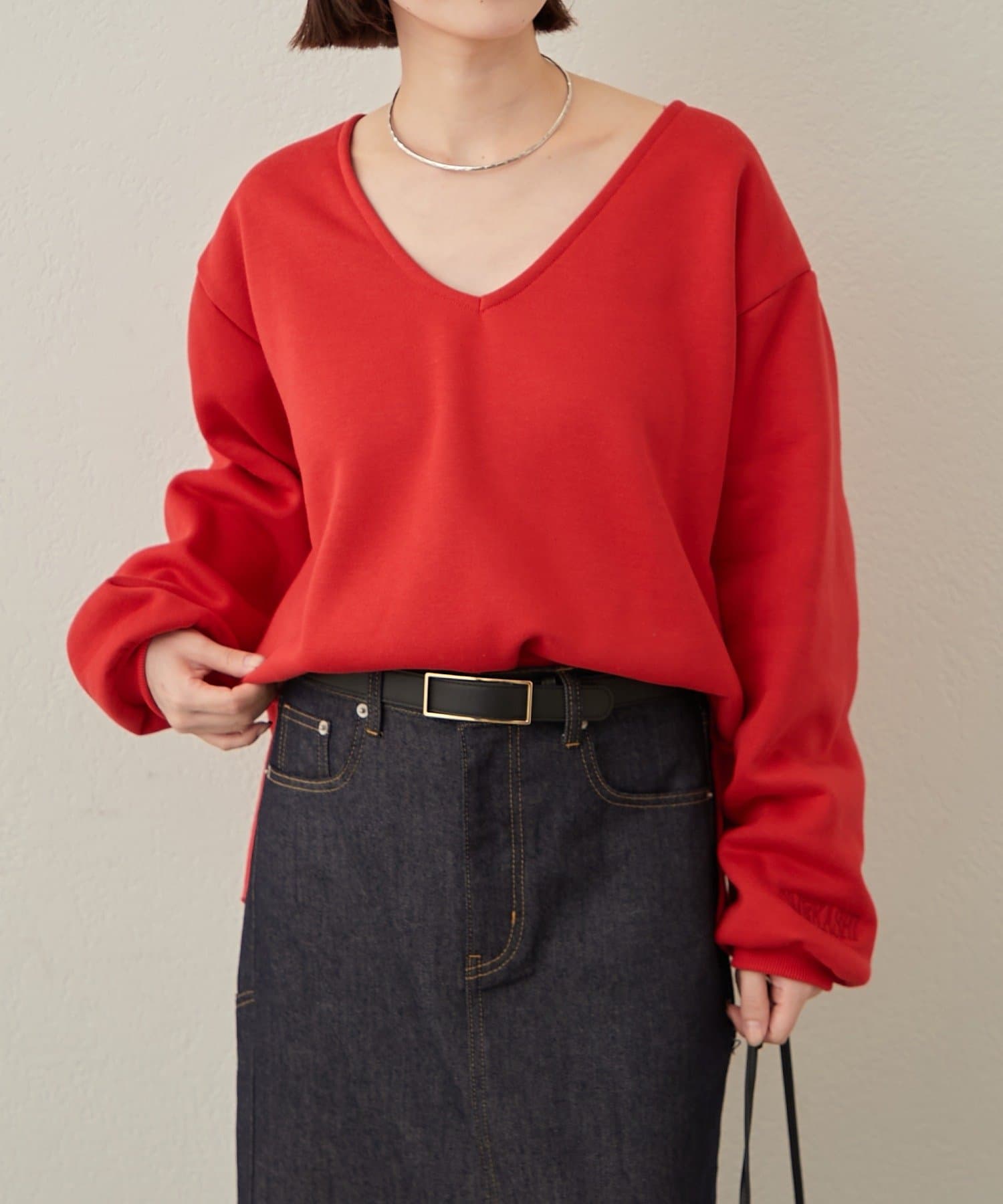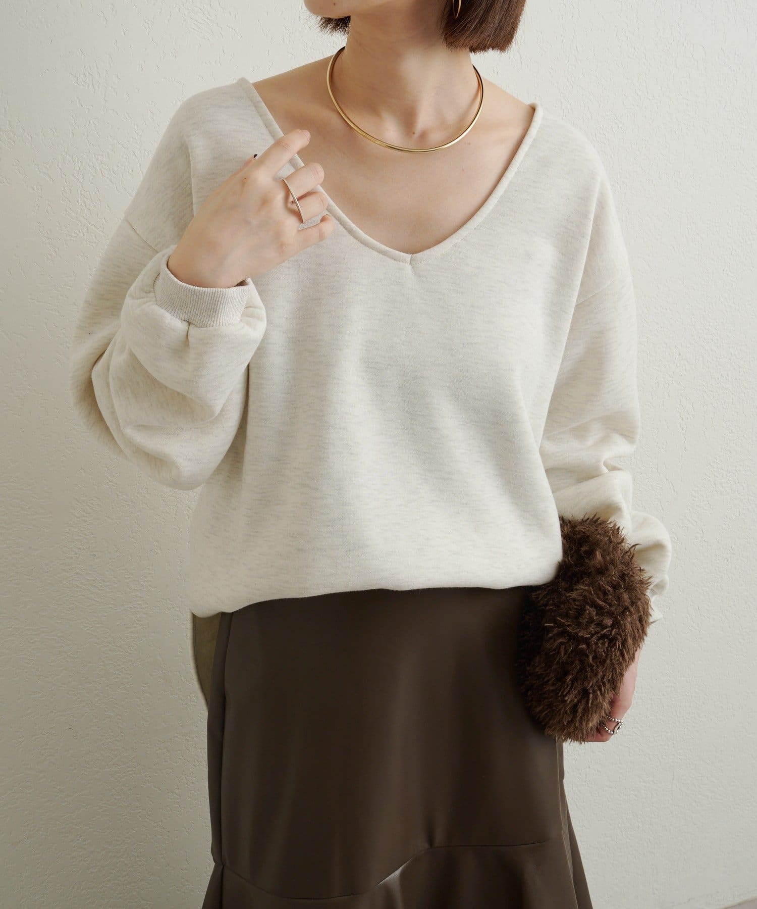 ・深めのVネックが顔周りをスッキリ見せてくれるルーズVネックスウェット。