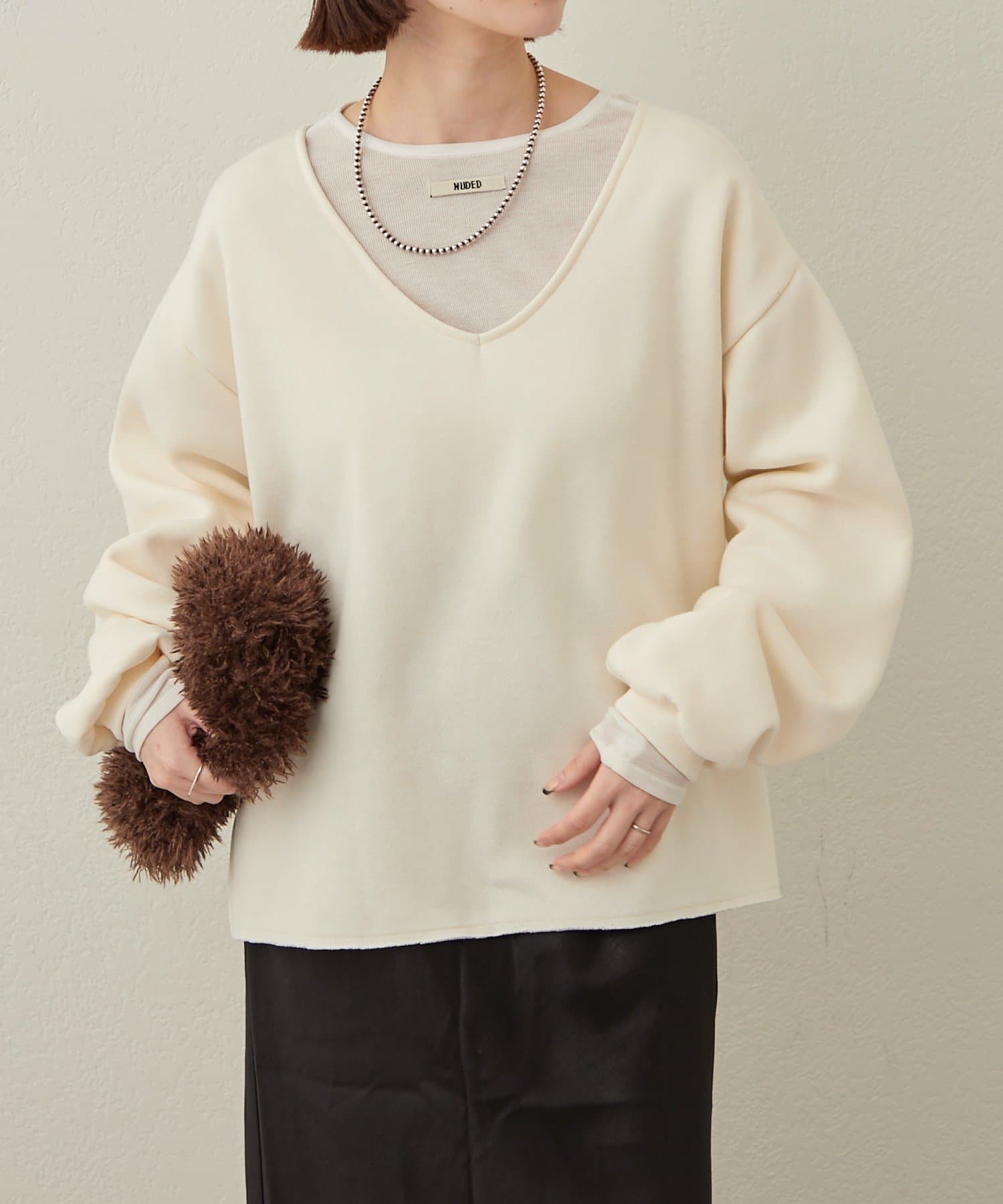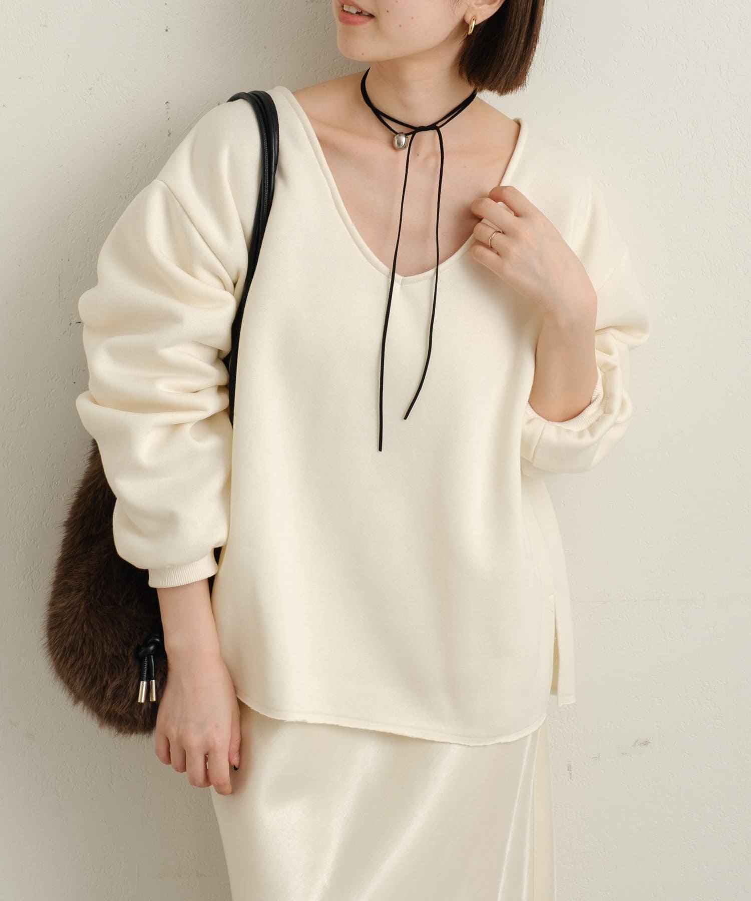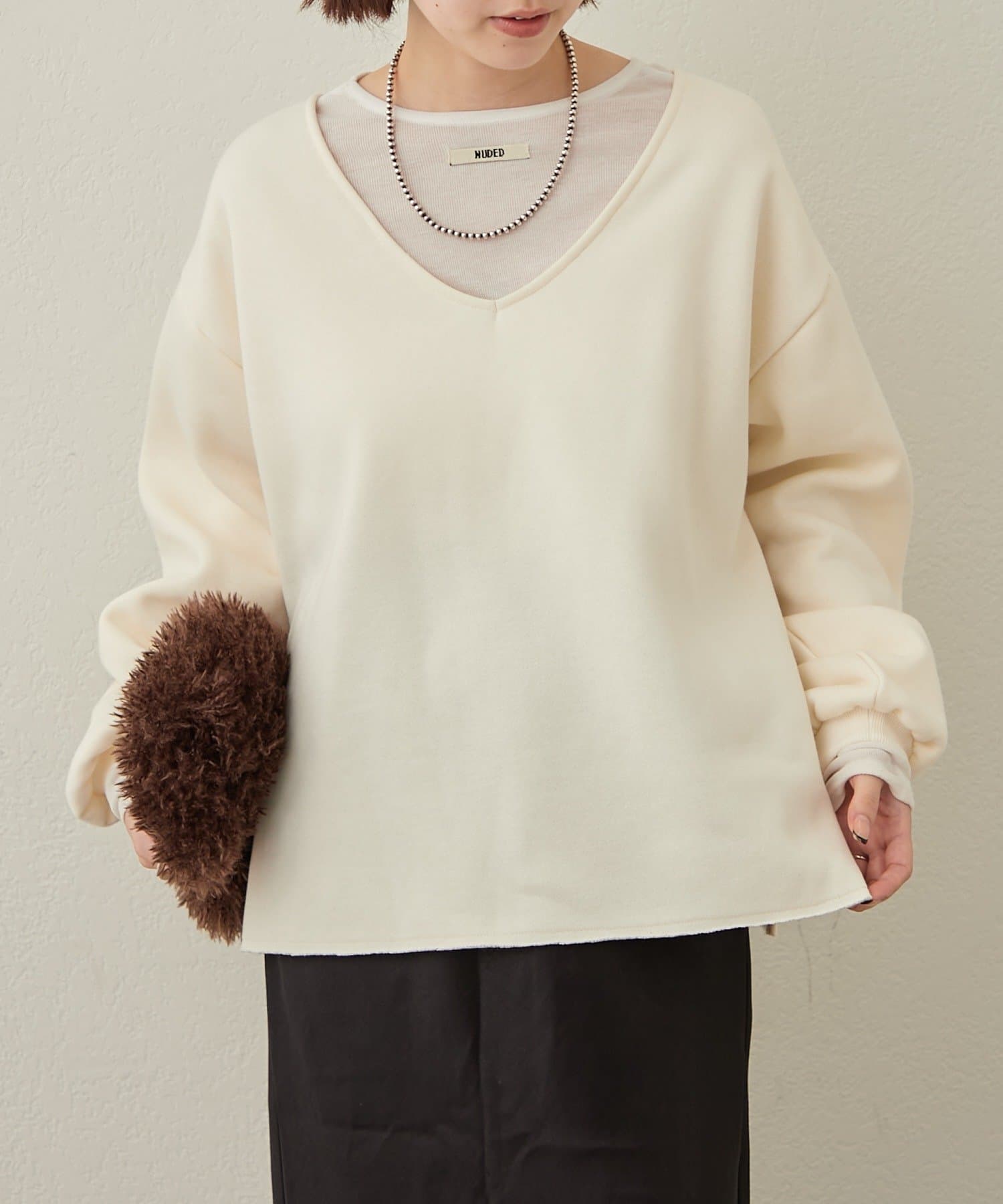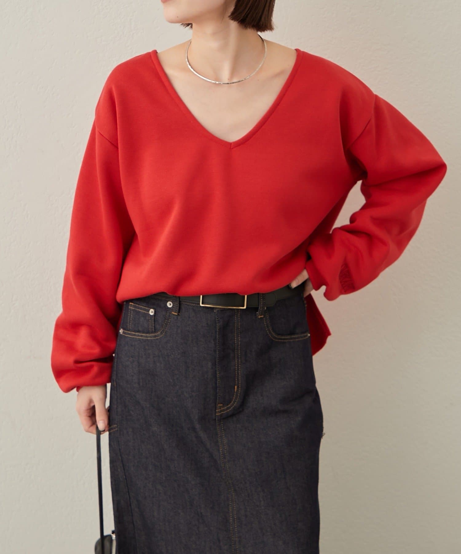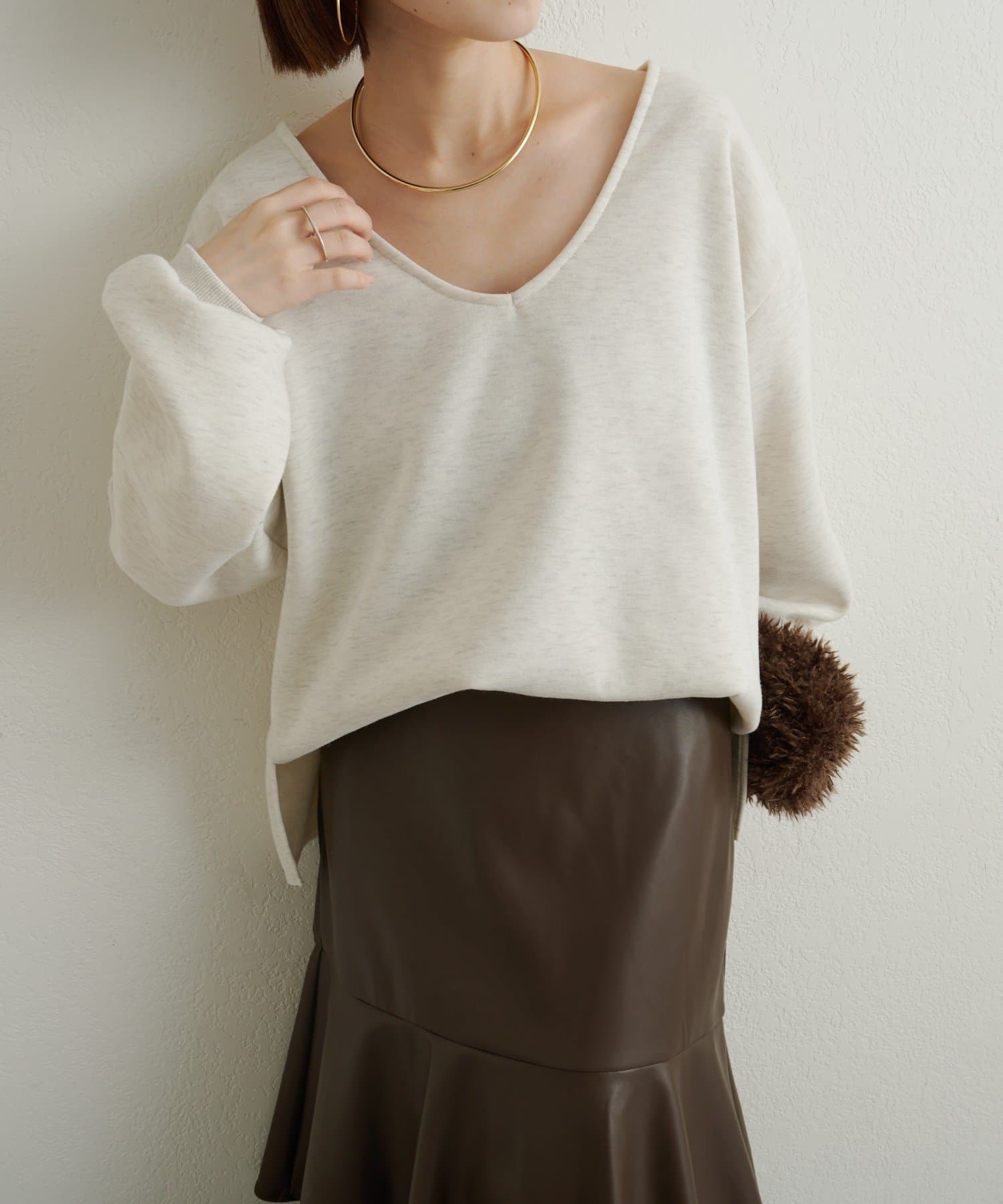 ・深めのVネックが顔周りをスッキリ見せてくれるルーズVネックスウェット。