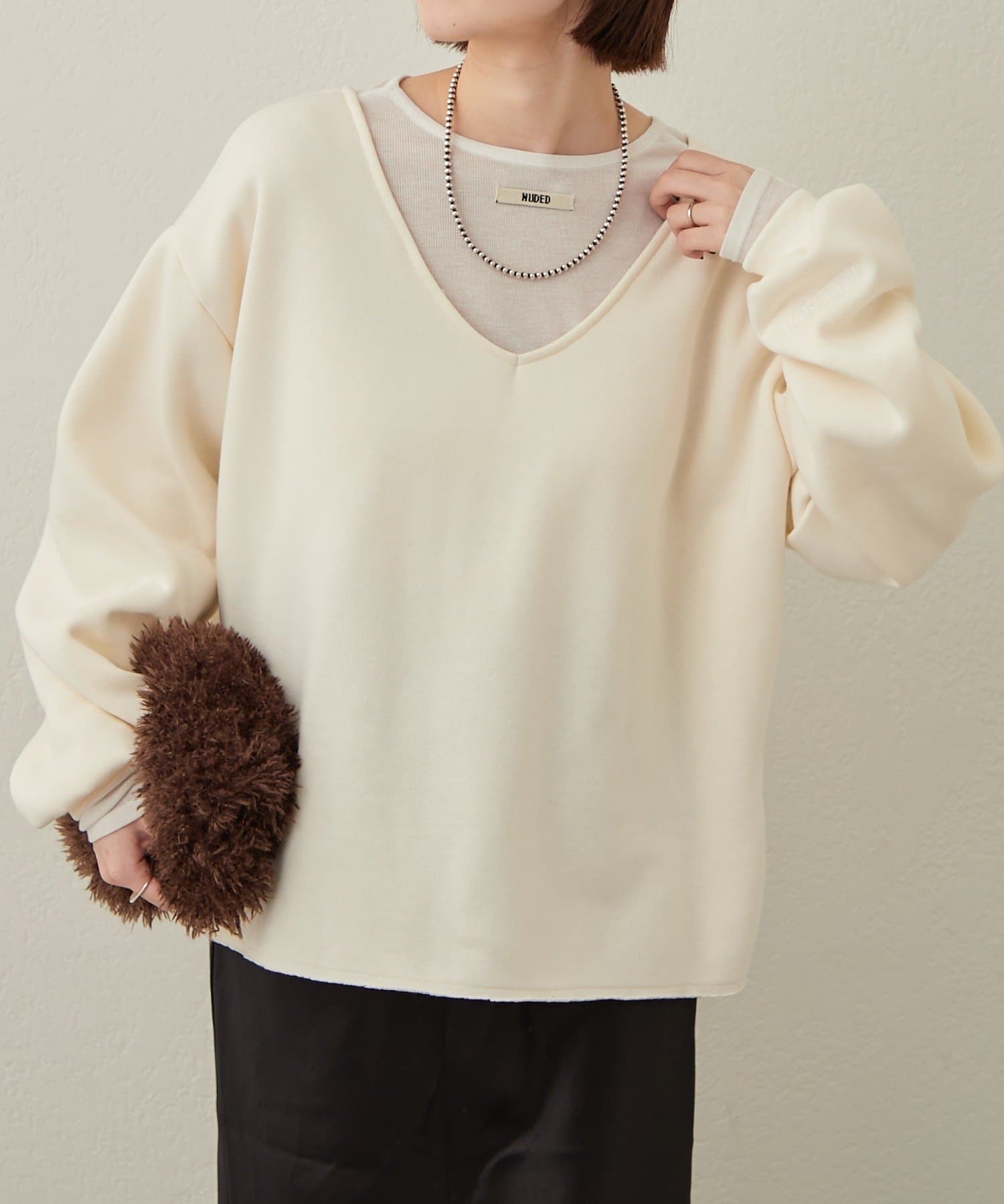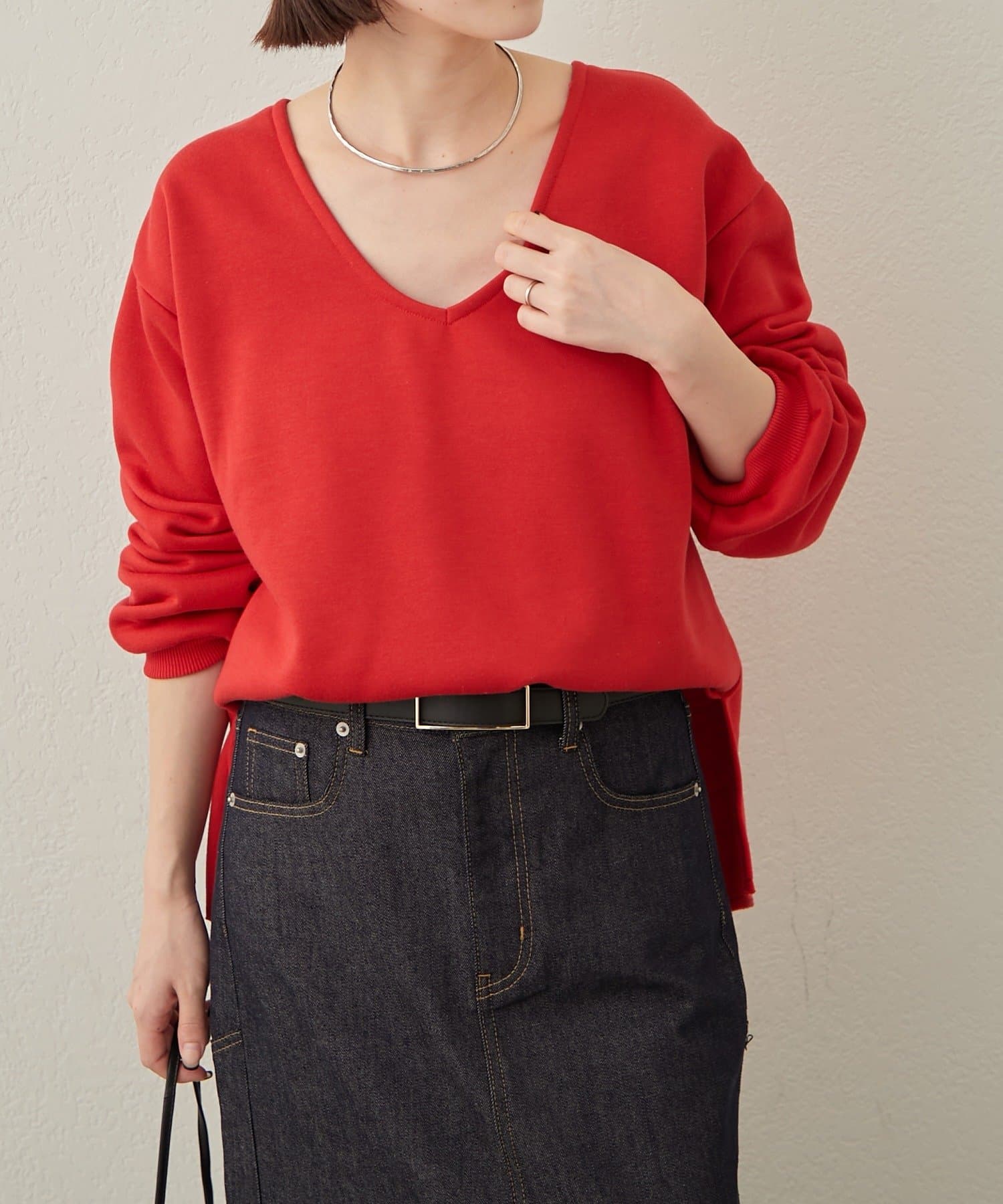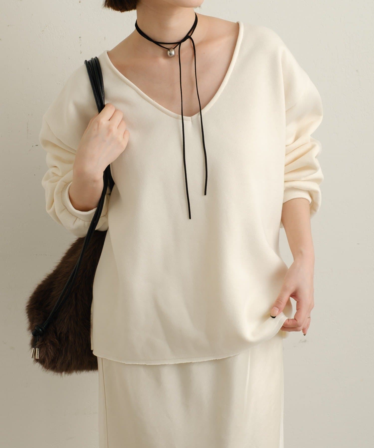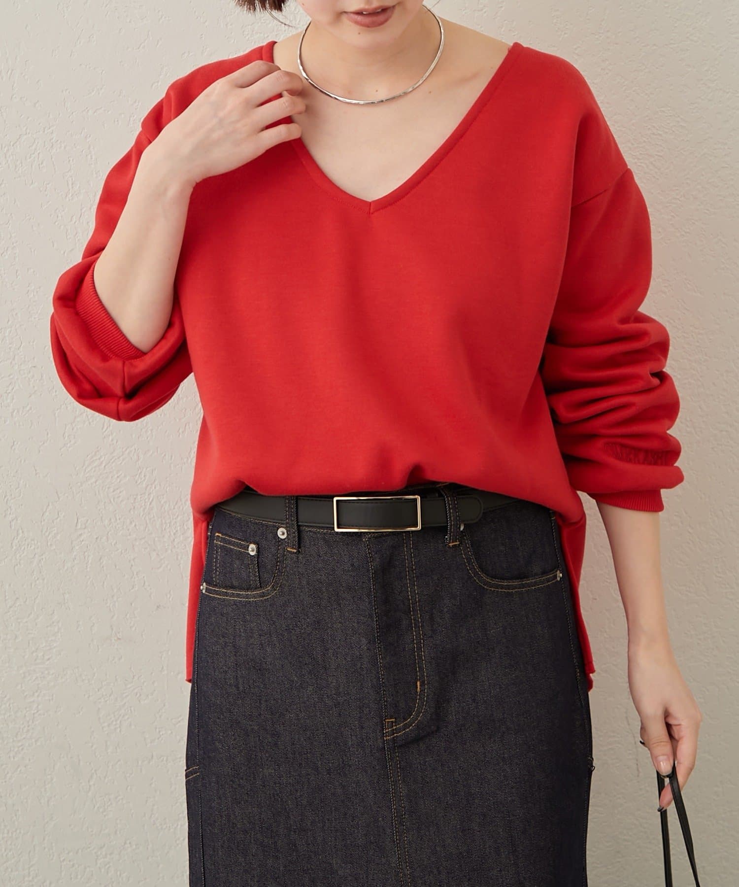・深めのVネックが顔周りをスッキリ見せてくれるルーズVネックスウェット。