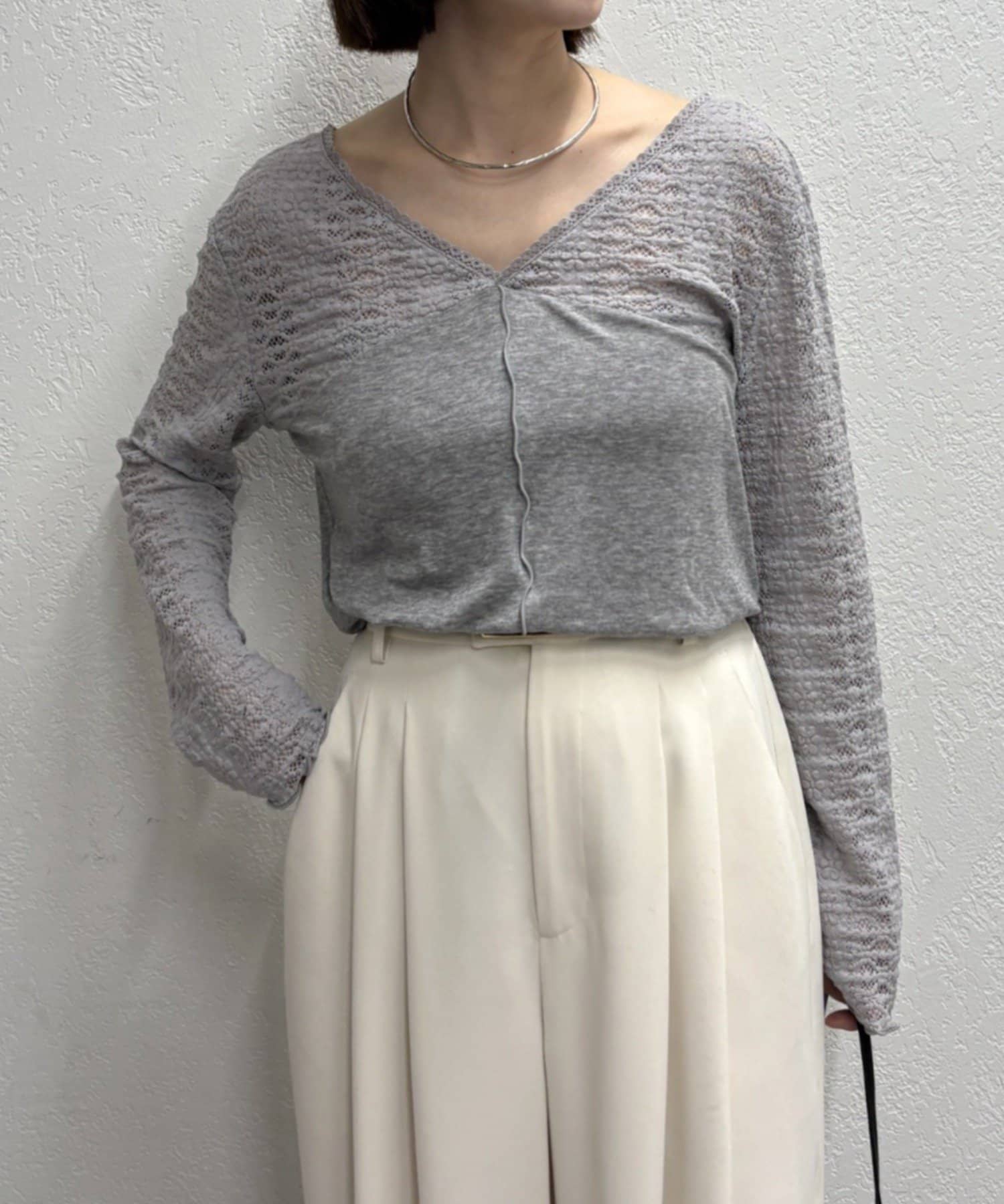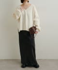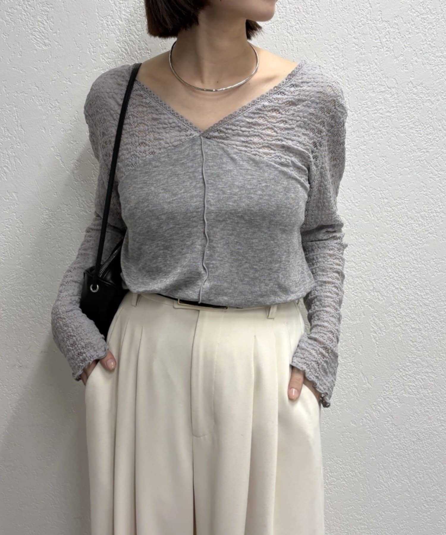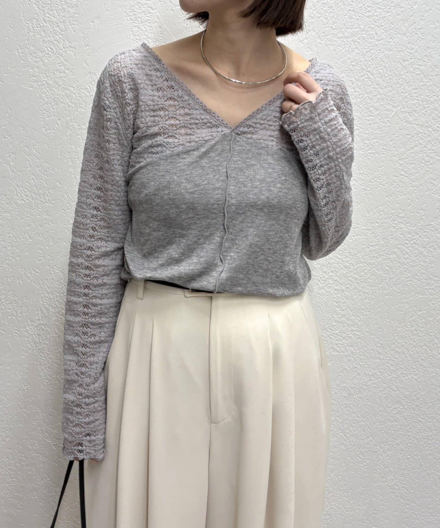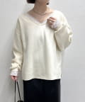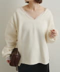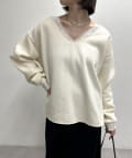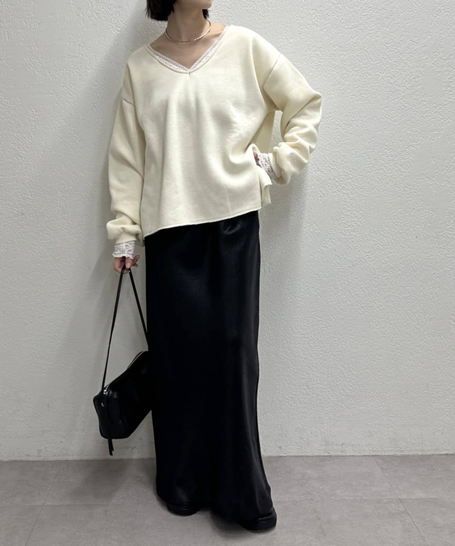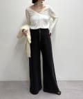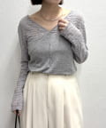 ・広めに開いたVネックがデコルテラインを綺麗に見せてくれて、華奢見え効果も◎