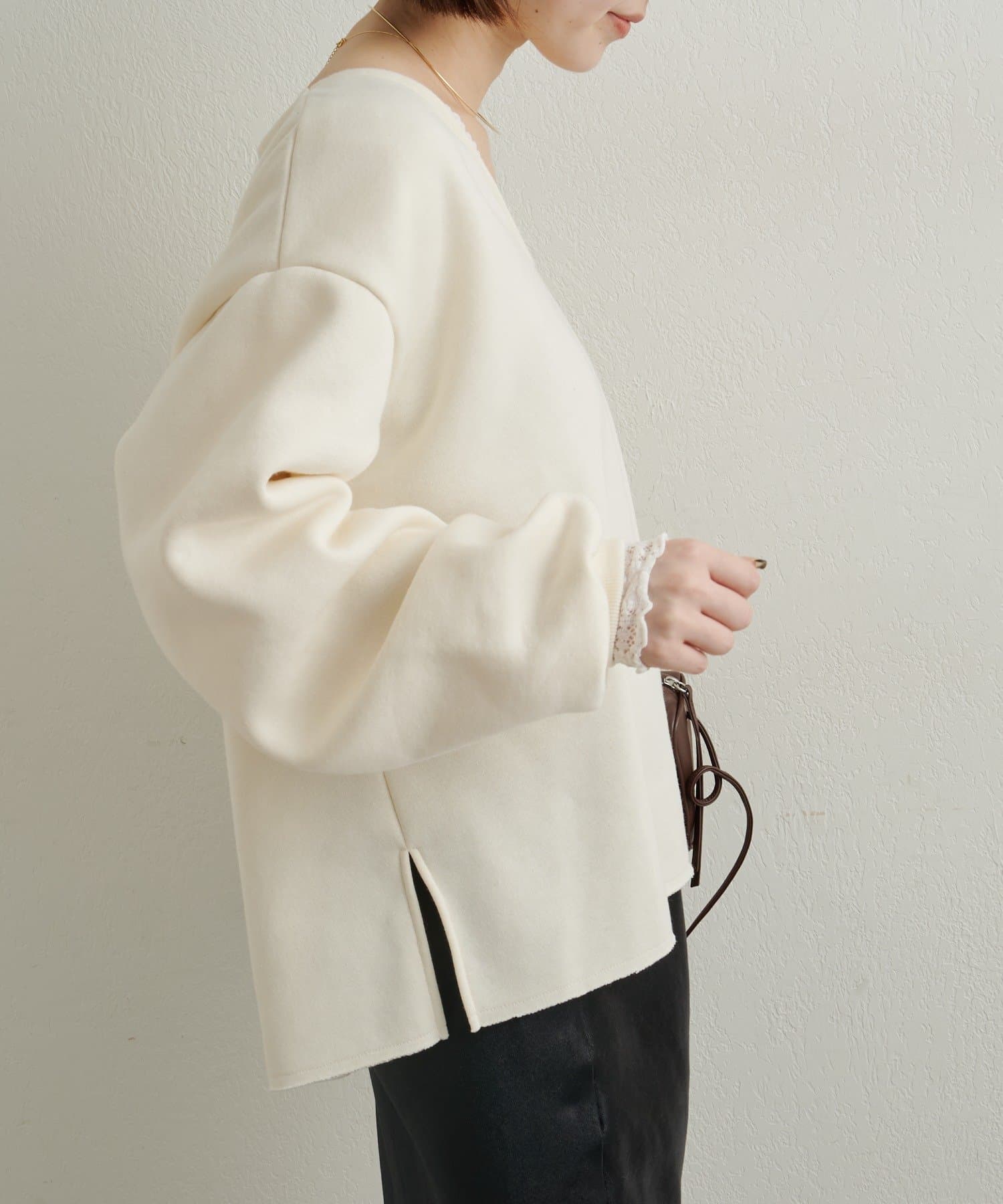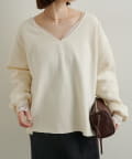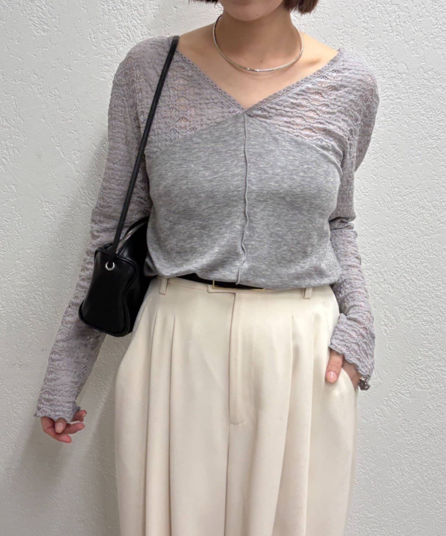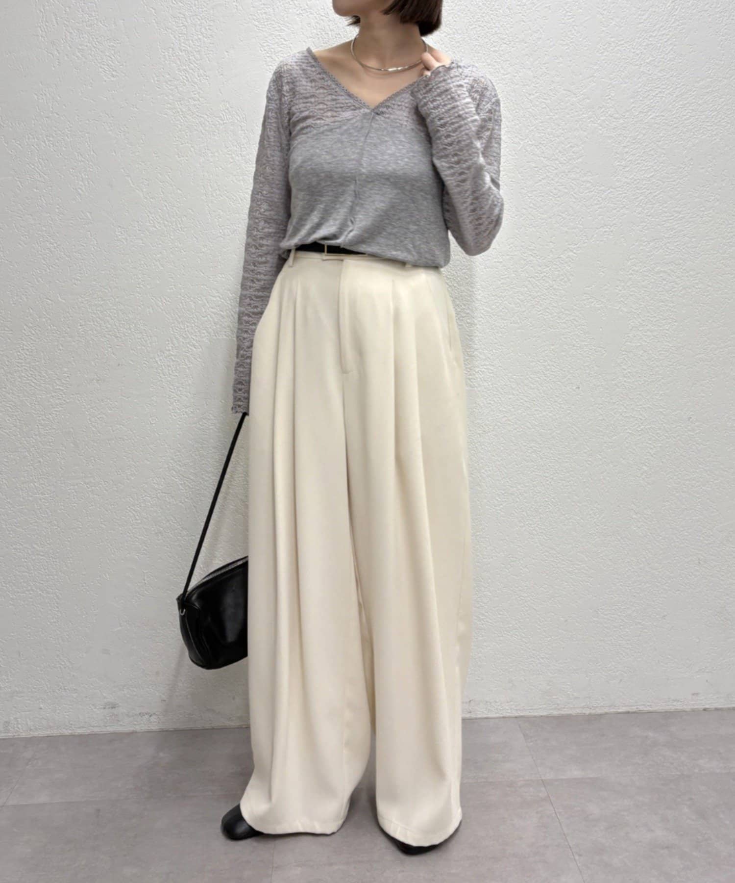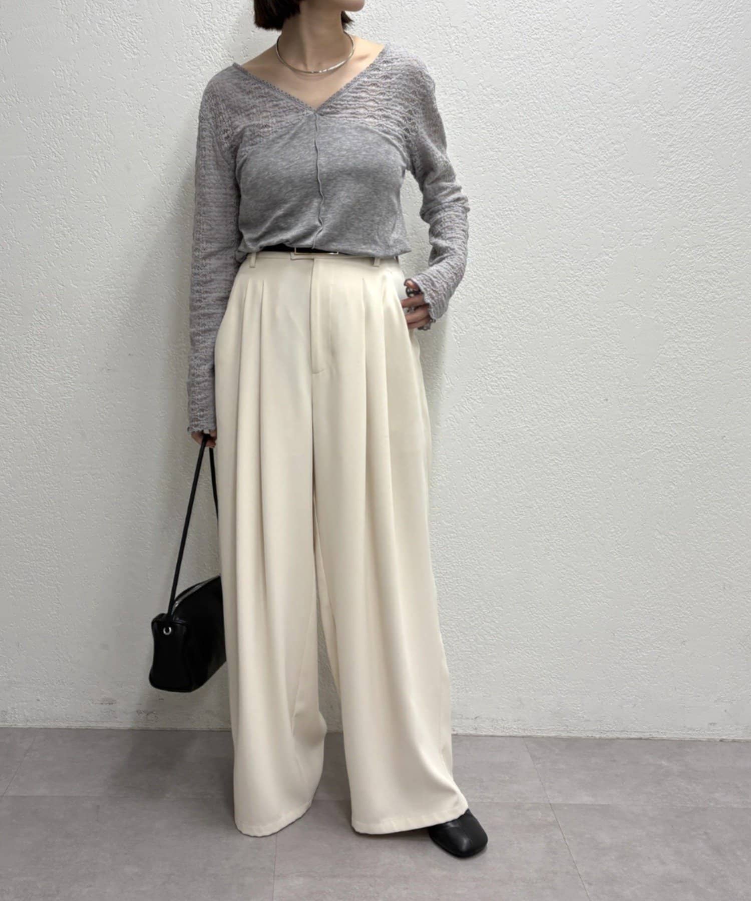 ・広めに開いたVネックがデコルテラインを綺麗に見せてくれて、華奢見え効果も◎