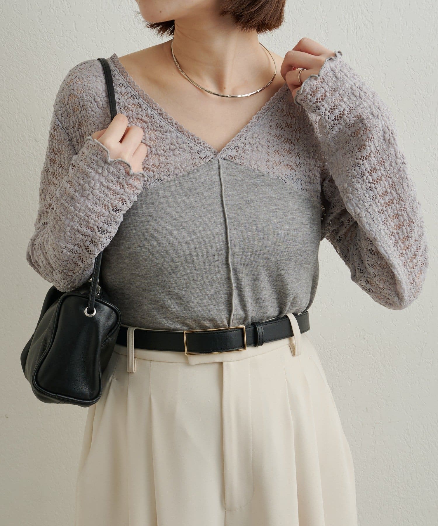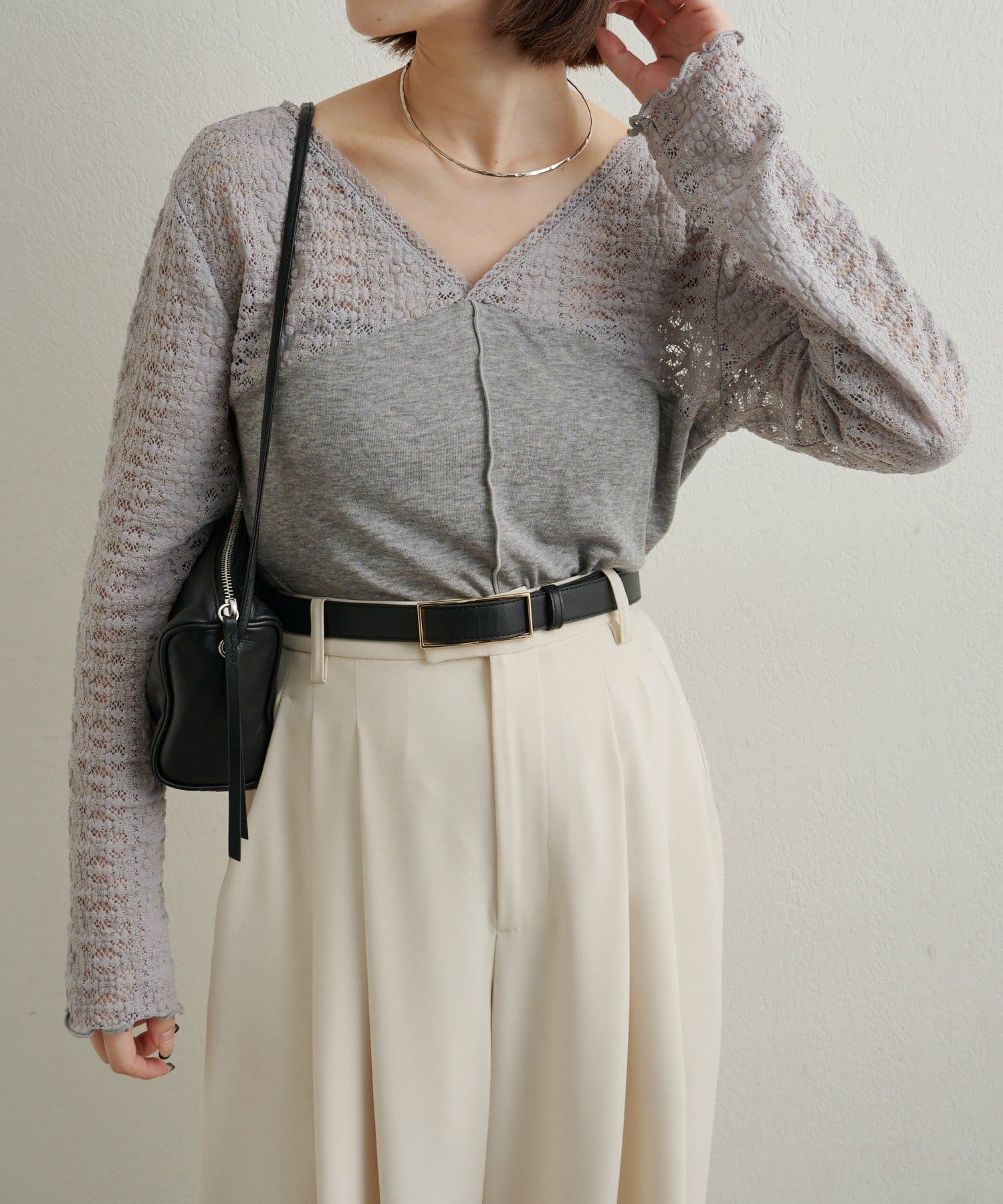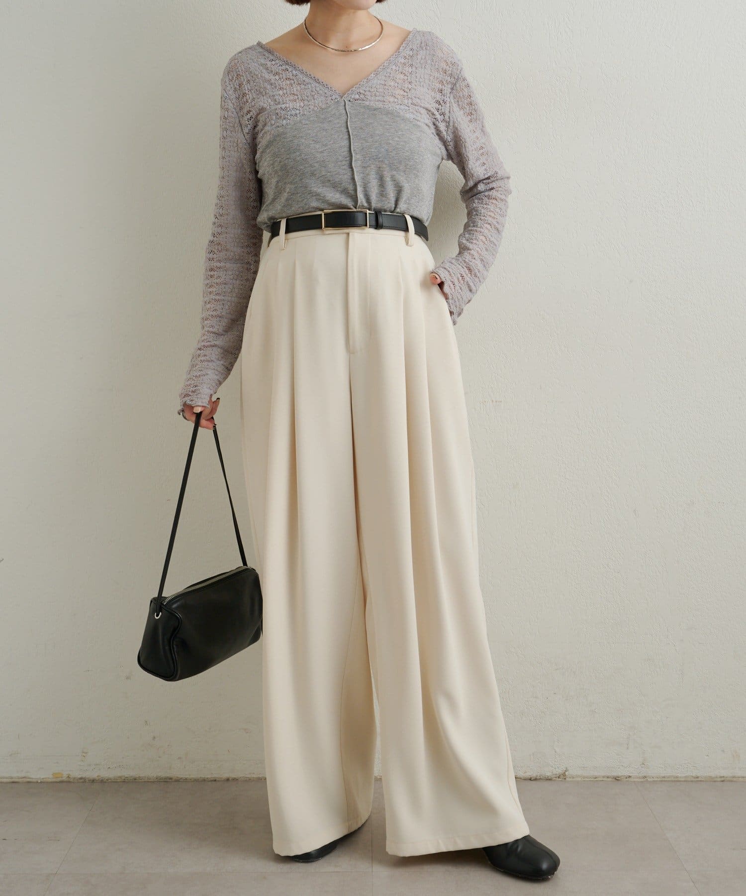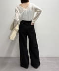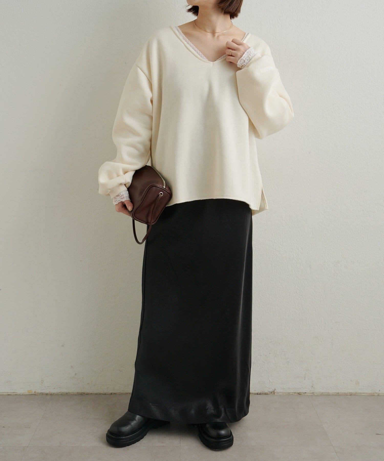 ・広めに開いたVネックがデコルテラインを綺麗に見せてくれて、華奢見え効果も◎