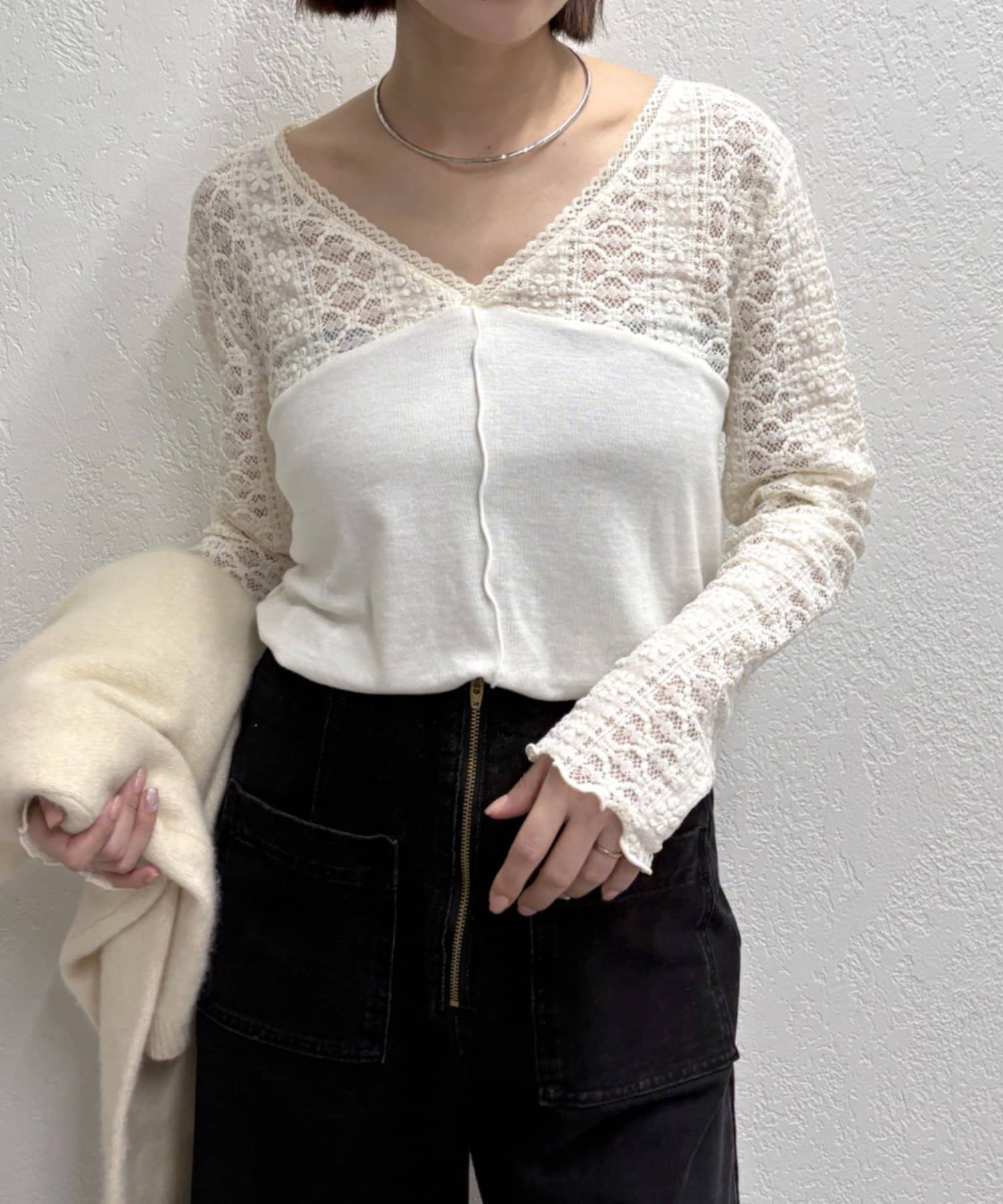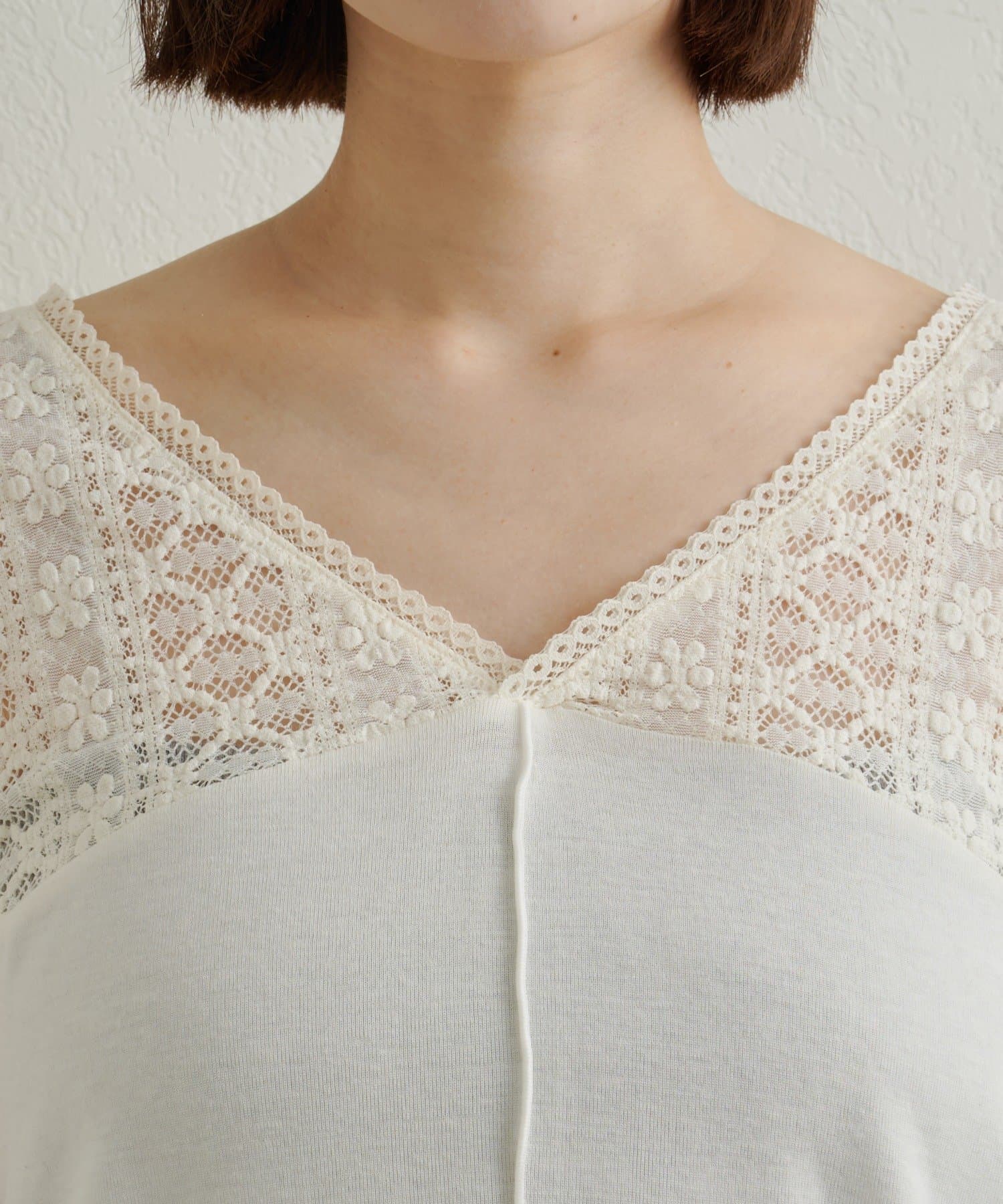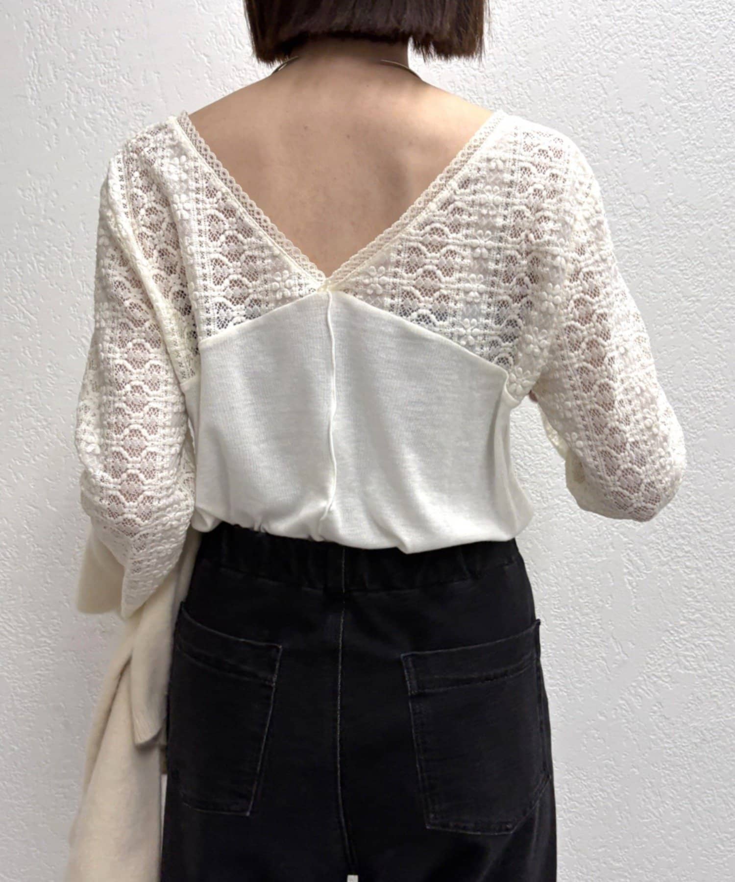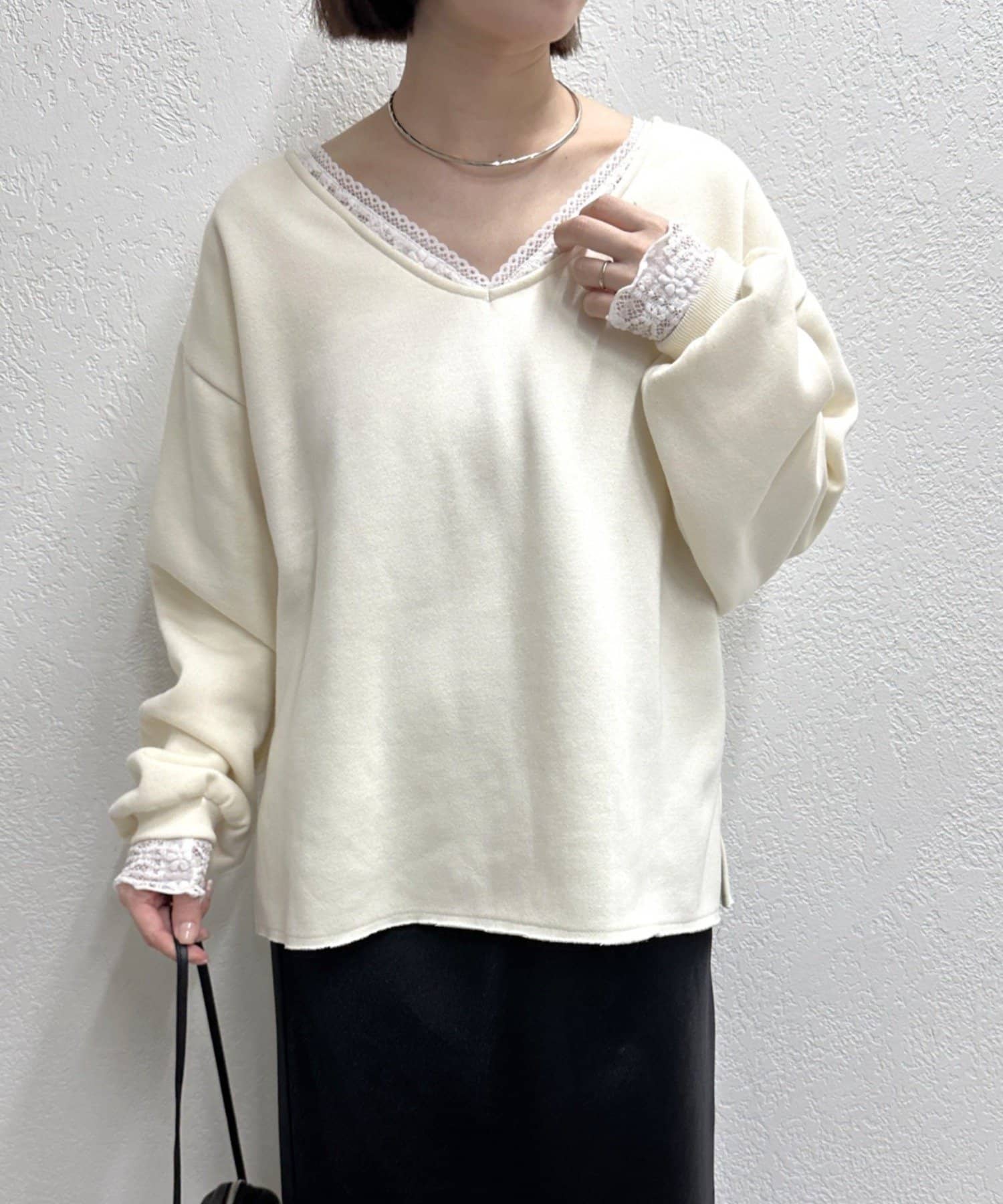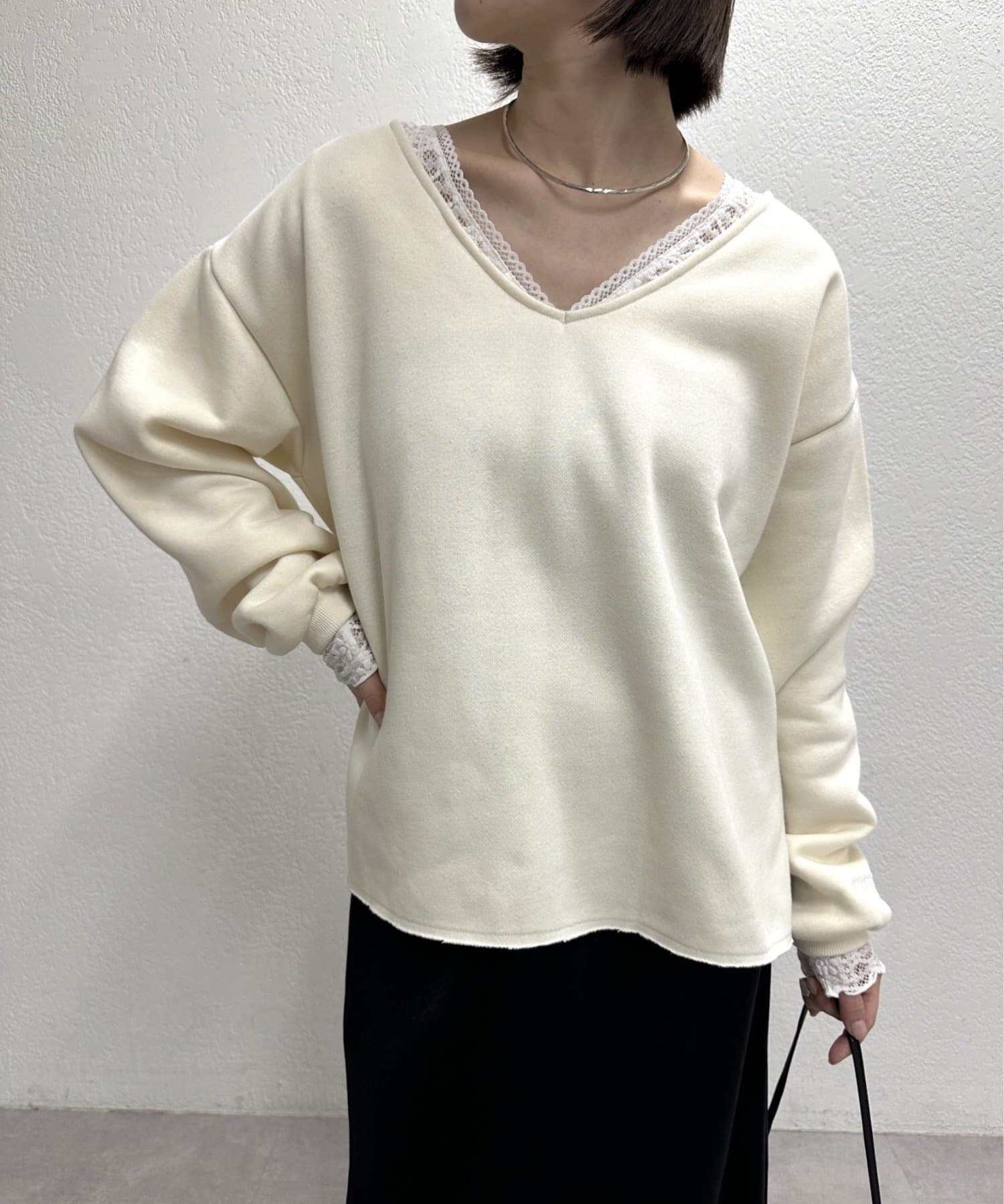 ・首回りのレース素材が女性らしいニットソー