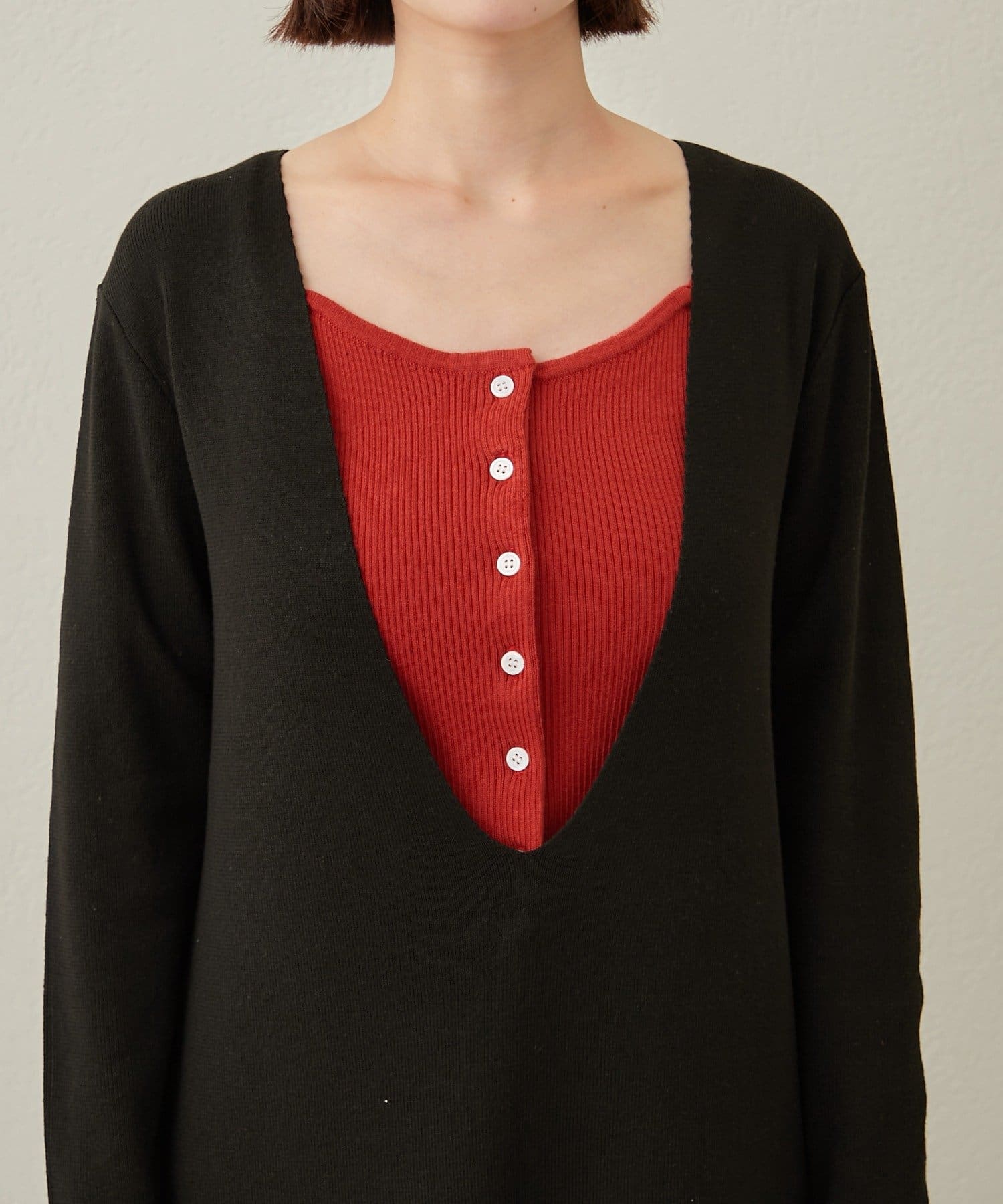 また深めのVネックなので、インナーを変えてのレイヤードスタイルも楽しんでいただけます^^