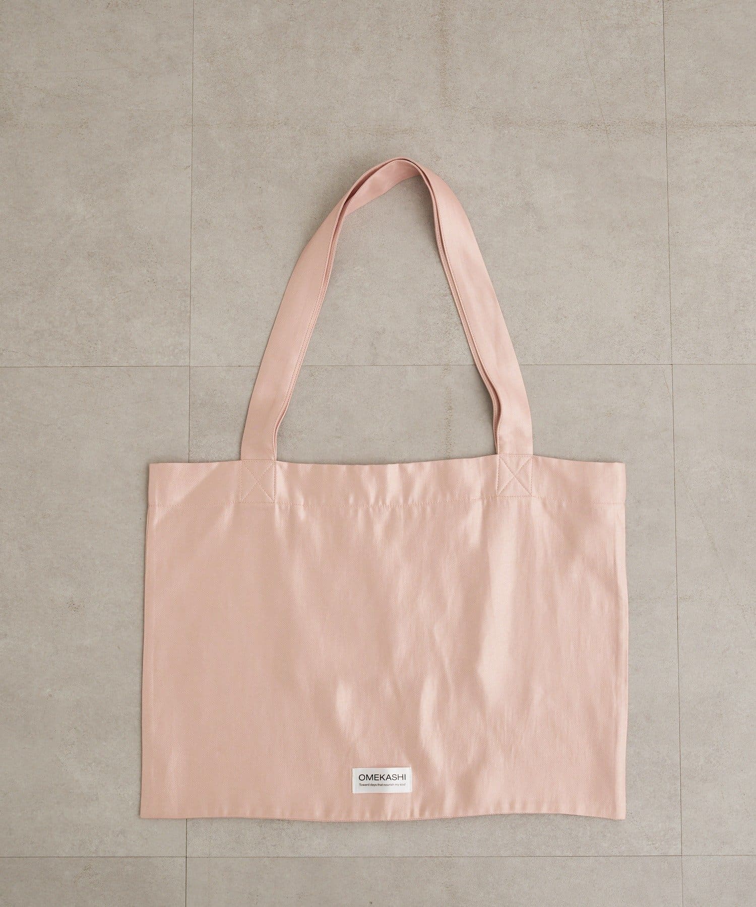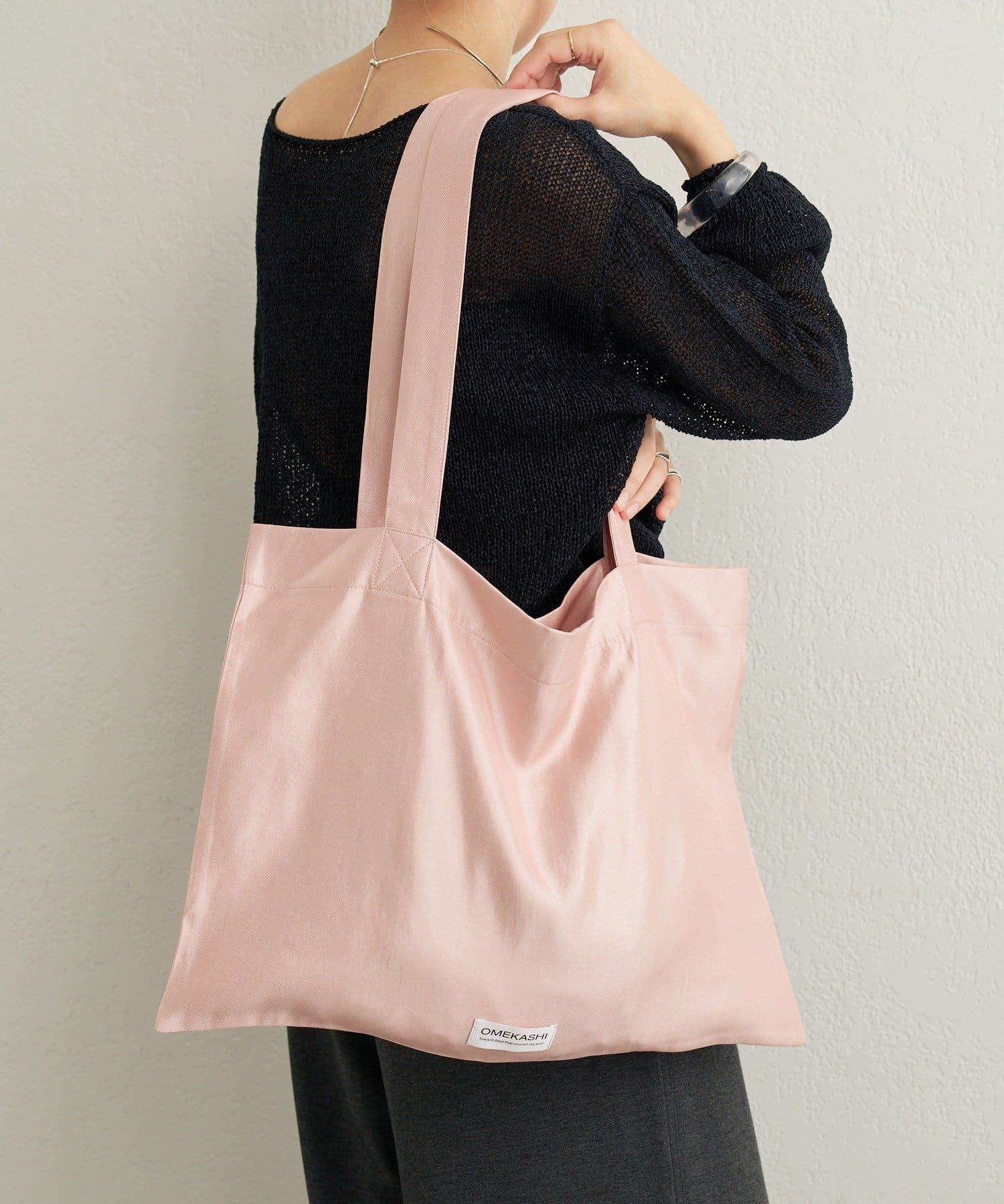 ・チェック柄に"Omekashi"タグがアクセントとなったトートバッグ。