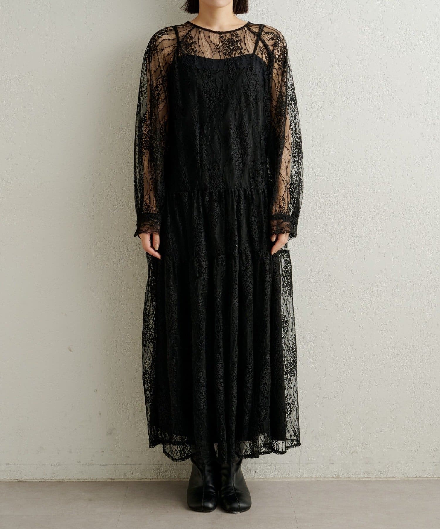 ・総レースが女性らしいシアー素材のティアードワンピース。