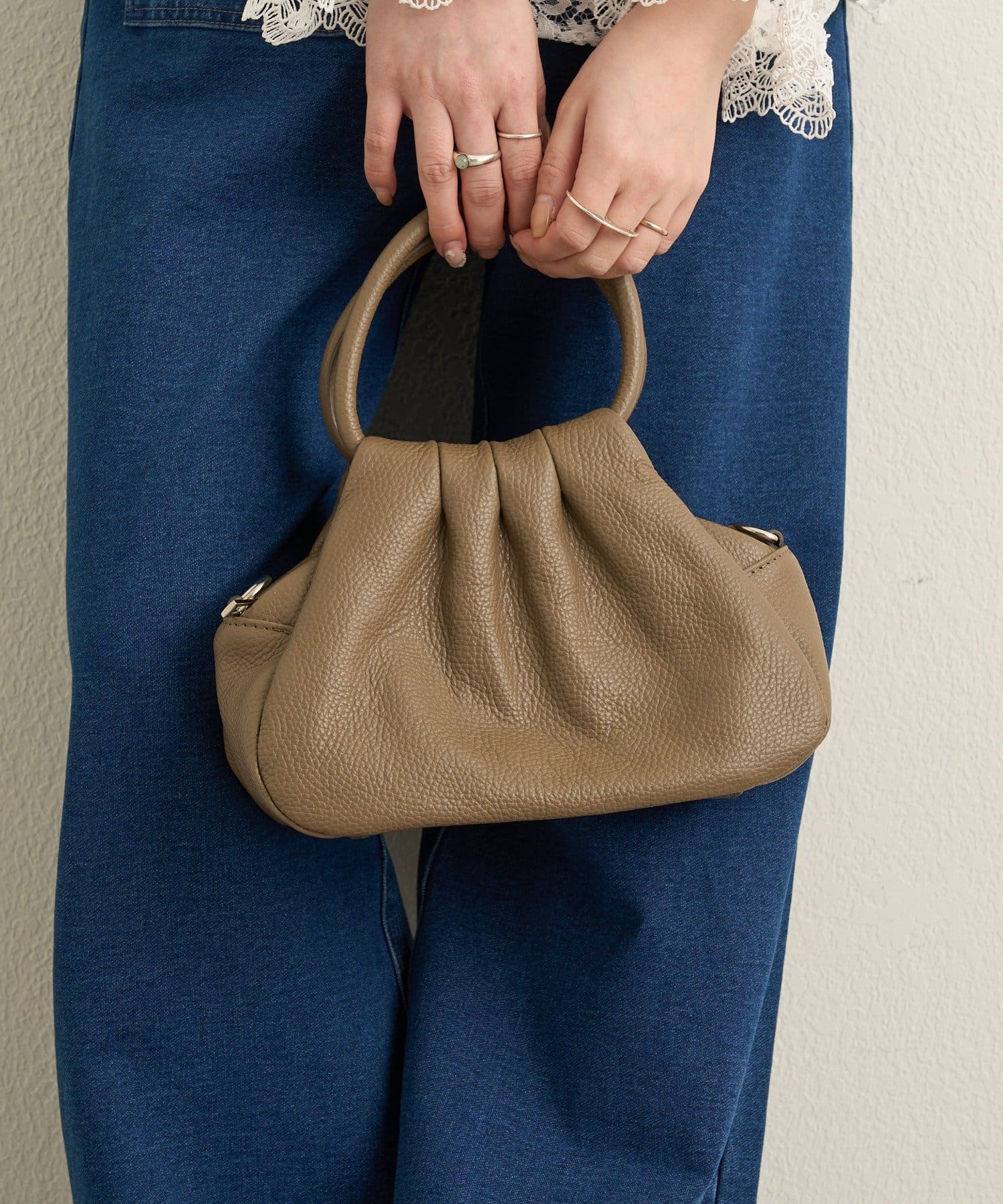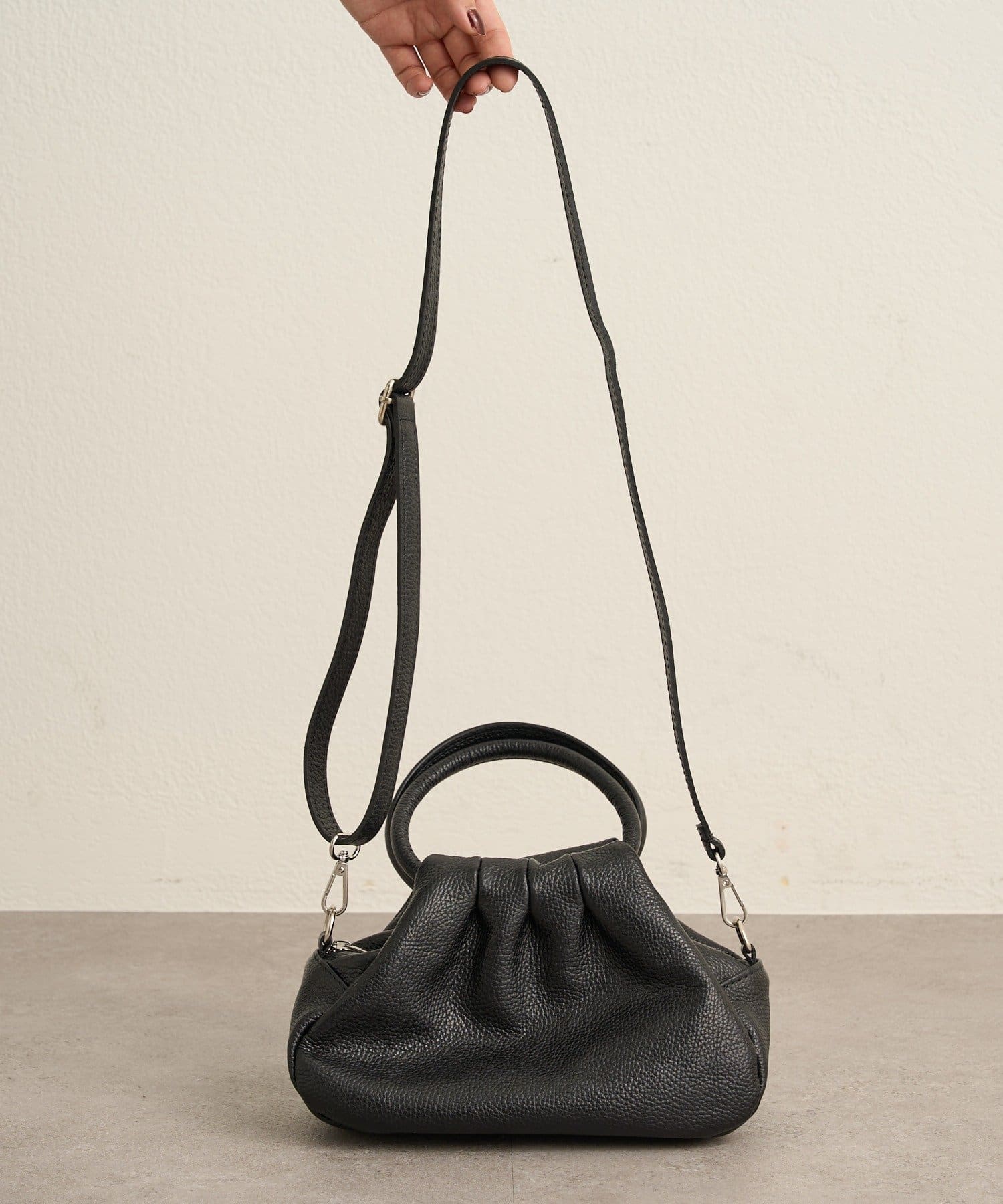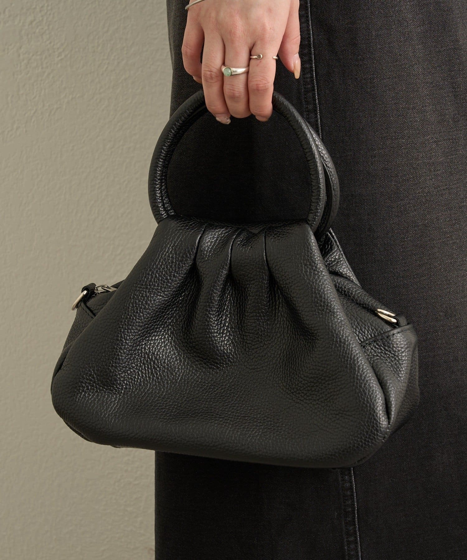 ・柔らかなフォルムと上質なレザーの掛け合わせが魅力的なギャザーハンドバッグ。