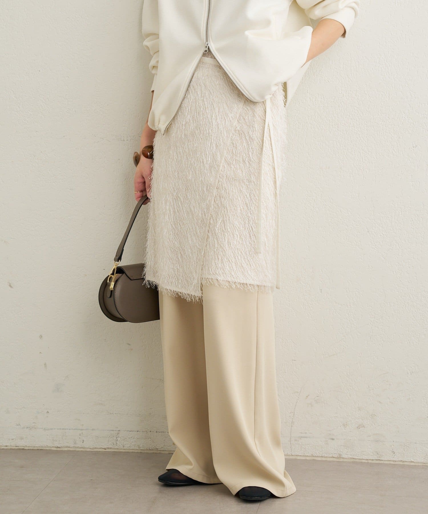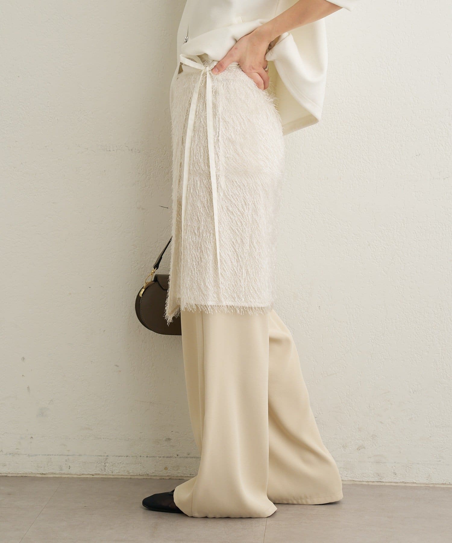 ・光沢感のある素材が上品なフリンジスカート。