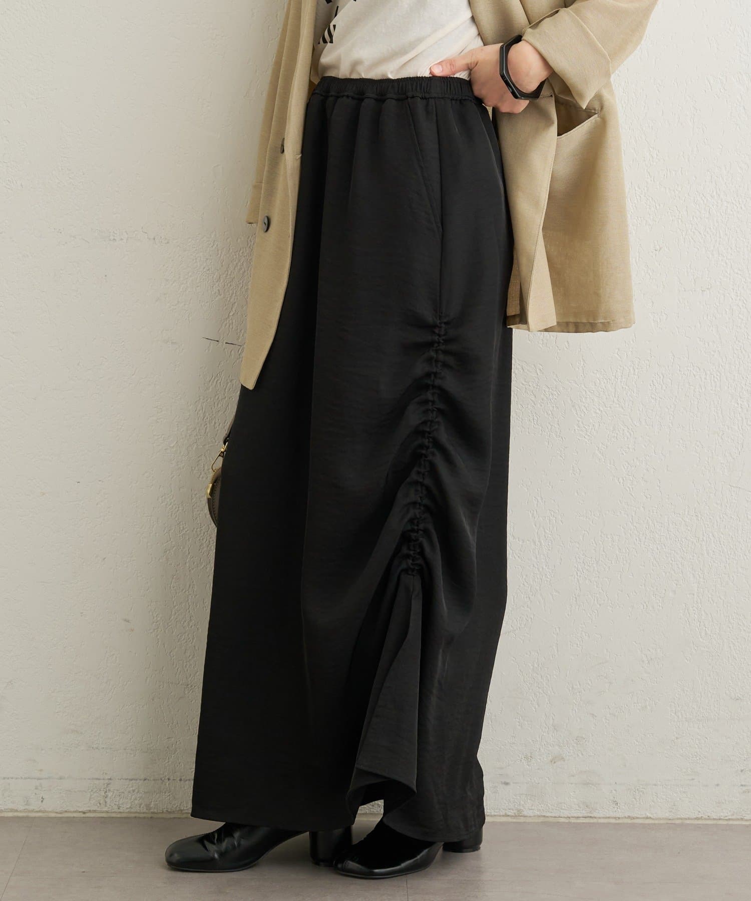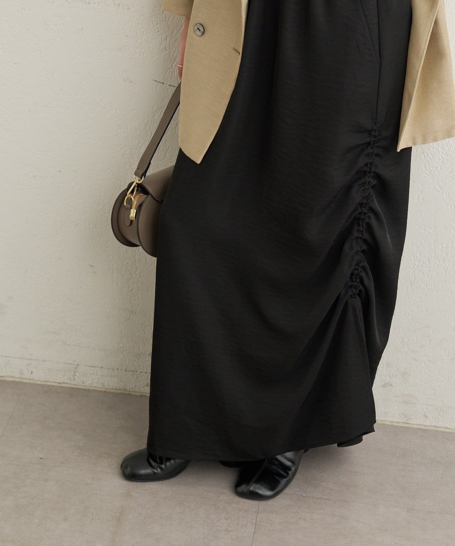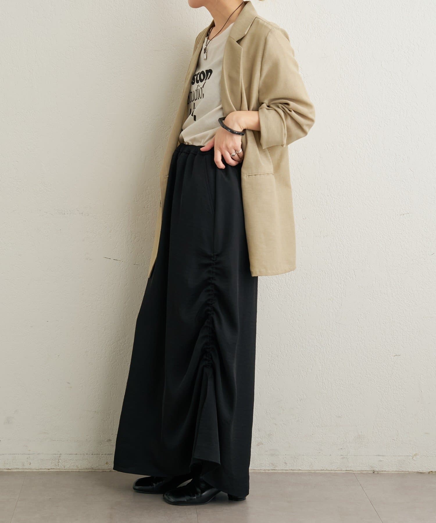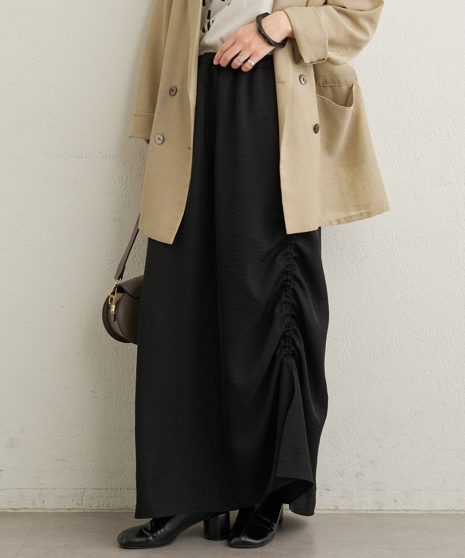 ・サイドのシャーリングデザインがスタイリングにこなれ感を演出してくれるロングスカート。