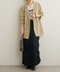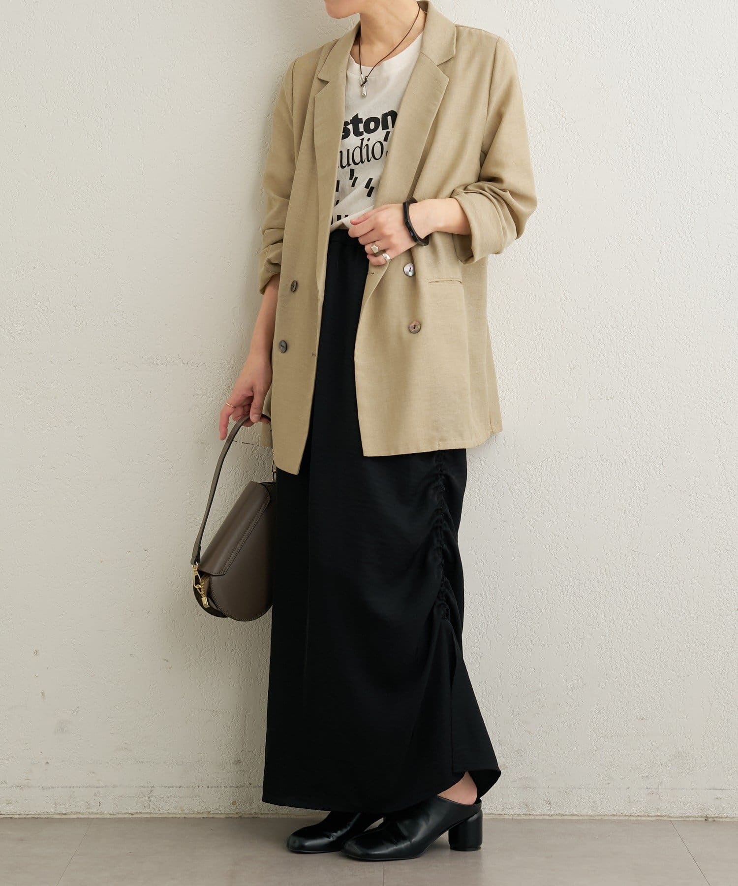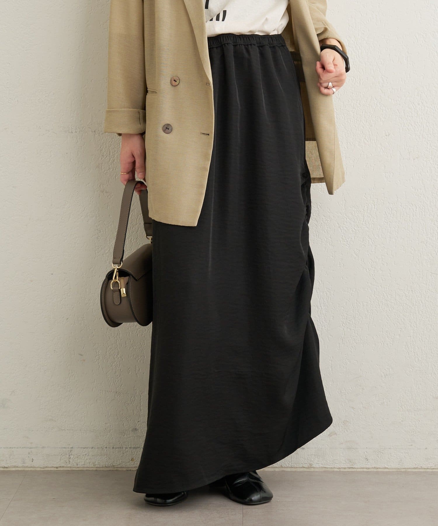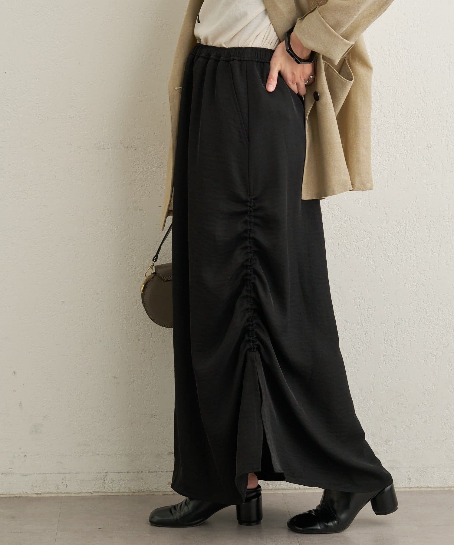 ・サイドのシャーリングデザインがスタイリングにこなれ感を演出してくれるロングスカート。