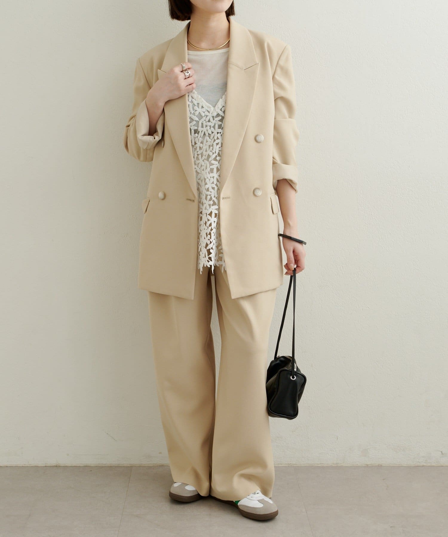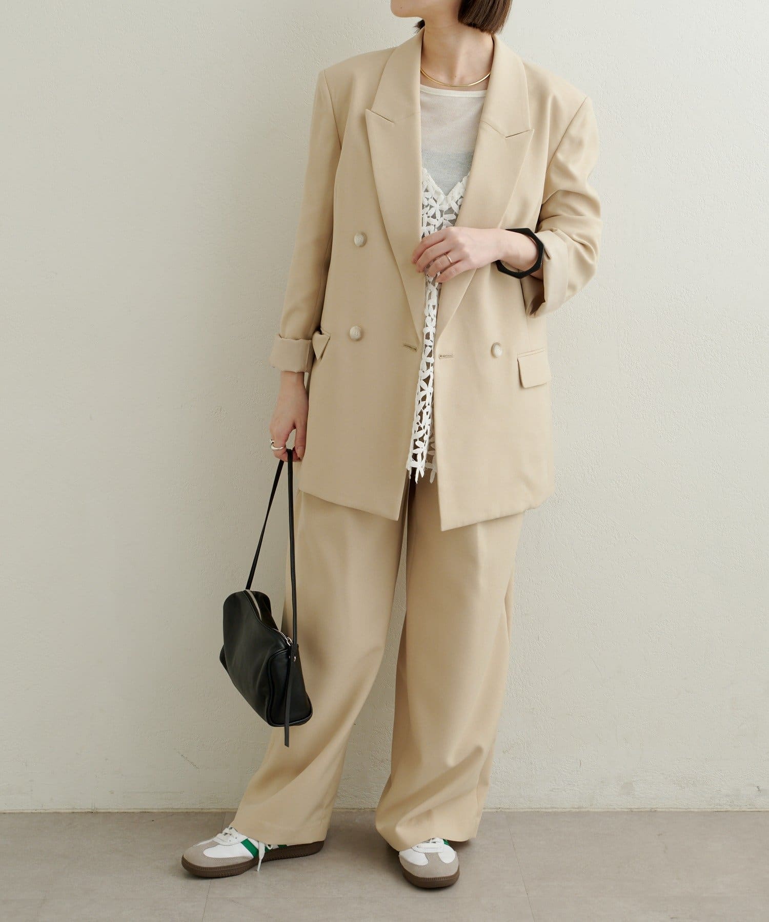 ・同素材のダブルテーラードジャケットとセットアップで着用いただけます。