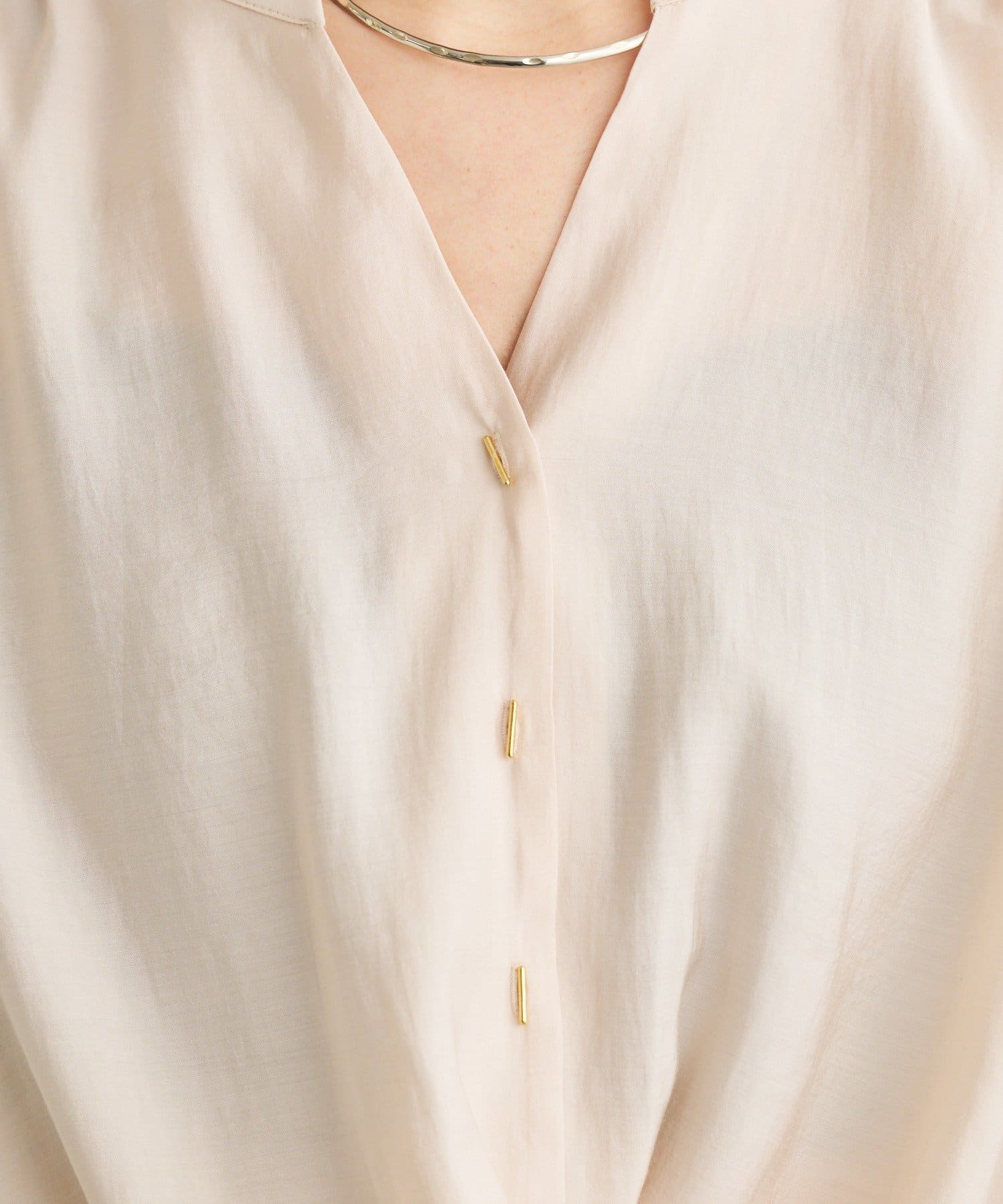 ・ゴールドの華奢なバーボタンと、やや艶感のある素材が繊細で女性らしい印象を与えてくれます。