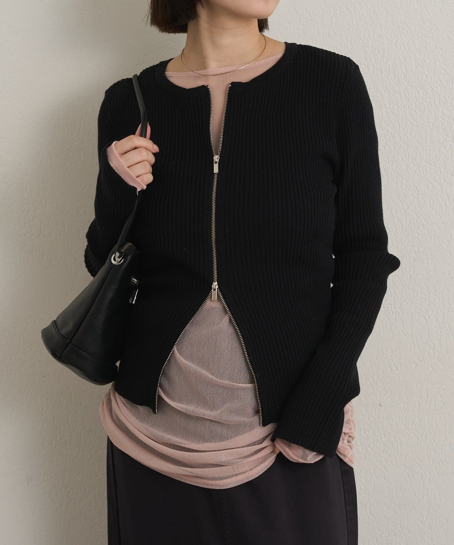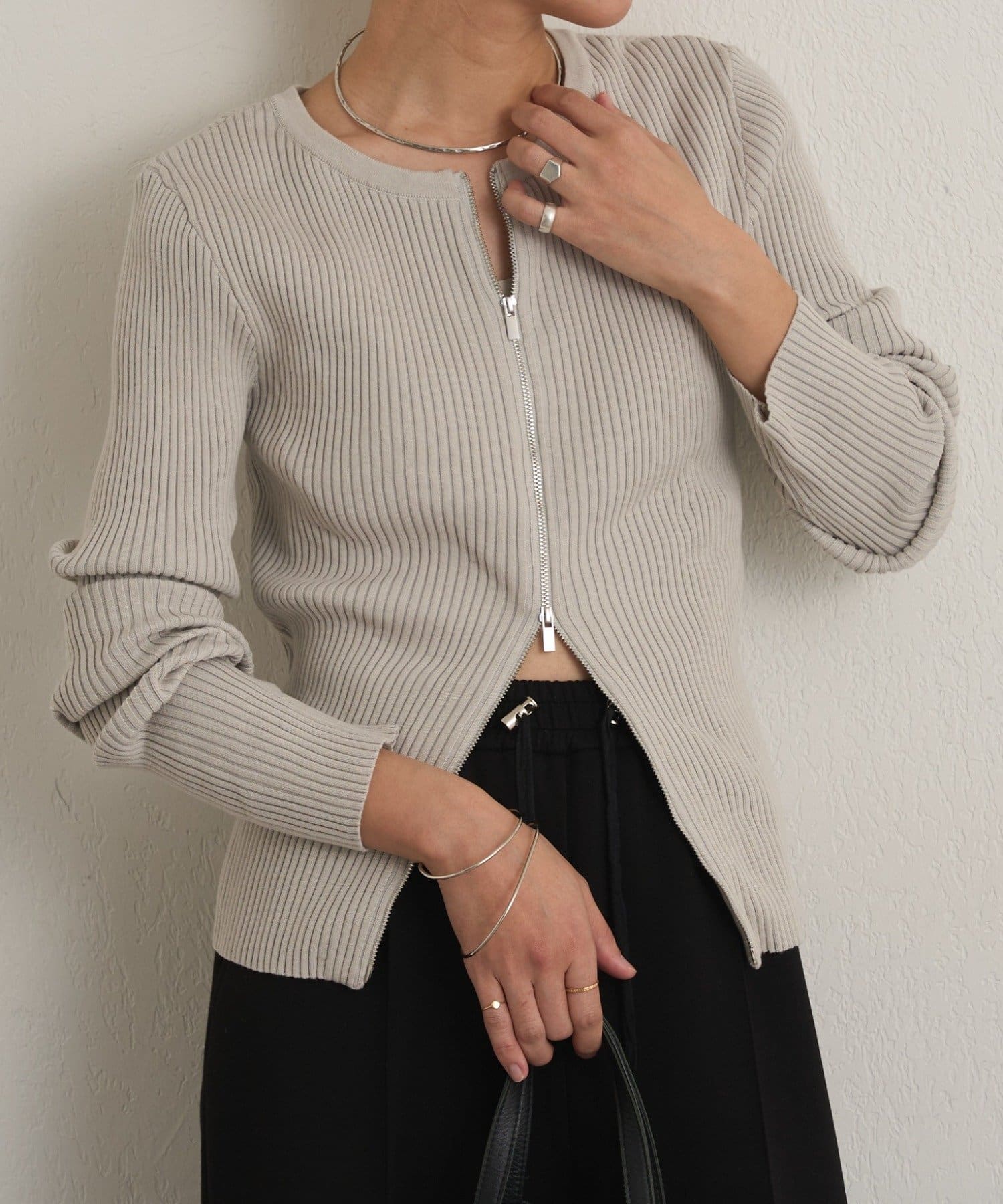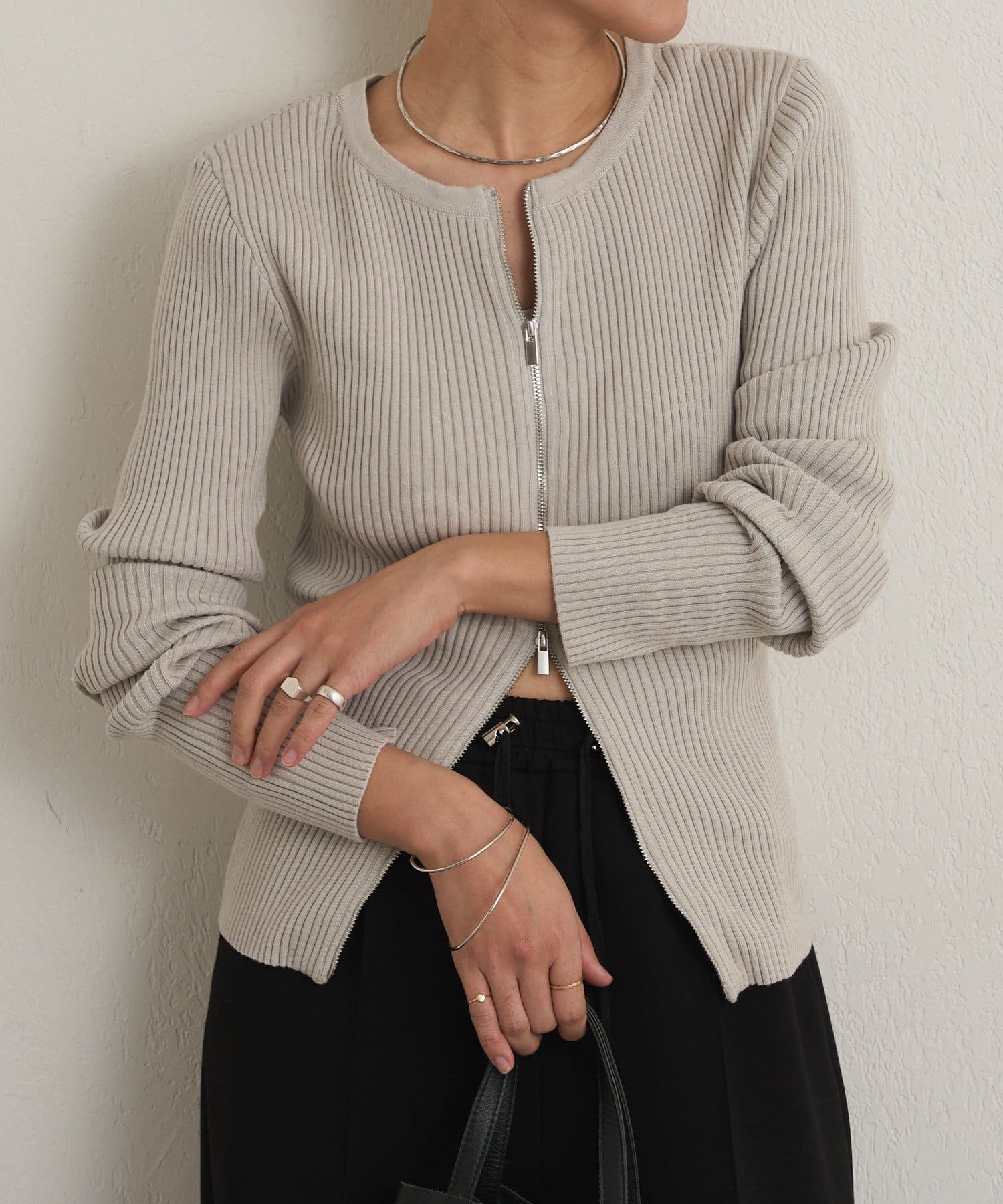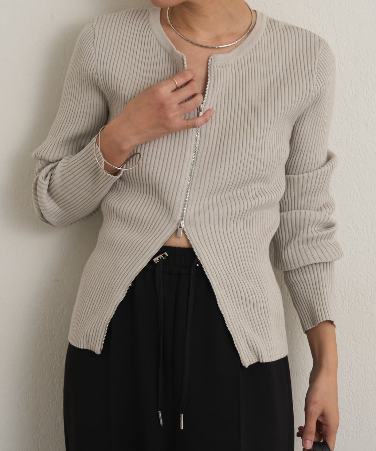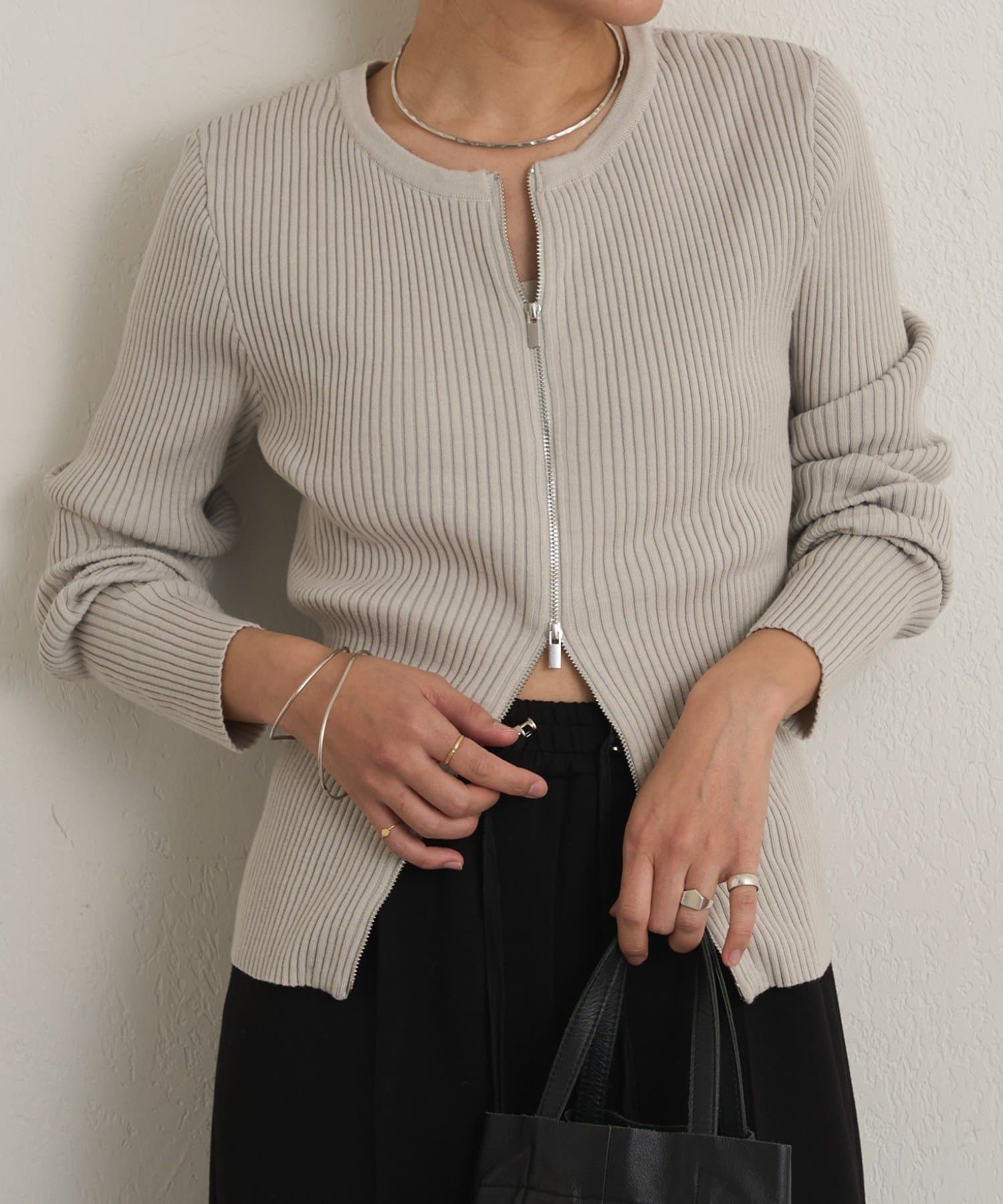 ・程よいフィット感のリブ素材が、身体のラインをすっきり見せてくれるダブルジップリブカーディガン。