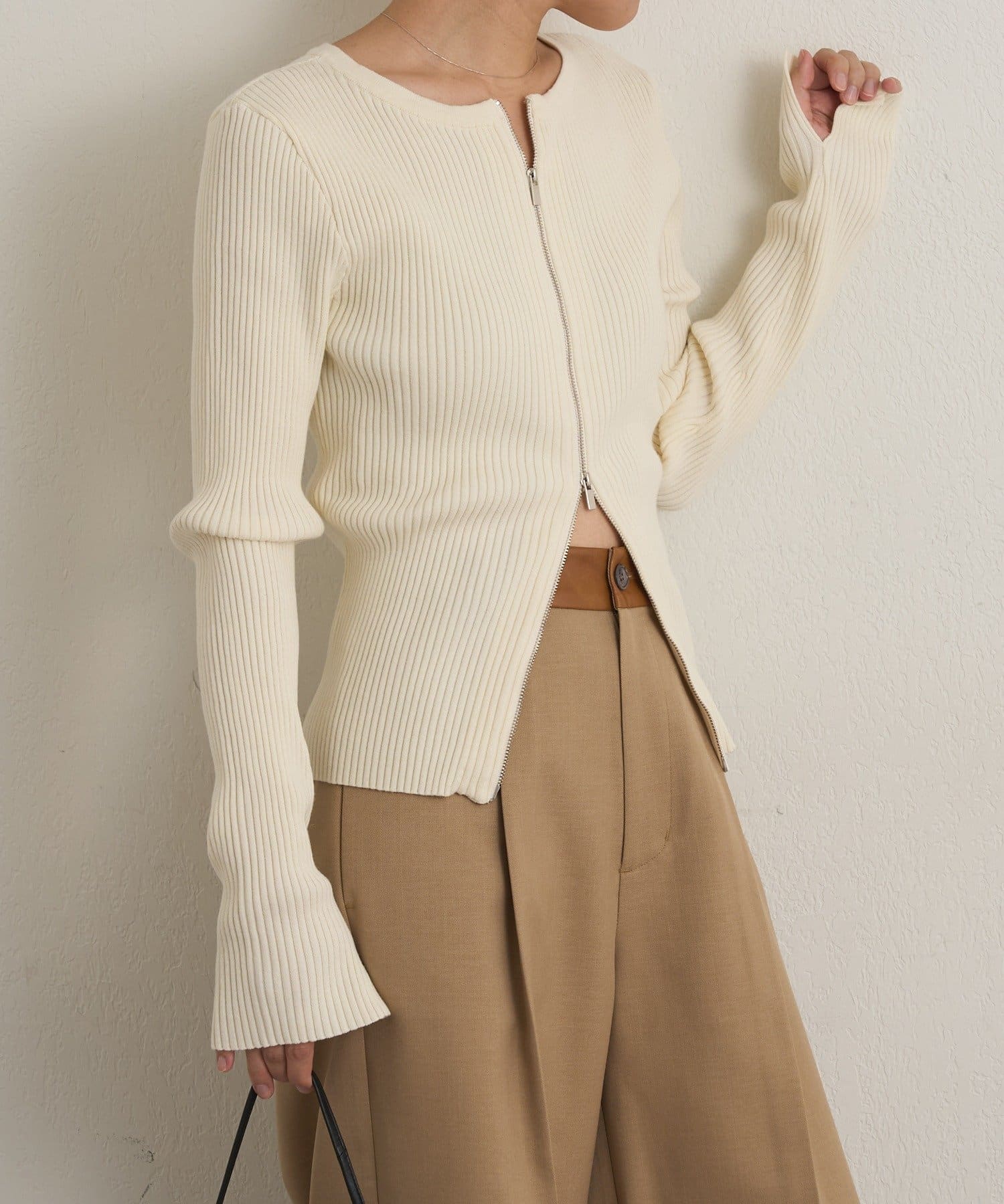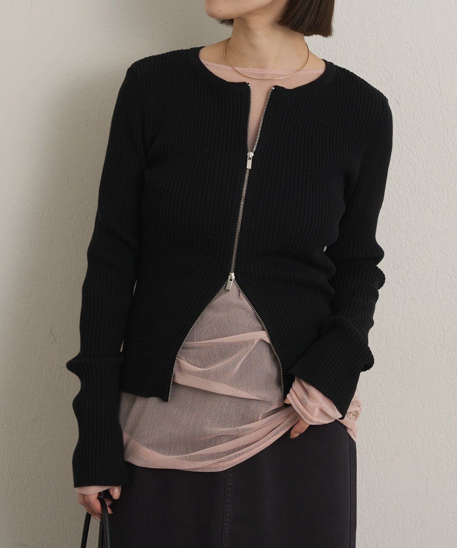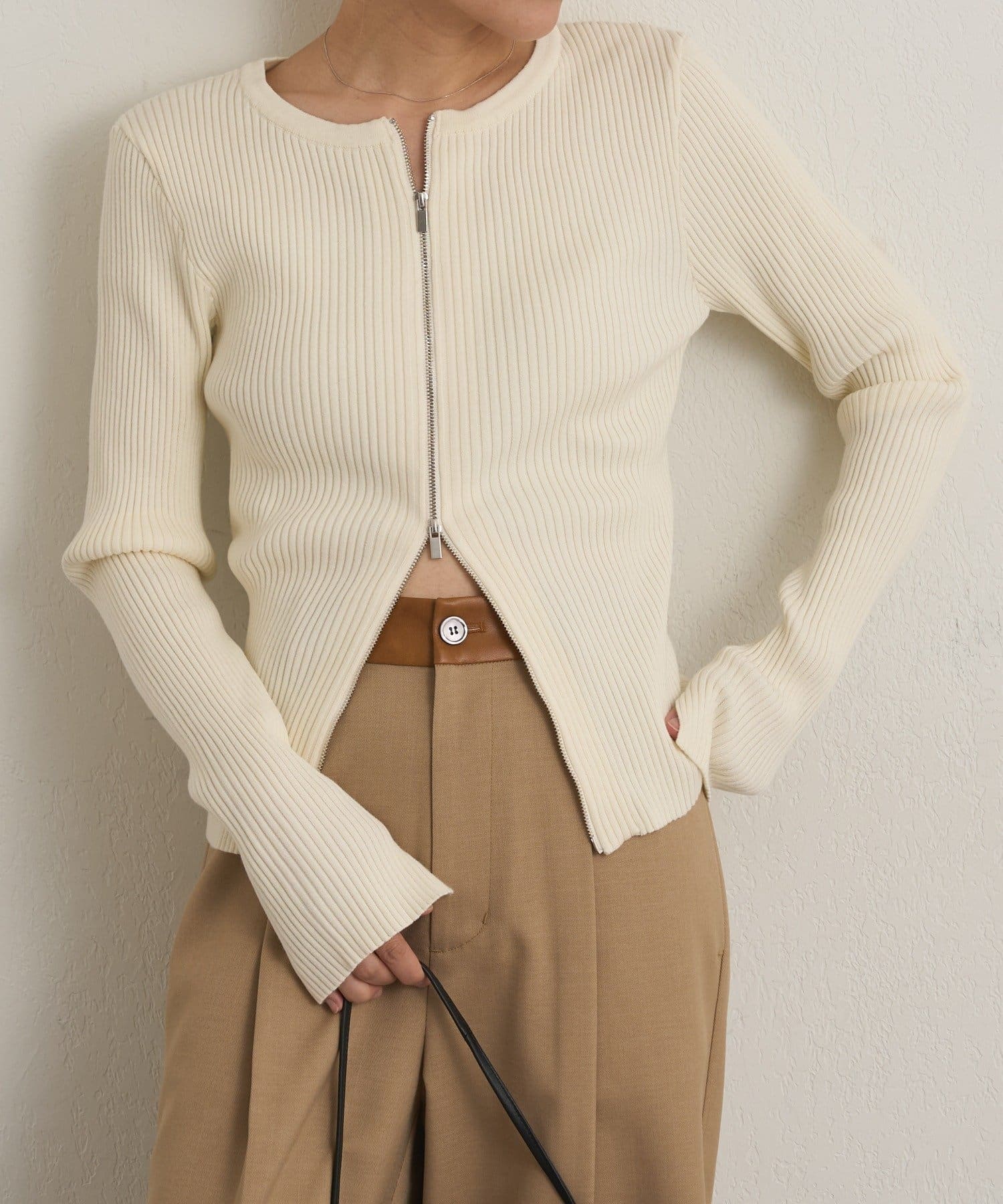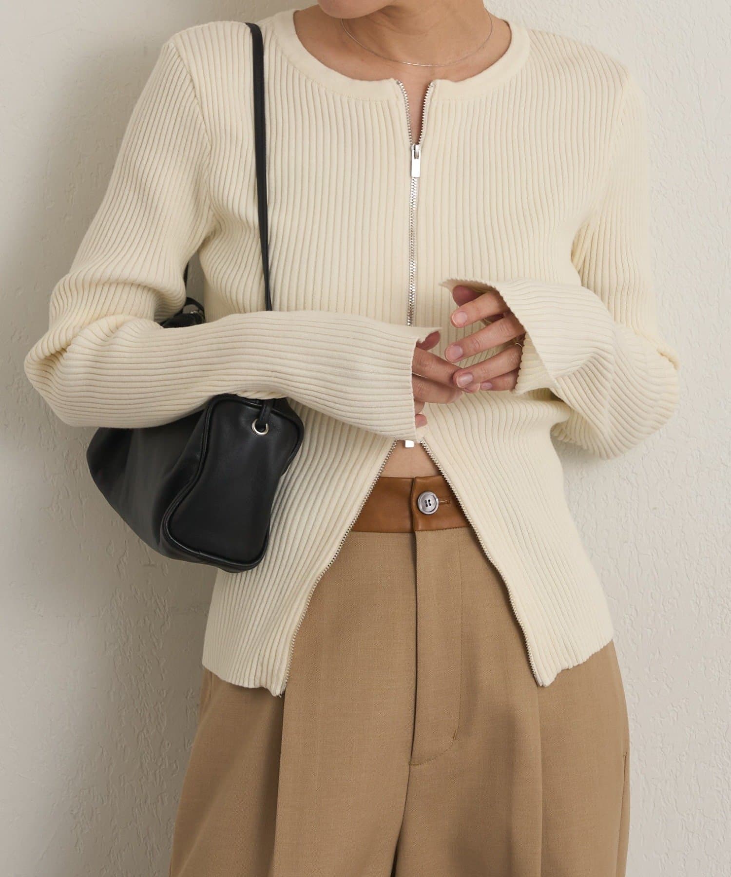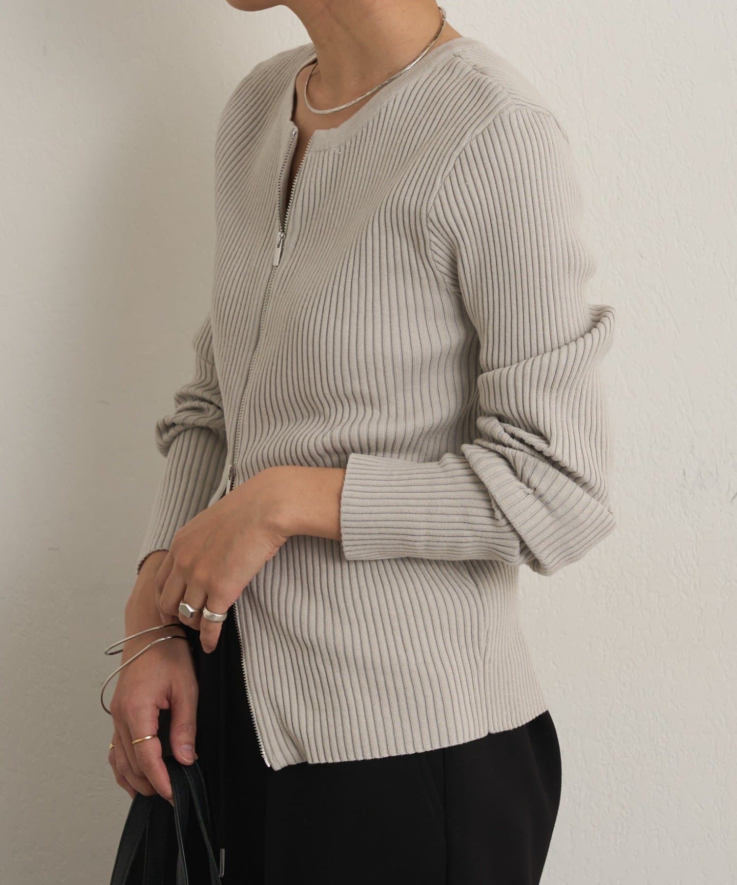 ・程よいフィット感のリブ素材が、身体のラインをすっきり見せてくれるダブルジップリブカーディガン。