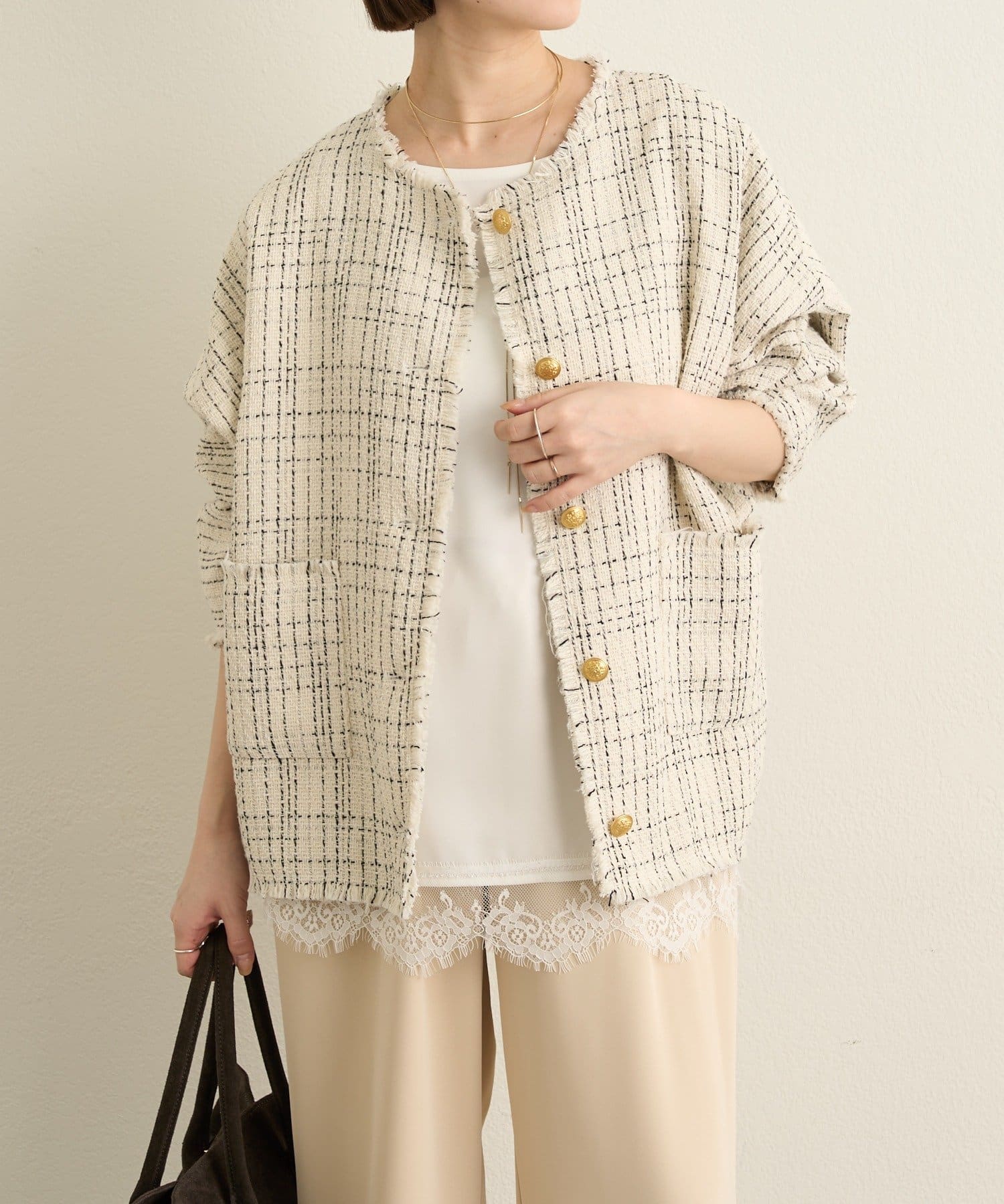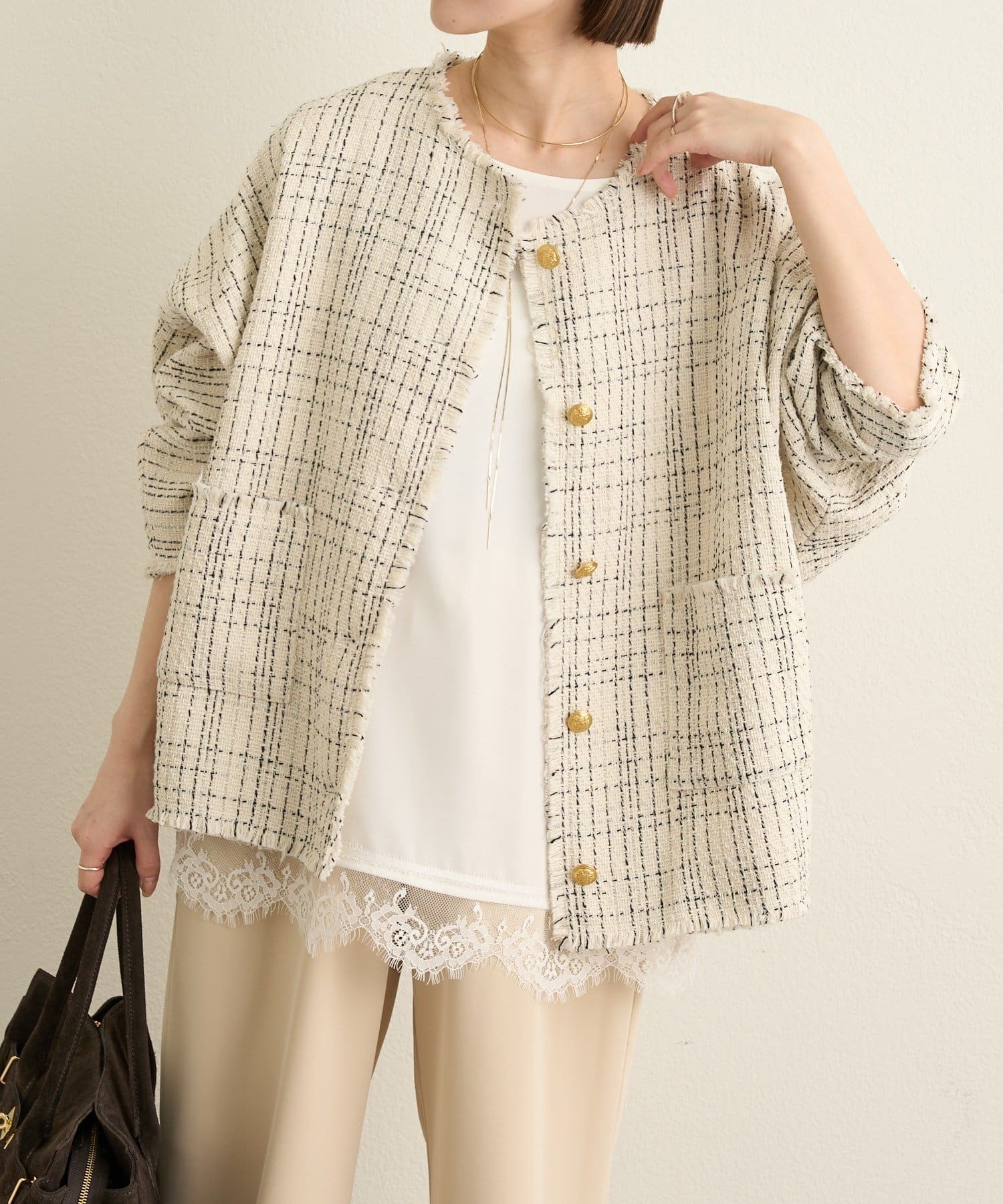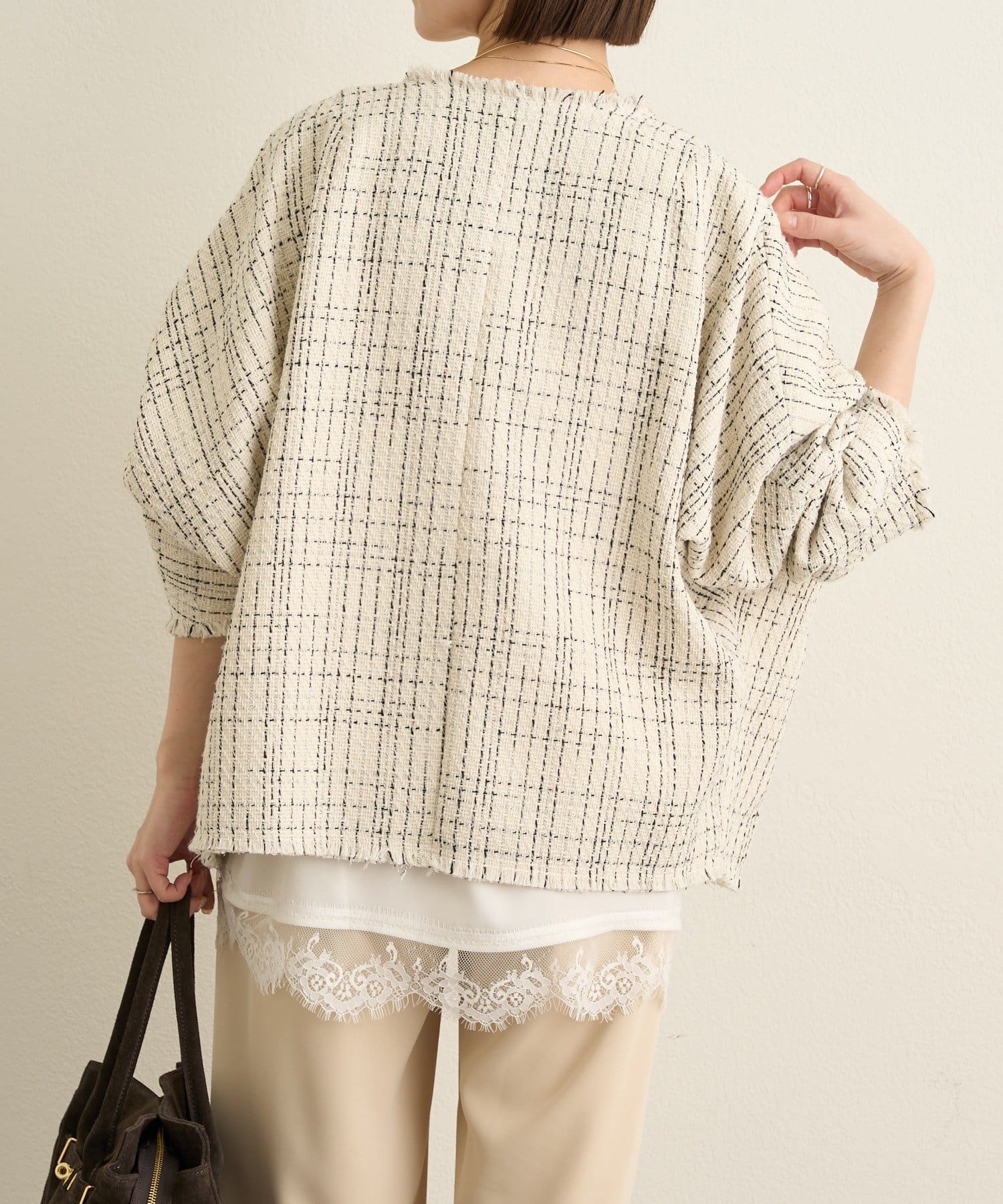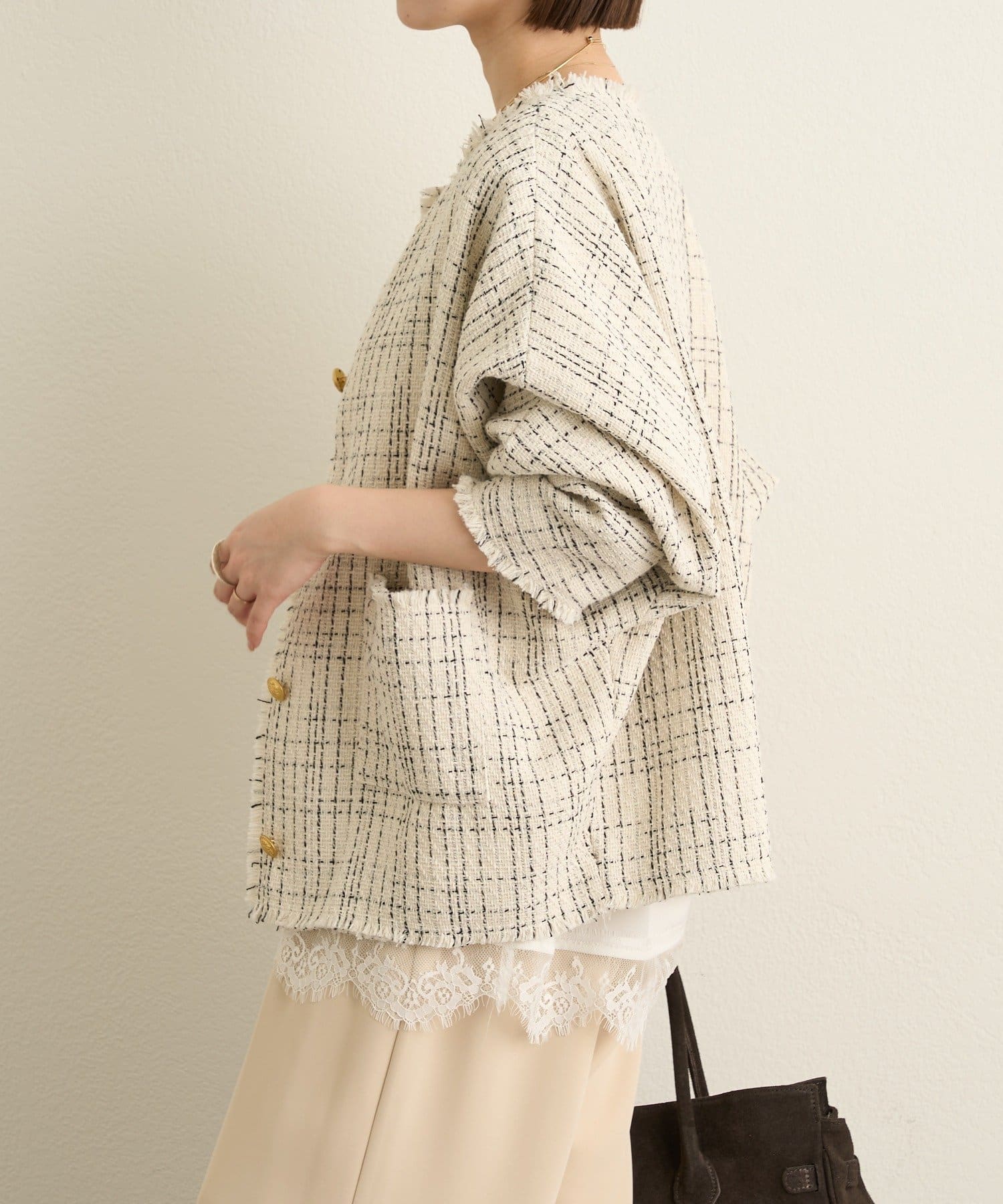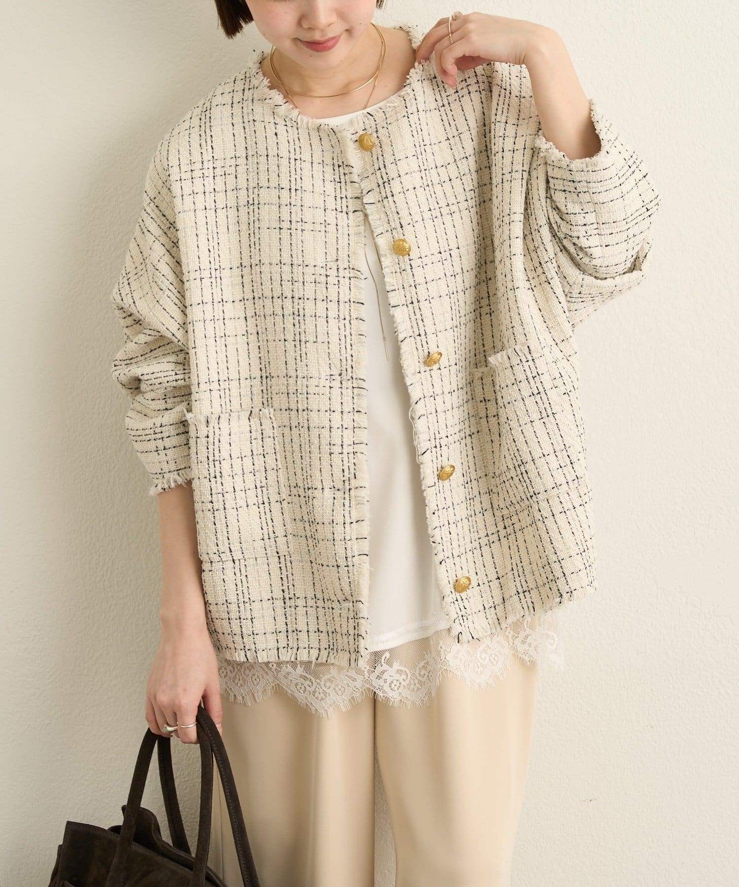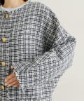 ・ツイード素材が華やかながら、ノーカラーデザインで顔周りはすっきり見せてくれます。