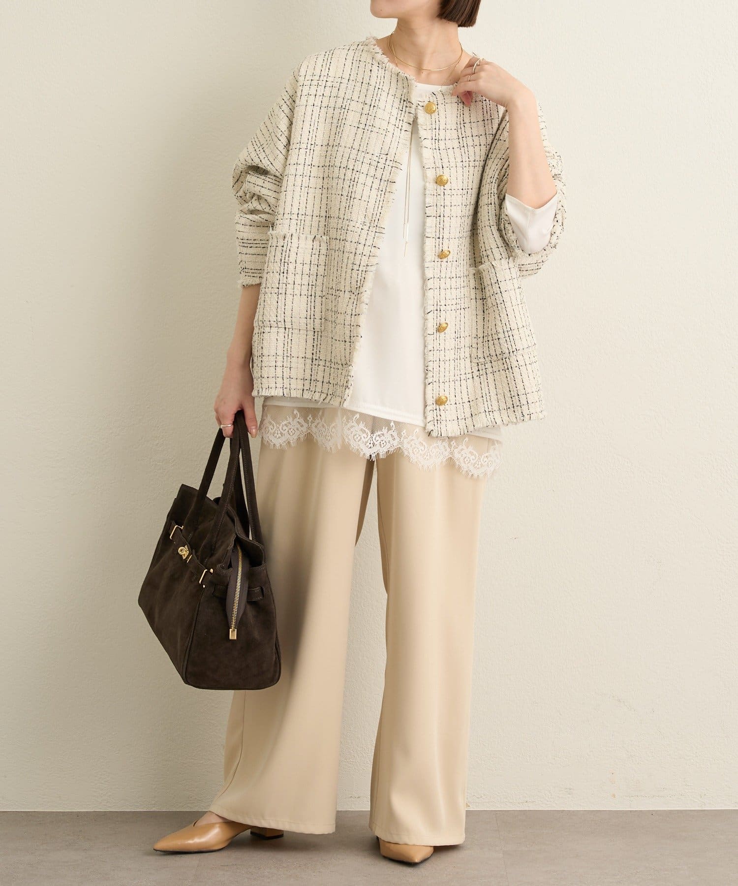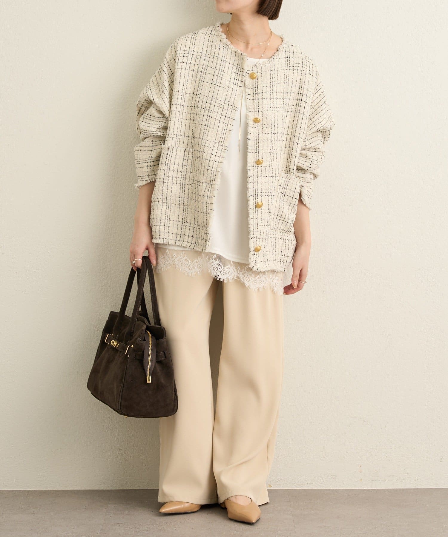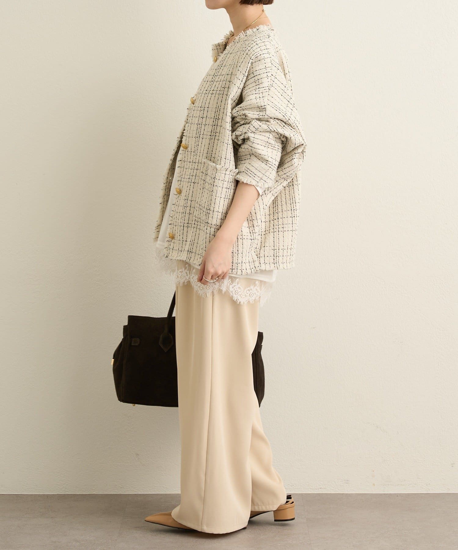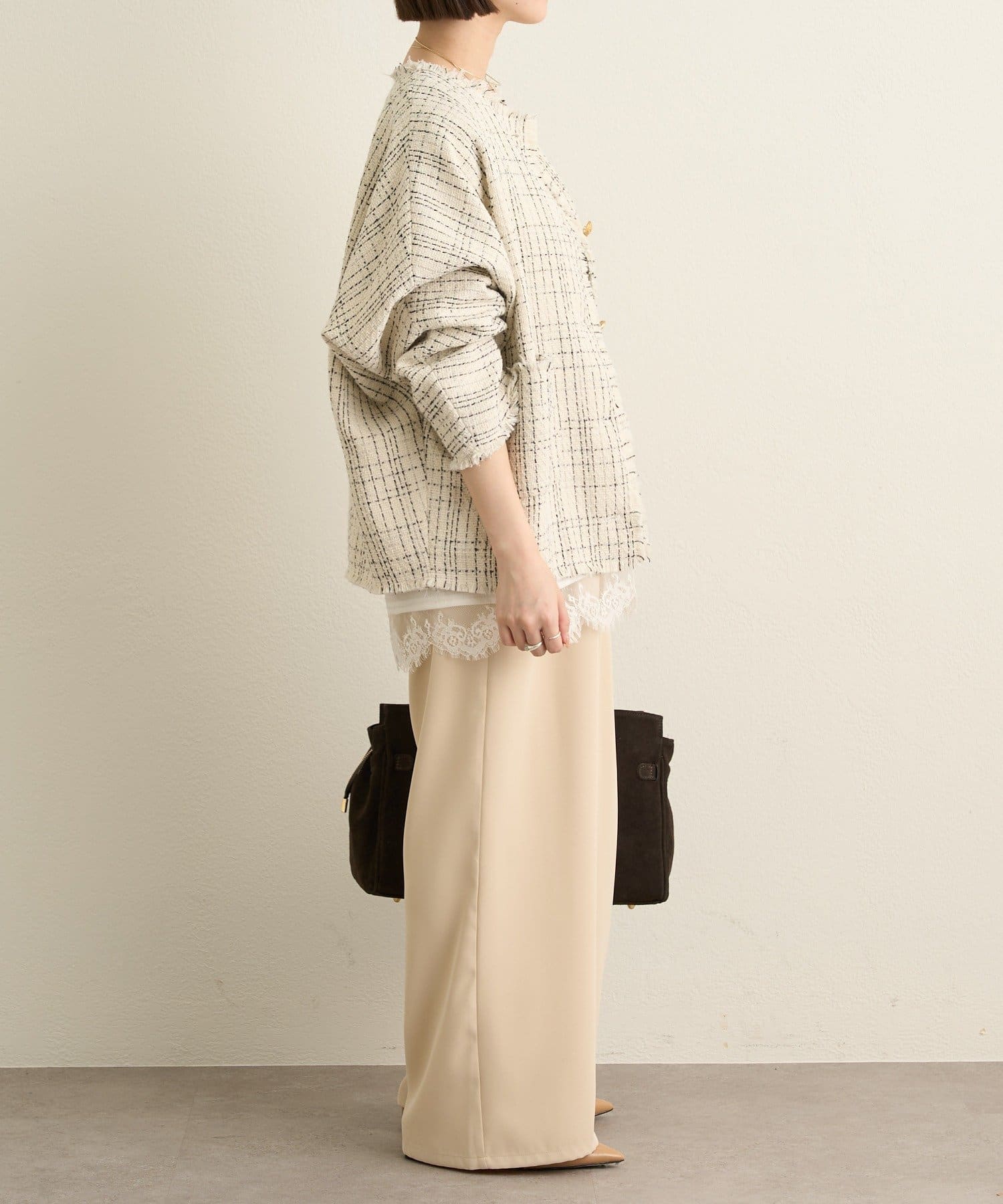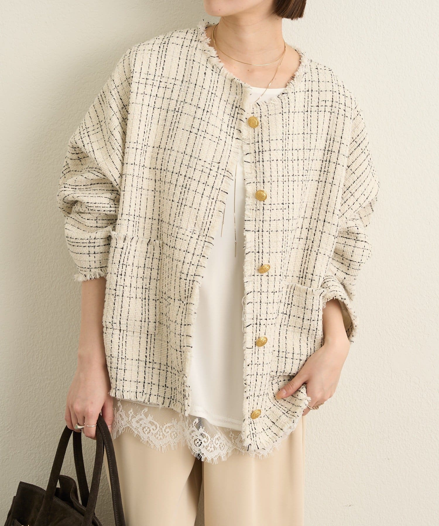 ・ツイード素材が華やかながら、ノーカラーデザインで顔周りはすっきり見せてくれます。