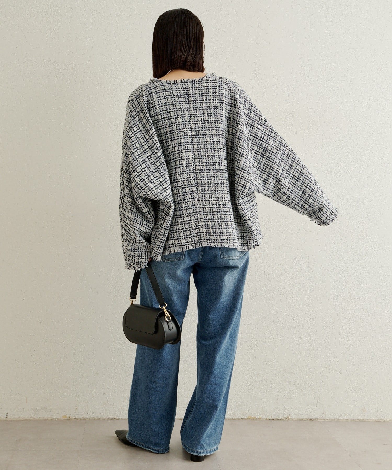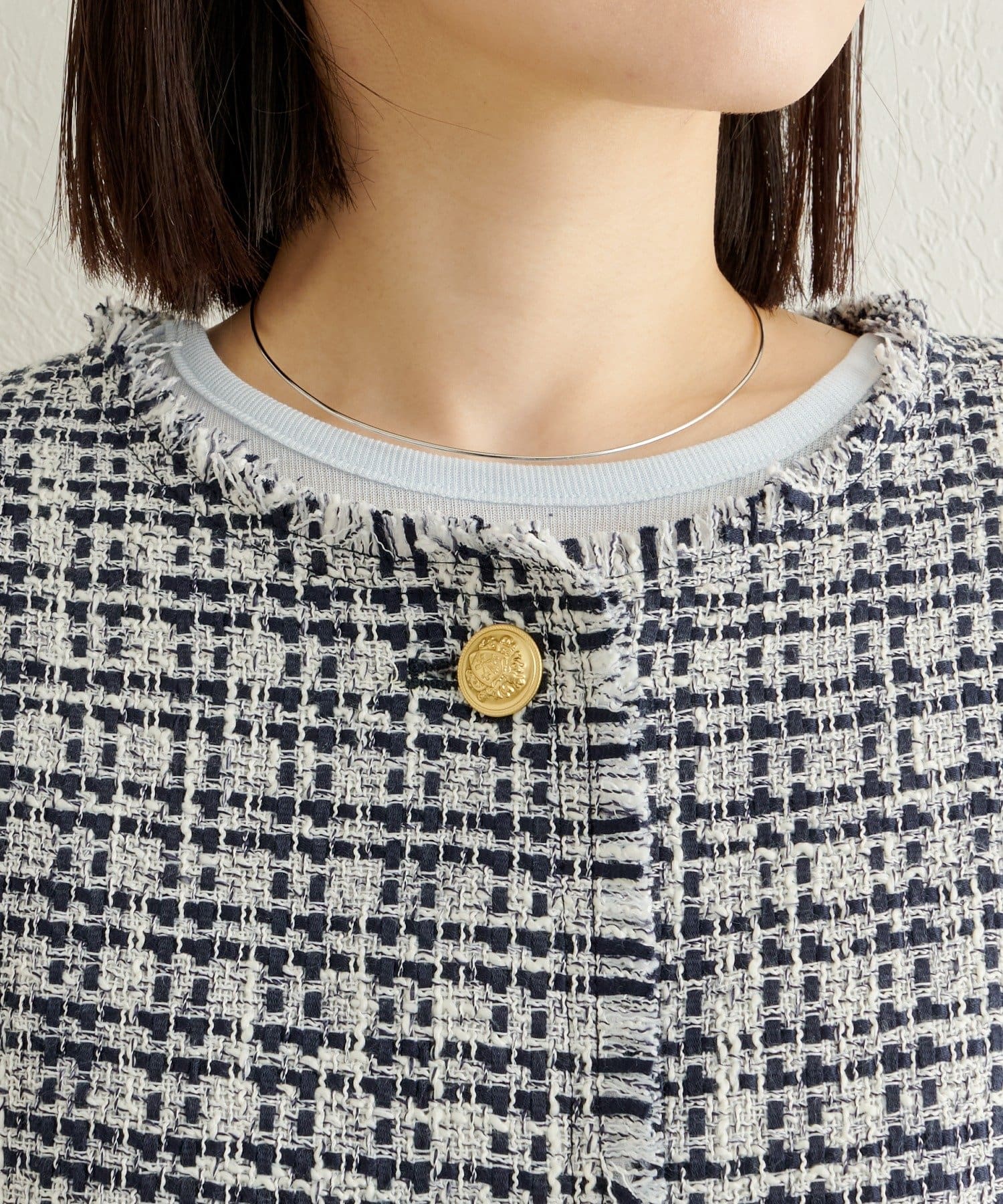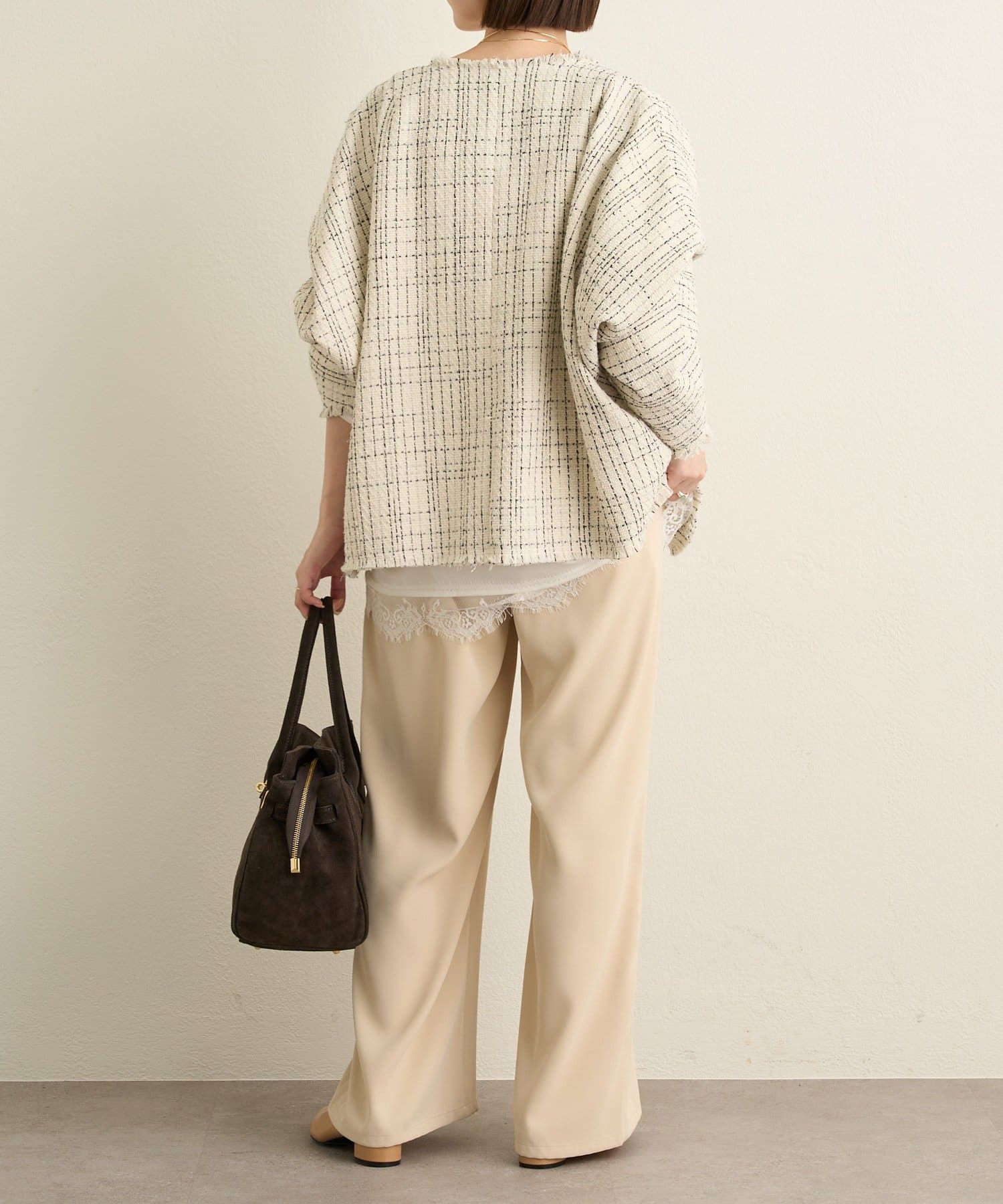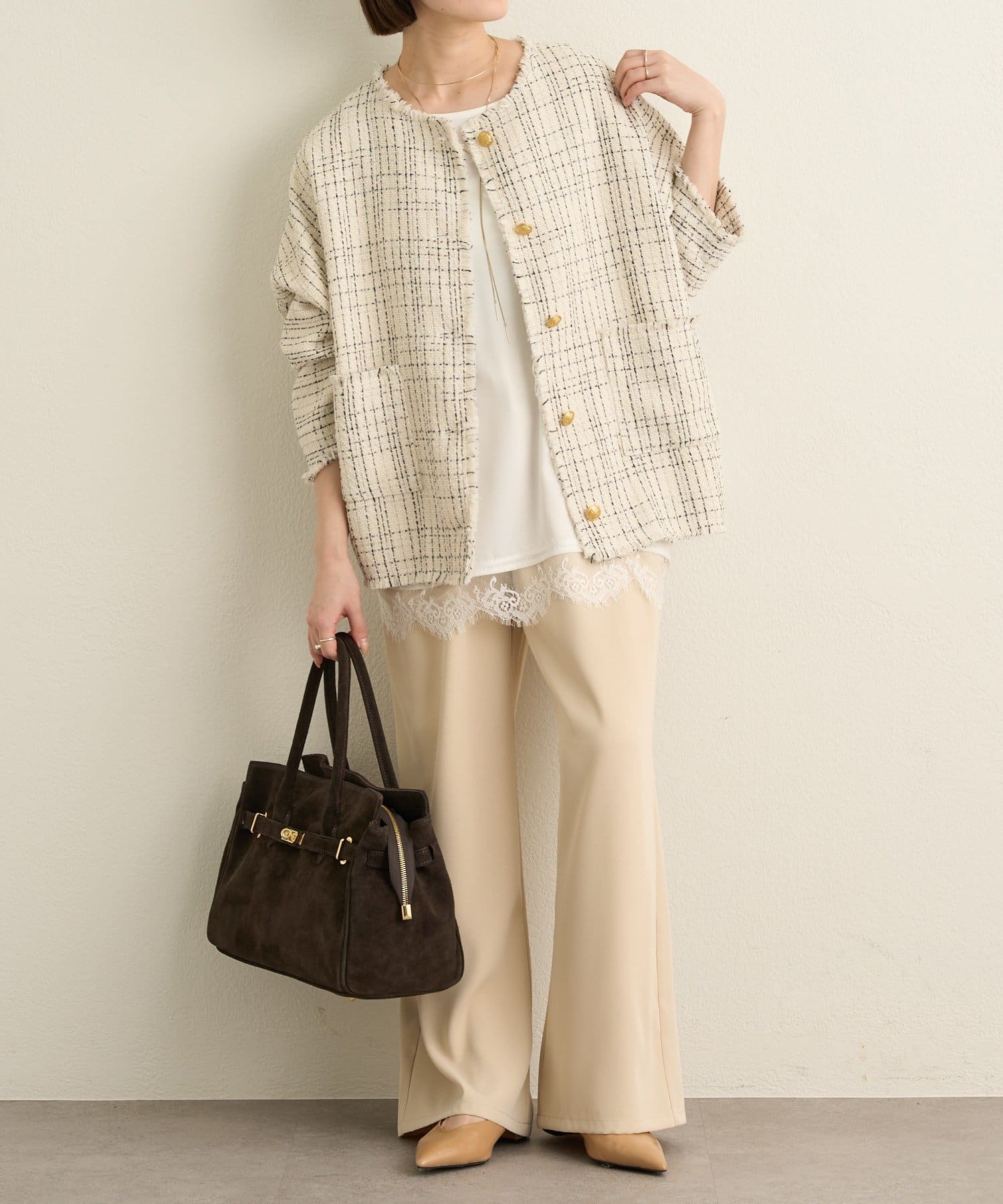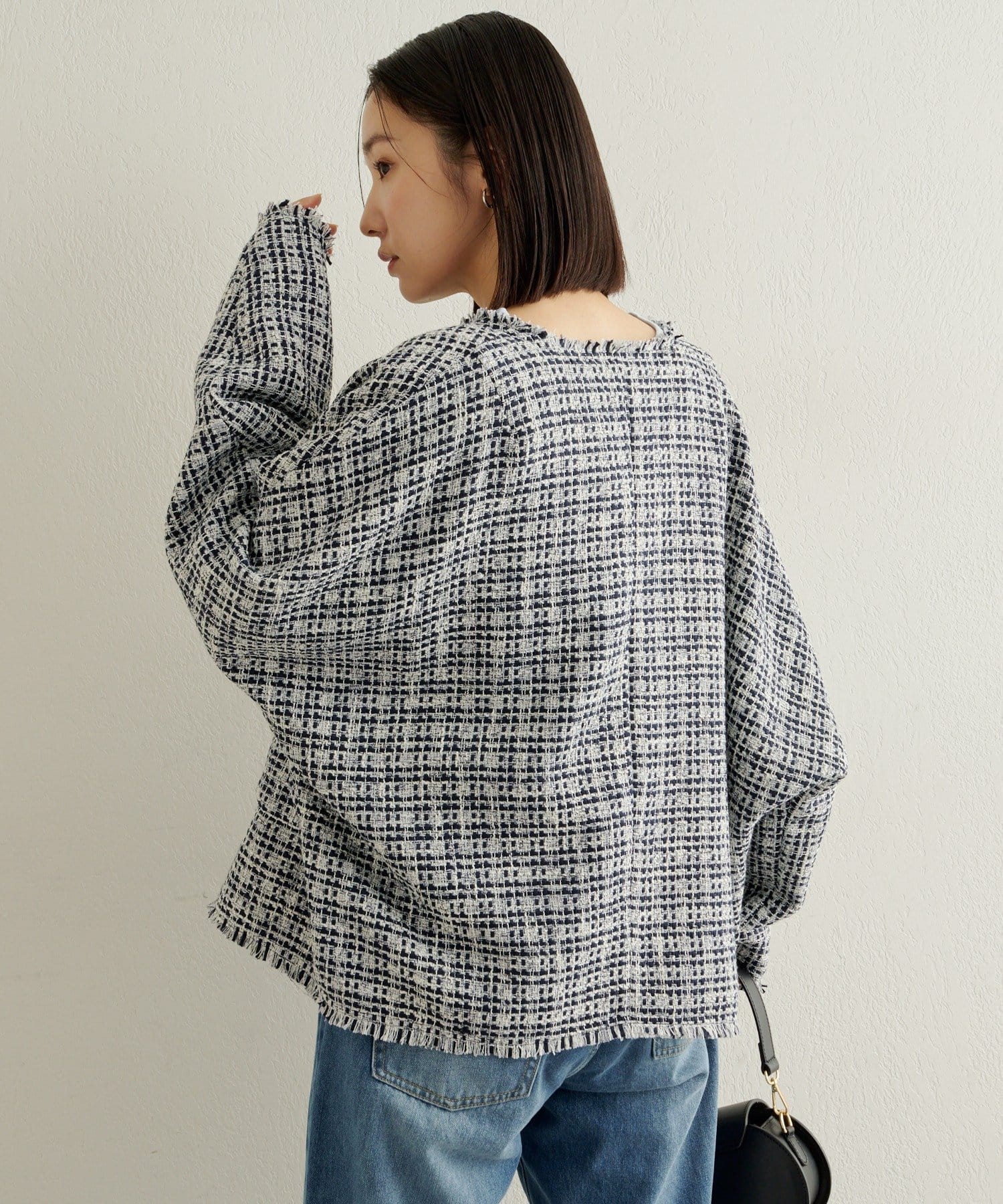 ・ツイード素材が華やかながら、ノーカラーデザインで顔周りはすっきり見せてくれます。