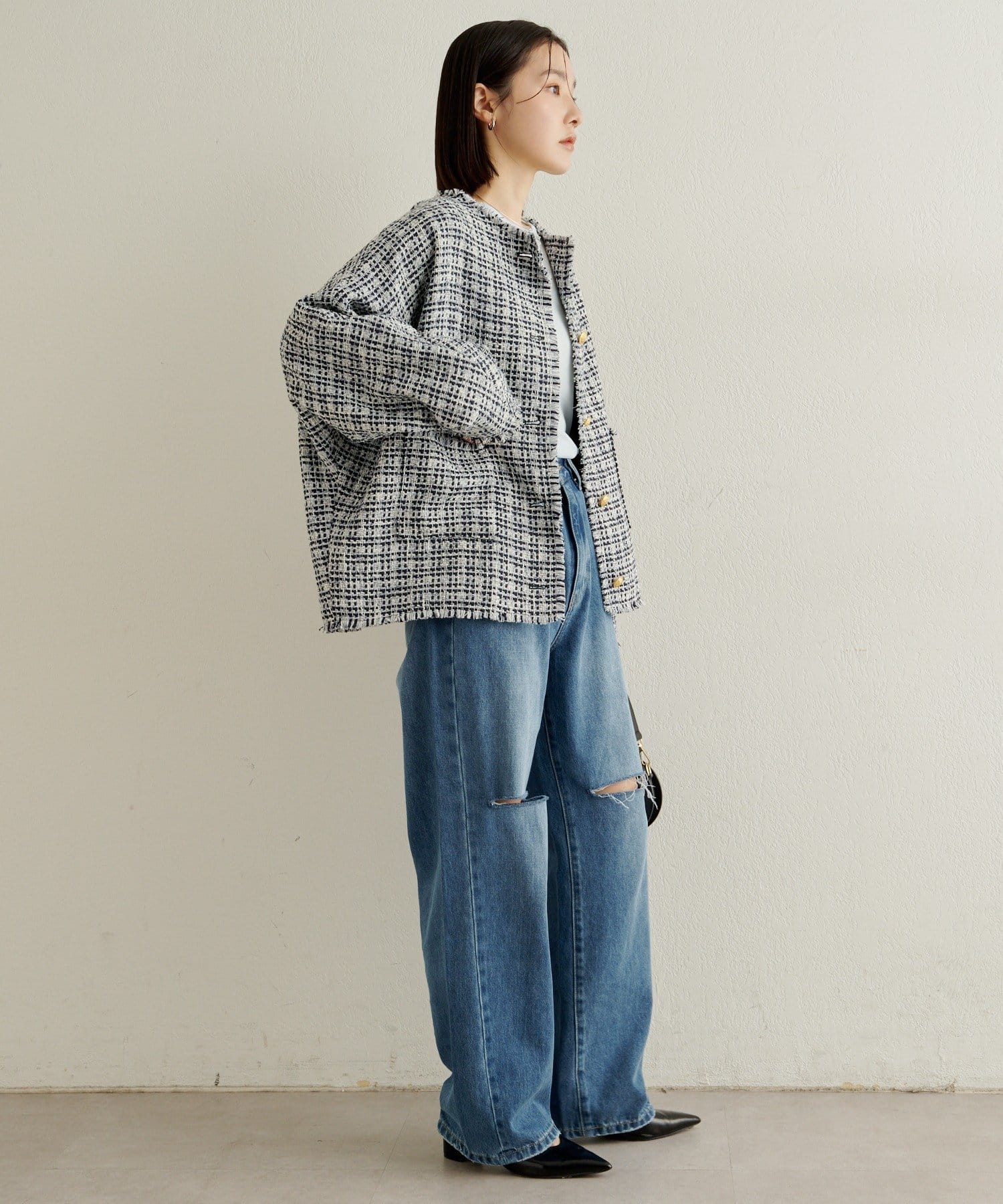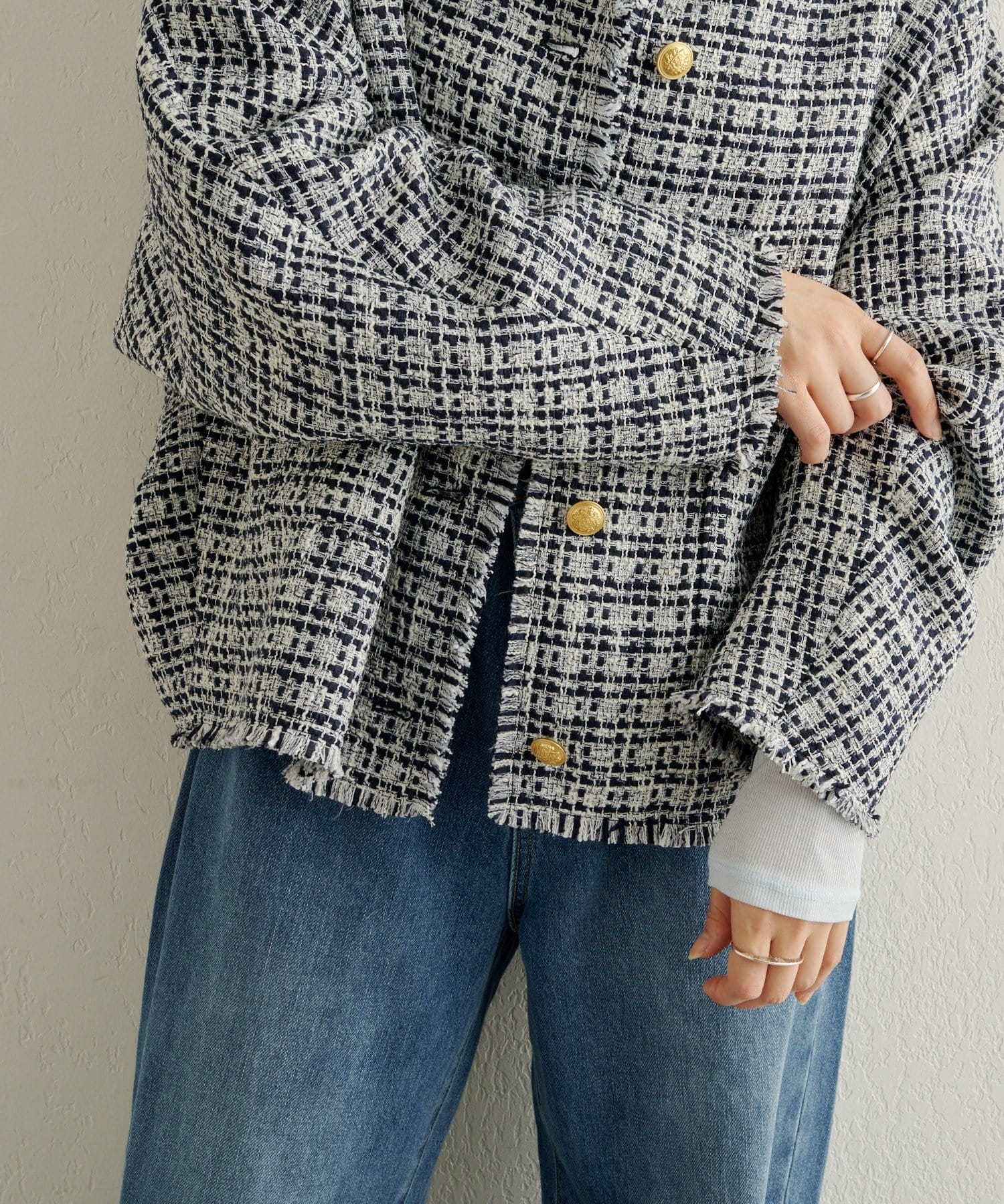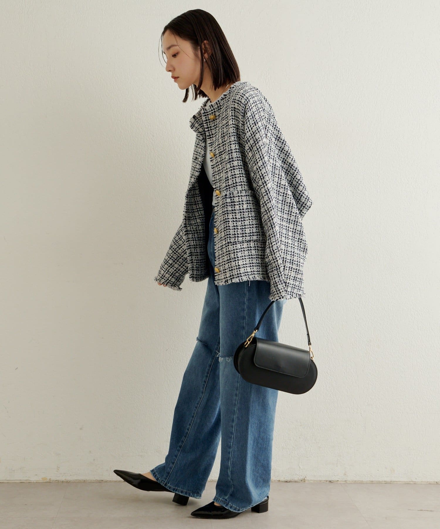 スタイリングに華やかな上品さをプラスしてくれるツイードジャケット