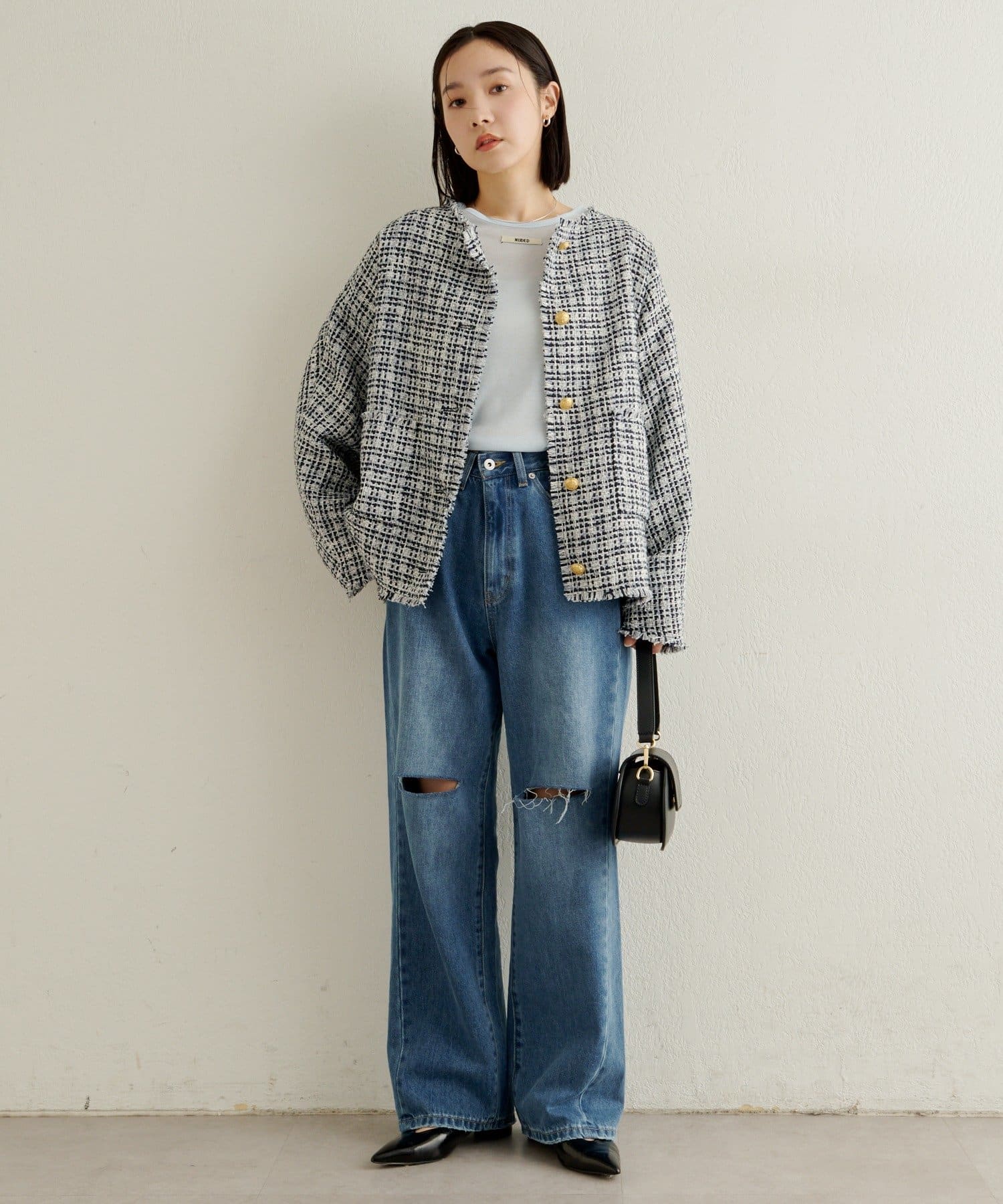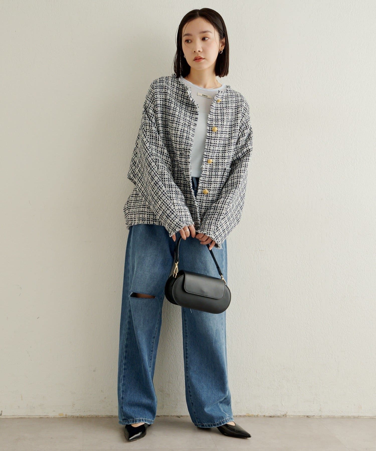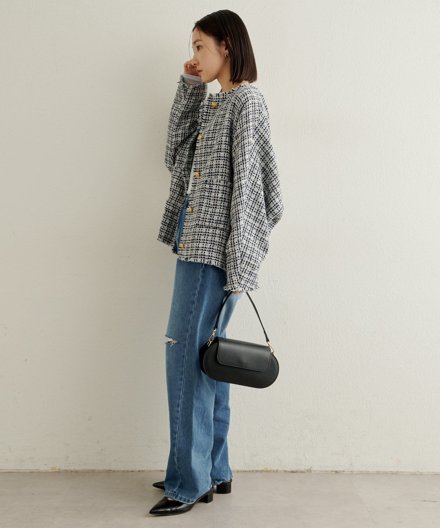 スタイリングに華やかな上品さをプラスしてくれるツイードジャケット