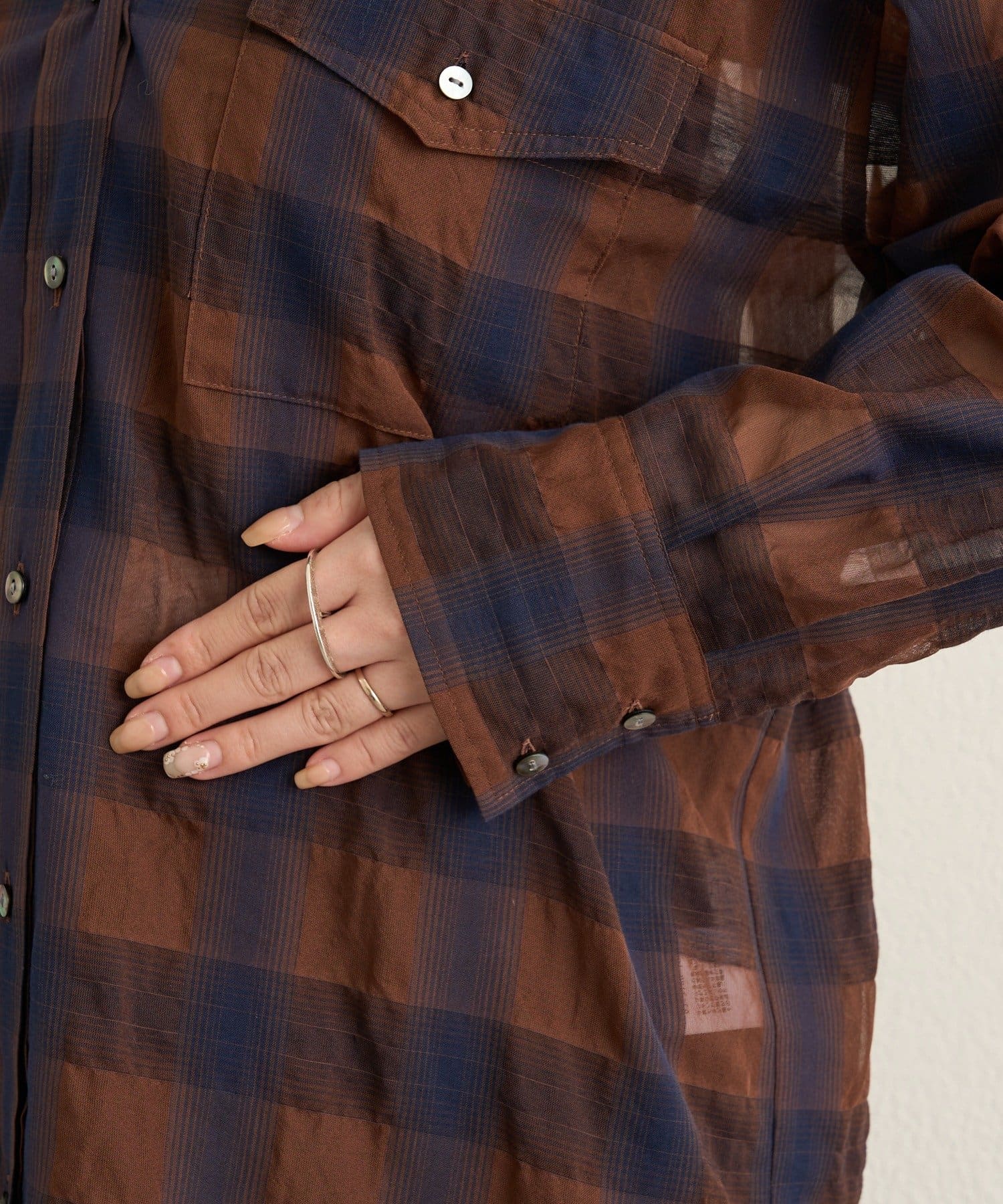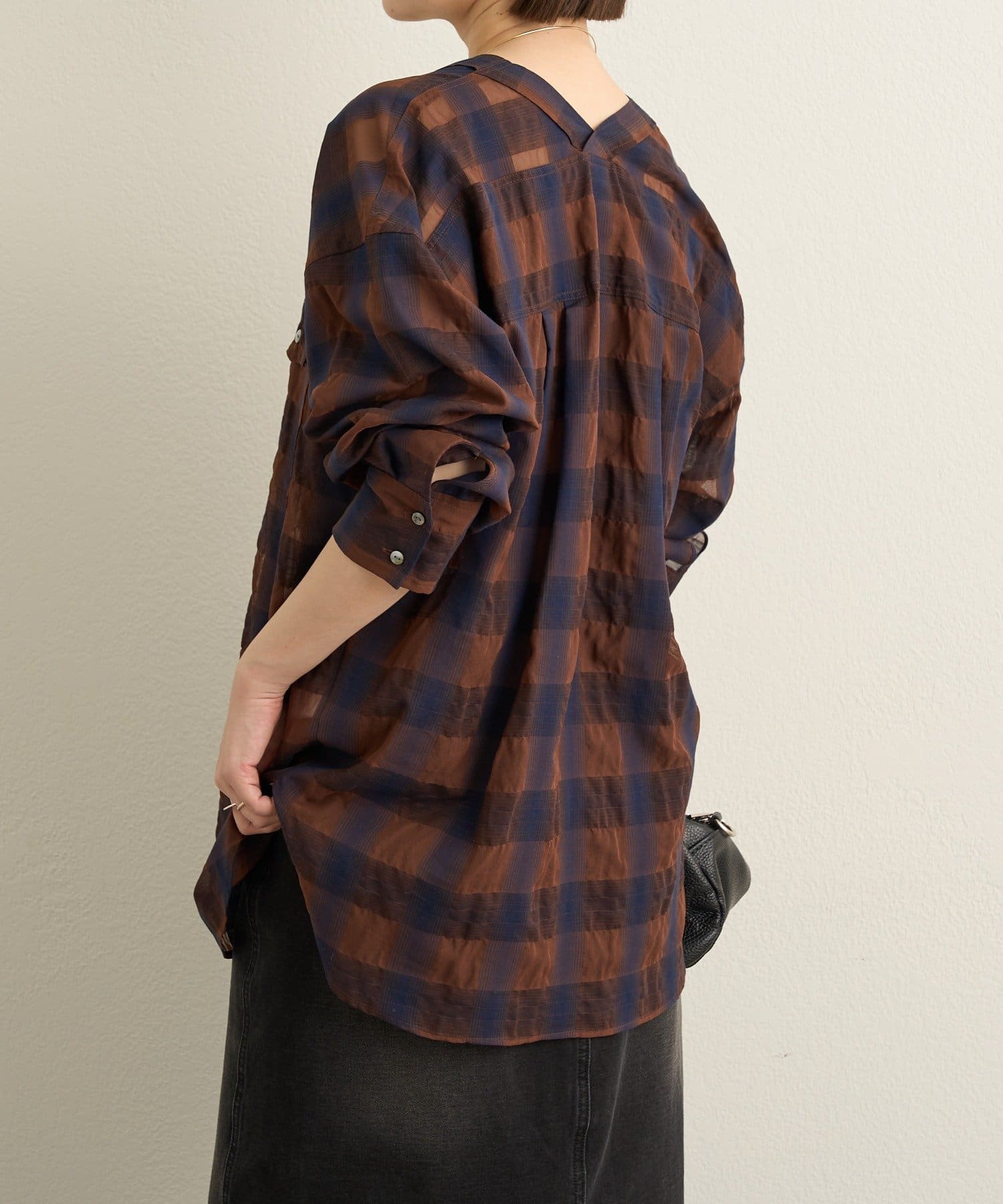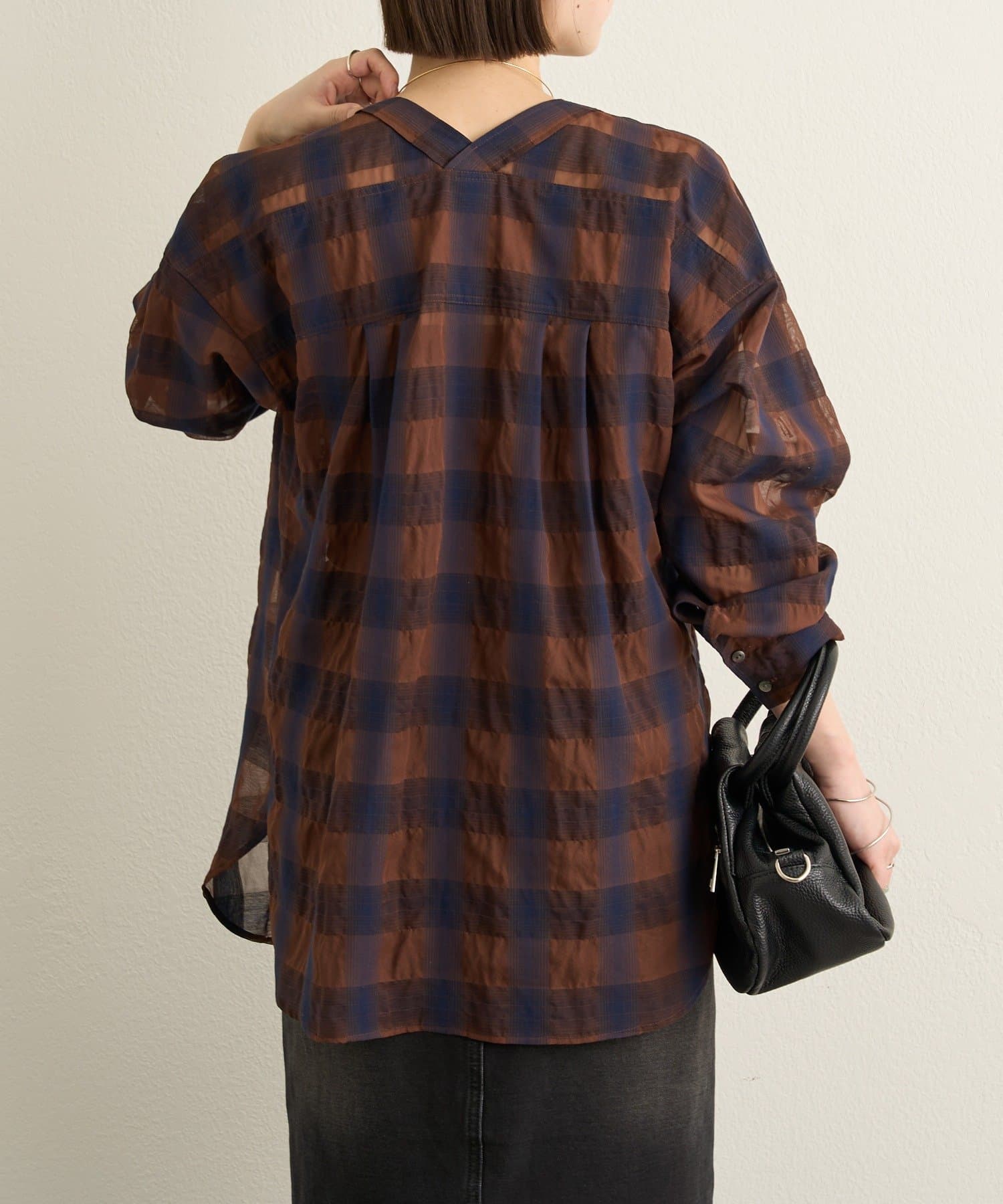 ・透け感のある素材にチェックのデザインが、カジュアルすぎず上品さも兼ね備えたブラウス。