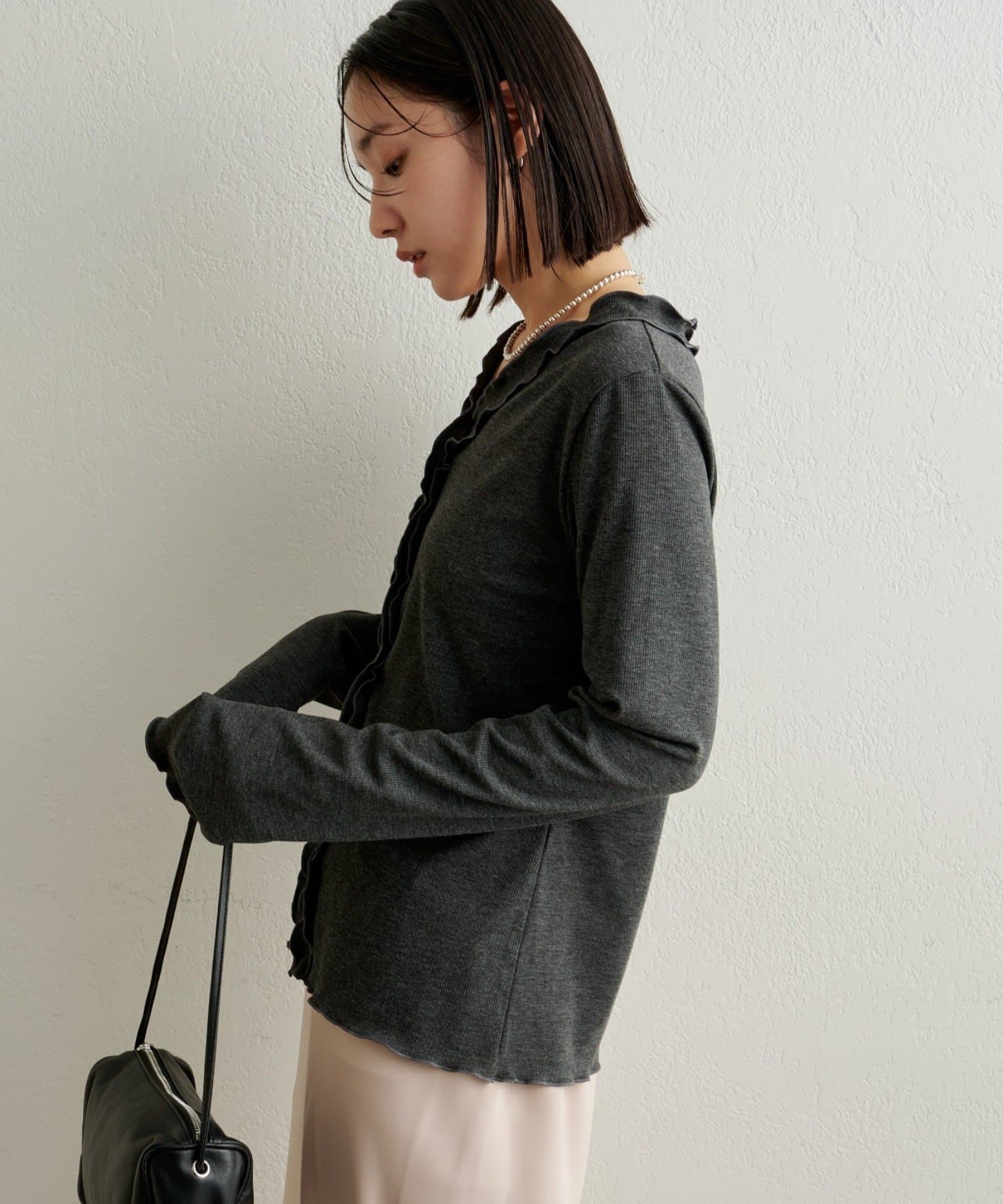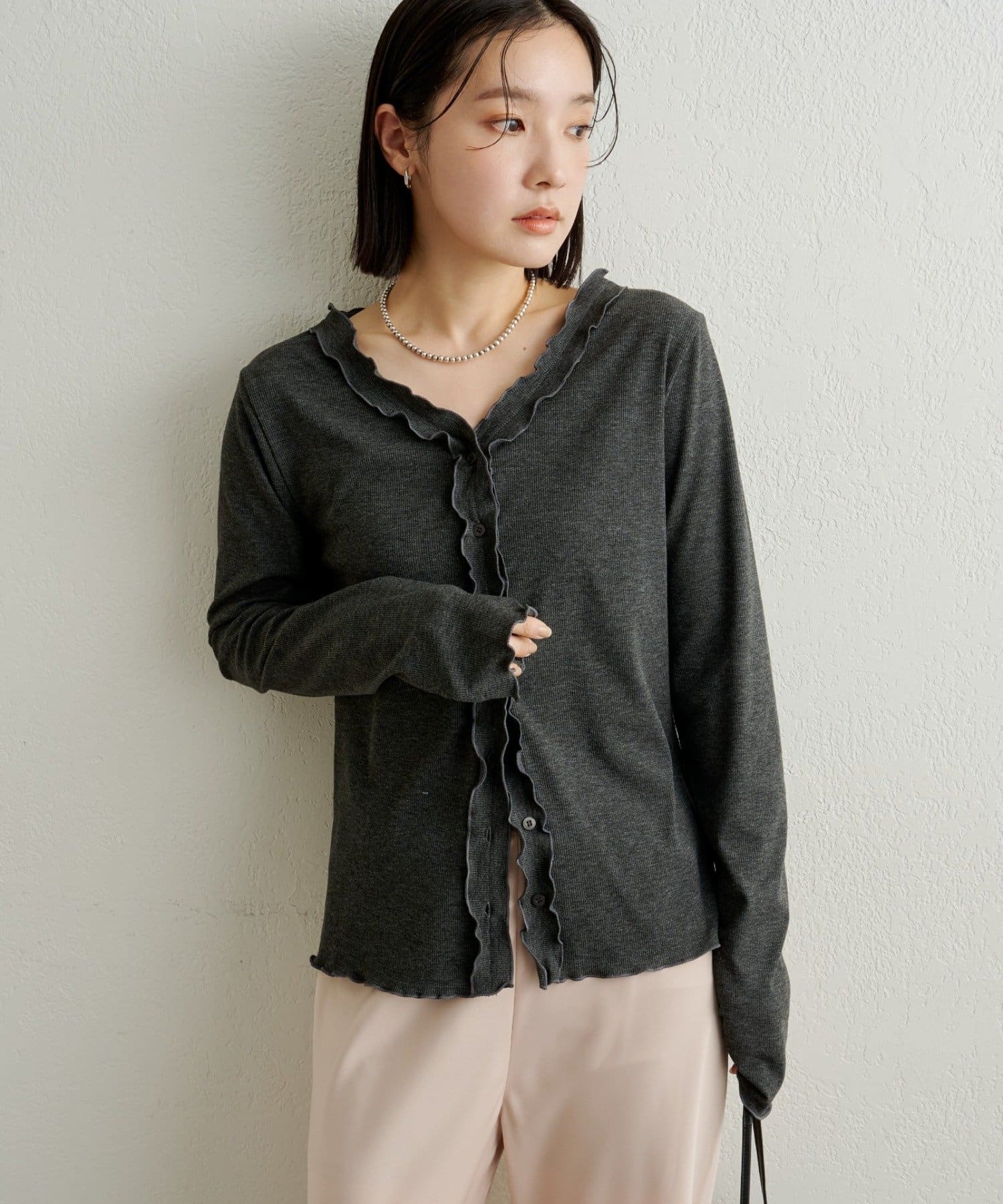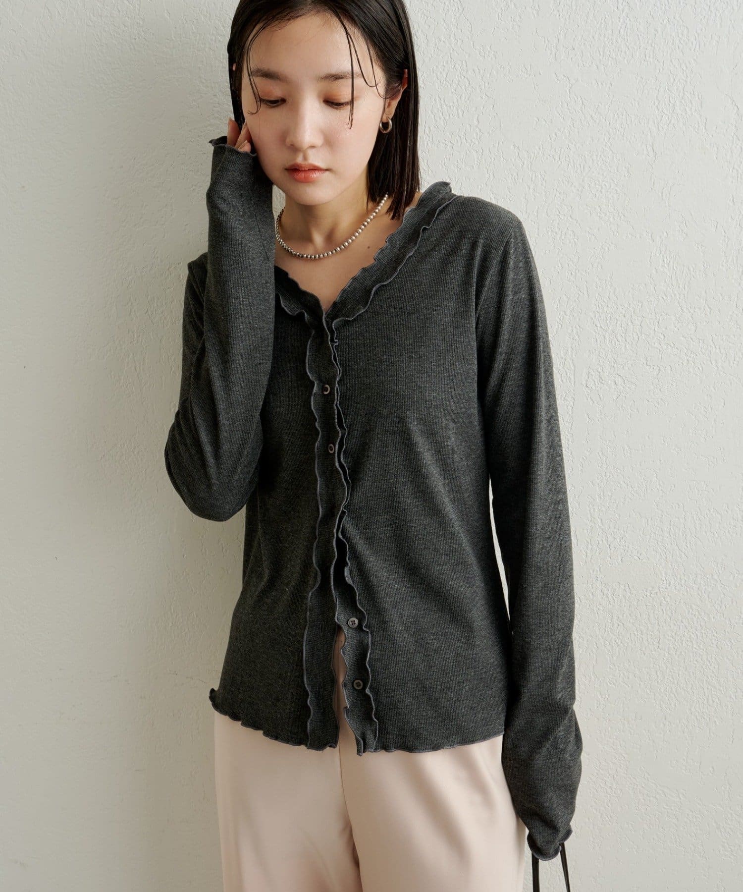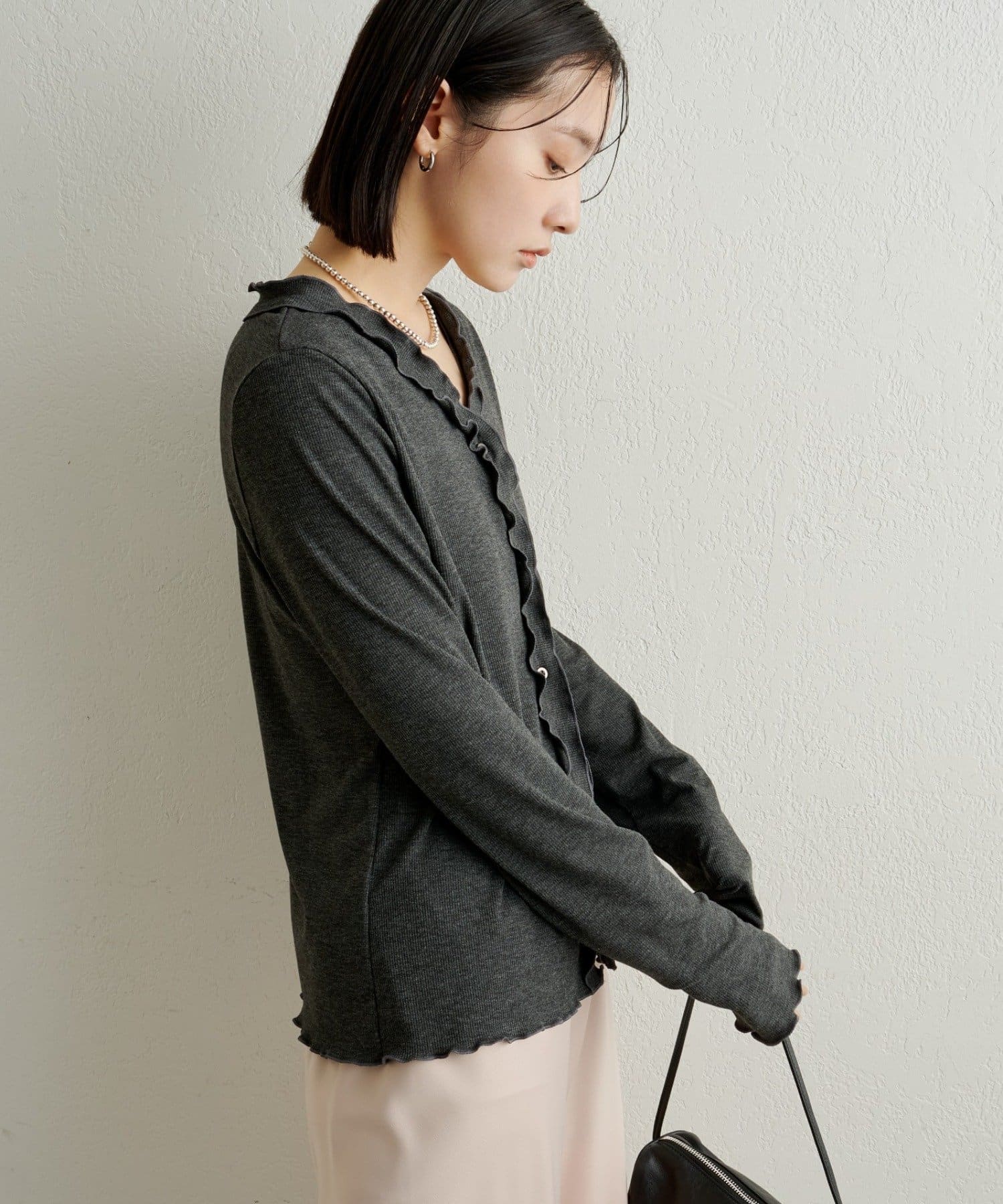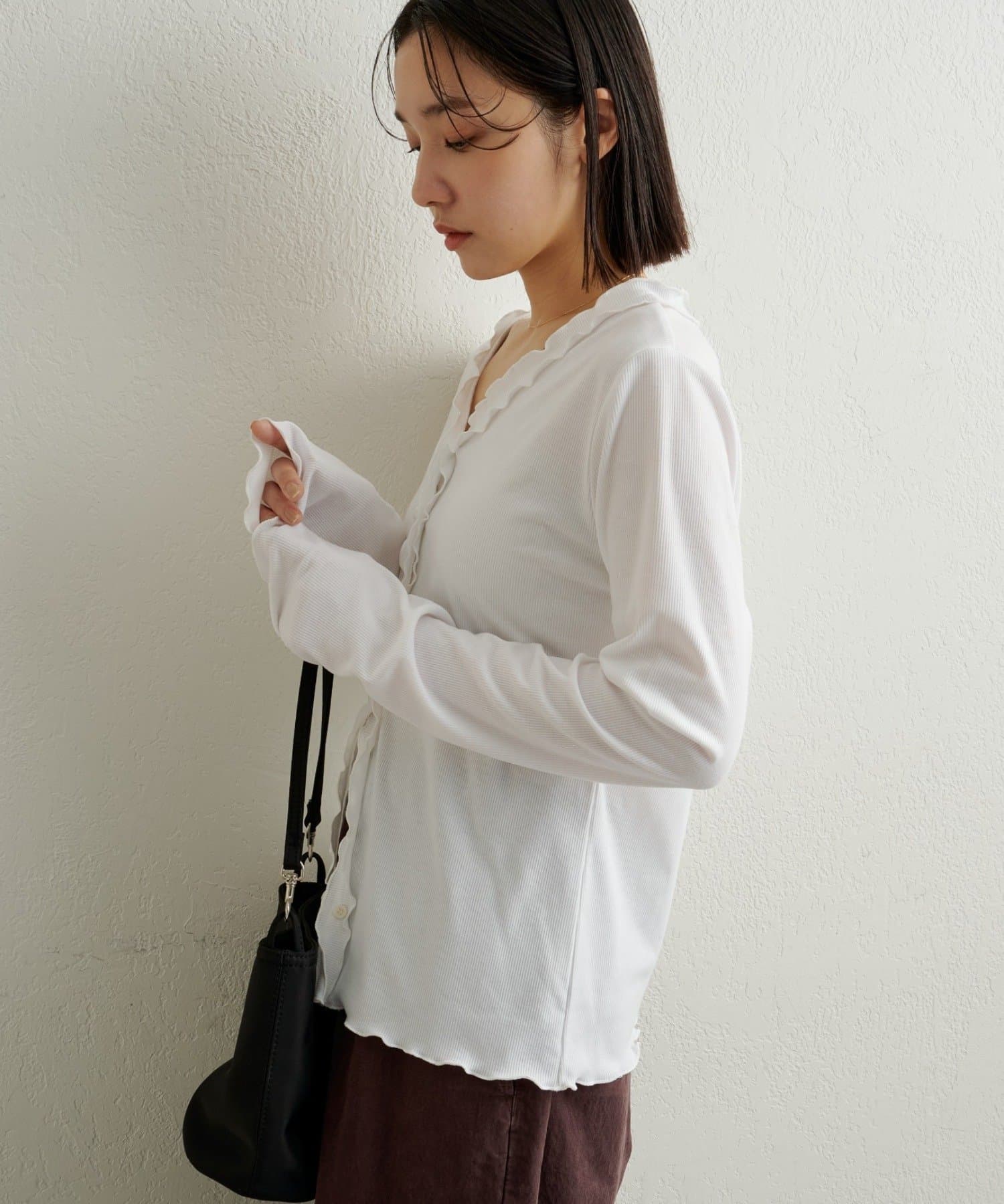さりげないフリルが大人可愛いフリルリブカーディガン