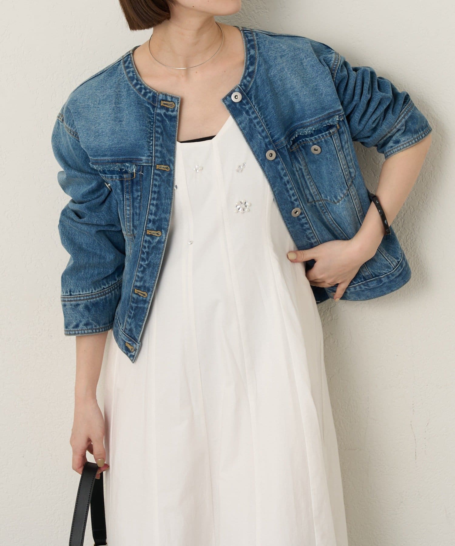 ・胸元はすっきりとしたVラインで、レイヤード次第で表情が変わるデザイン。