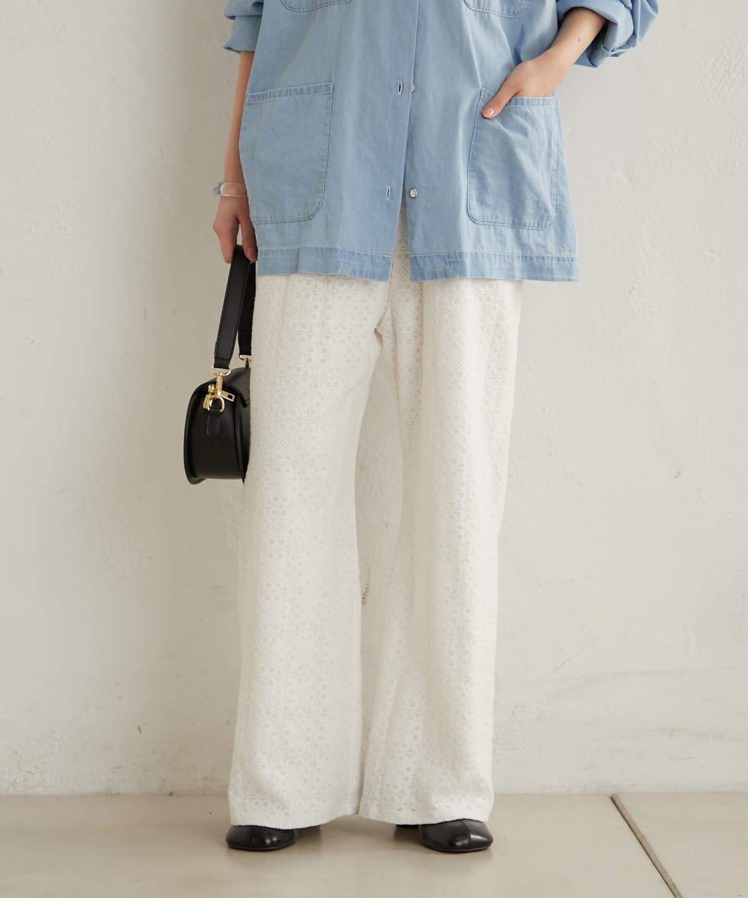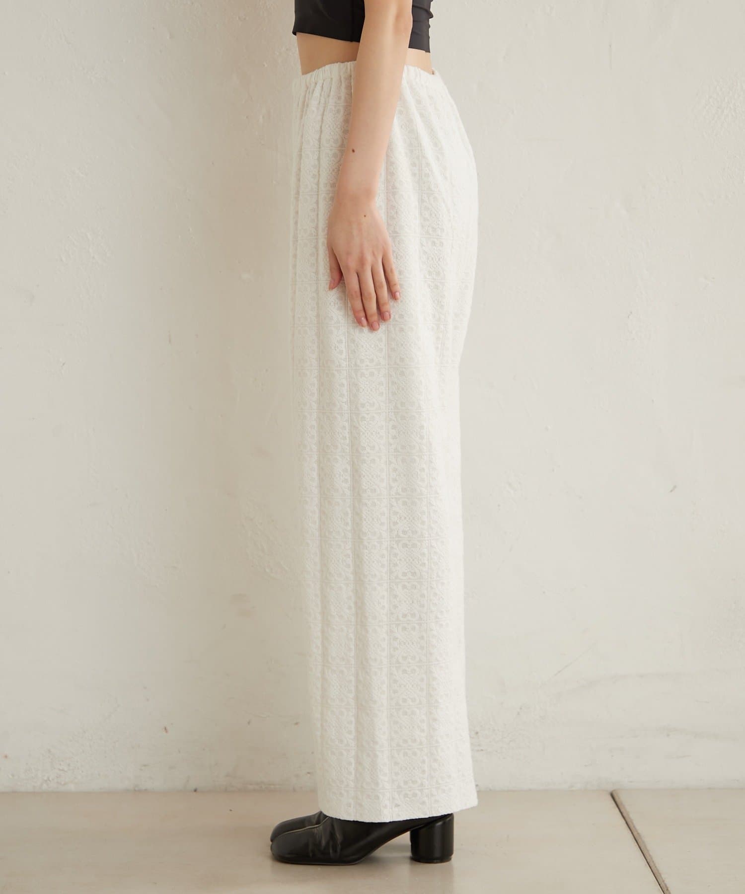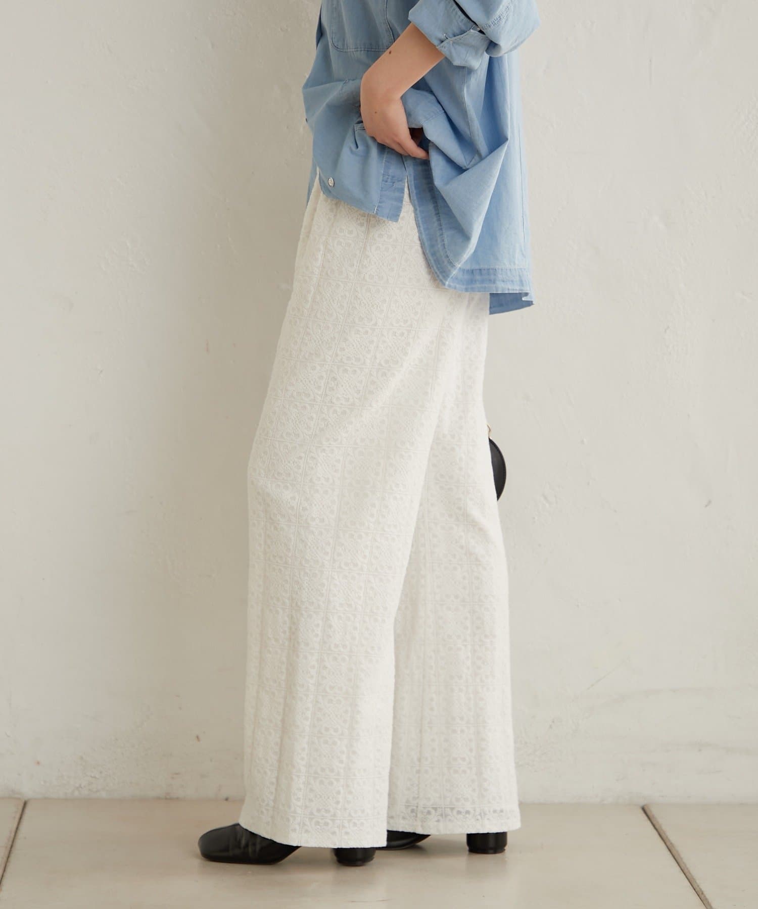 抜け感ある大人なカジュアルな総レースパンツ