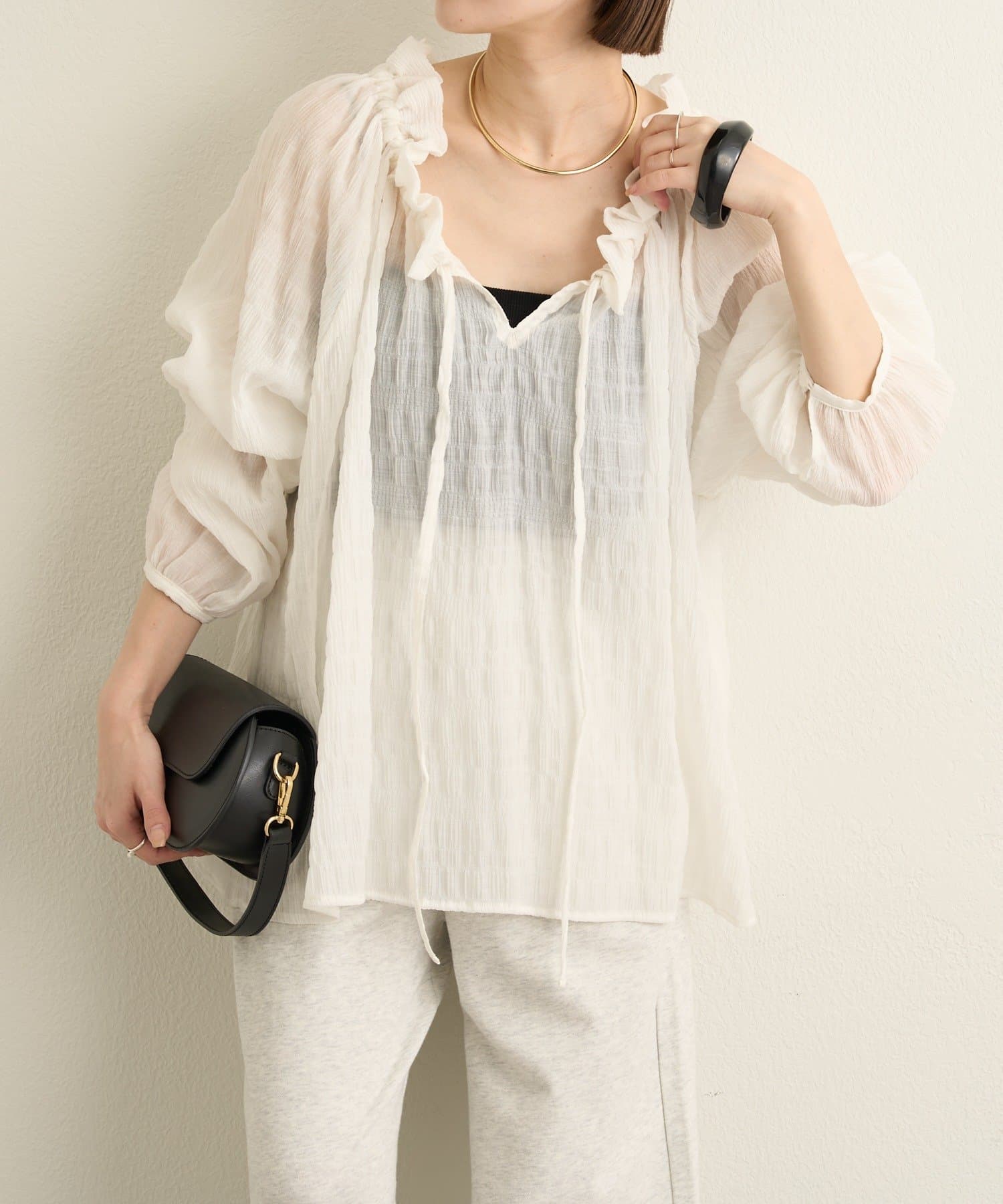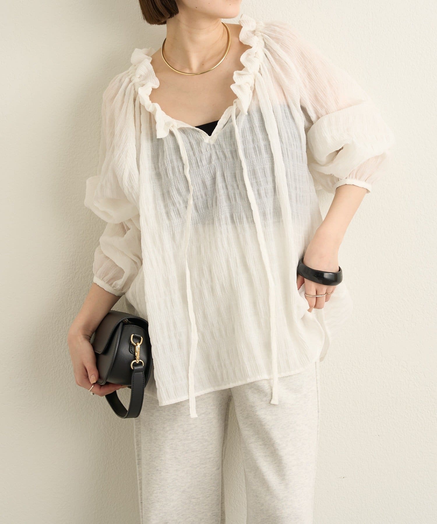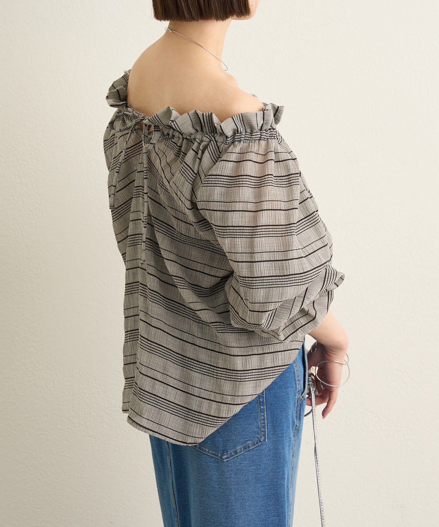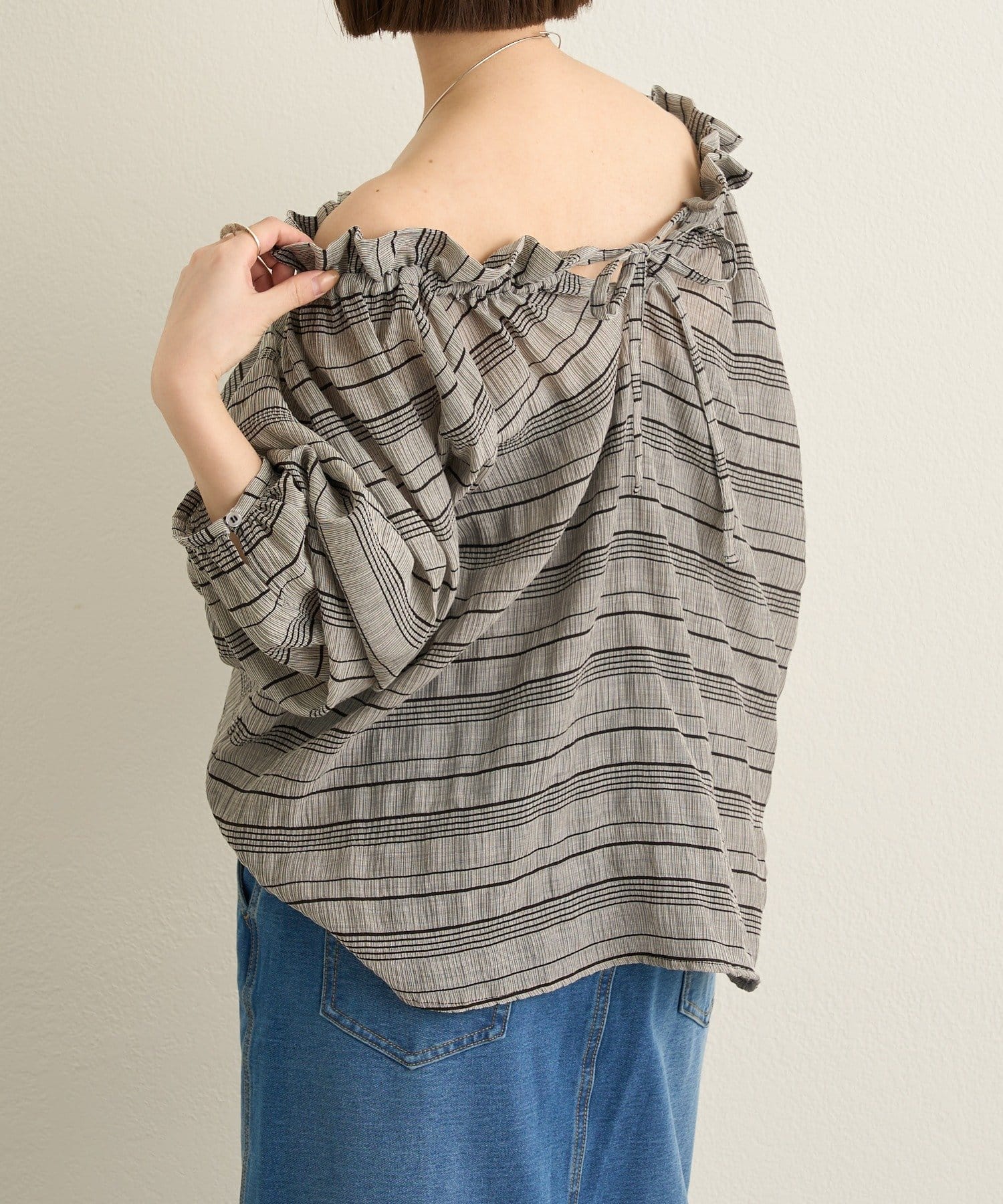 ・前後両前仕様と、胸元の紐でネックの空き具合も調節可能で、オフショルやワンショルなどスタイリングによって変えていただけます