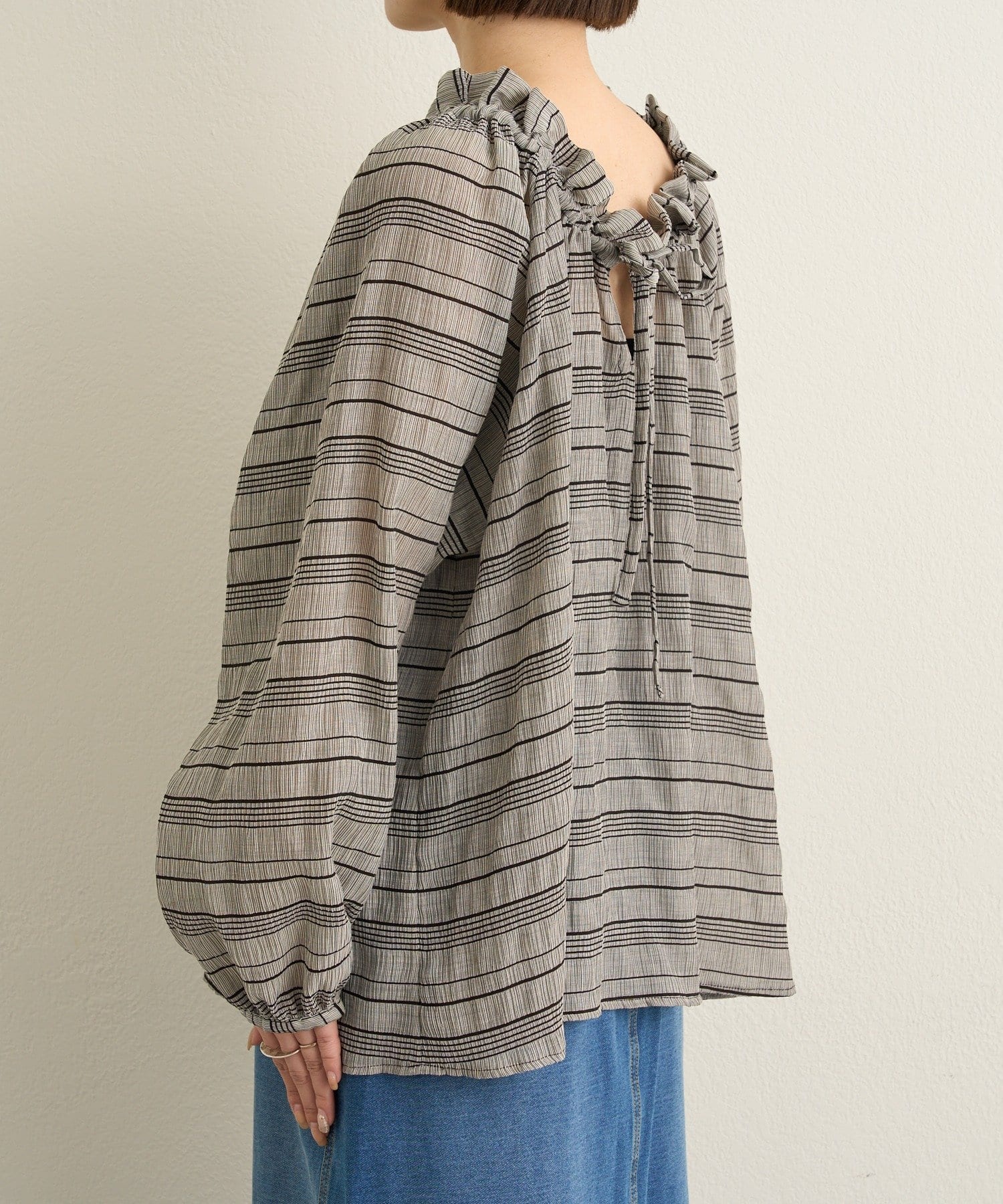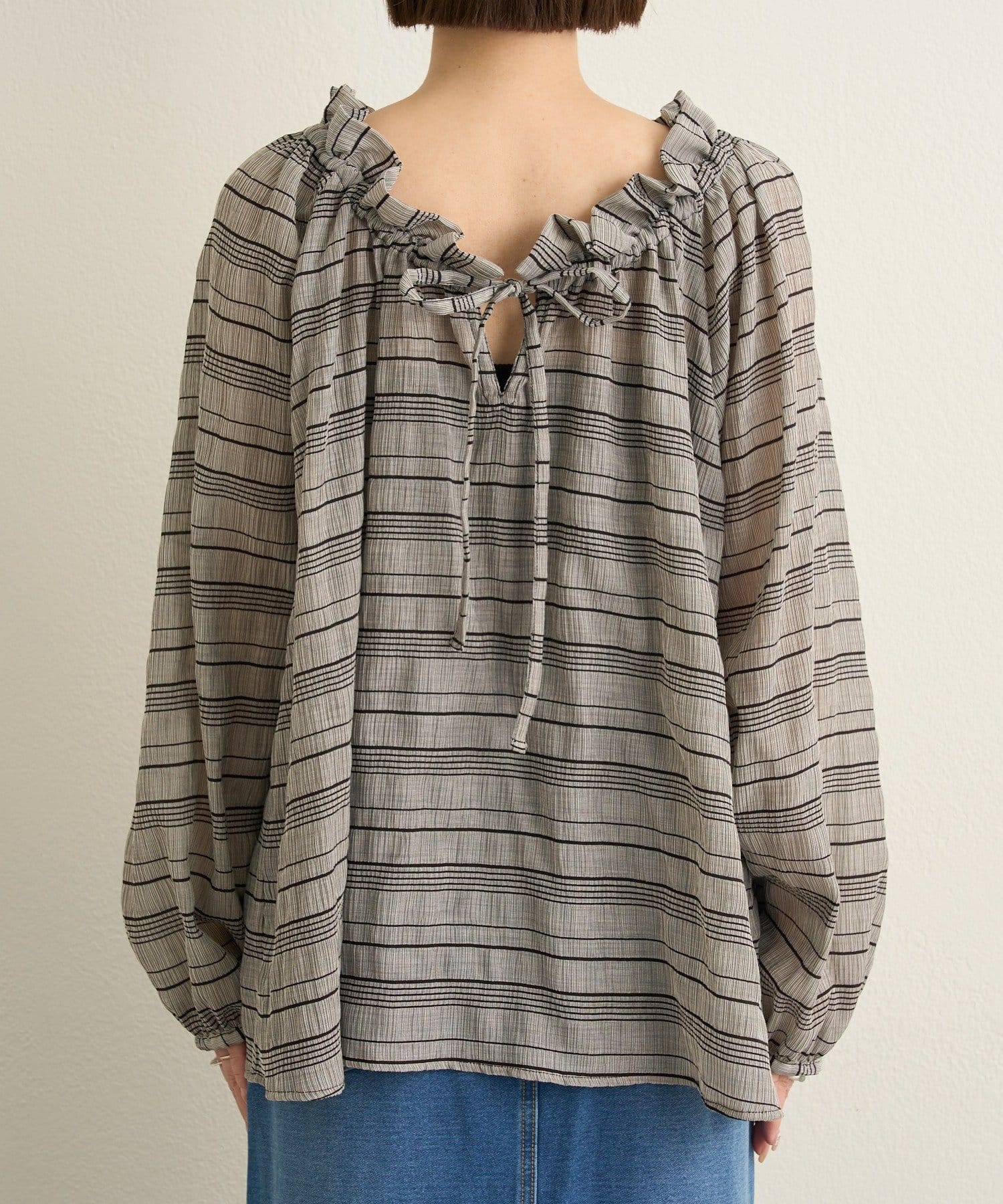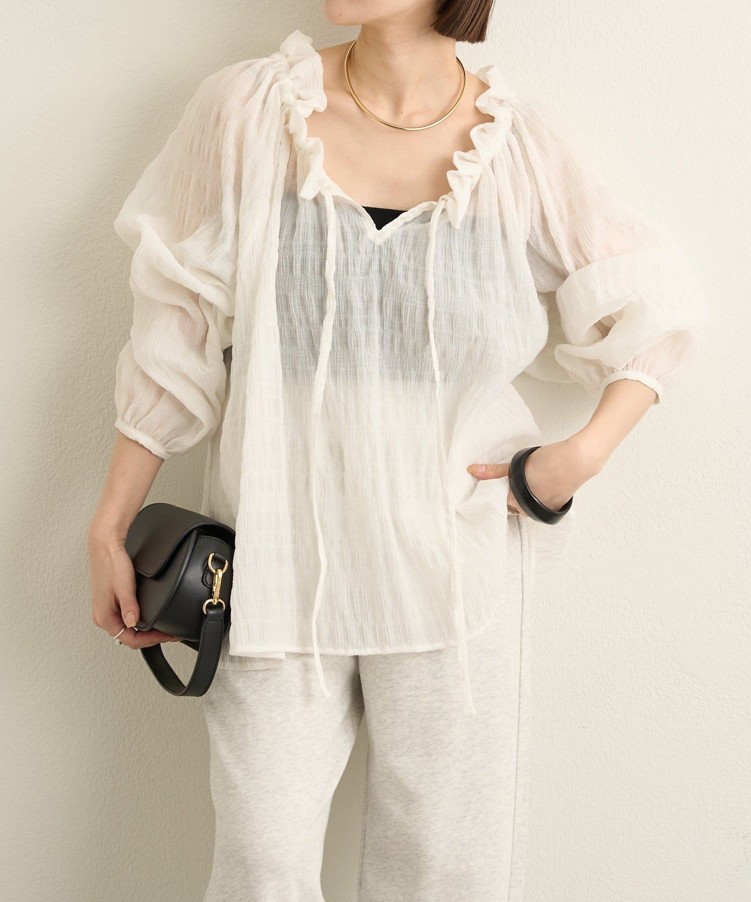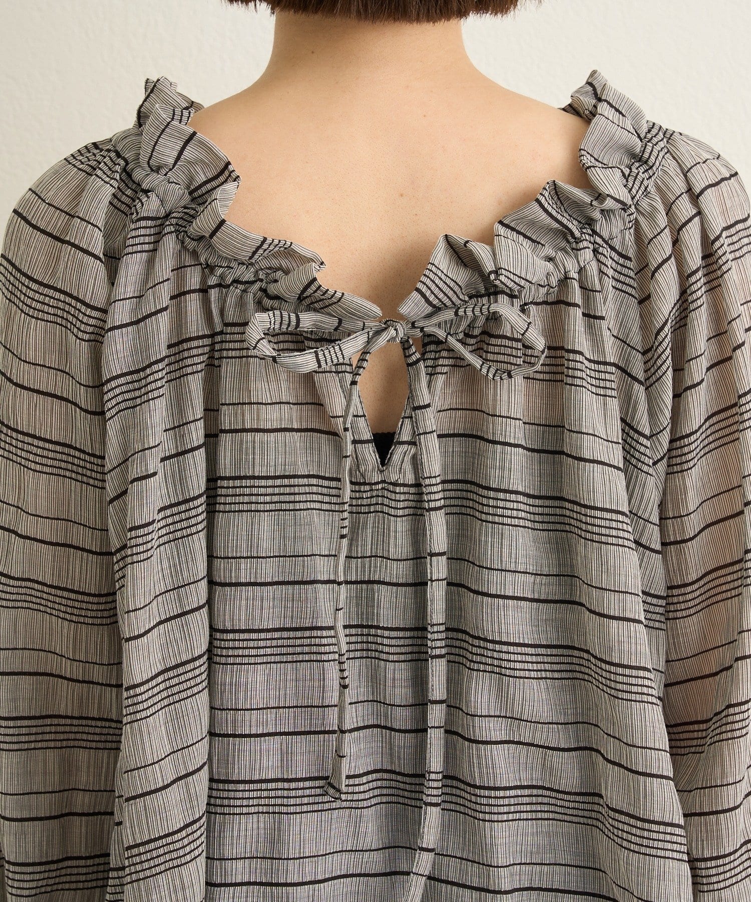 ・前後両前仕様と、胸元の紐でネックの空き具合も調節可能で、オフショルやワンショルなどスタイリングによって変えていただけます