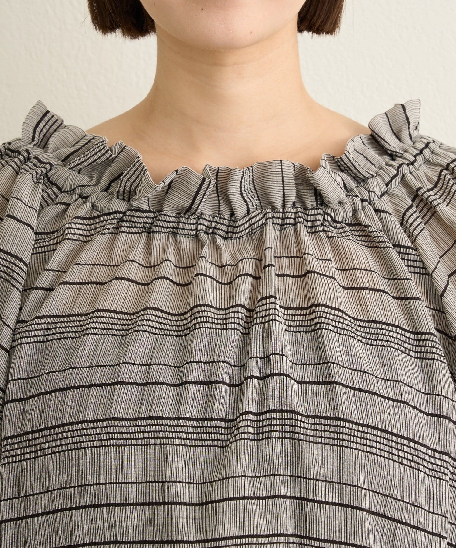 ・胸元から首周りにかけてのフリルが女性らしく目を引くデザイン