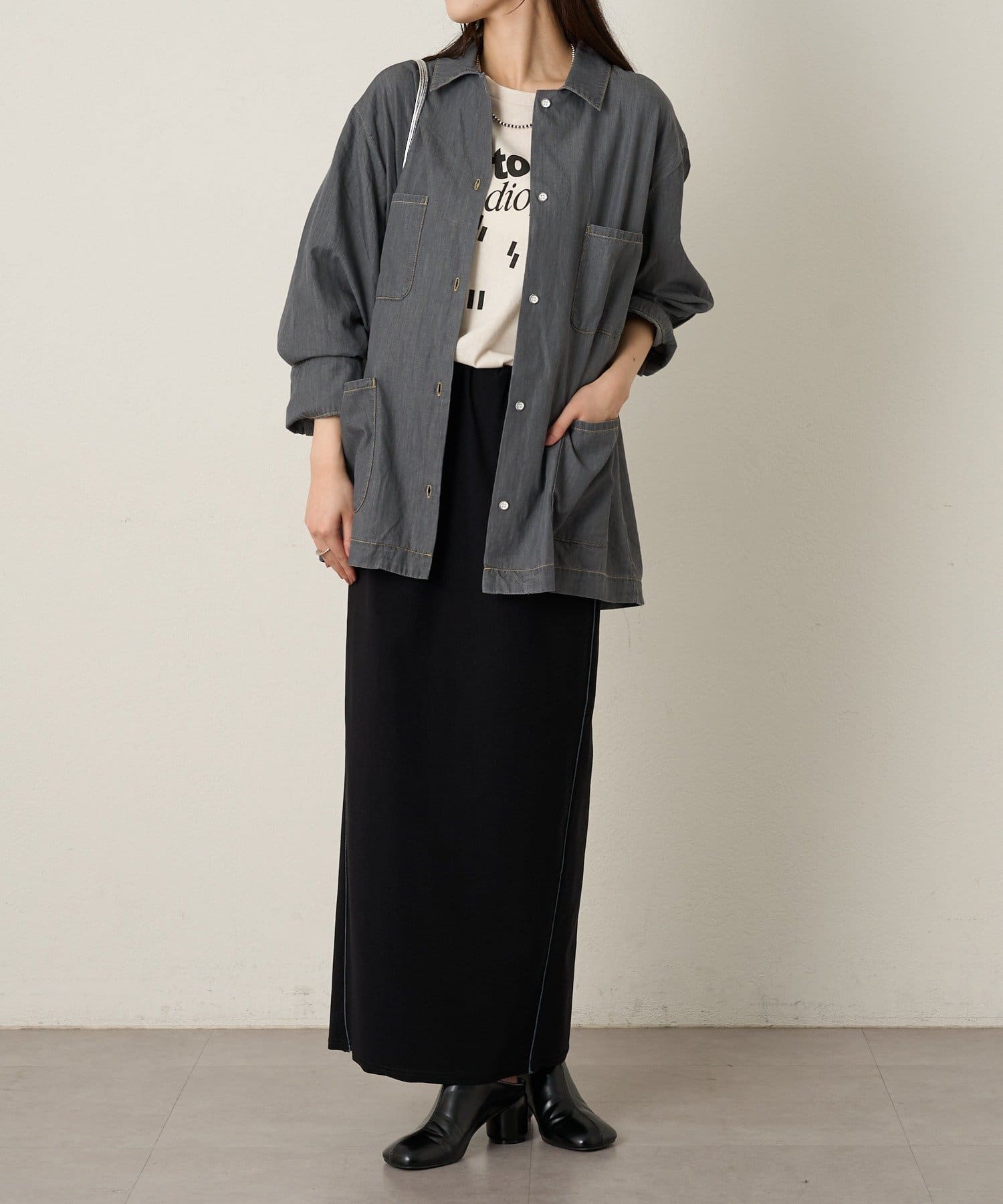 ・ゆとりがあるオーバーサイズな仕様が羽織るだけで旬なスタイリングが完成します。また、身体のラインを拾わず体型カバーも◎